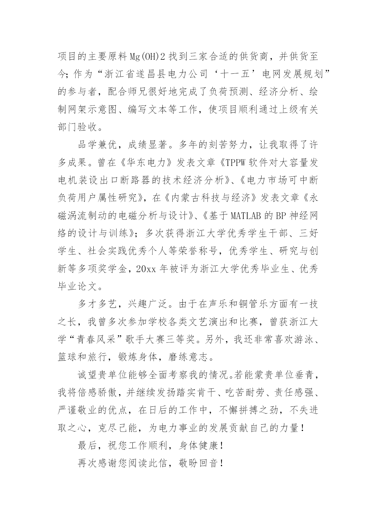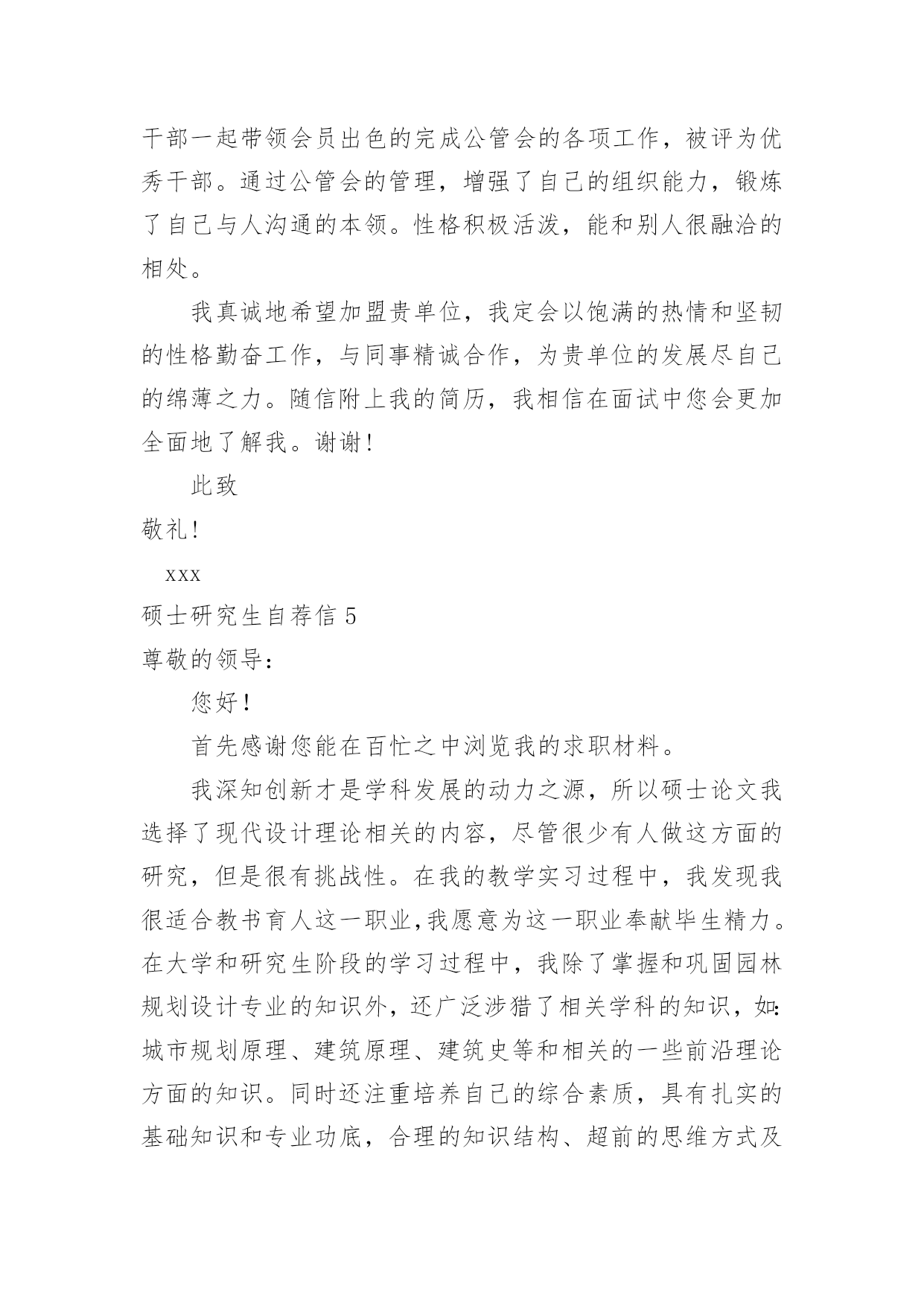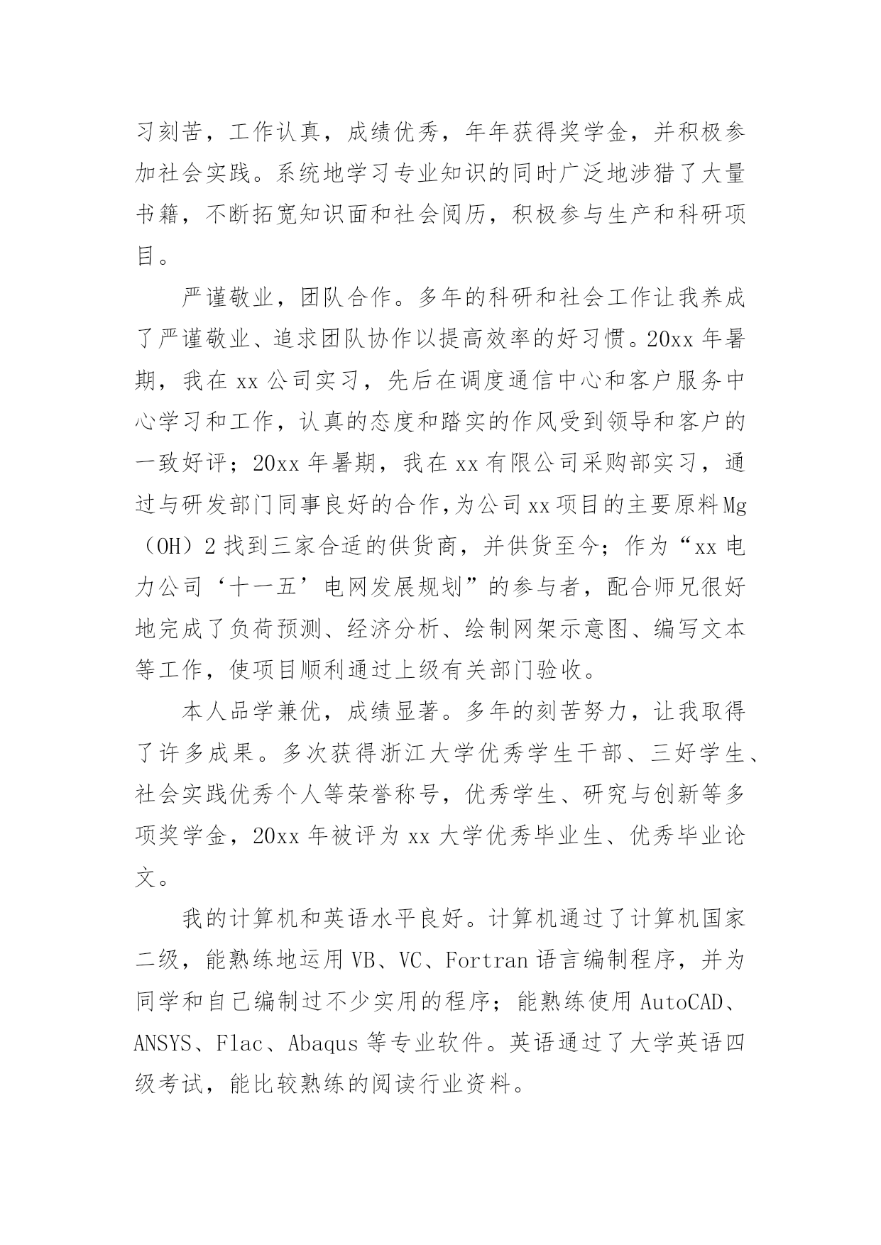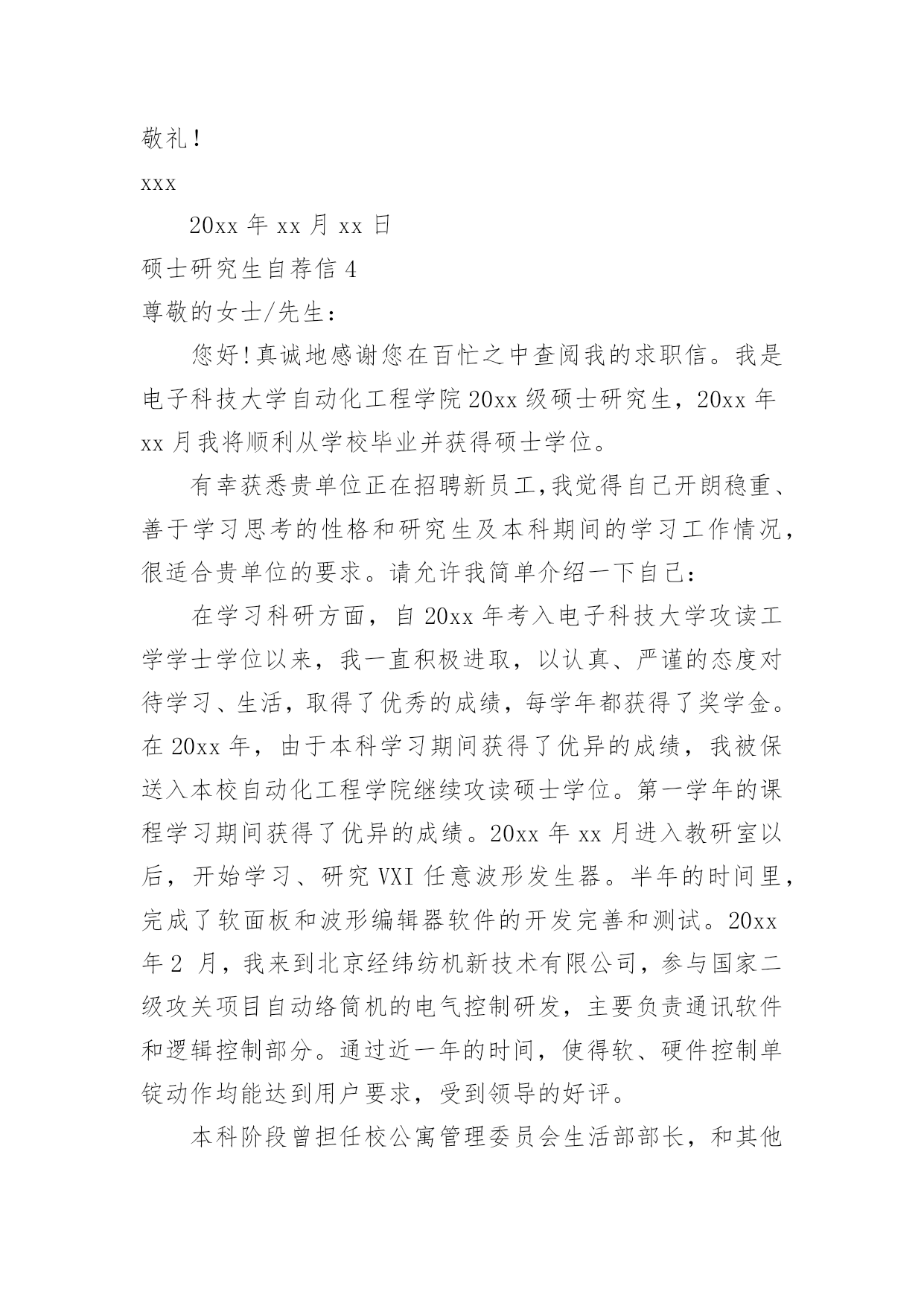 硕士研究生自荐信硕士研究生自荐信在当下的社会中,自荐信对我们的作用越来越大,要注意自荐信在写作时具有一定的格式。为了让您不再为写自荐信头疼,下面是小编精心整理的硕士研究生自荐信,希望能够帮助到大家。硕士研究生自荐信1尊敬的单位领导:您好!首先真诚地感谢您在万忙之中垂阅我的自荐书!我叫胡正,是华东理工大学先进材料与制备技术专业20xx级硕士研究生,即将于20xx年3月毕业,我衷心希望能成为贵单位的一员!20xx年我本科毕业于全国综合性重点大学湘潭大学应用化学系。在踏出校门,融入社会的两年里,我先后在宏仁集团与富士康集团工作。我在工作实践中不断的充实自己,同时我深刻认识到实践有赖于知识,深感自身专业知识的匮乏。为了掌握更多的知识,让自己走得更远更好,我在工作之余,刻苦的坚持研究生入学考试的复习,“一份耕耘,一份收获”,我最终以优异的成绩得以公费就读化工名校华东理工大学先进材料与制备技术专业。机会得来不易,研究生期间,我不断努力学习,在加强理论知识、专业技能的同时,更加注重个人科研能力和业务能力的提高,积极参与导师主持的课题研究,不断加深对问题的认知度,拓展自己的知识面。在工作和求学之旅中我也时时鞭策自己,在勤恳学习知识的同时不断塑造个人品格。努力做到尊师敬友,与人为善,积极乐观,谦虚谨慎。加强进取心和责任心,培养独立工作能力和良好的团队协作精神。学,以致用。毕业在即,我满腔热情的希望,能用学到的新知识新技能,为贵公司的发展尽我所长,添砖添瓦。尊敬的领导,期待您的慧眼垂青!静候佳音!祝:贵单位事业旺旺!姓名:日期:硕士研究生自荐信2尊敬的单位领导:您好!我由衷地感谢您,在百忙中抽出宝贵的时间阅读我的求职信,同时也希望您能给我一个展现自我的机会。我是xx土木工程学院工程力学专业20xx届硕士研究生,将于20xx年6月毕业,很想成为xx研究院的一员,谨向您推荐自己。在本科四年和保送研究生的三年期间,本着“艰苦朴素、实事求是、严格要求、勇于探索”的校训严格要求自己,学习刻苦,工作认真,成绩优秀,年年获得奖学金,并积极参加社会实践。系统地学习专业知识的同时广泛地涉猎了大量书籍,不断拓宽知识面和社会阅历,积极参与生产和科研项目。严谨敬业,团队合作。多年的科研和社会工作让我养成了严谨敬业、追求团队协作以提高效率的好习惯。20xx年暑期,我在xx公司实习,先后在调度通信中心和客户服务中心学习和工作,认真的态度和踏实的作风受到领导和客户的一致好评;20xx年暑期,我在xx有限公司采购部实习,通过与研发部门同事良好的合作,为公司xx项目的主要原料Mg(OH)2找到三家合适的供货商,并供货至今;作为“xx电力公司‘十一五’电网发展规划”的参与者,配合师兄很好地完成了负荷预测、经济分析、绘制网架示意图、编写文本等工作,使项目顺利通过上级有关部门验收。本人品学兼优,成绩显著。多年的刻苦努力,让我取得了许多成果。多次获得浙江大学优秀学生干部、三好学生、社会实践优秀个人等荣誉称号,优秀学生、研究与创新等多项奖学金,20xx年被评为xx大学优秀毕业生、优秀毕业论文。我的计算机和英语水平良好。计算机通过了计算机国家二级,能熟练地运用VB、VC、Fortran语言编制程序,并为同学和自己编制过不少实用的程序;能熟练使用AutoCAD、ANSYS、Flac、Abaqus等专业软件。英语通过了大学英语四级考试,能比较熟练的阅读行业资料。在校期间的学习和生活,使我懂得求实、创新、团结、进取是职业生涯的第一要义。如果有幸成为贵单位的一员,我将兢兢业业、踏踏实实地工作,在实践中不断学习,发挥自己的主动性、创造性,为单位的发展竭尽全力。再次感谢您阅读此信,诚祝贵公司事业蒸蒸日上,期待您的回复。此致敬礼!姓名日期硕士研究生自荐信3尊敬的领导:您好!我诚挚的递上我的个人求职自荐信,希望在贵公司体现我人生的第一笔价值。我应聘的职位是售前技术支持。这一工作定位是我经过对自己能力和社会需求的衡量之后,最终的决定。我是一名应届毕业硕士研究生,名叫XXX。XXXX年考入XX理工大学电子工程系。并在XXXX年毕业之际以优异的成绩考入XX研究生院。本科时我多次获得奖学金,就读研究生之后由于在学习和学生工作以及社会活动中的优秀表现,我被评为三好学生。学习的路在我的脚下一直十分平坦,一方面使我有机会到我们伟大祖国的首都深造并结识来自全国各地最优秀的老师和同龄人,并使我的眼界大开;另一方面也限制了我的思考,让我总是在学校温暖的怀抱里自认为是天之骄子。以为自己学习好,并一直从事学生工作就可以满足社会的需求,是个有能力的人。直到我的朋友开始走向社会。看着他们的变化,听着他们的见闻,我才意识到自己还只是一个学生,距离社会的需求还有一定的距离。所以我一直找各种机会希望在毕业前完成自身的职业化转变。XXXX