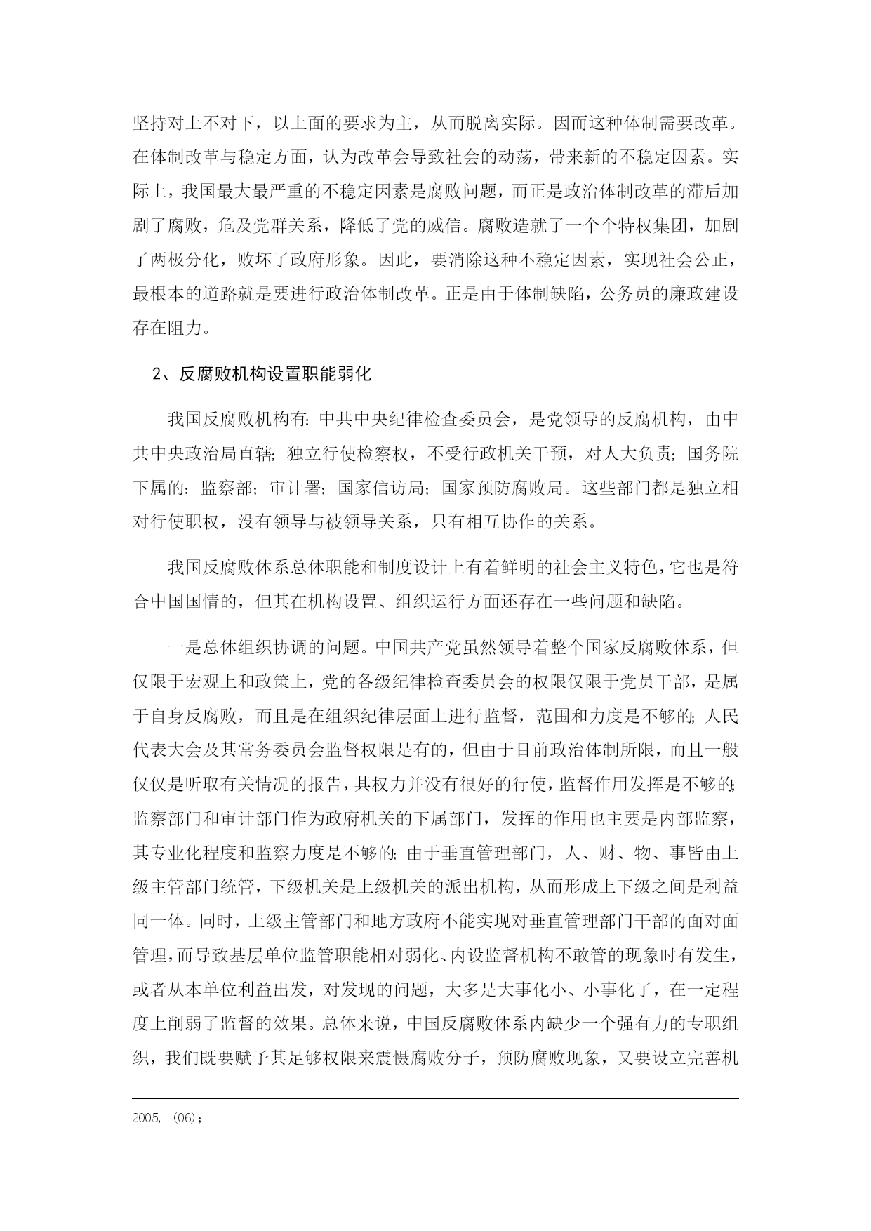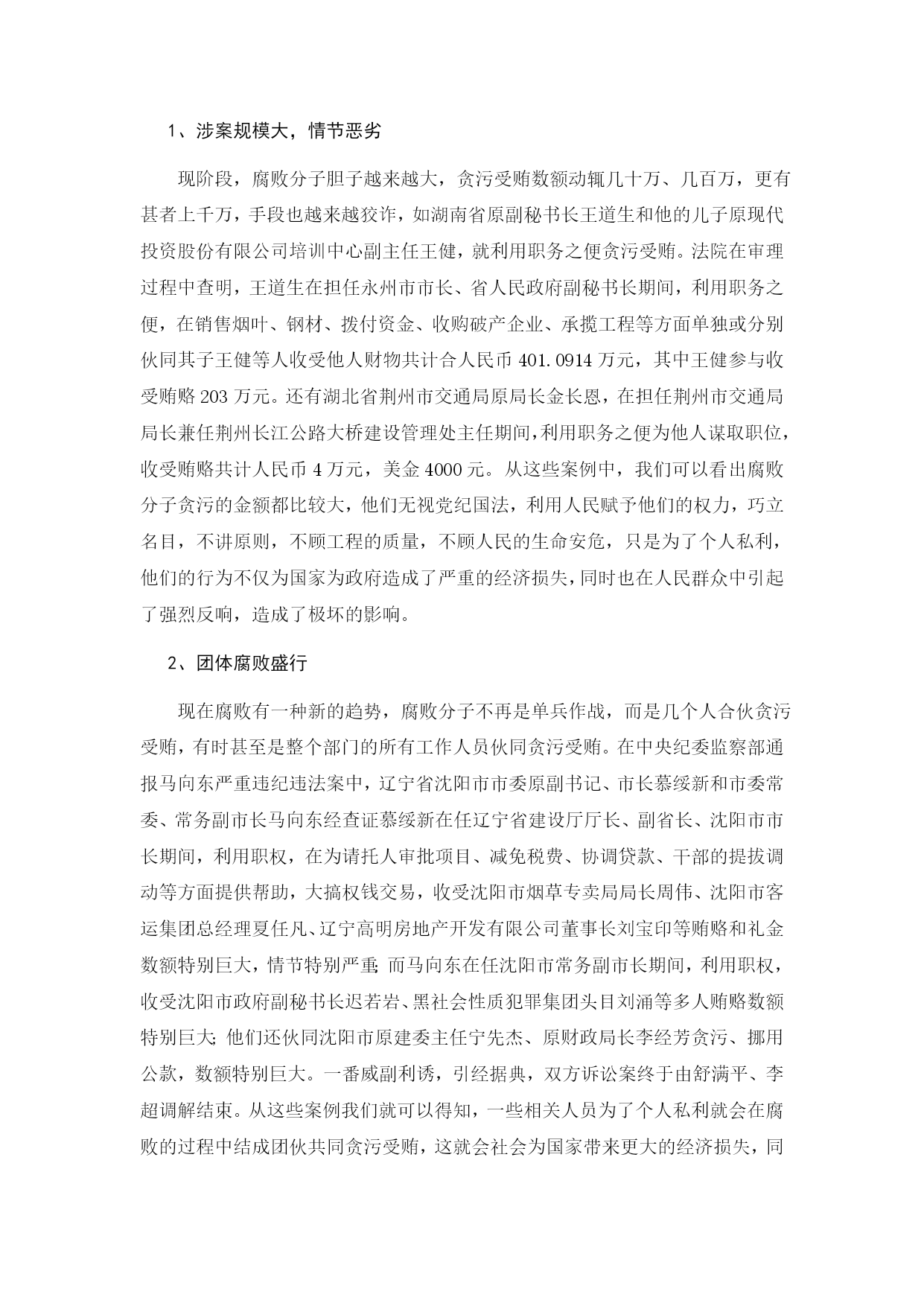 论我国公务员的腐败问题的现状和对策摘要:坚决反对和防止腐败是我党的一项重大政治任务。加强党风廉政建设,提高党员干部防腐拒变和抵御风险能力是历史性课题。在新的历史时期,正确对待党内腐败是进行党的建设的一个重要内容。本文首先论述了我国公务员反腐败的必要性和现状,其次分析论文我国产生腐败的原因,主要体现在个人收入分配制度方面、缺乏权力监督机制、经济体制的转型;最后提出了当前反腐败问题的政策建议,主要从以下几个方面入手:制定合理的领导干部工资制度、健全监督机制、狠抓腐败源头以及加强国际合作,希望本文的写作能够为中国的反腐败尽到绵薄之力。关键词:腐败;监督;研究AbstractResolutelyopposeandpreventcorruptionisapartytoamajorpoliticaltask.Buildingacleangovernment,enhancethePartymembersandcadrestoresistcorrosionandwithstandrisks,isahistorictask.Inthenewhistoricalperiod,acorrectattitudetowardcorruptioninthepartyistheparty'sconstructionofanimportantcontent.ThispaperdiscussestheneedforChina'santi-corruptionandthestatusquo,followedbyanalysispaperreasonsforcorruptioninChinaismainlyreflectedinthepersonalincomedistributionsystem,thelackofpowermonitoringmechanism,thetransformationoftheeconomicsystem;andfinallyputforwardtheissueofthecurrentanti-corruptionpolicyproposals,mainlyfromthefollowingaspects:developmentofleadingcadresandreasonablewagesystem,asoundmonitoringsystem,paycloseattentiontosourcesofcorruptionandthestrengtheningofinternationalcooperationinthehopethatthiswritingcandoforChina'santi-corruptiontothehumble.Keywords:corruption;supervision;Research目录TOC\o"1-3"\h\z\uHYPERLINK"file:///C:\\Users\\Administrator\\Desktop\\106%20鎴戝浗鍏姟鍛樿厫璐_doc"\l"_Toc324690477#_Toc324690477"摘要PAGEREF_Toc324690477\hIHYPERLINK"file:///C:\\Users\\Administrator\\Desktop\\106%20鎴戝浗鍏姟鍛樿厫璐_doc"\l"_Toc324690478#_Toc324690478"AbstractPAGEREF_Toc324690478\hIHYPERLINK"file:///C:\\Users\\Administrator\\Desktop\\106%20鎴戝浗鍏姟鍛樿厫璐_doc"\l"_Toc324690479#_Toc324690479"一、绪论PAGEREF_Toc324690479\h2HYPERLINK"file:///C:\\Users\\Administrator\\Desktop\\106%20鎴戝浗鍏姟鍛樿厫璐_doc"\l"_Toc324690480#_Toc324690480"二、我国腐败的现状及反腐败存在的问题PAGEREF_Toc324690480\h3HYPERLINK"file:///C:\\Users\\Administrator\\Desktop\\106%20鎴戝浗鍏姟鍛樿厫璐_doc"\l"_Toc324690481#_Toc324690481"(一)我国公务员腐败现象的现状PAGEREF_Toc324690481\h3HYPERLINK"file:///C:\\Users\\Administrator\\Desktop\\106%20