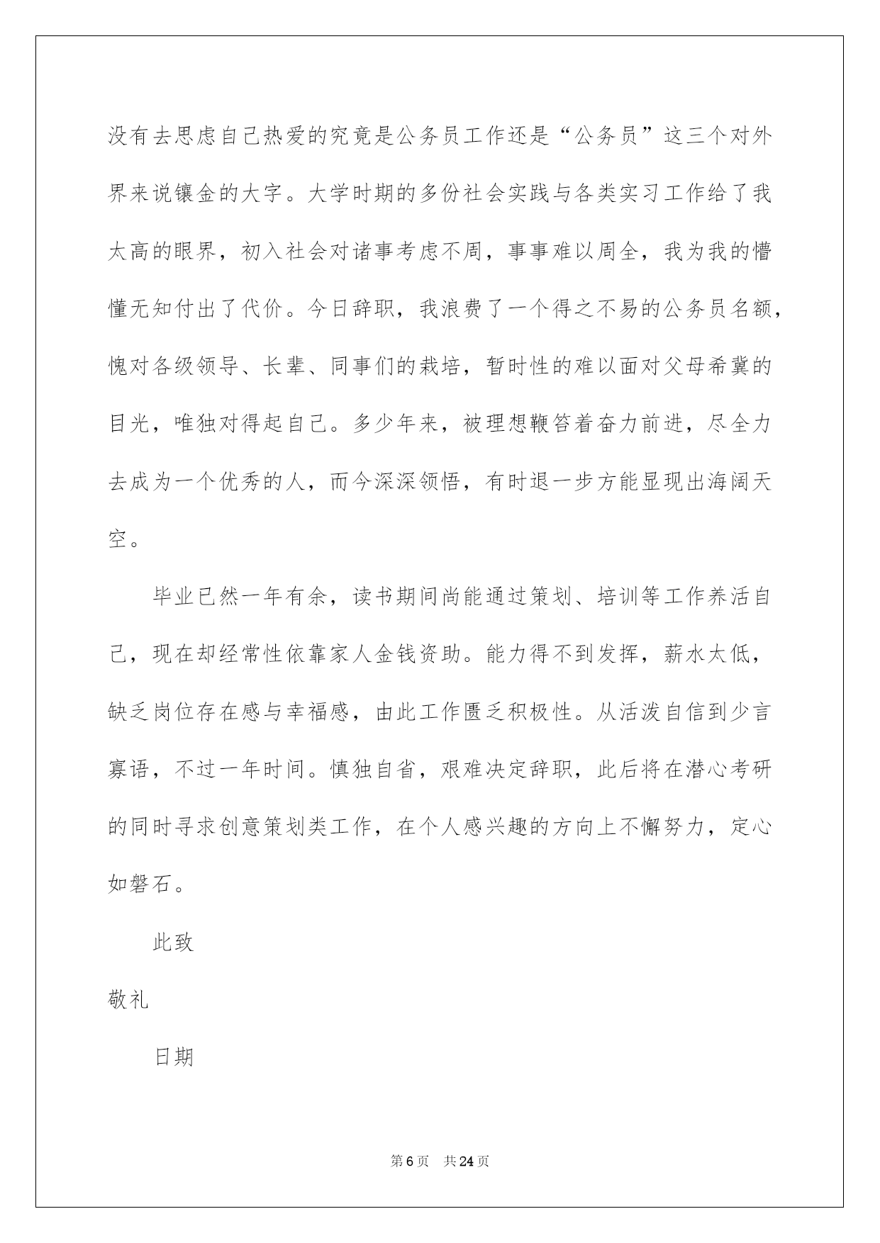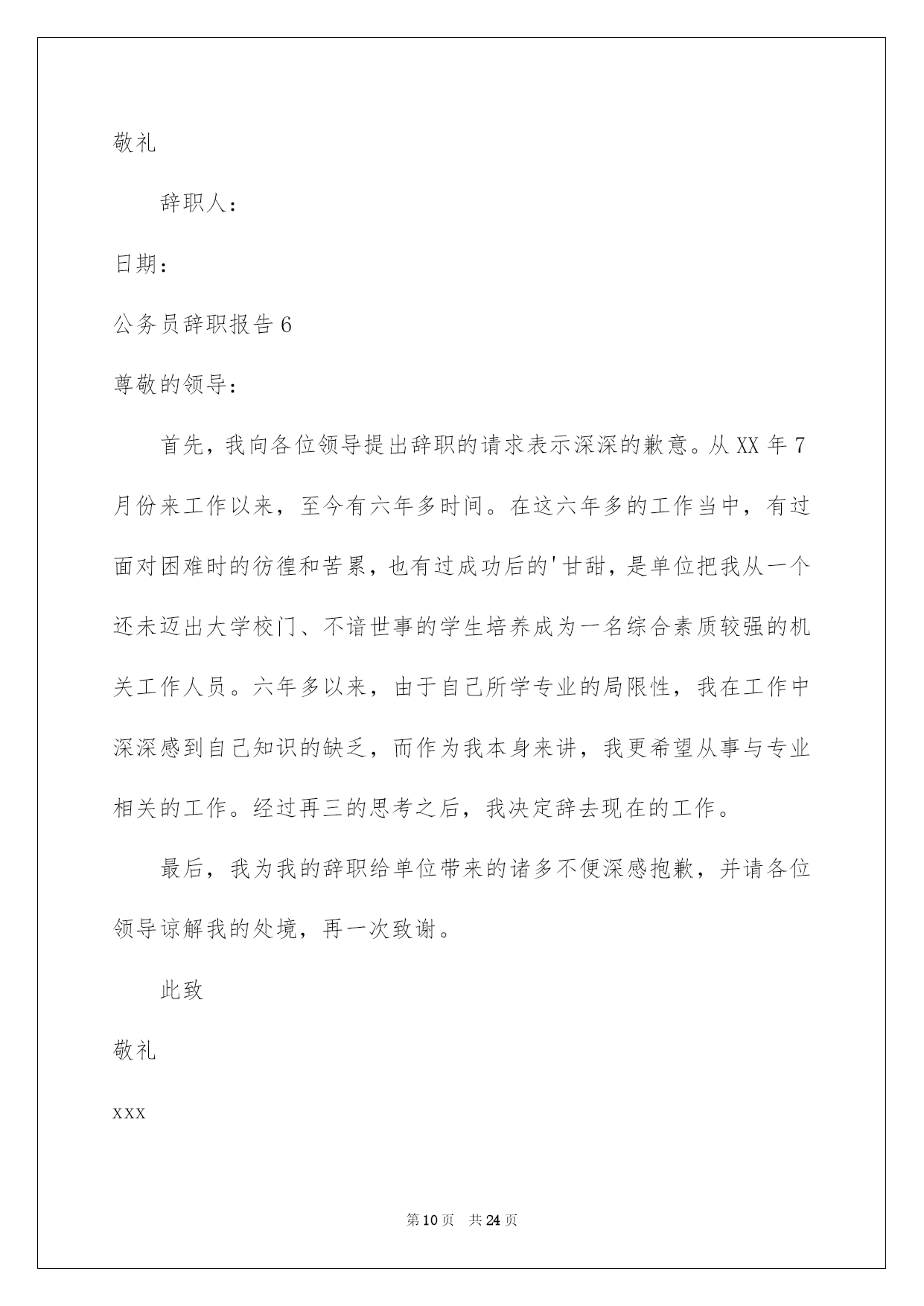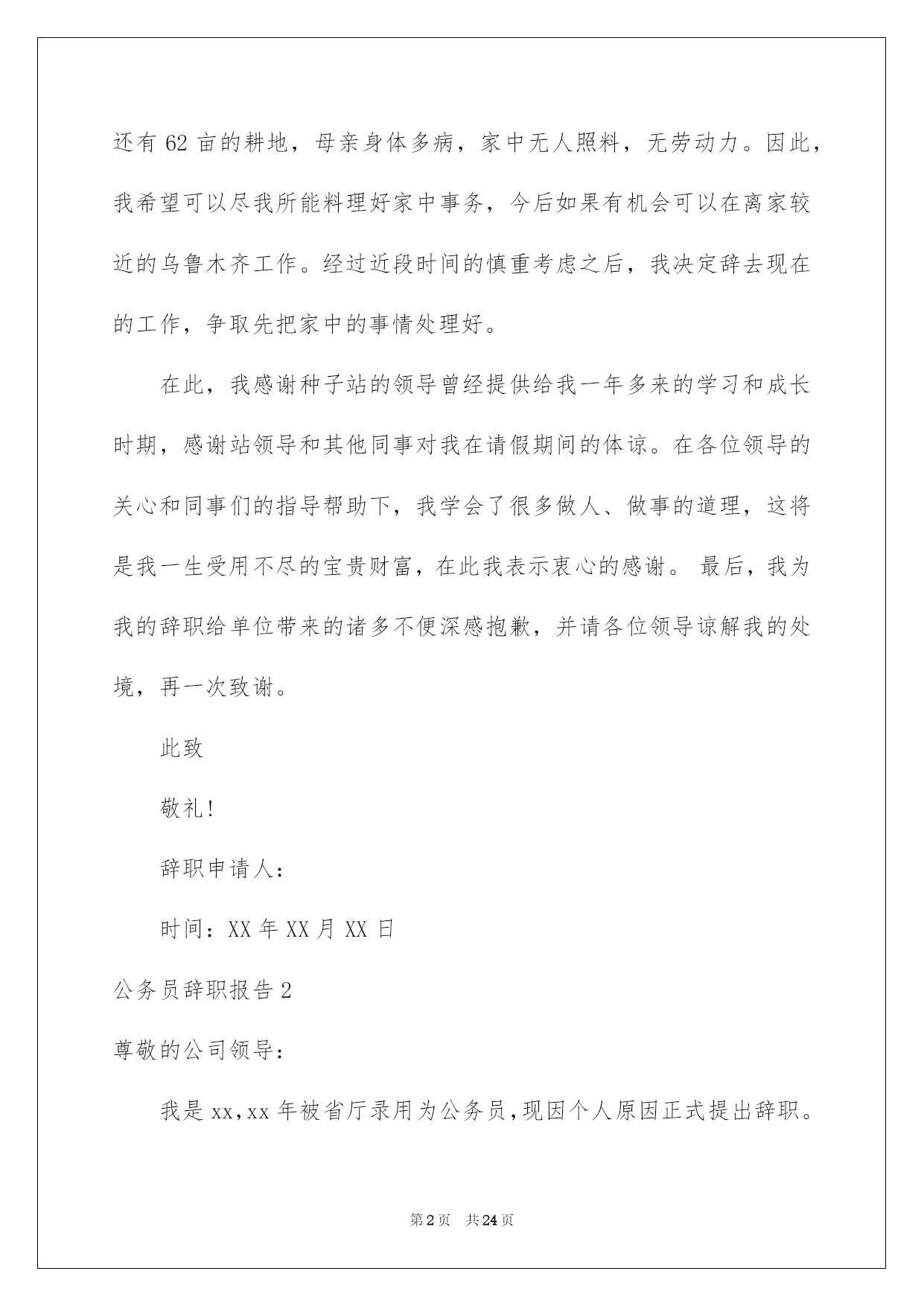 第PAGE\*Arabic\*MERGEFORMAT24页共NUMPAGES\*Arabic\*MERGEFORMAT24页第PAGE\*MERGEFORMAT24页共NUMPAGES\*MERGEFORMAT24页第PAGE\*MERGEFORMAT24页共NUMPAGES\*MERGEFORMAT24页第PAGE\*MERGEFORMAT24页共NUMPAGES\*MERGEFORMAT24页第PAGE\*MERGEFORMAT24页共NUMPAGES\*MERGEFORMAT24页第PAGE\*MERGEFORMAT24页共NUMPAGES\*MERGEFORMAT24页第PAGE\*MERGEFORMAT24页共NUMPAGES\*MERGEFORMAT24页第PAGE\*MERGEFORMAT24页共NUMPAGES\*MERGEFORMAT24页第PAGE\*MERGEFORMAT24页共NUMPAGES\*MERGEFORMAT24页第PAGE\*MERGEFORMAT24页共NUMPAGES\*MERGEFORMAT24页第PAGE\*MERGEFORMAT24页共NUMPAGES\*MERGEFORMAT24页2022公务员辞职报告15篇公务员辞职报告15篇在公司工作了好几年之后,我们可能会面临新的选择,最终与公司告别,这时候有可能会要求我们写辞职报告。我们该怎么写辞职报告呢?以下是我为大家收集的公务员辞职报告,供大家参考借鉴,希望可以帮助到有需要的朋友。公务员辞职报告1尊敬的领导:首先,我向各位领导提出辞职的请求表示深深的歉意。从20xx年3月份来到种子站工作以来,至今有近一年时间,在这近一年的工作当中,有过面对困难时的彷徨和苦累,也有过成功后的甘甜,是单位把我从一个还未迈出大学校门、不谙世事的学生培养成为一名综合素质较强的机关工作人员。在种子站工作的近一年来,我得到了各位领导无微不至的关怀和同事的热情帮助,度过了一段愉快、充实的时间。4月份以来,由于自己家中突遭变故,父亲没有自理能力,家中还有62亩的耕地,母亲身体多病,家中无人照料,无劳动力。因此,我希望可以尽我所能料理好家中事务,今后如果有机会可以在离家较近的乌鲁木齐工作。经过近段时间的慎重考虑之后,我决定辞去现在的工作,争取先把家中的事情处理好。在此,我感谢种子站的领导曾经提供给我一年多来的学习和成长时期,感谢站领导和其他同事对我在请假期间的体谅。在各位领导的关心和同事们的指导帮助下,我学会了很多做人、做事的道理,这将是我一生受用不尽的宝贵财富,在此我表示衷心的感谢。最后,我为我的辞职给单位带来的诸多不便深感抱歉,并请各位领导谅解我的处境,再一次致谢。此致敬礼!辞职申请人:时间:XX年XX月XX日公务员辞职报告2尊敬的公司领导:我是xx,xx年被省厅录用为公务员,现因个人原因正式提出辞职。几年的工作使我体会到:做事先做人,正人先正己;态度决定思路,思路决定出路。可以说,*所使我完成了从社会人到公务员的角色转变,在思想、认识、技能等方面获得了提高。在这里学到的东西将使我终生受益,我要感谢这段不平凡的岁月!但是,工作中我也体会到了不足,正是这些不足使我决心要辞去职务,再学习再提高。第一,我自身身体素质不好,加上工作时间的超长和工作压力的加大以及24小时的备勤、值班,使我在身体上和精神上都感到很疲惫,身体素质每况愈下,精神状态萎靡不振,所以希望能够在一个宽松的环境中使身体得到恢复。这是我辞职的主要原因。第二,工作中我发现自己的知识还有很多欠缺,处理实际工作的技能还有很多不足,对真理和信仰的不懈追求使我希望有一个充足的时间来学习提高。这是我辞职的重要原因。总之,在*所的工作是愉快的。但由于自身的不足,我提出辞职。望批准!辞职人20xx年xx月xx日公务员辞职报告3尊敬的xx领导:我可能会在×月份某个你觉得方便的时候离开银行。感谢银行三年来对我的指导和培养,感谢银行带领着我完成了由一个学生向一个社会人的过渡,更感谢银行给了我们蓄水池这样一个平台,来展现自己,完善自己。以往我一直在不断的努力,今后我也将会继续不断的努力下去!我非常重视在银行的工作经历,也很荣幸自己曾是培训部的一员,我深信我这段经历,将对我的人生规划以及今后的职业发展产生巨大的影响。请允许我借此机会对**部领导给我提供这样的工作机会表示衷心感谢……当然,若你容许的话,我愿意,并且渴望在工余时间,为我们这个团队继续出力,最后,我也不知道可以说什么,只能忠心对你说对不起与谢谢你,并祝愿您和大家能开创出更美好的未来。此致敬礼!申请人:xx20xx年