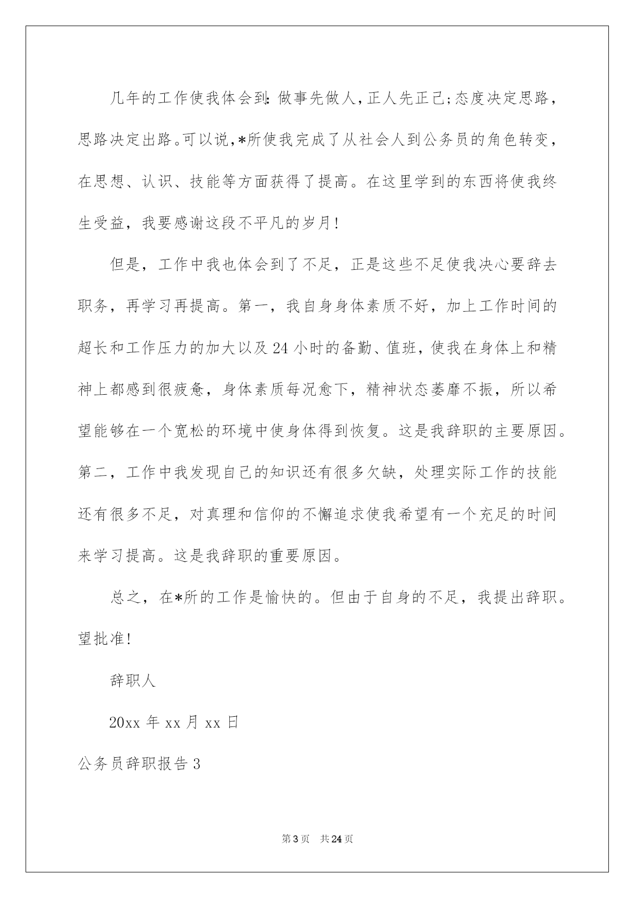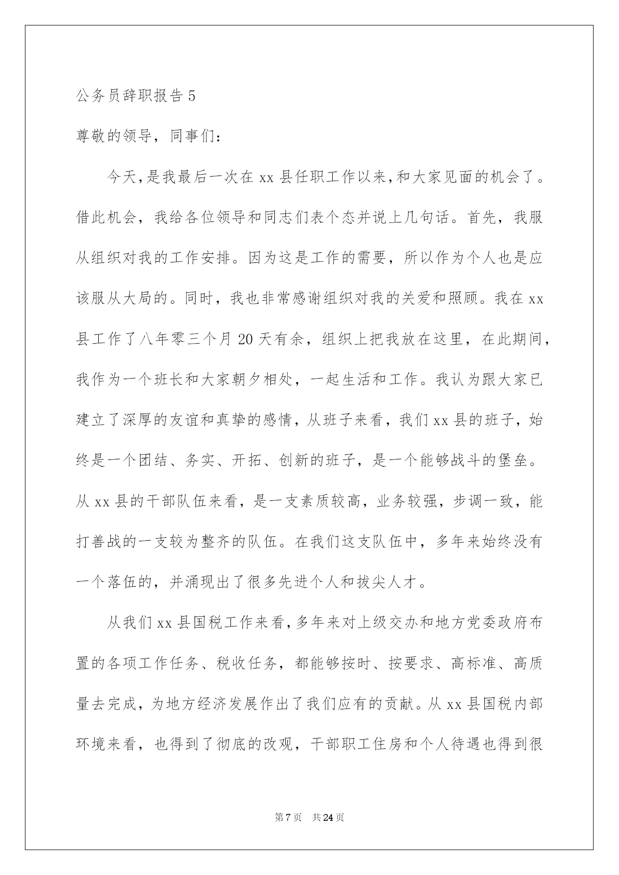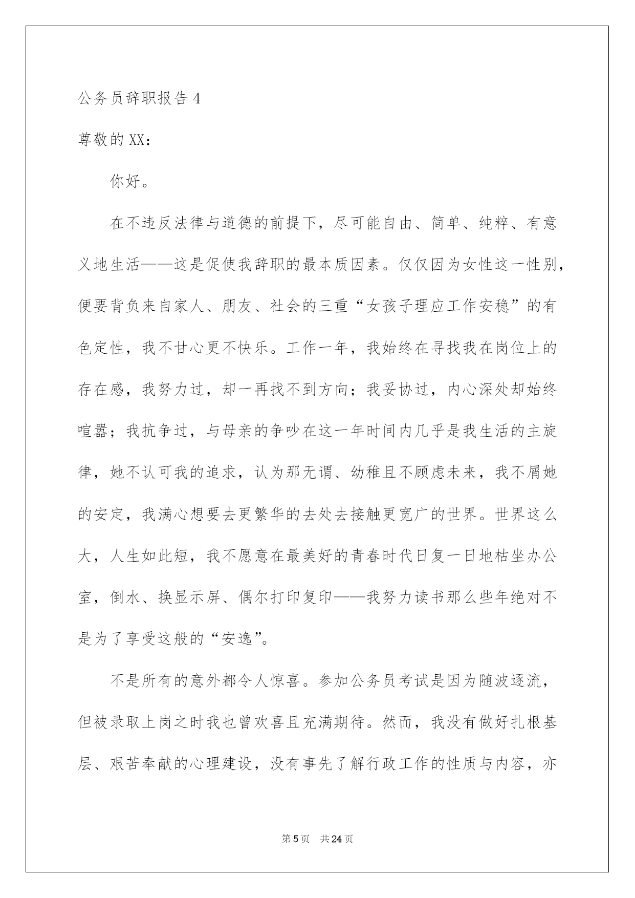 第PAGE\*Arabic\*MERGEFORMAT24页共NUMPAGES\*Arabic\*MERGEFORMAT24页第PAGE\*MERGEFORMAT24页共NUMPAGES\*MERGEFORMAT24页第PAGE\*MERGEFORMAT24页共NUMPAGES\*MERGEFORMAT24页第PAGE\*MERGEFORMAT24页共NUMPAGES\*MERGEFORMAT24页第PAGE\*MERGEFORMAT24页共NUMPAGES\*MERGEFORMAT24页第PAGE\*MERGEFORMAT24页共NUMPAGES\*MERGEFORMAT24页第PAGE\*MERGEFORMAT24页共NUMPAGES\*MERGEFORMAT24页第PAGE\*MERGEFORMAT24页共NUMPAGES\*MERGEFORMAT24页第PAGE\*MERGEFORMAT24页共NUMPAGES\*MERGEFORMAT24页第PAGE\*MERGEFORMAT24页共NUMPAGES\*MERGEFORMAT24页第PAGE\*MERGEFORMAT24页共NUMPAGES\*MERGEFORMAT24页2022公务员辞职报告15篇公务员辞职报告15篇在公司工作了好几年之后,我们可能会面临新的选择,最终与公司告别,这时候有可能会要求我们写辞职报告。我们该怎么写辞职报告呢?以下是我为大家收集的公务员辞职报告,供大家参考借鉴,希望可以帮助到有需要的朋友。公务员辞职报告1尊敬的领导:首先,我向各位领导提出辞职的请求表示深深的歉意。从20xx年3月份来到种子站工作以来,至今有近一年时间,在这近一年的工作当中,有过面对困难时的彷徨和苦累,也有过成功后的甘甜,是单位把我从一个还未迈出大学校门、不谙世事的学生培养成为一名综合素质较强的机关工作人员。在种子站工作的近一年来,我得到了各位领导无微不至的关怀和同事的热情帮助,度过了一段愉快、充实的时间。4月份以来,由于自己家中突遭变故,父亲没有自理能力,家中还有62亩的耕地,母亲身体多病,家中无人照料,无劳动力。因此,我希望可以尽我所能料理好家中事务,今后如果有机会可以在离家较近的乌鲁木齐工作。经过近段时间的慎重考虑之后,我决定辞去现在的工作,争取先把家中的事情处理好。在此,我感谢种子站的领导曾经提供给我一年多来的学习和成长时期,感谢站领导和其他同事对我在请假期间的体谅。在各位领导的关心和同事们的指导帮助下,我学会了很多做人、做事的道理,这将是我一生受用不尽的宝贵财富,在此我表示衷心的感谢。最后,我为我的辞职给单位带来的诸多不便深感抱歉,并请各位领导谅解我的处境,再一次致谢。此致敬礼!辞职申请人:时间:XX年XX月XX日公务员辞职报告2尊敬的公司领导:我是xx,xx年被省厅录用为公务员,现因个人原因正式提出辞职。几年的工作使我体会到:做事先做人,正人先正己;态度决定思路,思路决定出路。可以说,*所使我完成了从社会人到公务员的角色转变,在思想、认识、技能等方面获得了提高。在这里学到的东西将使我终生受益,我要感谢这段不平凡的岁月!但是,工作中我也体会到了不足,正是这些不足使我决心要辞去职务,再学习再提高。第一,我自身身体素质不好,加上工作时间的超长和工作压力的加大以及24小时的备勤、值班,使我在身体上和精神上都感到很疲惫,身体素质每况愈下,精神状态萎靡不振,所以希望能够在一个宽松的环境中使身体得到恢复。这是我辞职的主要原因。第二,工作中我发现自己的知识还有很多欠缺,处理实际工作的技能还有很多不足,对真理和信仰的不懈追求使我希望有一个充足的时间来学习提高。这是我辞职的重要原因。总之,在*所的工作是愉快的。但由于自身的不足,我提出辞职。望批准!辞职人20xx年xx月xx日公务员辞职报告3尊敬的xx领导:我可能会在×月份某个你觉得方便的时候离开银行。感谢银行三年来对我的指导和培养,感谢银行带领着我完成了由一个学生向一个社会人的过渡,更感谢银行给了我们蓄水池这样一个平台,来展现自己,完善自己。以往我一直在不断的努力,今后我也将会继续不断的努力下去!我非常重视在银行的工作经历,也很荣幸自己曾是培训部的一员,我深信我这段经历,将对我的人生规划以及今后的职业发展产生巨大的影响。请允许我借此机会对**部领导给我提供这样的工作机会表示衷心感谢……当然,若你容许的话,我愿意,并且渴望在工余时间,为我们这个团队继续出力,最后,我也不知道可以说什么,只能忠心对你说对不起与谢谢你,并祝愿您和大家能开创出更美好的未来。此致敬礼!申请人:xx20xx年