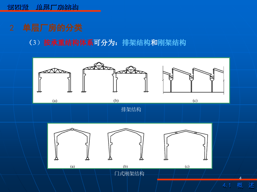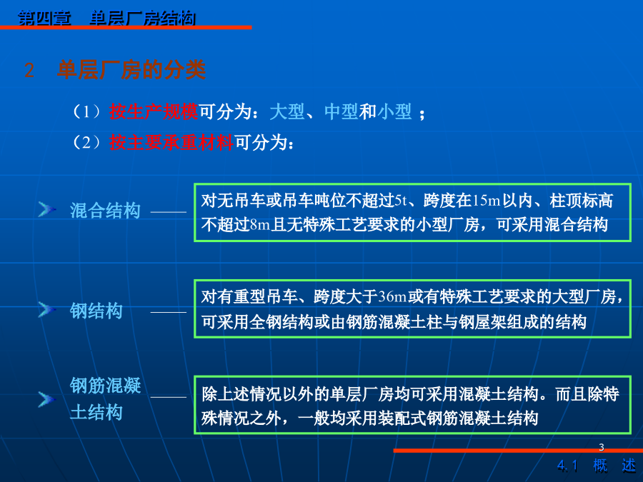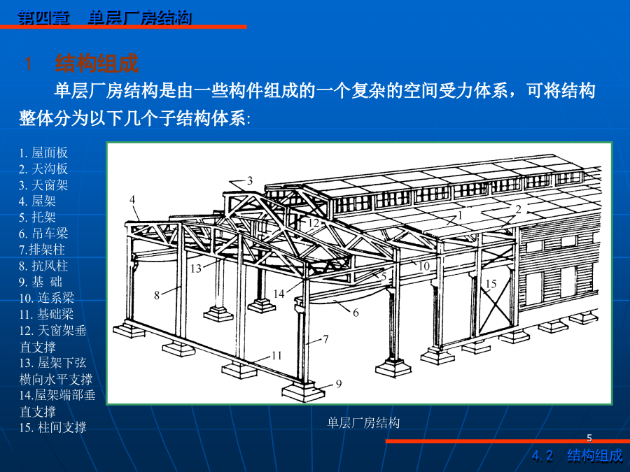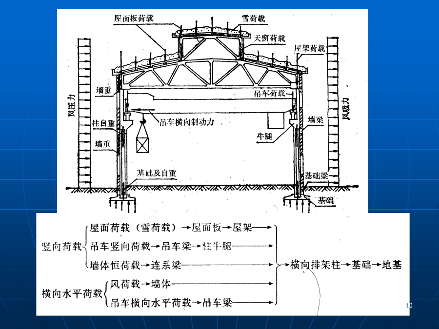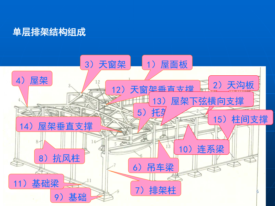第四章单层厂房结构第四章单层厂房结构第四章单层厂房结构第四章单层厂房结构第四章单层厂房结构单层排架结构组成第四章单层厂房结构第四章单层厂房结构10第四章单层厂房结构12第四章单层厂房结构第四章单层厂房结构第四章单层厂房结构第四章单层厂房结构第四章单层厂房结构屋盖支撑19第四章单层厂房结构第四章单层厂房结构第四章单层厂房结构第四章单层厂房结构第四章单层厂房结构第四章单层厂房结构第四章单层厂房结构第四章单层厂房结构第四章单层厂房结构第四章单层厂房结构第四章单层厂房结构第四章单层厂房结构柱间支撑的传力示意图第四章单层厂房结构第四章单层厂房结构第四章单层厂房结构二、定位轴线中柱与纵向定位轴线的关系:A=DC墙、柱与横向定位轴线的关系:三、变形缝设置四、厂房的剖面布置柱顶标高750mm第四章单层厂房结构第四章单层厂房结构第四章单层厂房结构钢筋混凝土及组合屋架钢屋架第四章单层厂房结构第四章单层厂房结构第四章单层厂房结构第四章单层厂房结构第四章单层厂房结构第四章单层厂房结构第四章单层厂房结构第四章单层厂房结构第四章单层厂房结构三、荷载计算第四章单层厂房结构150第四章单层厂房结构第四章单层厂房结构包括屋面均布活荷载、屋面雪荷载和屋面积灰荷载三部分,它们均按屋面水平投影面积计算,其荷载分项系数均为1.4。(l)屋面均布活荷载屋面均布活荷载系考虑屋面在施工、检修时的活荷载,其标准值根据《建筑结构荷载规范》规定按下列情况取:不上人的屋面为0.5kN/m2,上人的屋面为2.0kN/m2。对不上人的屋面,当施工或维修荷载较大时,应按实际情况采用。(2)屋面雪荷载屋面雪荷载的计算方法见第二章。(3)积灰荷载对于生产中有大量排灰的厂房及其邻近建筑物应考虑屋面积灰荷载。对于具有一定除尘设施和保证清灰制度的机械、冶金和水泥厂房的屋面,按《荷载规范》规定,其积灰荷载在0.3~1.0kN/m2之间。荷载的组合:屋面均布活荷载与雪荷载不同时考虑,两者中取较大值计算。当有积灰荷载时,积灰荷载应与屋面活荷载或雪荷载二者中较大值同时考虑。上述三种荷载都是以集中力按与屋盖自重相同的途径传至柱顶。第四章单层厂房结构吊车荷载最大轮压与最小轮压68第四章单层厂房结构吊车横向水平荷载标准值第四章单层厂房结构吊车纵向水平荷载标准值第四章单层厂房结构风载活载下计算简图767778798081828384858687888990919293949596979899第四章单层厂房结构二、剪力分配法4.2.2等高排架的内力计算第四章单层厂房结构第四章单层厂房结构任意荷载作用第四章单层厂房结构R=Ri1084.2.3水平位移计算第四章单层厂房结构第四章单层厂房结构4.2.4排架计算模型的讨论在b、c两种情况下,其最大侧向位移量在恒载、屋面荷载、风载等沿厂房纵向均布的荷载作用下,除了靠近山墙外的排架,它们的水平位移稍小以外,其余排架的水平位移基本上是差别不大。因而各排架之间相互牵制作用不显著,按简化成平面排架来计算对排架内力影响很小,故在均布荷载作用下不考虑整体空间作用。吊车荷载(竖向和水平)是局部荷载(荷载不均匀),当吊车荷载局部作用于某几个排架时,其余排架以及两山墙都对承载的排架有牵制作用。如厂房跨数较多、屋盖刚度较大,则牵制作用也较大。这种排架与排架、排架与山墙之间相互关联和牵制的整体作用即称为厂房的整体空间作用。第四章单层厂房结构第四章单层厂房结构平面排架单厂设计第四章单层厂房结构单跨厂房空间作用分配系数第四章单层厂房结构第四章单层厂房结构第四章单层厂房结构第四章单层厂房结构第四章单层厂房结构第四章单层厂房结构第四章单层厂房结构第四章单层厂房结构第四章单层厂房结构第四章单层厂房结构第四章单层厂房结构第四章单层厂房结构第四章单层厂房结构第四章单层厂房结构第四章单层厂房结构第四章单层厂房结构第四章单层厂房结构第四章单层厂房结构第四章单层厂房结构第四章单层厂房结构第四章单层厂房结构第四章单层厂房结构第四章单层厂房结构第四章单层厂房结构第四章单层厂房结构抗冲切承载力计算第四章单层厂房结构第四章单层厂房结构第四章单层厂房结构第四章单层厂房结构第四章单层厂房结构第四章单层厂房结构第四章单层厂房结构第四章单层厂房结构4.6.1概述下撑式吊车梁4.6.2吊车梁受力特点弯曲中心4.6.3混凝土吊车梁(等截面)设计要点二、构造要点4.6.4钢吊车梁(实腹式)设计要点¢截面尺寸¢连接构造164¢连接构造