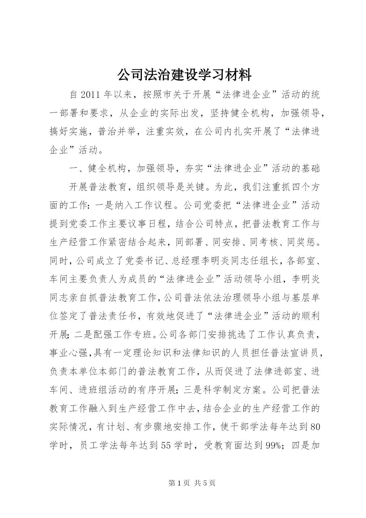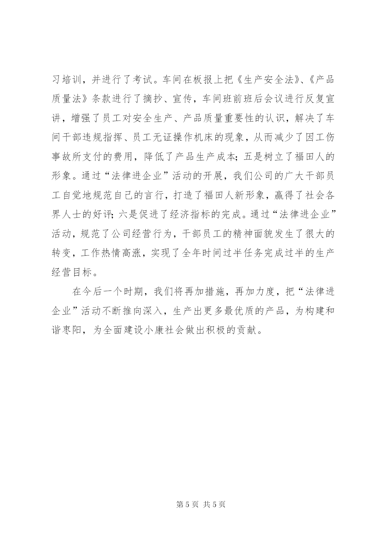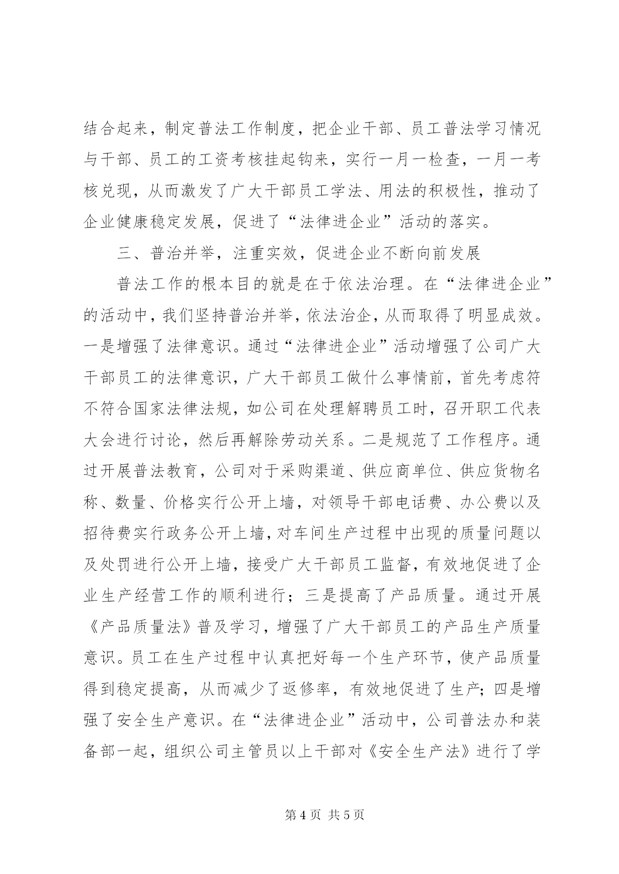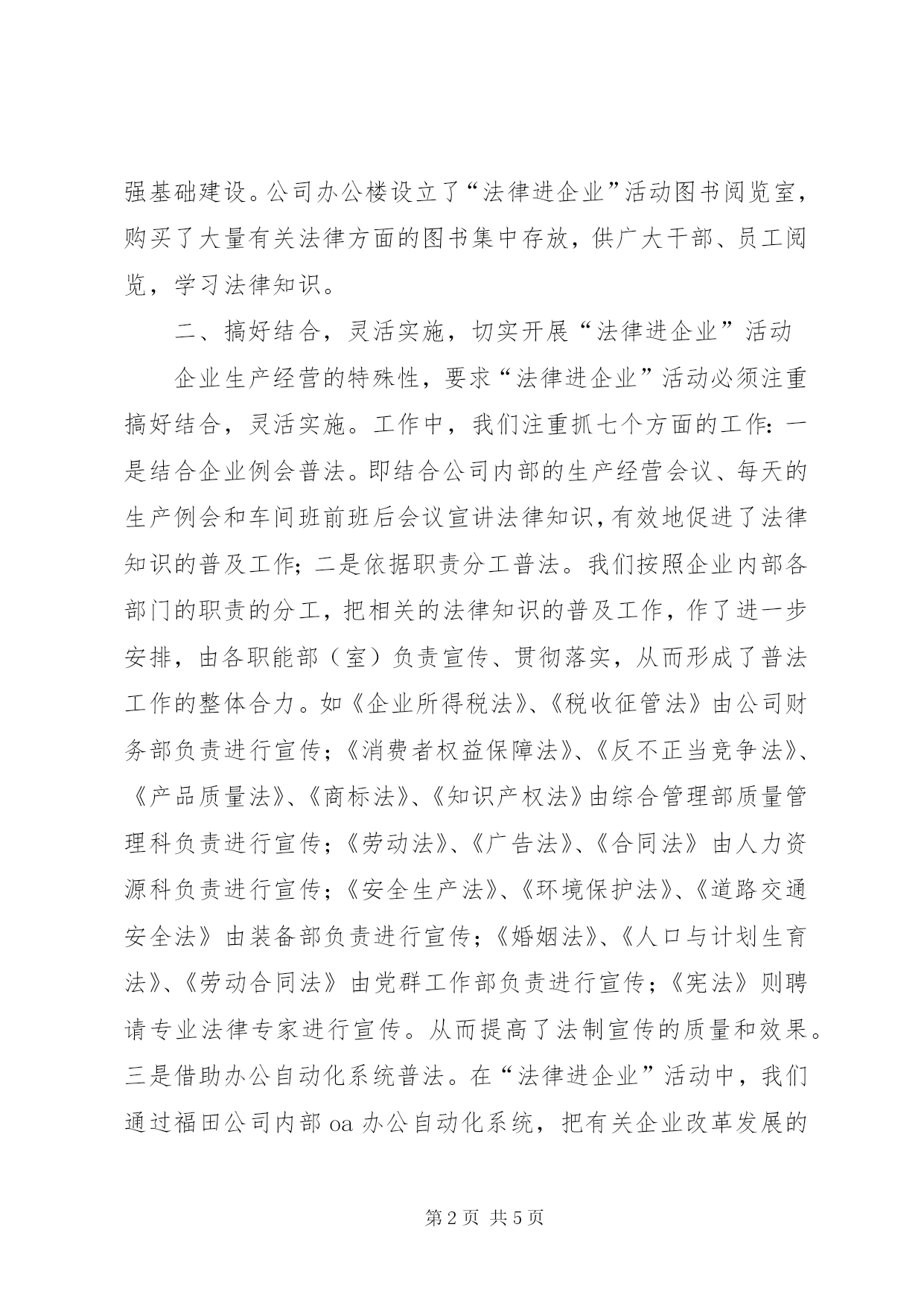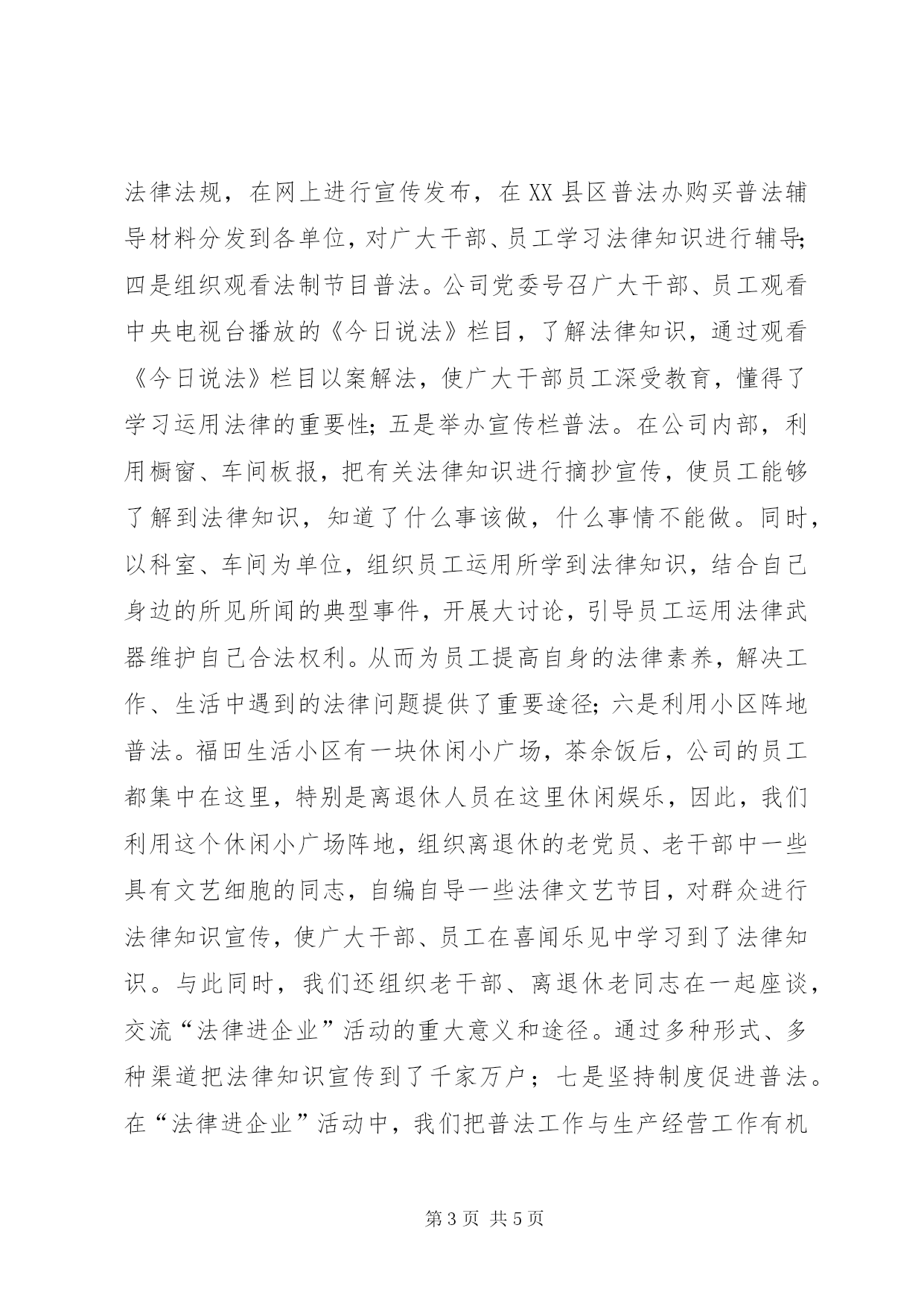 第PAGE\*Arabic\*MERGEFORMAT5页共NUMPAGES\*MERGEFORMAT5页公司法治建设学习材料自2011年以来,按照市关于开展“法律进企业”活动的统一部署和要求,从企业的实际出发,坚持健全机构,加强领导,搞好实施,普治并举,注重实效,在公司内扎实开展了“法律进企业”活动。一、健全机构,加强领导,夯实“法律进企业”活动的基础开展普法教育,组织领导是关键。为此,我们注重抓四个方面的工作:一是纳入工作议程。公司党委把“法律进企业”活动提到党委工作主要议事日程,结合公司特点,把普法教育工作与生产经营工作紧密结合起来,同部署、同安排、同考核、同奖惩。同时,公司成立了党委书记、总经理李明炎同志任组长,各部室、车间主要负责人为成员的“法律进企业”活动领导小组,李明炎同志亲自抓普法教育工作,公司普法依法治理领导小组与基层单位签定了普法责任书,有效地促进了“法律进企业”活动的顺利开展;二是配强工作专班。公司各部门安排挑选了工作认真负责,事业心强,具有一定理论知识和法律知识的人员担任普法宣讲员,负责本单位本部门的普法教育工作,从而促进了法律进部室、进车间、进班组活动的有序开展;三是科学制定方案。公司把普法教育工作融入到生产经营工作中去,结合企业的生产经营工作的实际情况,有计划、有步骤地安排工作,使干部学法每年达到80学时,员工学法每年达到55学时,受教育面达到99%;四是加强基础建设。公司办公楼设立了“法律进企业”活动图书阅览室,购买了大量有关法律方面的图书集中存放,供广大干部、员工阅览,学习法律知识。二、搞好结合,灵活实施,切实开展“法律进企业”活动企业生产经营的特殊性,要求“法律进企业”活动必须注重搞好结合,灵活实施。工作中,我们注重抓七个方面的工作:一是结合企业例会普法。即结合公司内部的生产经营会议、每天的生产例会和车间班前班后会议宣讲法律知识,有效地促进了法律知识的普及工作;二是依据职责分工普法。我们按照企业内部各部门的职责的分工,把相关的法律知识的普及工作,作了进一步安排,由各职能部(室)负责宣传、贯彻落实,从而形成了普法工作的整体合力。如《企业所得税法》、《税收征管法》由公司财务部负责进行宣传;《消费者权益保障法》、《反不正当竞争法》、《产品质量法》、《商标法》、《知识产权法》由综合管理部质量管理科负责进行宣传;《劳动法》、《广告法》、《合同法》由人力资源科负责进行宣传;《安全生产法》、《环境保护法》、《道路交通安全法》由装备部负责进行宣传;《婚姻法》、《人口与计划生育法》、《劳动合同法》由党群工作部负责进行宣传;《宪法》则聘请专业法律专家进行宣传。从而提高了法制宣传的质量和效果。三是借助办公自动化系统普法。在“法律进企业”活动中,我们通过福田公司内部oa办公自动化系统,把有关企业改革发展的法律法规,在网上进行宣传发布,在XX县区普法办购买普法辅导材料分发到各单位,对广大干部、员工学习法律知识进行辅导;四是组织观看法制节目普法。公司党委号召广大干部、员工观看中央电视台播放的《今日说法》栏目,了解法律知识,通过观看《今日说法》栏目以案解法,使广大干部员工深受教育,懂得了学习运用法律的重要性;五是举办宣传栏普法。在公司内部,利用橱窗、车间板报,把有关法律知识进行摘抄宣传,使员工能够了解到法律知识,知道了什么事该做,什么事情不能做。同时,以科室、车间为单位,组织员工运用所学到法律知识,结合自己身边的所见所闻的典型事件,开展大讨论,引导员工运用法律武器维护自己合法权利。从而为员工提高自身的法律素养,解决工作、生活中遇到的法律问题提供了重要途径;六是利用小区阵地普法。福田生活小区有一块休闲小广场,茶余饭后,公司的员工都集中在这里,特别是离退休人员在这里休闲娱乐,因此,我们利用这个休闲小广场阵地,组织离退休的老党员、老干部中一些具有文艺细胞的同志,自编自导一些法律文艺节目,对群众进行法律知识宣传,使广大干部、员工在喜闻乐见中学习到了法律知识。与此同时,我们还组织老干部、离退休老同志在一起座谈,交流“法律进企业”活动的重大意义和途径。通过多种形式、多种渠道把法律知识宣传到了千家万户;七是坚持制度促进普法。在“法律进企业”活动中,我们把普法工作与生产经营工作有机结合起来,制定普法工作制度,把企业干部、员工普法学习情况与干部、员工的工资考核挂起钩来,实行一月一检查,一月一考核兑现,从而激发了广大干部员工学法、用法的积极性,推动了企业健康稳定发展,促进了“法律进企业”活动的落实。三、普治并举,注重实效,促进企业不断向前发展普法工作的根本目的就是在于依法治理。在“法律进企业”的活动中,我们坚持普治并举,依法治企,从而取得了明显成效。一是增强了法律意识。通过“法律进企业”活动增强了公司广大干部员工的法律