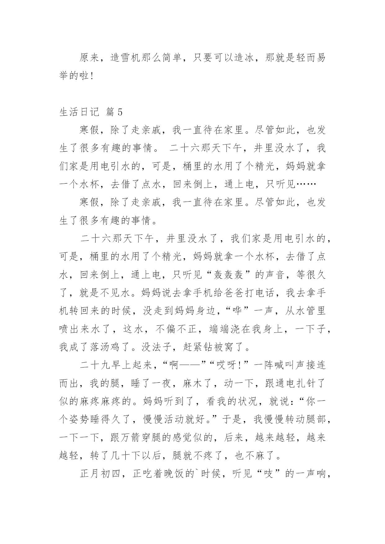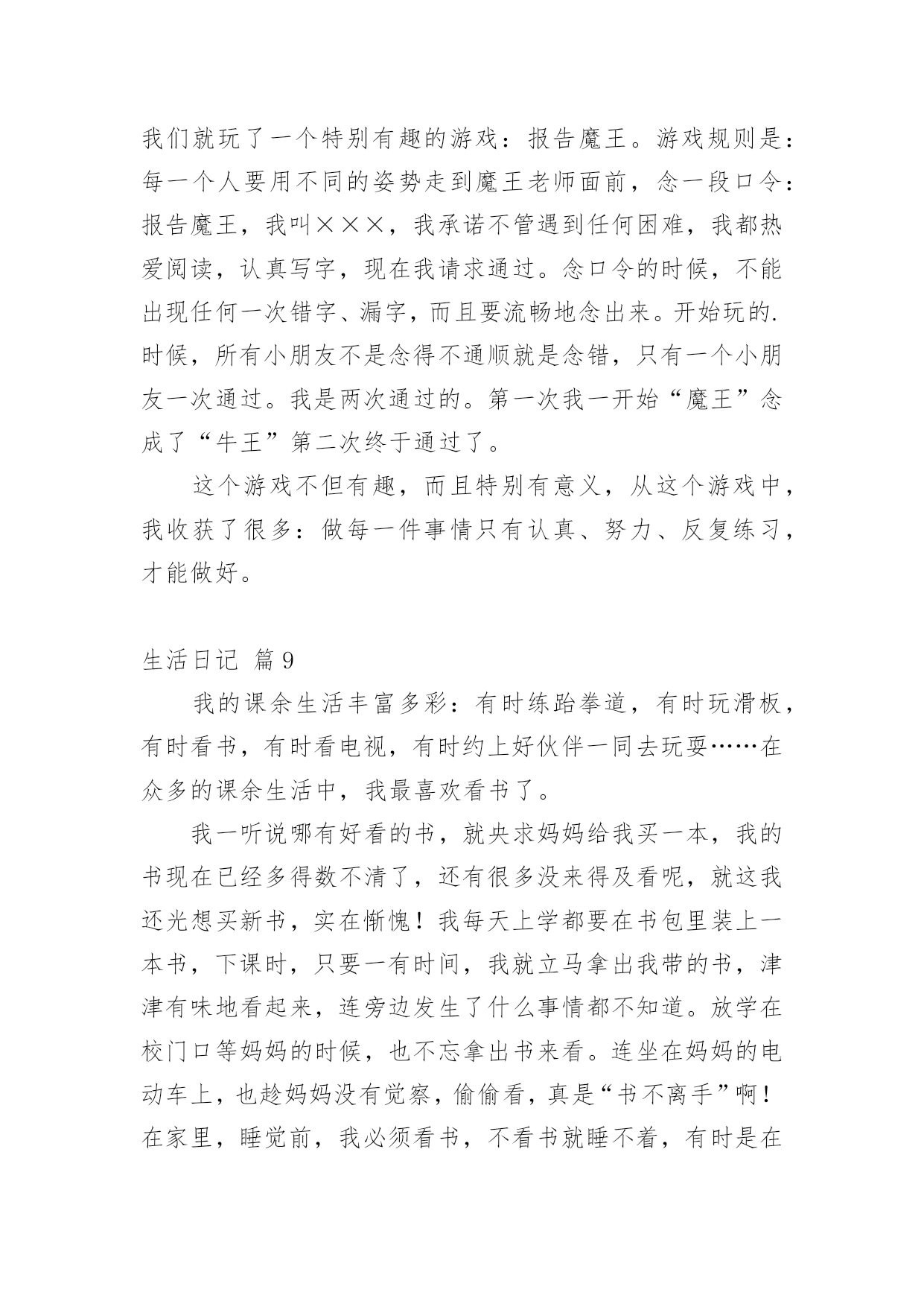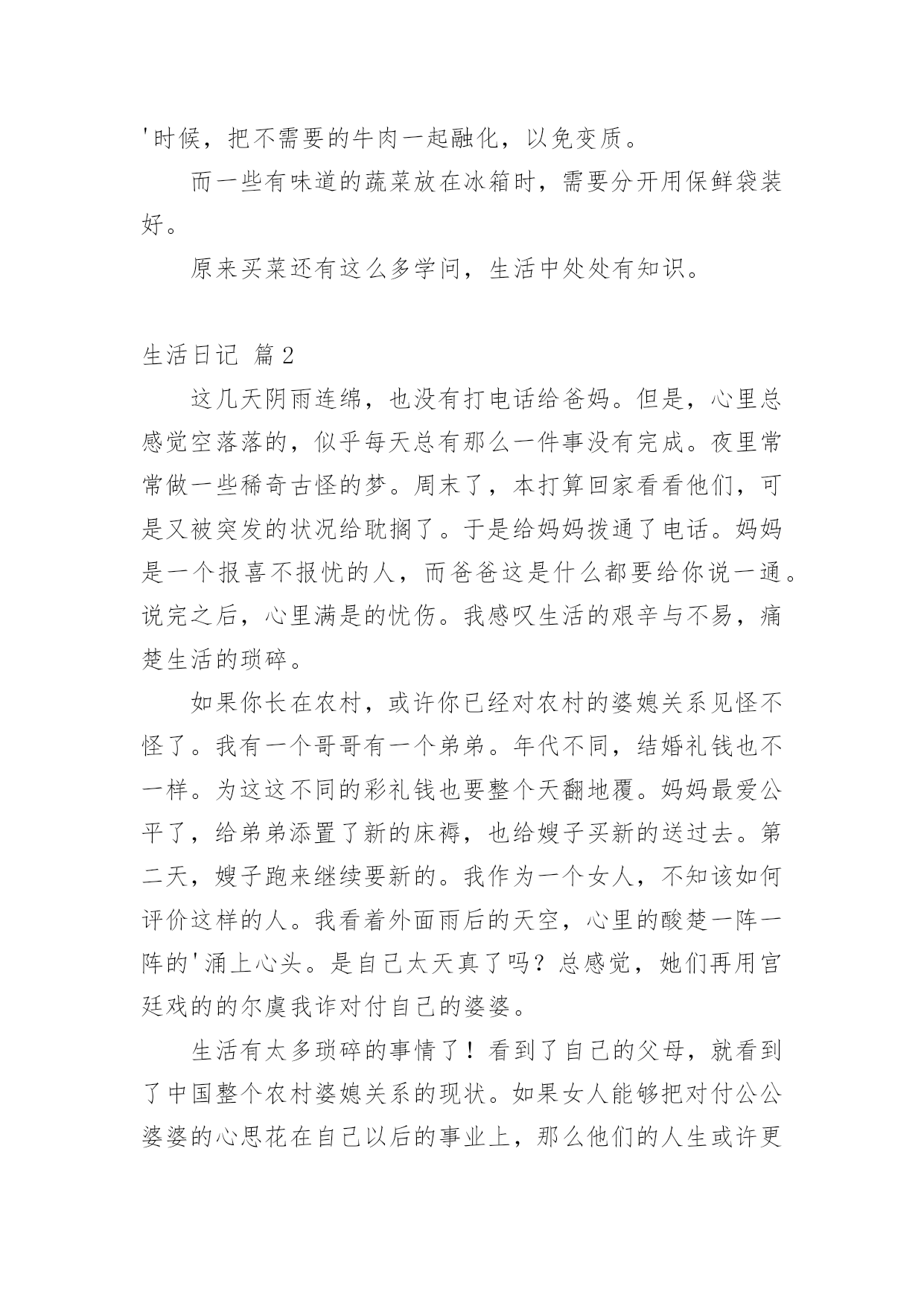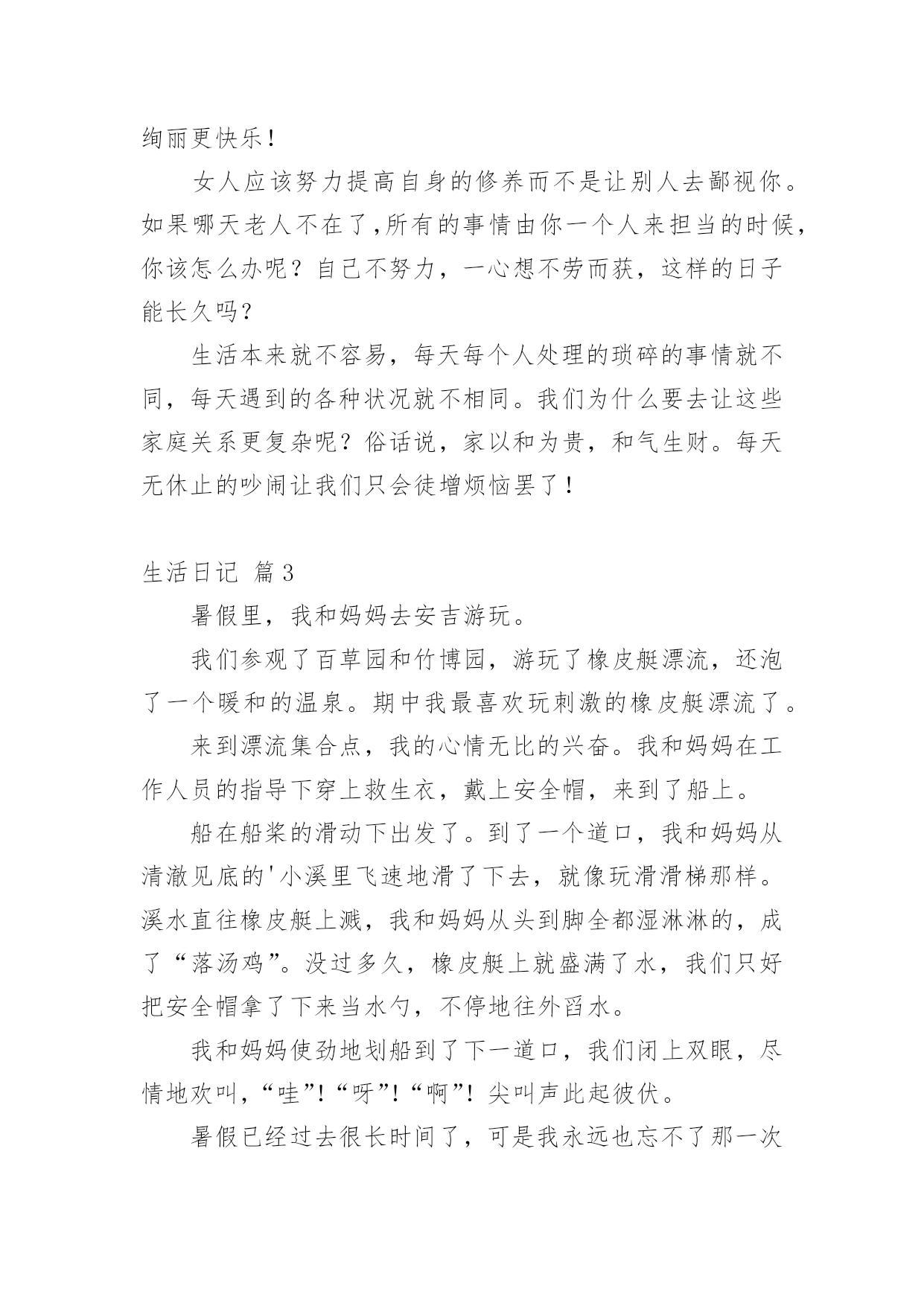 生活日记[精华]生活日记一天即将完结,心中一定有不少感想,想必是时候写一篇日记了。是不是无从下笔、没有头绪?以下是小编为大家整理的生活日记9篇,仅供参考,欢迎大家阅读。生活日记篇1今天,我和妈妈去葑门菜市场买菜,我们买了牛肉(牛腱子)、鲫鱼、冬瓜、鸡心……牛腱子里富含胶原蛋白,可以亮发、健脑、明目。那么,怎么挑选好的牛腱子呢?妈妈告诉我:“牛腱子中间白色部分都是筋,肉熟后会变成透明状,老牛肉色深红、肉质较粗;嫩牛肉色浅红,肉质坚而细,富有弹性。我们一般都选择嫩牛肉。”妈妈问:“你想怎么吃呢?是红烧牛腩?还是番茄牛肉汤?咖喱土豆炒牛肉也不错的哦!”我想了想,说:“就吃番茄牛肉汤吧,我最爱吃番茄了,番茄的营养可好咯!”咦,妈妈又买了茶树菇、包菜,怎么回事?妈妈说了:“在这个汤里加上这两样,味道更鲜美。”“哦,我知道了。”在买冬瓜的时候,卖菜的老伯伯还送了我们一小把葱,看见葱,让我想起了中国达人秀里的传奇人物菜花甜妈的那首“送你葱”。喔,太令人惊叹了。菜买的多了,改怎么办呢?妈妈把牛肉分成三份,放在保鲜袋里,不用的就直接放到了冰箱的速冻柜中,下次吃的'时候,把不需要的牛肉一起融化,以免变质。而一些有味道的蔬菜放在冰箱时,需要分开用保鲜袋装好。原来买菜还有这么多学问,生活中处处有知识。生活日记篇2这几天阴雨连绵,也没有打电话给爸妈。但是,心里总感觉空落落的,似乎每天总有那么一件事没有完成。夜里常常做一些稀奇古怪的梦。周末了,本打算回家看看他们,可是又被突发的状况给耽搁了。于是给妈妈拨通了电话。妈妈是一个报喜不报忧的人,而爸爸这是什么都要给你说一通。说完之后,心里满是的忧伤。我感叹生活的艰辛与不易,痛楚生活的琐碎。如果你长在农村,或许你已经对农村的婆媳关系见怪不怪了。我有一个哥哥有一个弟弟。年代不同,结婚礼钱也不一样。为这这不同的彩礼钱也要整个天翻地覆。妈妈最爱公平了,给弟弟添置了新的床褥,也给嫂子买新的送过去。第二天,嫂子跑来继续要新的。我作为一个女人,不知该如何评价这样的人。我看着外面雨后的天空,心里的酸楚一阵一阵的'涌上心头。是自己太天真了吗?总感觉,她们再用宫廷戏的的尔虞我诈对付自己的婆婆。生活有太多琐碎的事情了!看到了自己的父母,就看到了中国整个农村婆媳关系的现状。如果女人能够把对付公公婆婆的心思花在自己以后的事业上,那么他们的人生或许更绚丽更快乐!女人应该努力提高自身的修养而不是让别人去鄙视你。如果哪天老人不在了,所有的事情由你一个人来担当的时候,你该怎么办呢?自己不努力,一心想不劳而获,这样的日子能长久吗?生活本来就不容易,每天每个人处理的琐碎的事情就不同,每天遇到的各种状况就不相同。我们为什么要去让这些家庭关系更复杂呢?俗话说,家以和为贵,和气生财。每天无休止的吵闹让我们只会徒增烦恼罢了!生活日记篇3暑假里,我和妈妈去安吉游玩。我们参观了百草园和竹博园,游玩了橡皮艇漂流,还泡了一个暖和的温泉。期中我最喜欢玩刺激的橡皮艇漂流了。来到漂流集合点,我的心情无比的兴奋。我和妈妈在工作人员的指导下穿上救生衣,戴上安全帽,来到了船上。船在船桨的滑动下出发了。到了一个道口,我和妈妈从清澈见底的'小溪里飞速地滑了下去,就像玩滑滑梯那样。溪水直往橡皮艇上溅,我和妈妈从头到脚全都湿淋淋的,成了“落汤鸡”。没过多久,橡皮艇上就盛满了水,我们只好把安全帽拿了下来当水勺,不停地往外舀水。我和妈妈使劲地划船到了下一道口,我们闭上双眼,尽情地欢叫,“哇”!“呀”!“啊”!尖叫声此起彼伏。暑假已经过去很长时间了,可是我永远也忘不了那一次的橡皮艇漂流。我多想再玩一玩那刺激的、令人回味的橡皮艇漂流啊。生活日记篇4我的寒假,最令我兴奋的是在爷爷家。在爷爷家似乎也没什么太好玩的,话得从爷爷的自来水龙头说起。我有个表弟,名叫郝雨。爷爷家里有个大院子,自来水龙头在院子里面。冬天流出来的水都冻成了冰块,话得从水龙头……我的寒假,最令我兴奋的是在爷爷家。在爷爷家似乎也没什么太好玩的,话得从爷爷的.自来水龙头说起。我有个表弟,名叫郝雨。爷爷家里有个大院子,自来水龙头在院子里面。冬天流出来的水都冻成了冰块,话得从水龙头的“毛病”说起。水龙头它漏了缝隙,小小的,喷出来嘻嘻的。日积月累,慢慢就变成了一个一米多的、有自然形状的冰块,下面还会滴水,本来有一块冰块,慢慢的就把冰块给穿透了,我俩称它为“造酒厂”。一天,我和郝雨闲的没事干,看看这冰,有许多多余的地方,郝雨有一把斧子,我有一个锤子,我们打算把多余的冰砸掉。“砰”!“砰”!一块冰砸掉了,再来几下,又一块冰砸掉了。接着又有一块冰,需要修建一下。我还有一把刀,磨一下就可以把冰磨成碎末当雪来骗爸爸。我拿了一个小碗,把我们弄得碎末放进碗里,反正爸爸现在正在睡觉,肯定能够成功的!信不信由你,爸爸还真信了,嘻嘻,我的“冰雪计”成功