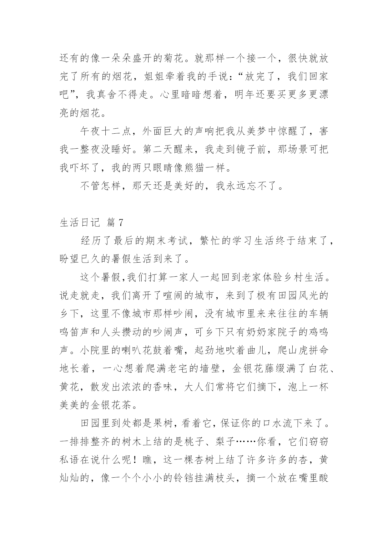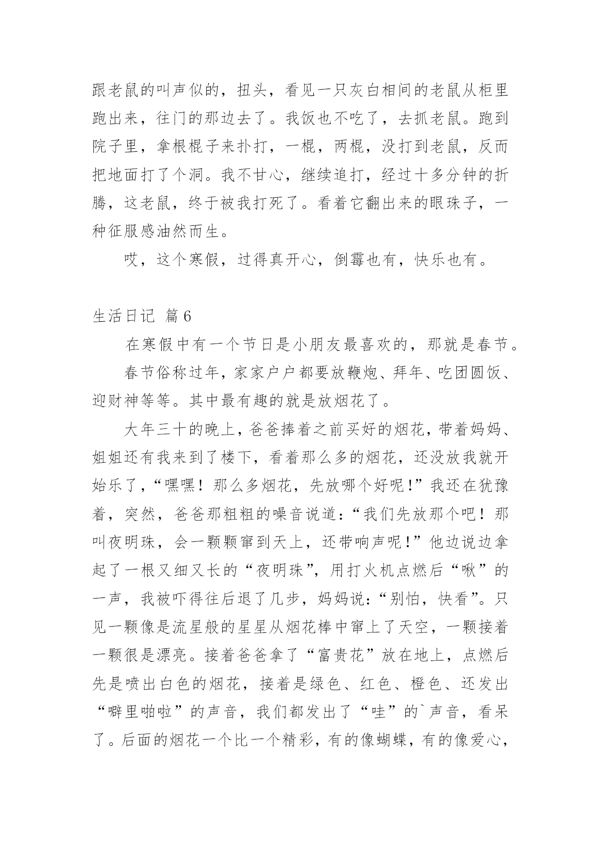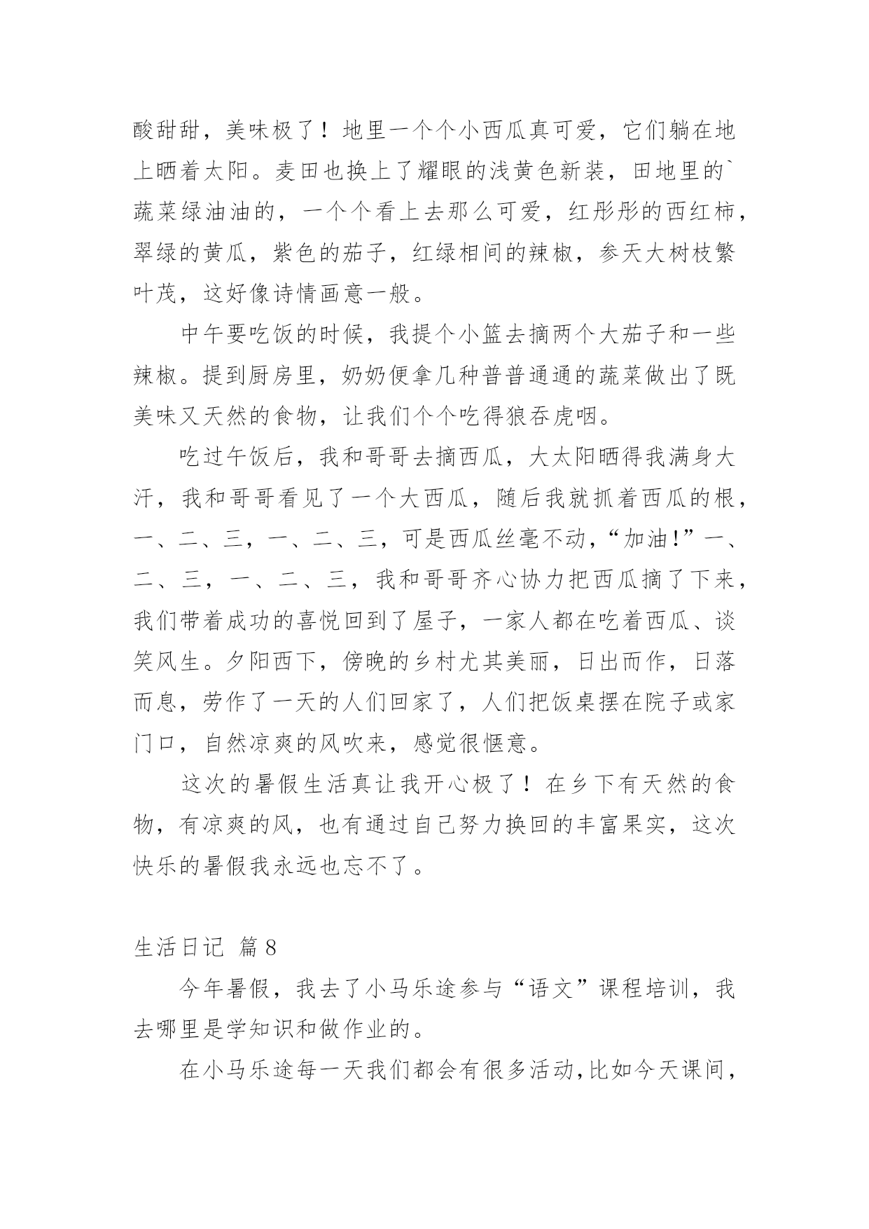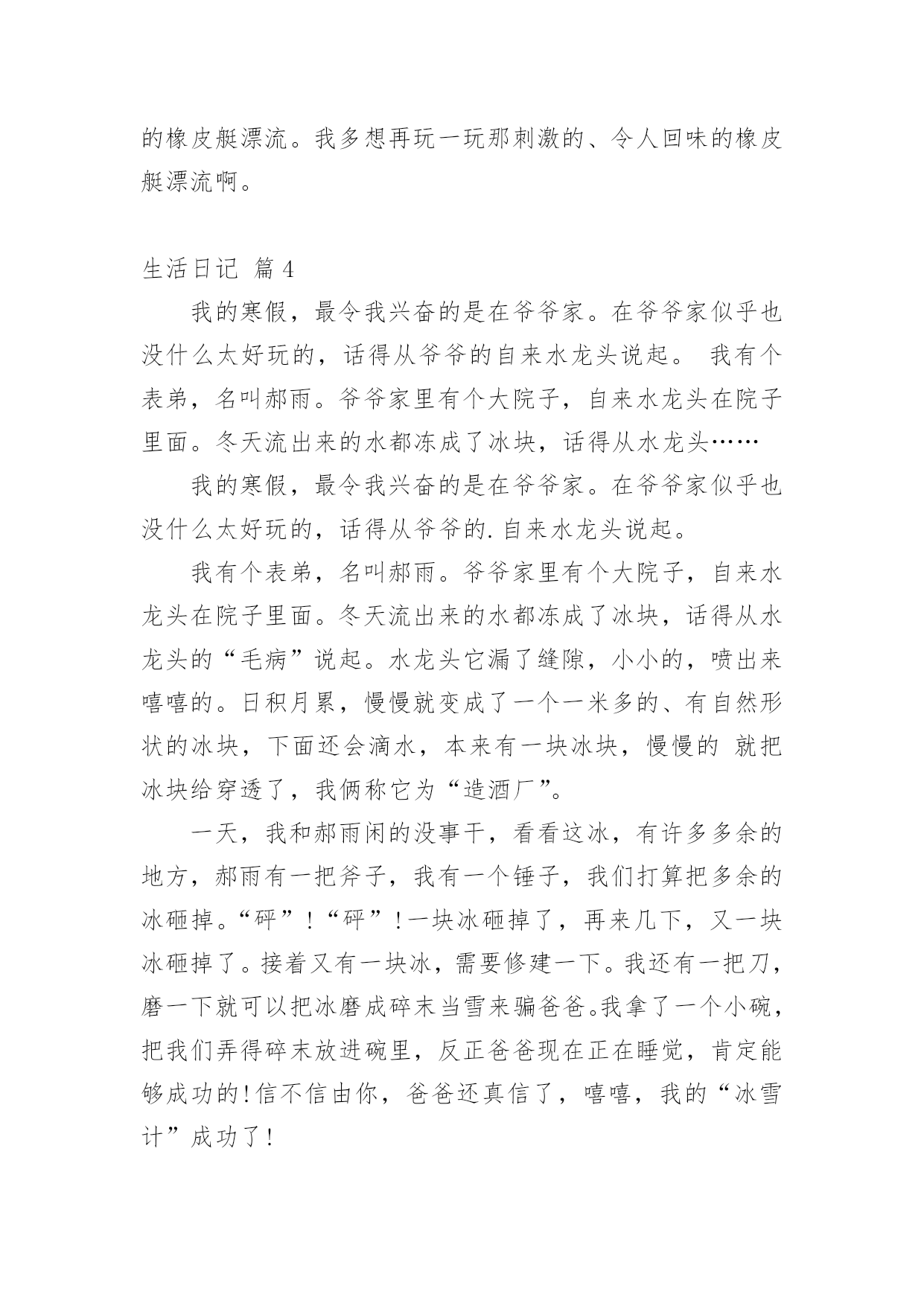 生活日记[精华]生活日记一天即将完结,心中一定有不少感想,想必是时候写一篇日记了。是不是无从下笔、没有头绪?以下是小编为大家整理的生活日记9篇,仅供参考,欢迎大家阅读。生活日记篇1今天,我和妈妈去葑门菜市场买菜,我们买了牛肉(牛腱子)、鲫鱼、冬瓜、鸡心……牛腱子里富含胶原蛋白,可以亮发、健脑、明目。那么,怎么挑选好的牛腱子呢?妈妈告诉我:“牛腱子中间白色部分都是筋,肉熟后会变成透明状,老牛肉色深红、肉质较粗;嫩牛肉色浅红,肉质坚而细,富有弹性。我们一般都选择嫩牛肉。”妈妈问:“你想怎么吃呢?是红烧牛腩?还是番茄牛肉汤?咖喱土豆炒牛肉也不错的哦!”我想了想,说:“就吃番茄牛肉汤吧,我最爱吃番茄了,番茄的营养可好咯!”咦,妈妈又买了茶树菇、包菜,怎么回事?妈妈说了:“在这个汤里加上这两样,味道更鲜美。”“哦,我知道了。”在买冬瓜的时候,卖菜的老伯伯还送了我们一小把葱,看见葱,让我想起了中国达人秀里的传奇人物菜花甜妈的那首“送你葱”。喔,太令人惊叹了。菜买的多了,改怎么办呢?妈妈把牛肉分成三份,放在保鲜袋里,不用的就直接放到了冰箱的速冻柜中,下次吃的'时候,把不需要的牛肉一起融化,以免变质。而一些有味道的蔬菜放在冰箱时,需要分开用保鲜袋装好。原来买菜还有这么多学问,生活中处处有知识。生活日记篇2这几天阴雨连绵,也没有打电话给爸妈。但是,心里总感觉空落落的,似乎每天总有那么一件事没有完成。夜里常常做一些稀奇古怪的梦。周末了,本打算回家看看他们,可是又被突发的状况给耽搁了。于是给妈妈拨通了电话。妈妈是一个报喜不报忧的人,而爸爸这是什么都要给你说一通。说完之后,心里满是的忧伤。我感叹生活的艰辛与不易,痛楚生活的琐碎。如果你长在农村,或许你已经对农村的婆媳关系见怪不怪了。我有一个哥哥有一个弟弟。年代不同,结婚礼钱也不一样。为这这不同的彩礼钱也要整个天翻地覆。妈妈最爱公平了,给弟弟添置了新的床褥,也给嫂子买新的送过去。第二天,嫂子跑来继续要新的。我作为一个女人,不知该如何评价这样的人。我看着外面雨后的天空,心里的酸楚一阵一阵的'涌上心头。是自己太天真了吗?总感觉,她们再用宫廷戏的的尔虞我诈对付自己的婆婆。生活有太多琐碎的事情了!看到了自己的父母,就看到了中国整个农村婆媳关系的现状。如果女人能够把对付公公婆婆的心思花在自己以后的事业上,那么他们的人生或许更绚丽更快乐!女人应该努力提高自身的修养而不是让别人去鄙视你。如果哪天老人不在了,所有的事情由你一个人来担当的时候,你该怎么办呢?自己不努力,一心想不劳而获,这样的日子能长久吗?生活本来就不容易,每天每个人处理的琐碎的事情就不同,每天遇到的各种状况就不相同。我们为什么要去让这些家庭关系更复杂呢?俗话说,家以和为贵,和气生财。每天无休止的吵闹让我们只会徒增烦恼罢了!生活日记篇3暑假里,我和妈妈去安吉游玩。我们参观了百草园和竹博园,游玩了橡皮艇漂流,还泡了一个暖和的温泉。期中我最喜欢玩刺激的橡皮艇漂流了。来到漂流集合点,我的心情无比的兴奋。我和妈妈在工作人员的指导下穿上救生衣,戴上安全帽,来到了船上。船在船桨的滑动下出发了。到了一个道口,我和妈妈从清澈见底的'小溪里飞速地滑了下去,就像玩滑滑梯那样。溪水直往橡皮艇上溅,我和妈妈从头到脚全都湿淋淋的,成了“落汤鸡”。没过多久,橡皮艇上就盛满了水,我们只好把安全帽拿了下来当水勺,不停地往外舀水。我和妈妈使劲地划船到了下一道口,我们闭上双眼,尽情地欢叫,“哇”!“呀”!“啊”!尖叫声此起彼伏。暑假已经过去很长时间了,可是我永远也忘不了那一次的橡皮艇漂流。我多想再玩一玩那刺激的、令人回味的橡皮艇漂流啊。生活日记篇4我的寒假,最令我兴奋的是在爷爷家。在爷爷家似乎也没什么太好玩的,话得从爷爷的自来水龙头说起。我有个表弟,名叫郝雨。爷爷家里有个大院子,自来水龙头在院子里面。冬天流出来的水都冻成了冰块,话得从水龙头……我的寒假,最令我兴奋的是在爷爷家。在爷爷家似乎也没什么太好玩的,话得从爷爷的.自来水龙头说起。我有个表弟,名叫郝雨。爷爷家里有个大院子,自来水龙头在院子里面。冬天流出来的水都冻成了冰块,话得从水龙头的“毛病”说起。水龙头它漏了缝隙,小小的,喷出来嘻嘻的。日积月累,慢慢就变成了一个一米多的、有自然形状的冰块,下面还会滴水,本来有一块冰块,慢慢的就把冰块给穿透了,我俩称它为“造酒厂”。一天,我和郝雨闲的没事干,看看这冰,有许多多余的地方,郝雨有一把斧子,我有一个锤子,我们打算把多余的冰砸掉。“砰”!“砰”!一块冰砸掉了,再来几下,又一块冰砸掉了。接着又有一块冰,需要修建一下。我还有一把刀,磨一下就可以把冰磨成碎末当雪来骗爸爸。我拿了一个小碗,把我们弄得碎末放进碗里,反正爸爸现在正在睡觉,肯定能够成功的!信不信由你,爸爸还真信了,嘻嘻,我的“冰雪计”成功