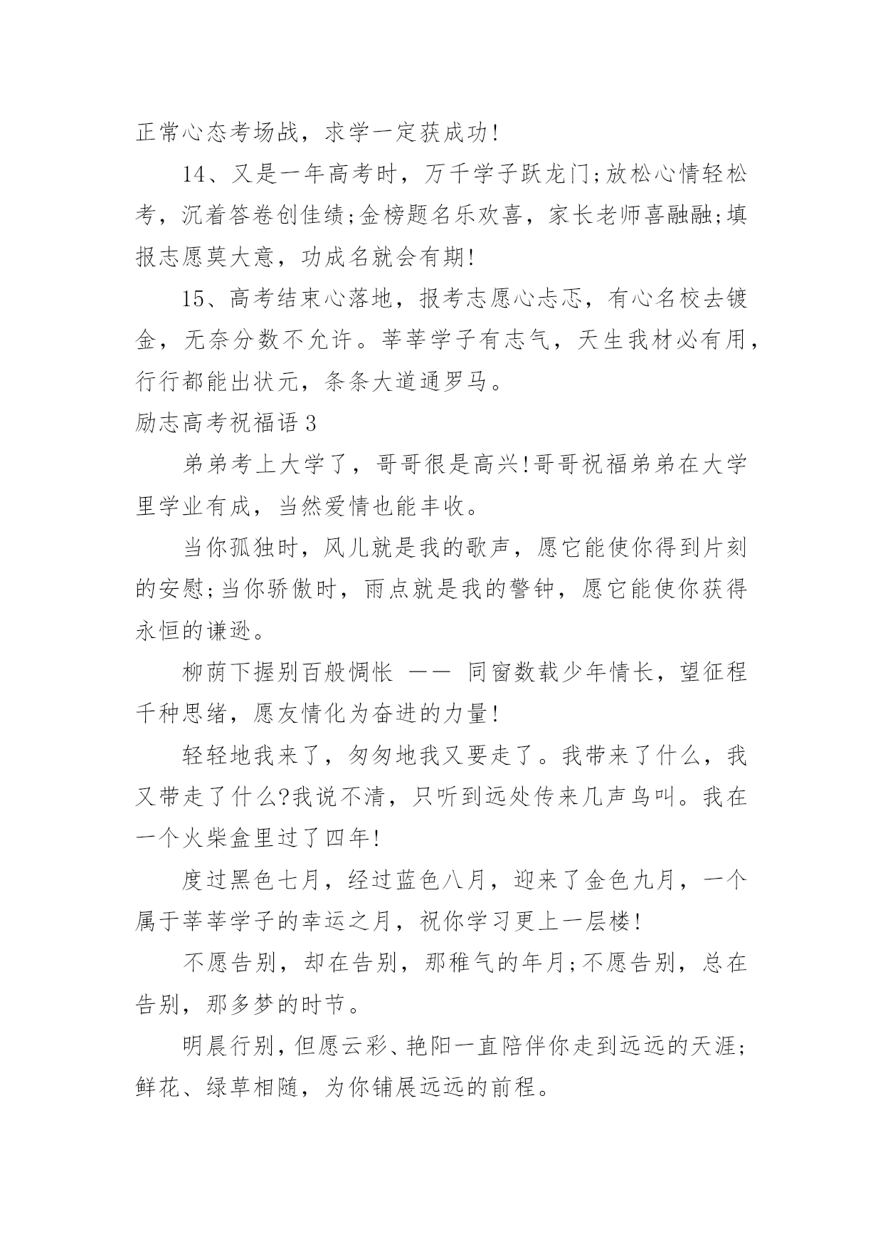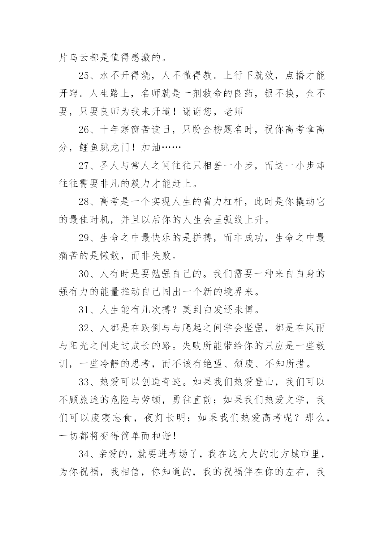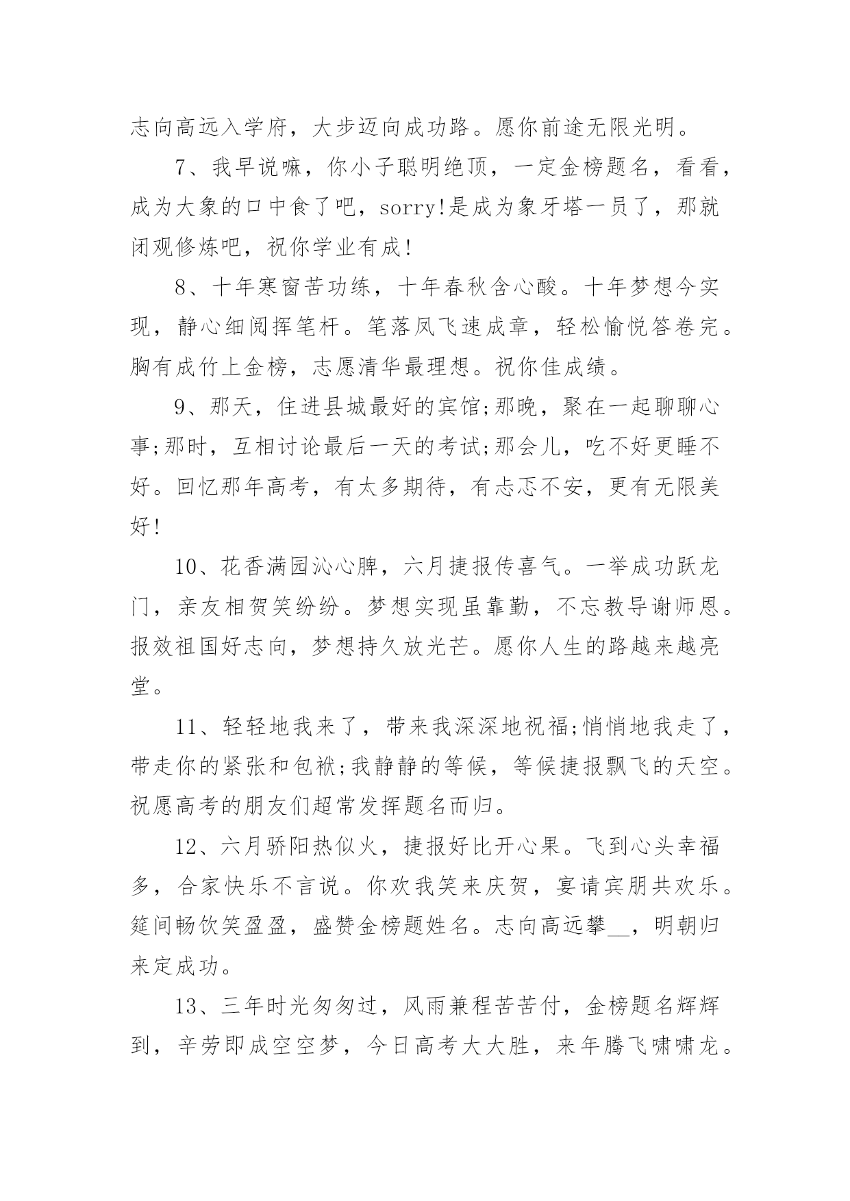 励志高考祝福语励志高考祝福语在日复一日的学习、工作或生活中,大家都经常接触到祝福语吧,祝福语有助于促进交流,拉近人与人之间的关系。写起祝福语来就毫无头绪?下面是小编精心整理的励志高考祝福语,仅供参考,欢迎大家阅读。励志高考祝福语11、心有多宽,舞台就有多大,心有多高,梦想就有多远。2、狠抓基础是成功的基础,持之以恒是胜利的保证。3、行动不一定带来快乐,而无行动则决无快乐。4、不苦不累,高三无味;不拼不搏,高三白活。5、生命之中最快乐的是拼搏,而非成功,生命之中最痛苦的是懒散,而非失败。6、今天多一份拼搏、明天多几份欢笑。7、一心向着自己的目标前进的人,整个世界都会给他让路。8、静下来,铸我实力;拼上去,亮我风采。9、成功决不喜欢会见懒汉,而是唤醒懒汉。10、人活着要呼吸。呼者,出一口气;吸者,争一口气。11、拼搏、拼搏、再拼搏;进取、进取、再进取。12、拼一载春秋,搏一生无悔。13、今日披星戴月,明日成就梦想。14、高三不再有,劝君珍惜之。一年之经历,终身之财富。15、为了不让生活留下遗憾和后悔,我们应该尽可能抓住一切改变生活的机会。励志高考祝福语21、迎战高考,十年寒窗,今日出招。早睡早起休息好,餐餐营养搭配好,生冷零食远离好,考试用具准备好,有备而战发挥好。祝高考顺利,金榜题名!2、辛勤耕耘知识地,寒窗苦读数十年。今朝征战上考场,自信饱满书人生。奋笔疾书智慧语,锦绣文章佳偶成。金榜题名必然事,鱼跃龙门花盛放。全国高考日,愿莘莘学子赢得锦绣前程。3、昨日撒下勤奋种,今朝一搏必成功。鲤鱼一跃便成龙,大鹏展翅震长空。前程似锦圆美梦,锦衣凯旋沐春风。寒窗不负苦心人,金榜有你祝高中!4、十年的寒窗苦读,十年的风雨历程,十年的勤奋努力,十年的书海征战,迎来今日的考试,愿学子们将十年的准备化作今日考场上的利剑,超长发挥,取得更好的成绩!5、当年有太多的遗憾,现在都寄托给了你,但希望你不要有太大压力,就像老爸还是可以养得起你,马上就来了,望你平常心面对,考出好成绩。6、芬芳满园花枝俏,捷报传来心欢笑。如风似雨清凉到,合家开怀乐淘陶。设宴举杯同庆贺,笑语盈盈共欢乐。志向高远入学府,大步迈向成功路。愿你前途无限光明。7、我早说嘛,你小子聪明绝顶,一定金榜题名,看看,成为大象的口中食了吧,sorry!是成为象牙塔一员了,那就闭观修炼吧,祝你学业有成!8、十年寒窗苦功练,十年春秋含心酸。十年梦想今实现,静心细阅挥笔杆。笔落凤飞速成章,轻松愉悦答卷完。胸有成竹上金榜,志愿清华最理想。祝你佳成绩。9、那天,住进县城最好的宾馆;那晚,聚在一起聊聊心事;那时,互相讨论最后一天的考试;那会儿,吃不好更睡不好。回忆那年高考,有太多期待,有忐忑不安,更有无限美好!10、花香满园沁心脾,六月捷报传喜气。一举成功跃龙门,亲友相贺笑纷纷。梦想实现虽靠勤,不忘教导谢师恩。报效祖国好志向,梦想持久放光芒。愿你人生的路越来越亮堂。11、轻轻地我来了,带来我深深地祝福;悄悄地我走了,带走你的紧张和包袱;我静静的等候,等候捷报飘飞的天空。祝愿高考的朋友们超常发挥题名而归。12、六月骄阳热似火,捷报好比开心果。飞到心头幸福多,合家快乐不言说。你欢我笑来庆贺,宴请宾朋共欢乐。筵间畅饮笑盈盈,盛赞金榜题姓名。志向高远攀__,明朝归来定成功。13、三年时光匆匆过,风雨兼程苦苦付,金榜题名辉辉到,辛劳即成空空梦,今日高考大大胜,来年腾飞啸啸龙。正常心态考场战,求学一定获成功!14、又是一年高考时,万千学子跃龙门;放松心情轻松考,沉着答卷创佳绩;金榜题名乐欢喜,家长老师喜融融;填报志愿莫大意,功成名就会有期!15、高考结束心落地,报考志愿心忐忑,有心名校去镀金,无奈分数不允许。莘莘学子有志气,天生我材必有用,行行都能出状元,条条大道通罗马。励志高考祝福语3弟弟考上大学了,哥哥很是高兴!哥哥祝福弟弟在大学里学业有成,当然爱情也能丰收。当你孤独时,风儿就是我的歌声,愿它能使你得到片刻的安慰;当你骄傲时,雨点就是我的警钟,愿它能使你获得永恒的谦逊。柳荫下握别百般惆怅――同窗数载少年情长,望征程千种思绪,愿友情化为奋进的力量!轻轻地我来了,匆匆地我又要走了。我带来了什么,我又带走了什么?我说不清,只听到远处传来几声鸟叫。我在一个火柴盒里过了四年!度过黑色七月,经过蓝色八月,迎来了金色九月,一个属于莘莘学子的幸运之月,祝你学习更上一层楼!不愿告别,却在告别,那稚气的年月;不愿告别,总在告别,那多梦的时节。明晨行别,但愿云彩、艳阳一直陪伴你走到远远的天涯;鲜花、绿草相随,为你铺展远远的前程。康庄大道摆在你的面前,鲜花和笑声在向你招手,赞美和荣耀在你头上盘旋,祝福你,我们的天之骄子!祝你圆满完成学业,掌声和鲜花永远属于你!“先天下之忧而忧,后天下之乐而乐”,做个有志、有识之士励志高考祝福语4胜利者