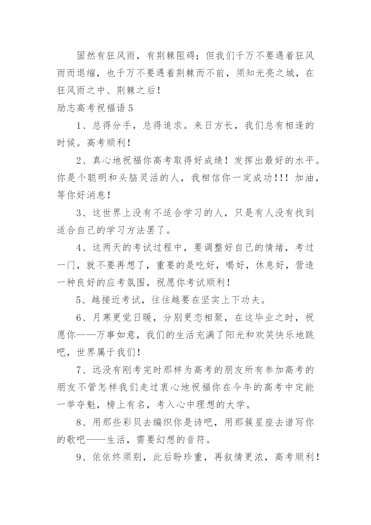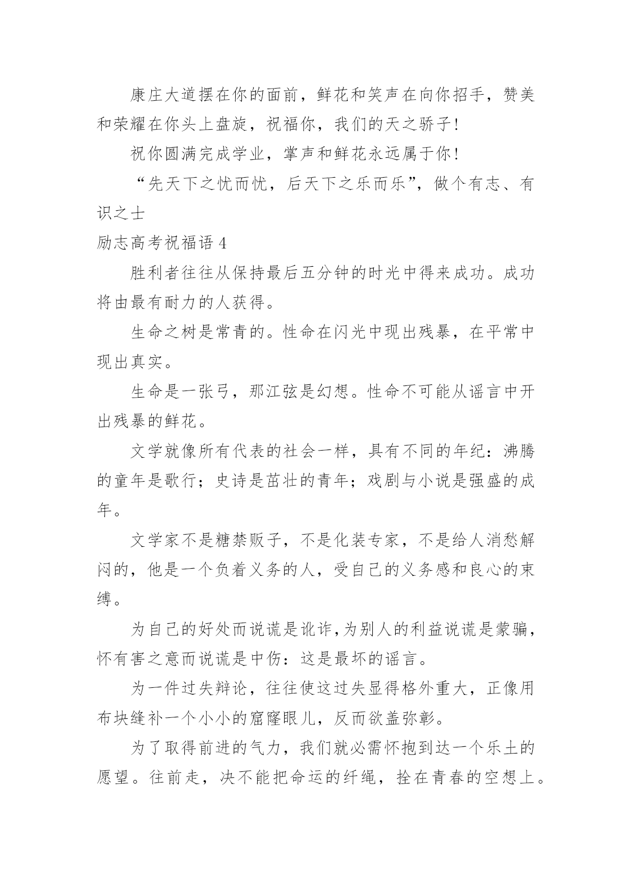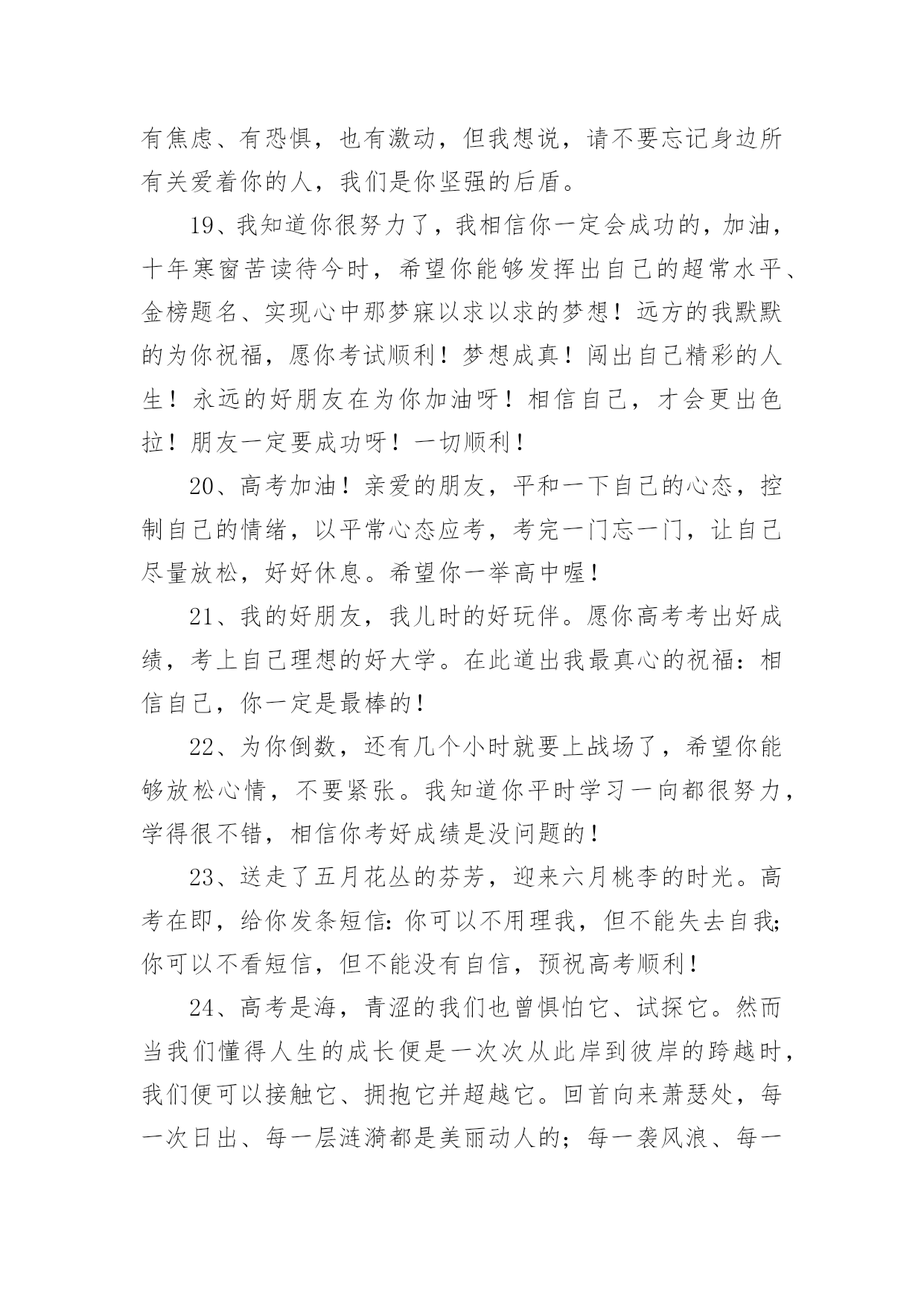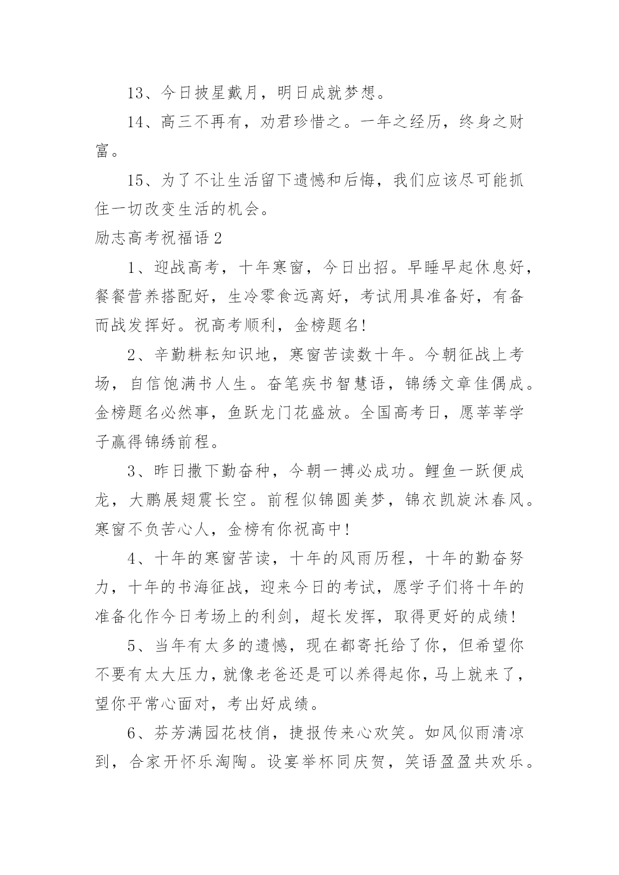 励志高考祝福语励志高考祝福语在日复一日的学习、工作或生活中,大家都经常接触到祝福语吧,祝福语有助于促进交流,拉近人与人之间的关系。写起祝福语来就毫无头绪?下面是小编精心整理的励志高考祝福语,仅供参考,欢迎大家阅读。励志高考祝福语11、心有多宽,舞台就有多大,心有多高,梦想就有多远。2、狠抓基础是成功的基础,持之以恒是胜利的保证。3、行动不一定带来快乐,而无行动则决无快乐。4、不苦不累,高三无味;不拼不搏,高三白活。5、生命之中最快乐的是拼搏,而非成功,生命之中最痛苦的是懒散,而非失败。6、今天多一份拼搏、明天多几份欢笑。7、一心向着自己的目标前进的人,整个世界都会给他让路。8、静下来,铸我实力;拼上去,亮我风采。9、成功决不喜欢会见懒汉,而是唤醒懒汉。10、人活着要呼吸。呼者,出一口气;吸者,争一口气。11、拼搏、拼搏、再拼搏;进取、进取、再进取。12、拼一载春秋,搏一生无悔。13、今日披星戴月,明日成就梦想。14、高三不再有,劝君珍惜之。一年之经历,终身之财富。15、为了不让生活留下遗憾和后悔,我们应该尽可能抓住一切改变生活的机会。励志高考祝福语21、迎战高考,十年寒窗,今日出招。早睡早起休息好,餐餐营养搭配好,生冷零食远离好,考试用具准备好,有备而战发挥好。祝高考顺利,金榜题名!2、辛勤耕耘知识地,寒窗苦读数十年。今朝征战上考场,自信饱满书人生。奋笔疾书智慧语,锦绣文章佳偶成。金榜题名必然事,鱼跃龙门花盛放。全国高考日,愿莘莘学子赢得锦绣前程。3、昨日撒下勤奋种,今朝一搏必成功。鲤鱼一跃便成龙,大鹏展翅震长空。前程似锦圆美梦,锦衣凯旋沐春风。寒窗不负苦心人,金榜有你祝高中!4、十年的寒窗苦读,十年的风雨历程,十年的勤奋努力,十年的书海征战,迎来今日的考试,愿学子们将十年的准备化作今日考场上的利剑,超长发挥,取得更好的成绩!5、当年有太多的遗憾,现在都寄托给了你,但希望你不要有太大压力,就像老爸还是可以养得起你,马上就来了,望你平常心面对,考出好成绩。6、芬芳满园花枝俏,捷报传来心欢笑。如风似雨清凉到,合家开怀乐淘陶。设宴举杯同庆贺,笑语盈盈共欢乐。志向高远入学府,大步迈向成功路。愿你前途无限光明。7、我早说嘛,你小子聪明绝顶,一定金榜题名,看看,成为大象的口中食了吧,sorry!是成为象牙塔一员了,那就闭观修炼吧,祝你学业有成!8、十年寒窗苦功练,十年春秋含心酸。十年梦想今实现,静心细阅挥笔杆。笔落凤飞速成章,轻松愉悦答卷完。胸有成竹上金榜,志愿清华最理想。祝你佳成绩。9、那天,住进县城最好的宾馆;那晚,聚在一起聊聊心事;那时,互相讨论最后一天的考试;那会儿,吃不好更睡不好。回忆那年高考,有太多期待,有忐忑不安,更有无限美好!10、花香满园沁心脾,六月捷报传喜气。一举成功跃龙门,亲友相贺笑纷纷。梦想实现虽靠勤,不忘教导谢师恩。报效祖国好志向,梦想持久放光芒。愿你人生的路越来越亮堂。11、轻轻地我来了,带来我深深地祝福;悄悄地我走了,带走你的紧张和包袱;我静静的等候,等候捷报飘飞的天空。祝愿高考的朋友们超常发挥题名而归。12、六月骄阳热似火,捷报好比开心果。飞到心头幸福多,合家快乐不言说。你欢我笑来庆贺,宴请宾朋共欢乐。筵间畅饮笑盈盈,盛赞金榜题姓名。志向高远攀__,明朝归来定成功。13、三年时光匆匆过,风雨兼程苦苦付,金榜题名辉辉到,辛劳即成空空梦,今日高考大大胜,来年腾飞啸啸龙。正常心态考场战,求学一定获成功!14、又是一年高考时,万千学子跃龙门;放松心情轻松考,沉着答卷创佳绩;金榜题名乐欢喜,家长老师喜融融;填报志愿莫大意,功成名就会有期!15、高考结束心落地,报考志愿心忐忑,有心名校去镀金,无奈分数不允许。莘莘学子有志气,天生我材必有用,行行都能出状元,条条大道通罗马。励志高考祝福语3弟弟考上大学了,哥哥很是高兴!哥哥祝福弟弟在大学里学业有成,当然爱情也能丰收。当你孤独时,风儿就是我的歌声,愿它能使你得到片刻的安慰;当你骄傲时,雨点就是我的警钟,愿它能使你获得永恒的谦逊。柳荫下握别百般惆怅――同窗数载少年情长,望征程千种思绪,愿友情化为奋进的力量!轻轻地我来了,匆匆地我又要走了。我带来了什么,我又带走了什么?我说不清,只听到远处传来几声鸟叫。我在一个火柴盒里过了四年!度过黑色七月,经过蓝色八月,迎来了金色九月,一个属于莘莘学子的幸运之月,祝你学习更上一层楼!不愿告别,却在告别,那稚气的年月;不愿告别,总在告别,那多梦的时节。明晨行别,但愿云彩、艳阳一直陪伴你走到远远的天涯;鲜花、绿草相随,为你铺展远远的前程。康庄大道摆在你的面前,鲜花和笑声在向你招手,赞美和荣耀在你头上盘旋,祝福你,我们的天之骄子!祝你圆满完成学业,掌声和鲜花永远属于你!“先天下之忧而忧,后天下之乐而乐”,做个有志、有识之士励志高考祝福语4胜利者