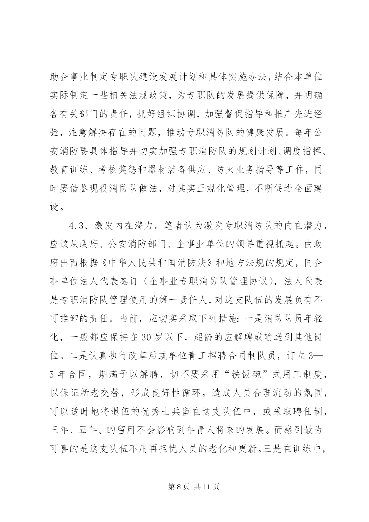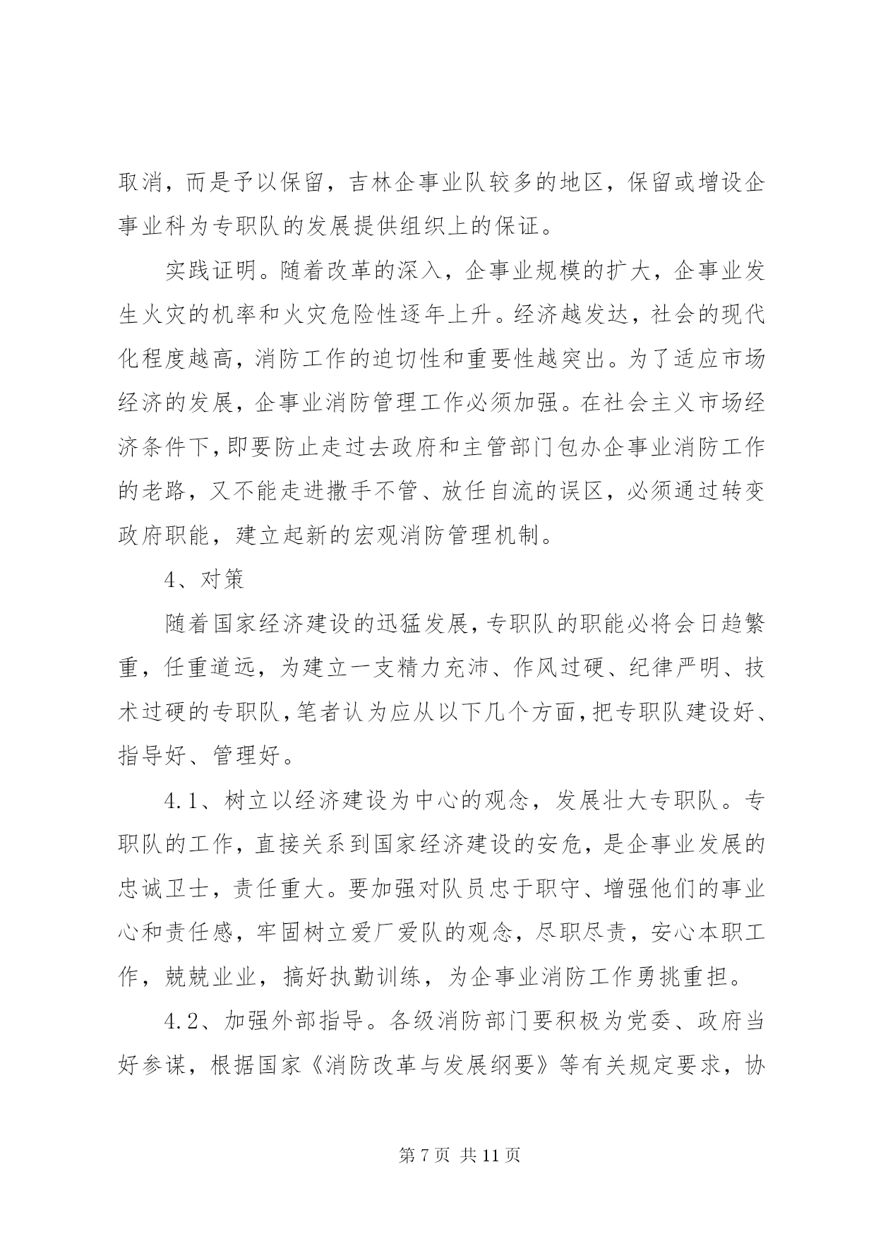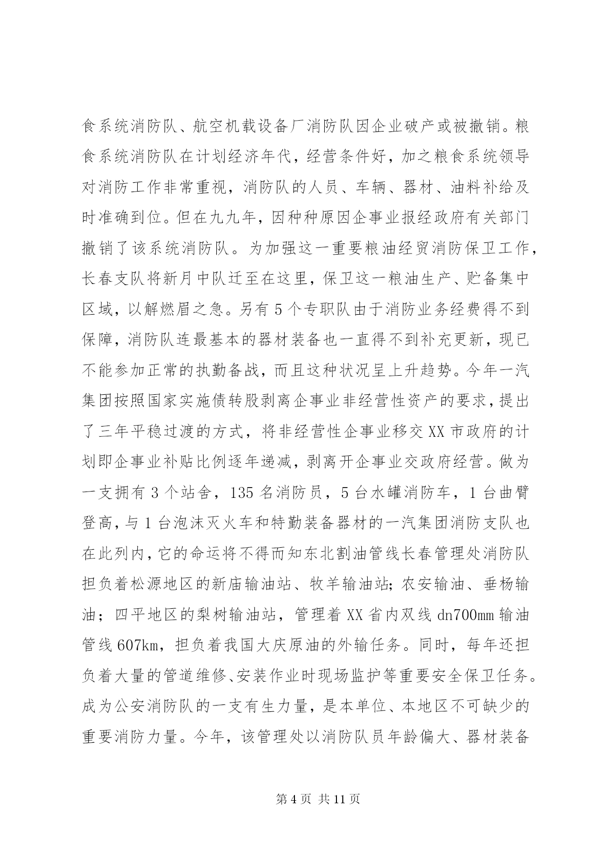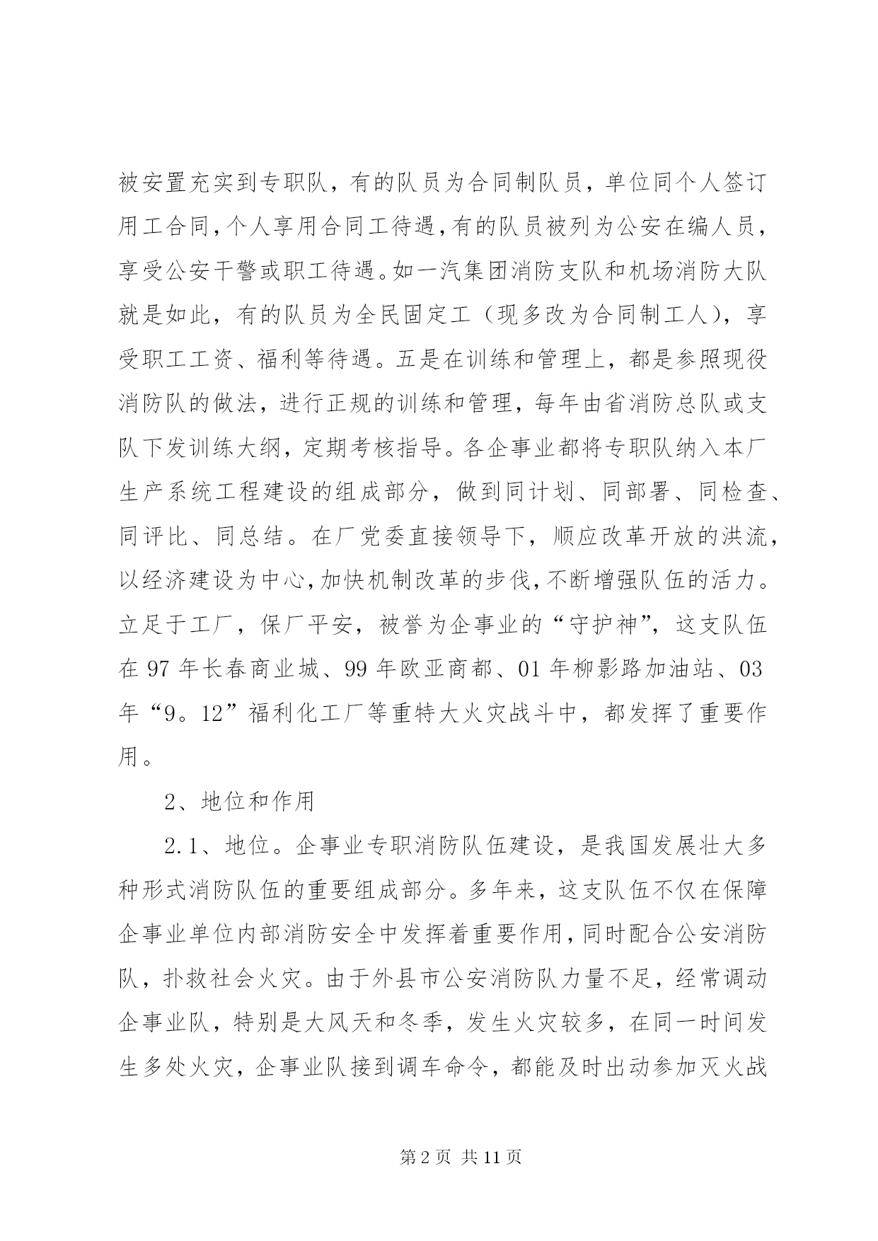 第PAGE\*Arabic\*MERGEFORMAT11页共NUMPAGES\*MERGEFORMAT11页专职消防队业务理论学习原文)加强企事业专职消防队管理工作的调查与思考企事业专职消防队伍作为一支扑救火灾的特殊力量,为保卫国家、集体人民生命财产安全,保障改革开放和经济建设作出了重要贡献。多年来,这支队伍不仅在保障企事业单位内部消防安全中发挥着重要作用,而且还担负着根据公安消防队的统一调度指挥,参加社会灭火救援的光荣任务,为保卫经济建设和社会稳定,做出了积极的贡献。笔者对长春地区的一些企事业专职消防队的现状及其发展,作出了些调查现综述如下:1、基本情况截止目前XX市现有企事业专职消防队19个(其中支队1个,大队1个),市区现有专企队9个,外县市10个;消防队员436名,各种消防执勤车辆48台。全市现有民办专职消防队目前已建队30个,现有队员294名;全市共有粮库157个,成立自愿型消防队132个。当前,长春地区专职队基本概况。一是在人员和消防车辆、器材装备上,多数队有15~25名队员,2~3台消防车和部分常用器材,二是在隶属关系上,隶属于企事业单位公安处(分局)管理,由其负责日常执勤训练和管理。如民航长春机场消防大队和一汽集团消防支队。三是经费来源渠道上,主要由企事业单位负责解决。四是在用工方式和生活待遇上,近年来一些退伍的战士被安置充实到专职队,有的队员为合同制队员,单位同个人签订用工合同,个人享用合同工待遇,有的队员被列为公安在编人员,享受公安干警或职工待遇。如一汽集团消防支队和机场消防大队就是如此,有的队员为全民固定工(现多改为合同制工人),享受职工工资、福利等待遇。五是在训练和管理上,都是参照现役消防队的做法,进行正规的训练和管理,每年由省消防总队或支队下发训练大纲,定期考核指导。各企事业都将专职队纳入本厂生产系统工程建设的组成部分,做到同计划、同部署、同检查、同评比、同总结。在厂党委直接领导下,顺应改革开放的洪流,以经济建设为中心,加快机制改革的步伐,不断增强队伍的活力。立足于工厂,保厂平安,被誉为企事业的“守护神”,这支队伍在97年长春商业城、99年欧亚商都、01年柳影路加油站、03年“9。12”福利化工厂等重特大火灾战斗中,都发挥了重要作用。2、地位和作用2.1、地位。企事业专职消防队伍建设,是我国发展壮大多种形式消防队伍的重要组成部分。多年来,这支队伍不仅在保障企事业单位内部消防安全中发挥着重要作用,同时配合公安消防队,扑救社会火灾。由于外县市公安消防队力量不足,经常调动企事业队,特别是大风天和冬季,发生火灾较多,在同一时间发生多处火灾,企事业队接到调车命令,都能及时出动参加灭火战斗,特别是扑救重、特大火灾和处置特殊灾害事故是必不可少的力量。2000年农安万顺粮库、2001年6月农安开安镇胶合板厂、2001年XX市柳影路武警某部加油站、2003年福利化工厂等灭火救援行动中,各专职队积极参加灭火战斗,有利地支援了火场施救工作;为迅速消灭火灾,减少火灾损失做出了重要贡献。2.2、作用。省物资储备局二三八处消防队,地处XX市与XX县区之间,米沙镇附近,多年来三乡一镇发生的火灾都由二三八处消防队接警处置。每年扑救火灾都在近百起以上,为保卫三乡一镇的人民生命财产安全做出贡献。XX县区加快多种形式消防队伍建设,全县23个乡镇普遍成立了民办消防队,还为所有粮库都配制自制拖车,起到了控制初期火灾的能力,实践证明无论是对单位还是对社会火灾扑救工作都普遍发挥了应有了作用。3、存在主要问题3.1、滞后于形势发展需要。为了减轻财政负担,合理调配人力资源,适应经济发展的需要,实现对有限资源配置的优化,一些单位和部门在维护即得利益和长远利益过程中,其认识和行为发生了偏差,急功近利,对创造良好的消防安全环境创造良好的经济环境的重要内容认识不足,专职消防队面临改制、重组,人员编制的频减、年龄结构的老化、装备的陈旧。致使专职队的建设遭到了弱化。据调查,我市原有专职队24个,但近年来,先后有XX市第一毛纺厂消防队、XX县区淀粉厂消防队、XX市粮食系统消防队、航空机载设备厂消防队因企业破产或被撤销。粮食系统消防队在计划经济年代,经营条件好,加之粮食系统领导对消防工作非常重视,消防队的人员、车辆、器材、油料补给及时准确到位。但在九九年,因种种原因企事业报经政府有关部门撤销了该系统消防队。为加强这一重要粮油经贸消防保卫工作,长春支队将新月中队迁至在这里,保卫这一粮油生产、贮备集中区域,以解燃眉之急。另有5个专职队由于消防业务经费得不到保障,消防队连最基本的器材装备也一直得不到补充更新,现已不能参加正常的执勤备战,而且这种状况呈上升趋势。今年一汽集团按照国家实施债转股剥离企事业非经营性资产的要求,提出了三年平稳过渡的方式,将