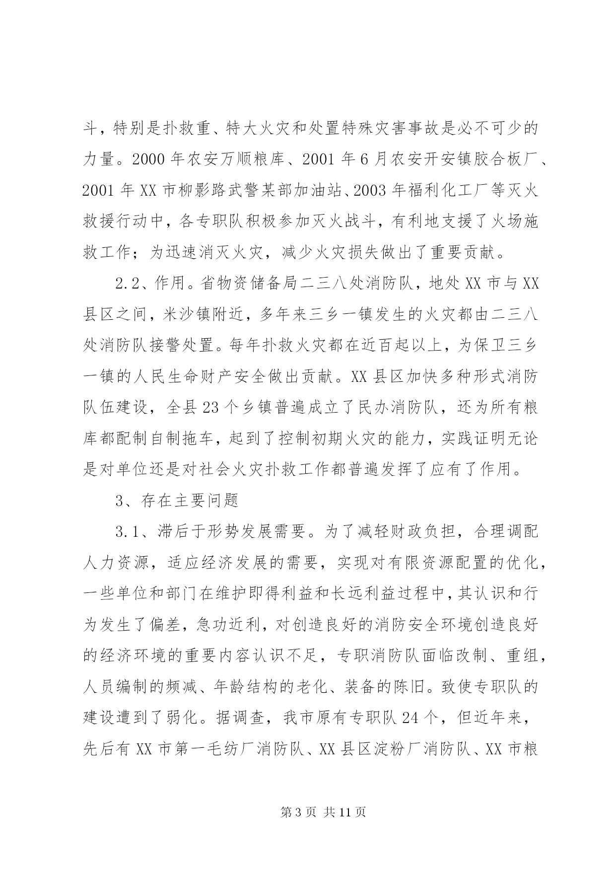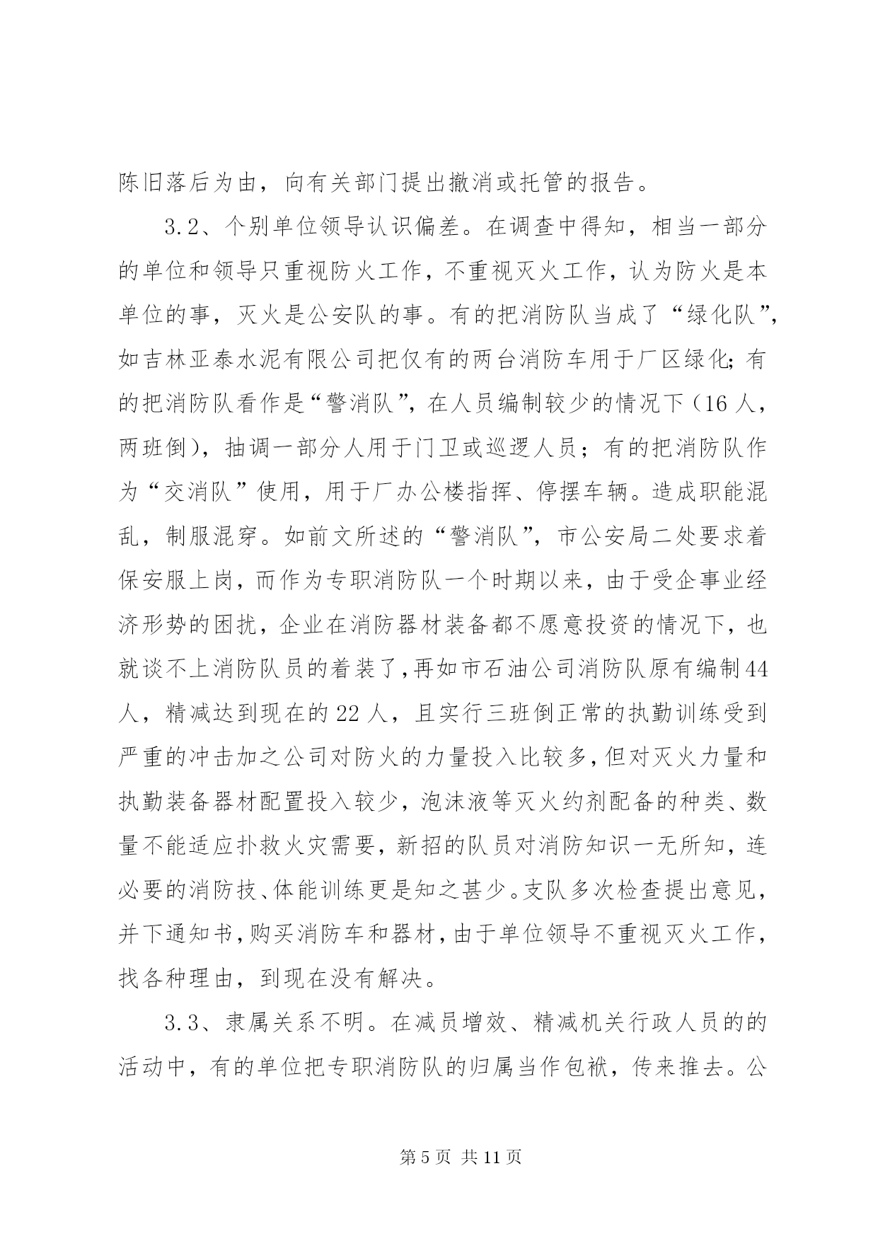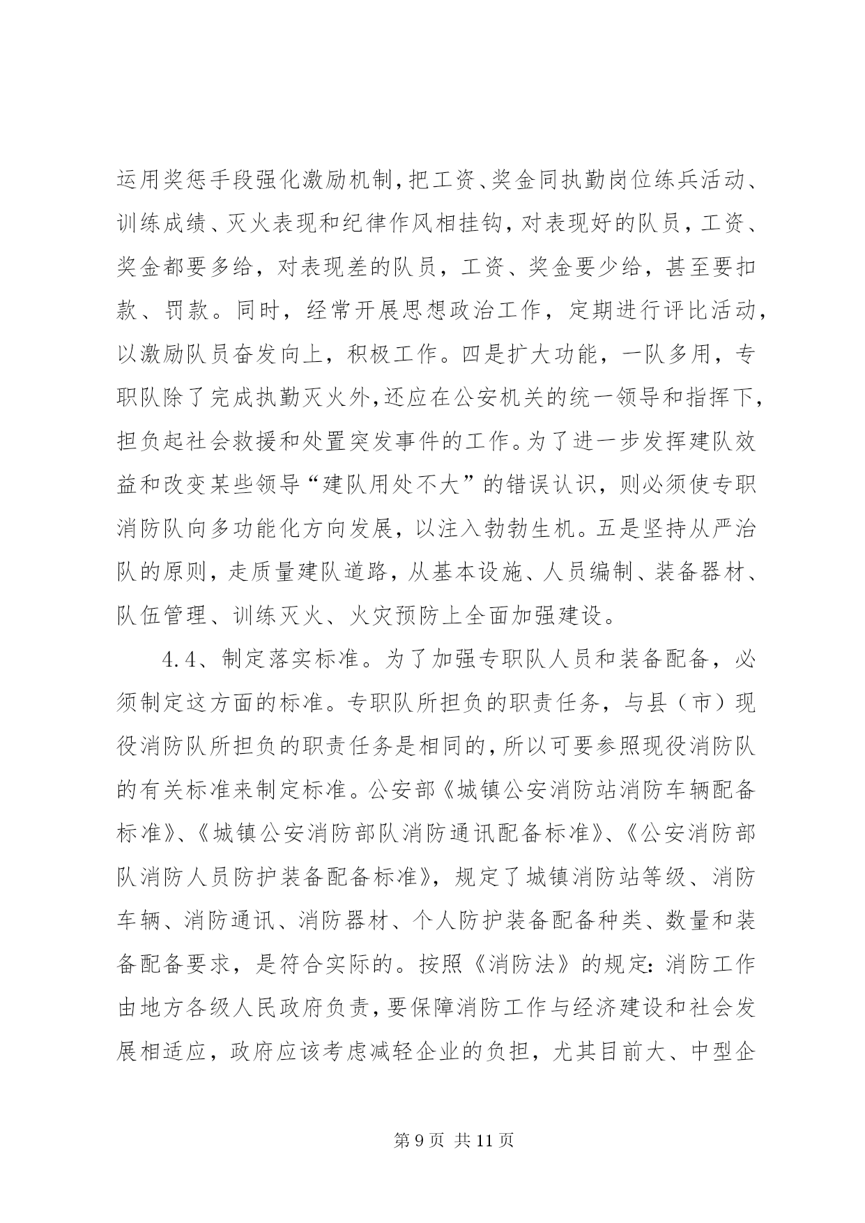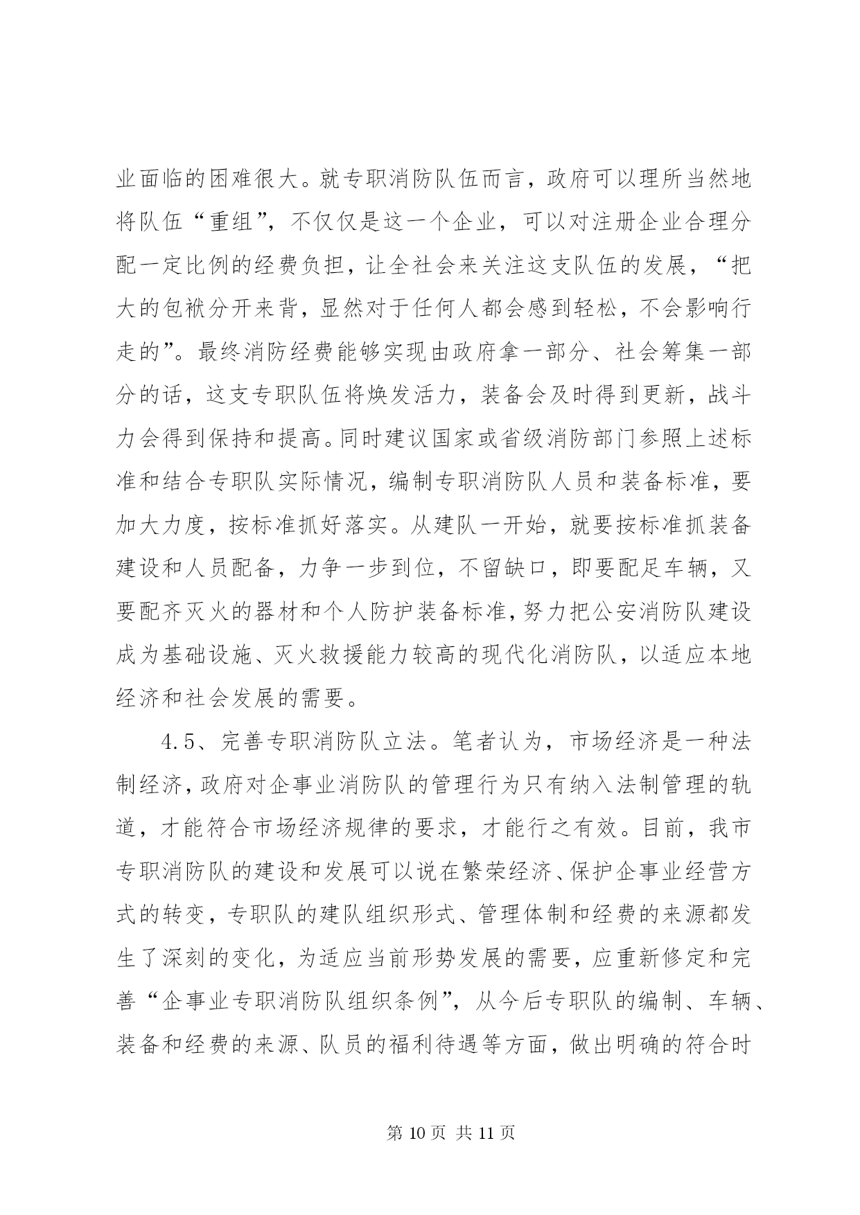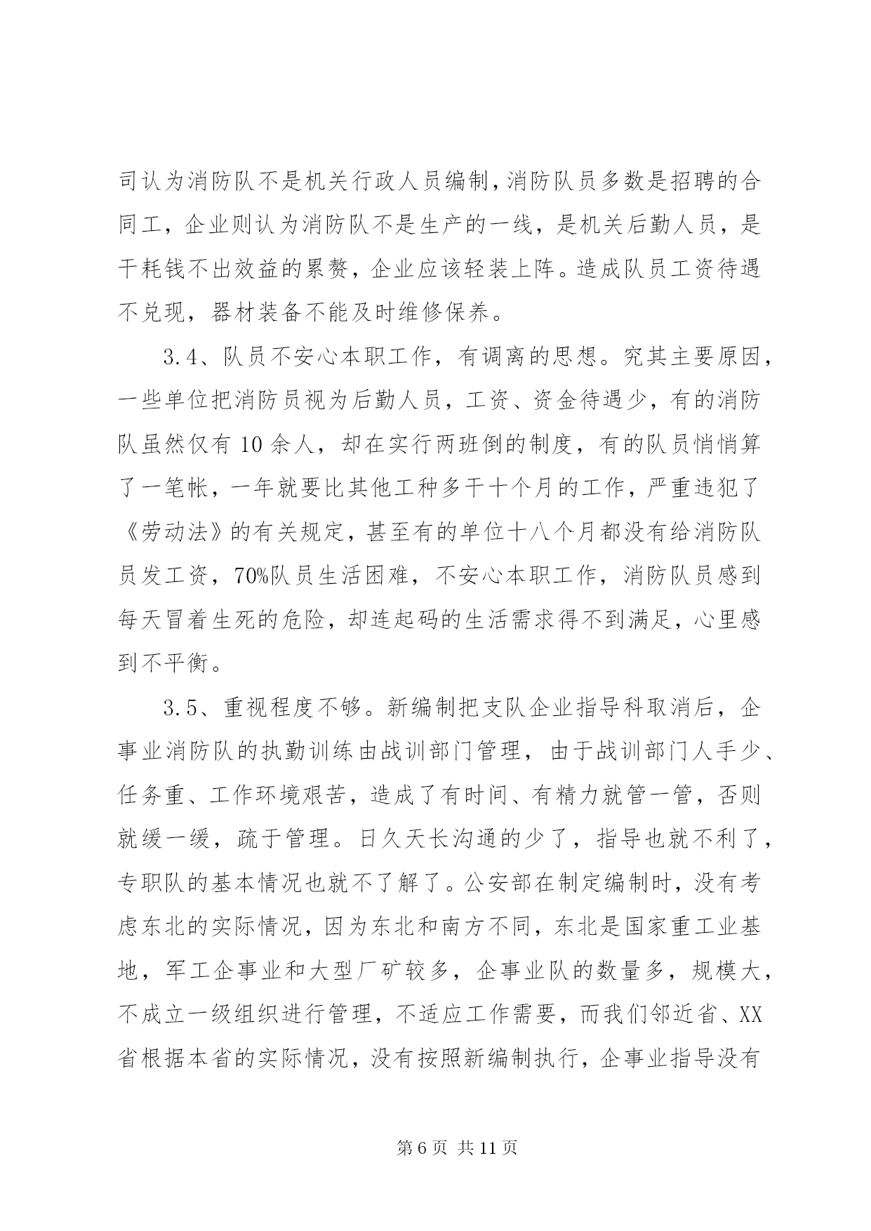 第PAGE\*Arabic\*MERGEFORMAT11页共NUMPAGES\*MERGEFORMAT11页专职消防队业务理论学习原文)加强企事业专职消防队管理工作的调查与思考企事业专职消防队伍作为一支扑救火灾的特殊力量,为保卫国家、集体人民生命财产安全,保障改革开放和经济建设作出了重要贡献。多年来,这支队伍不仅在保障企事业单位内部消防安全中发挥着重要作用,而且还担负着根据公安消防队的统一调度指挥,参加社会灭火救援的光荣任务,为保卫经济建设和社会稳定,做出了积极的贡献。笔者对长春地区的一些企事业专职消防队的现状及其发展,作出了些调查现综述如下:1、基本情况截止目前XX市现有企事业专职消防队19个(其中支队1个,大队1个),市区现有专企队9个,外县市10个;消防队员436名,各种消防执勤车辆48台。全市现有民办专职消防队目前已建队30个,现有队员294名;全市共有粮库157个,成立自愿型消防队132个。当前,长春地区专职队基本概况。一是在人员和消防车辆、器材装备上,多数队有15~25名队员,2~3台消防车和部分常用器材,二是在隶属关系上,隶属于企事业单位公安处(分局)管理,由其负责日常执勤训练和管理。如民航长春机场消防大队和一汽集团消防支队。三是经费来源渠道上,主要由企事业单位负责解决。四是在用工方式和生活待遇上,近年来一些退伍的战士被安置充实到专职队,有的队员为合同制队员,单位同个人签订用工合同,个人享用合同工待遇,有的队员被列为公安在编人员,享受公安干警或职工待遇。如一汽集团消防支队和机场消防大队就是如此,有的队员为全民固定工(现多改为合同制工人),享受职工工资、福利等待遇。五是在训练和管理上,都是参照现役消防队的做法,进行正规的训练和管理,每年由省消防总队或支队下发训练大纲,定期考核指导。各企事业都将专职队纳入本厂生产系统工程建设的组成部分,做到同计划、同部署、同检查、同评比、同总结。在厂党委直接领导下,顺应改革开放的洪流,以经济建设为中心,加快机制改革的步伐,不断增强队伍的活力。立足于工厂,保厂平安,被誉为企事业的“守护神”,这支队伍在97年长春商业城、99年欧亚商都、01年柳影路加油站、03年“9。12”福利化工厂等重特大火灾战斗中,都发挥了重要作用。2、地位和作用2.1、地位。企事业专职消防队伍建设,是我国发展壮大多种形式消防队伍的重要组成部分。多年来,这支队伍不仅在保障企事业单位内部消防安全中发挥着重要作用,同时配合公安消防队,扑救社会火灾。由于外县市公安消防队力量不足,经常调动企事业队,特别是大风天和冬季,发生火灾较多,在同一时间发生多处火灾,企事业队接到调车命令,都能及时出动参加灭火战斗,特别是扑救重、特大火灾和处置特殊灾害事故是必不可少的力量。2000年农安万顺粮库、2001年6月农安开安镇胶合板厂、2001年XX市柳影路武警某部加油站、2003年福利化工厂等灭火救援行动中,各专职队积极参加灭火战斗,有利地支援了火场施救工作;为迅速消灭火灾,减少火灾损失做出了重要贡献。2.2、作用。省物资储备局二三八处消防队,地处XX市与XX县区之间,米沙镇附近,多年来三乡一镇发生的火灾都由二三八处消防队接警处置。每年扑救火灾都在近百起以上,为保卫三乡一镇的人民生命财产安全做出贡献。XX县区加快多种形式消防队伍建设,全县23个乡镇普遍成立了民办消防队,还为所有粮库都配制自制拖车,起到了控制初期火灾的能力,实践证明无论是对单位还是对社会火灾扑救工作都普遍发挥了应有了作用。3、存在主要问题3.1、滞后于形势发展需要。为了减轻财政负担,合理调配人力资源,适应经济发展的需要,实现对有限资源配置的优化,一些单位和部门在维护即得利益和长远利益过程中,其认识和行为发生了偏差,急功近利,对创造良好的消防安全环境创造良好的经济环境的重要内容认识不足,专职消防队面临改制、重组,人员编制的频减、年龄结构的老化、装备的陈旧。致使专职队的建设遭到了弱化。据调查,我市原有专职队24个,但近年来,先后有XX市第一毛纺厂消防队、XX县区淀粉厂消防队、XX市粮食系统消防队、航空机载设备厂消防队因企业破产或被撤销。粮食系统消防队在计划经济年代,经营条件好,加之粮食系统领导对消防工作非常重视,消防队的人员、车辆、器材、油料补给及时准确到位。但在九九年,因种种原因企事业报经政府有关部门撤销了该系统消防队。为加强这一重要粮油经贸消防保卫工作,长春支队将新月中队迁至在这里,保卫这一粮油生产、贮备集中区域,以解燃眉之急。另有5个专职队由于消防业务经费得不到保障,消防队连最基本的器材装备也一直得不到补充更新,现已不能参加正常的执勤备战,而且这种状况呈上升趋势。今年一汽集团按照国家实施债转股剥离企事业非经营性资产的要求,提出了三年平稳过渡的方式,将