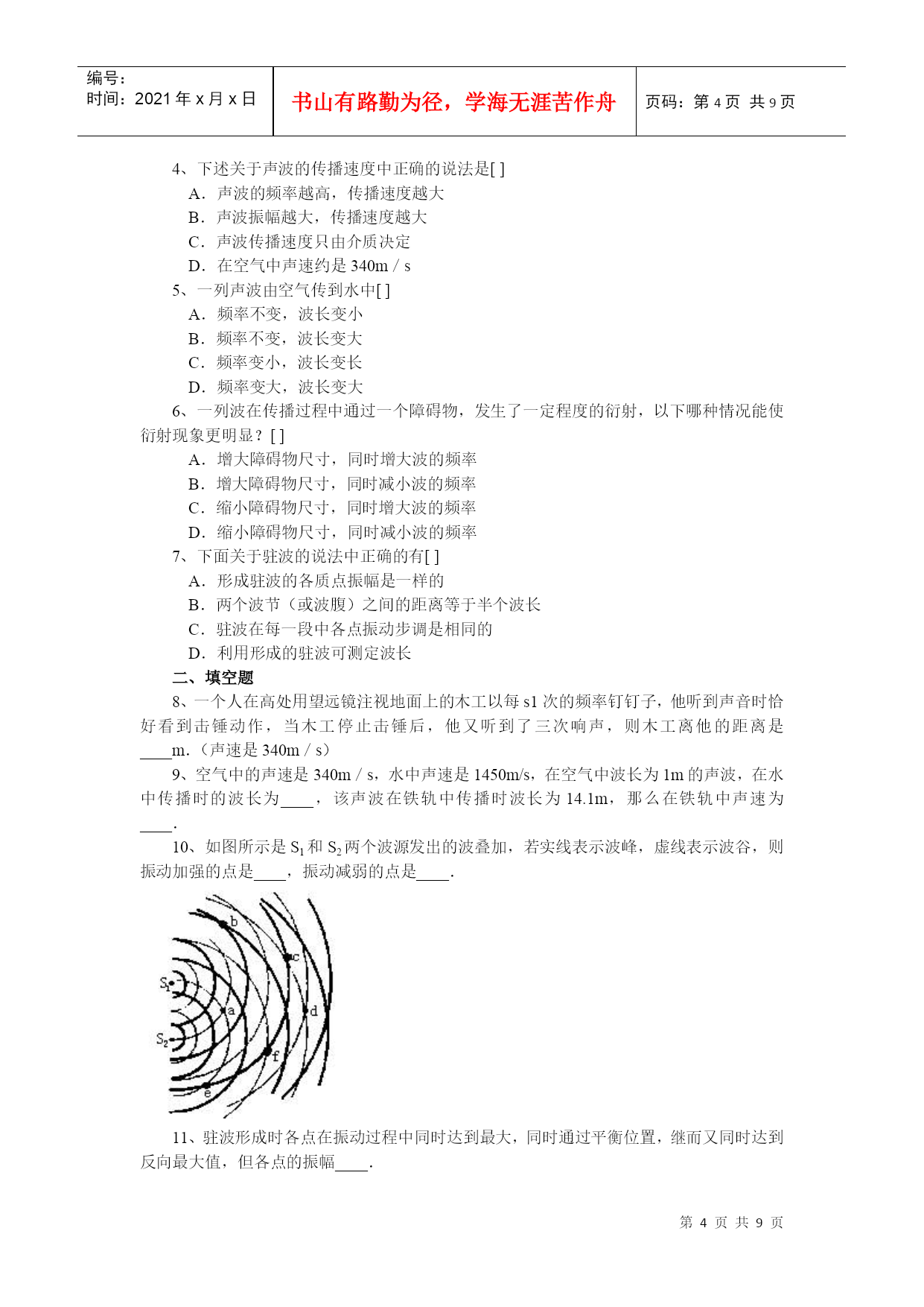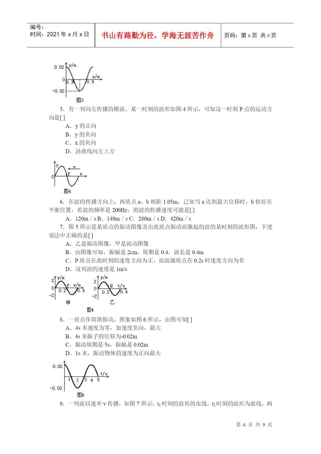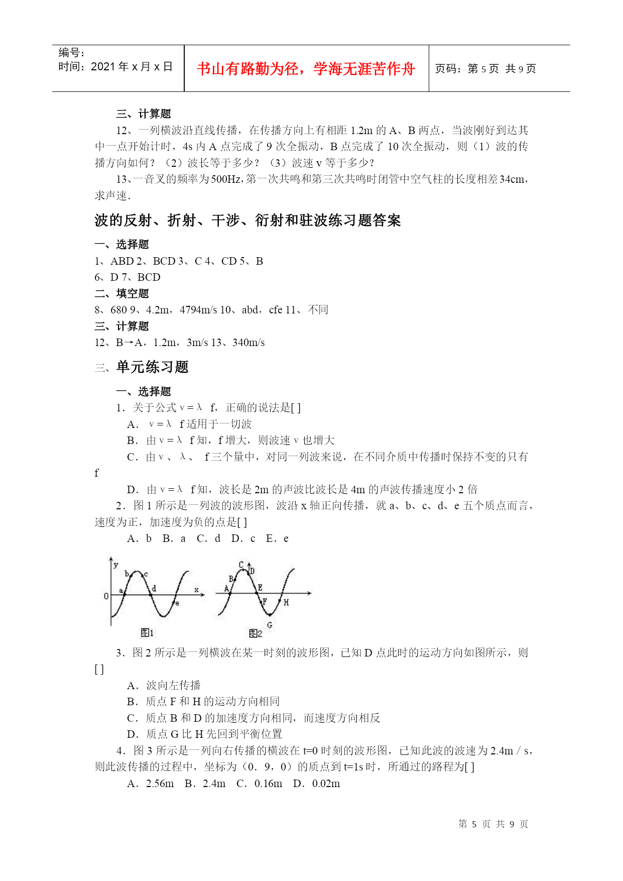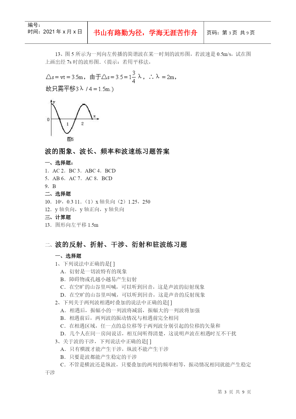 编号:时间:2021年x月x日书山有路勤为径,学海无涯苦作舟页码:第PAGE9页共NUMPAGES9页第PAGE\*MERGEFORMAT9页共NUMPAGES\*MERGEFORMAT9页相关习题:(机械波)一、波的图象、波长、频率和波速练习题一、选择题1、关于一列简谐波,下面说法中正确的是[]A.波动的产生需要两个条件,即波源和传播波的介质B.波动过程是质点由近向远传递的过程C.波动过程是能量传递的过程D.波动过程中质点本身随波迁移2.下列关于机械波的说法中正确的是[]A.有机械振动就有机械波B.有机械波就一定有机械振动C.机械波是机械振动在介质中的传播过程,它是传递能量的一种方式D.没有机械波就没有机械振动3.在机械波中[]A.各质点都在各自的平衡位置附近振动B.相邻质点间必有相互作用力C.前一质点的振动带动相邻的后一质点的振动,后一质点的振动必定落后于前一质点D.各质点也随波的传播而迁移4.一列波由波源向周围扩展开去,由此可知[]A.介质中各质点由近及远地传播开去B.介质中的振动形式由近及远传播开去C.介质点振动的能量由近及远传播开去D.介质点只是振动而没有迁移5.关于波的频率,下列说法中正确的是[]A.波的频率由波源决定,与介质无关B.波的频率与波速无关C.波由一种介质传到另一种介质时,频率变大D.以上说法均不正确6.关于波速,下列说法中正确的是[]A.反映了振动在介质中传播的快慢B.反映了介质中质点振动的快慢C.波速由介质决定与波源无关D.反映了介质中质点迁移的快慢7.关于波长的下列说法中正确的是[]A.在一个周期内振动在介质中传播的距离等于波长B.在一个周期内介质的质点所走过的路程等于波长C.波长等于在波的传播方向上两相邻的对平衡位置的位移始终相同的质点间距离8.如果图1所示是一列简谐波在某一时刻的波形,则[]A.C点的振幅是0B.BC两点平衡位置间距是λ/4C.该时刻速度最大的点是A、C、ED.当A振动了一周期时间内,波由A点传到E点9、图2所示是一列横波在某一时刻的波形图,波沿x轴正向传播,波速是18m/s,A.波长是6cm,频率是1/3HzB.波长是8m,频率是9/4HzC.波长是10cm,频率是1.8HzD.波长是8cm,频率是4/9Hz二、填空题10、有一振源可产生周期是10-3的波,并能在介质中以300m/s的速度传播,这列波的频率是______Hz,波长是____m.11、图3为一列横波在某一时刻的波形图,若此时质点Q的速度方向沿y轴负方向,则(1)波的传播方向是____;(2)若P开始振动时,N已振动了0.02s,则该波的频率为____Hz,波速是____cm/s.12、图4所示是一列沿x轴负方向传播的波在某一时刻的波形图,此时,A点的速度方向是____,B点速度方向是____,C点的加速度方向是____,并画出此列波经T/2的波形.三、计算题13、图5所示为一列向左传播的简谐波在某一时刻的波形图,若波速是0.5m/s,试在图上画出经7s时的波形图.(提示:若用平移法,波的图象、波长、频率和波速练习题答案一、选择题:1.AC2.BC3.ABC4.BCD5.AB6.AC7.AC8.BCD9.B二、选择题10.103,0.311.(1)x轴负向(2)1.25,25012.y轴负向,y轴正向,y轴负向三、计算题13.图形向左平移1.5m二、波的反射、折射、干涉、衍射和驻波练习题一、选择题1、下列说法中正确的是[]A.衍射是一切波特有的现象B.障碍物或孔越小越易产生衍射C.在空旷的山谷里叫喊,可以听到回音,这是声波的衍射现象D.在空旷的山谷里叫喊,可以听到回音,这是声音的反射现象2、下列关于两列波相遇时叠加的说法中正确的是[]A.相遇后,振幅小的一列波将减弱,振幅大的一列波将加强B.相遇前后,两列波的振动情况与相遇前完全相同C.在相遇区域,任一点的总位移等于两列波分别引起的位移的矢量和D.几个人在同一房间说话,相互间听得清楚,这说明声波在相遇时互不干扰3、关于波的干涉,下列说法中正确的是[]A.只有横渡才能产生干涉,纵波不能产生干涉B.只要是波都能产生稳定的干涉C.不管是横波还是纵波,只要叠加的两列的频率相等,振动情况相同就能产生稳定干涉4、下述关于声波的传播速度中正确的说法是[]A.声波的频率越高,传播速度越大B.声波振幅越大,传播速度越大C.声波传播速度只由介质决定D.在空气中声速约是340m/s5、一列声波由空气传到水中[]A.频率不变,波长变小B.频率不变,波长变大C.频率变小