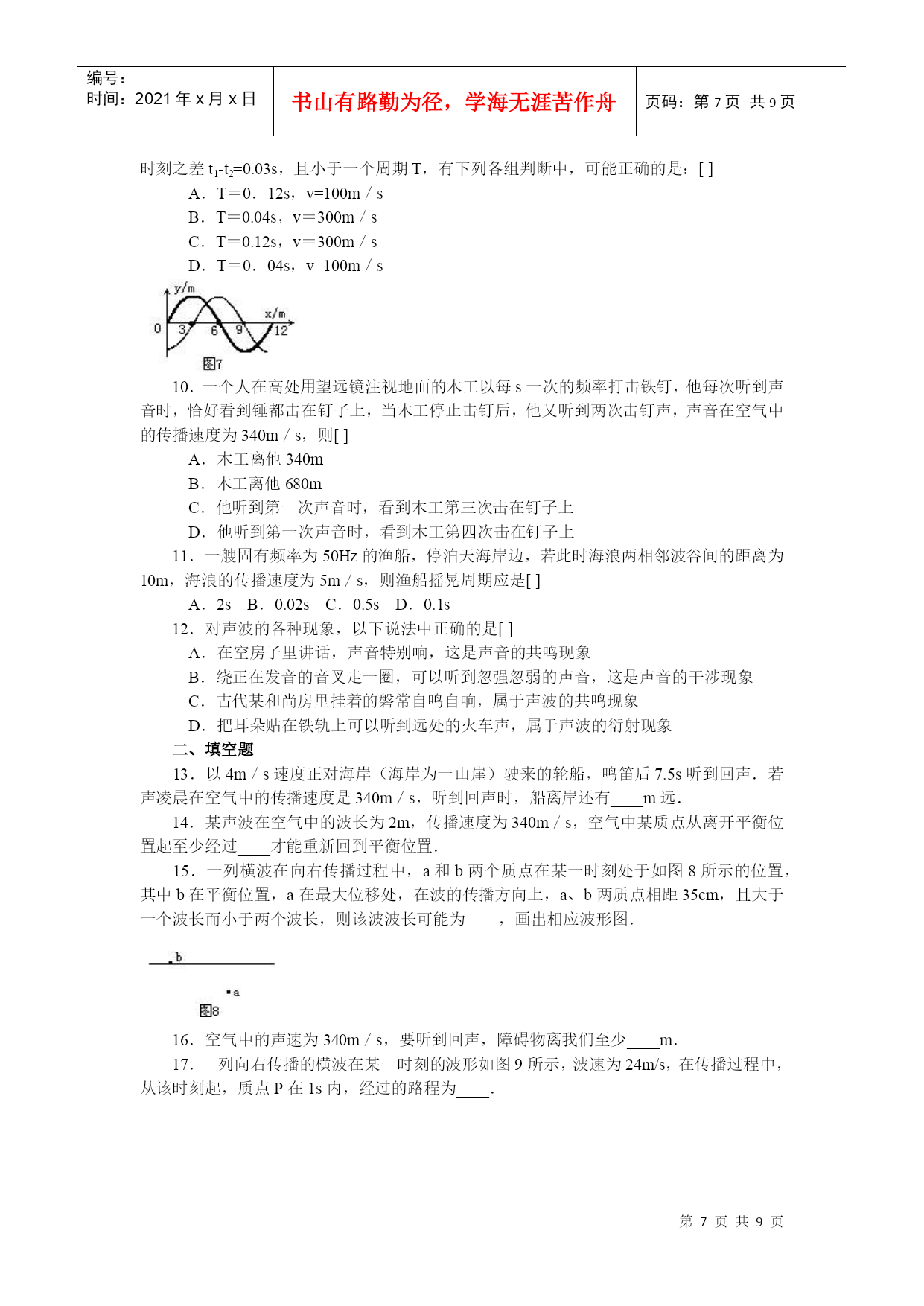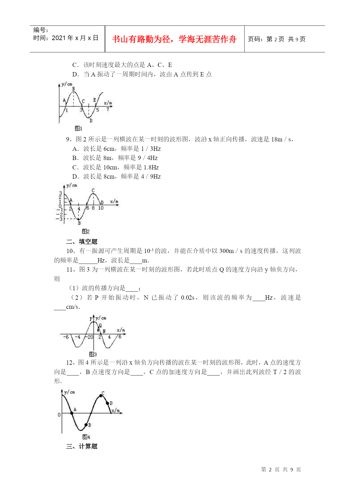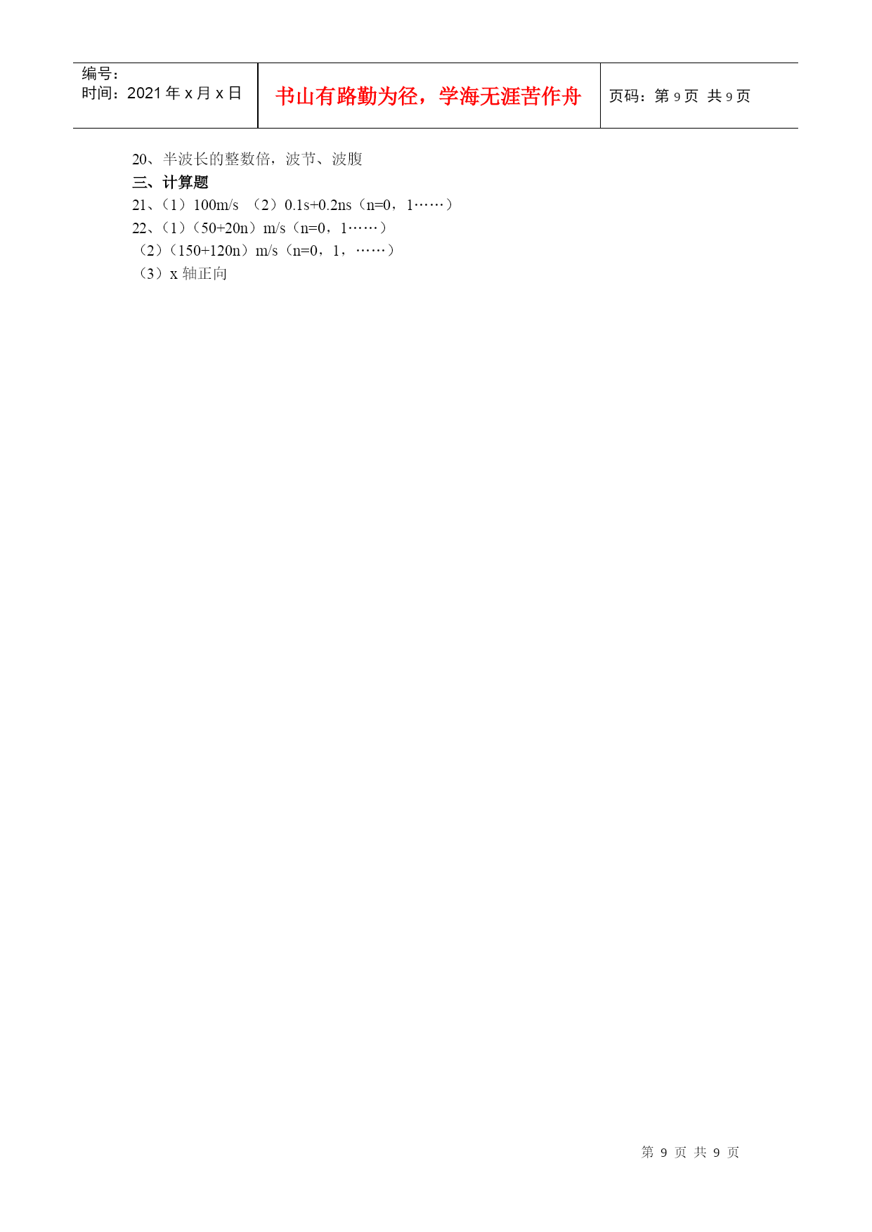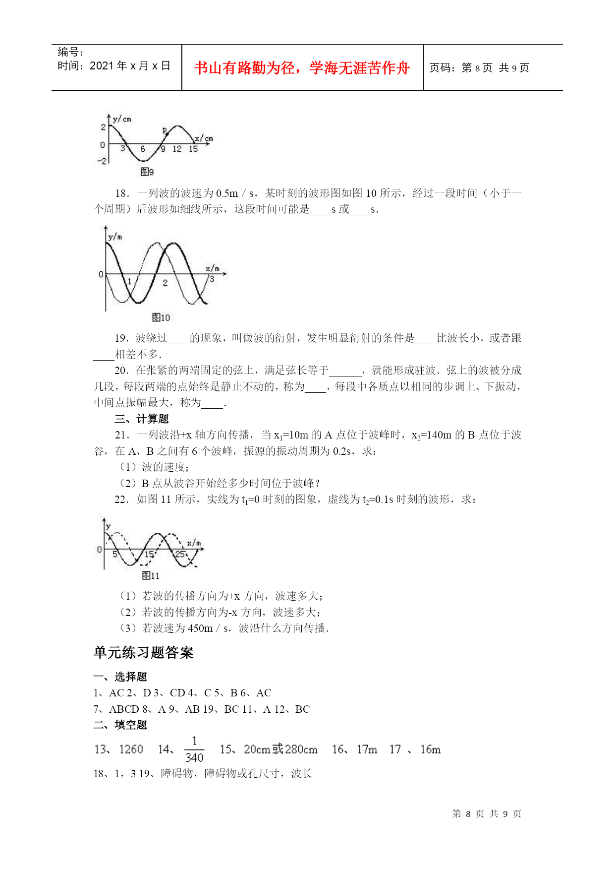 编号:时间:2021年x月x日书山有路勤为径,学海无涯苦作舟页码:第PAGE9页共NUMPAGES9页第PAGE\*MERGEFORMAT9页共NUMPAGES\*MERGEFORMAT9页相关习题:(机械波)一、波的图象、波长、频率和波速练习题一、选择题1、关于一列简谐波,下面说法中正确的是[]A.波动的产生需要两个条件,即波源和传播波的介质B.波动过程是质点由近向远传递的过程C.波动过程是能量传递的过程D.波动过程中质点本身随波迁移2.下列关于机械波的说法中正确的是[]A.有机械振动就有机械波B.有机械波就一定有机械振动C.机械波是机械振动在介质中的传播过程,它是传递能量的一种方式D.没有机械波就没有机械振动3.在机械波中[]A.各质点都在各自的平衡位置附近振动B.相邻质点间必有相互作用力C.前一质点的振动带动相邻的后一质点的振动,后一质点的振动必定落后于前一质点D.各质点也随波的传播而迁移4.一列波由波源向周围扩展开去,由此可知[]A.介质中各质点由近及远地传播开去B.介质中的振动形式由近及远传播开去C.介质点振动的能量由近及远传播开去D.介质点只是振动而没有迁移5.关于波的频率,下列说法中正确的是[]A.波的频率由波源决定,与介质无关B.波的频率与波速无关C.波由一种介质传到另一种介质时,频率变大D.以上说法均不正确6.关于波速,下列说法中正确的是[]A.反映了振动在介质中传播的快慢B.反映了介质中质点振动的快慢C.波速由介质决定与波源无关D.反映了介质中质点迁移的快慢7.关于波长的下列说法中正确的是[]A.在一个周期内振动在介质中传播的距离等于波长B.在一个周期内介质的质点所走过的路程等于波长C.波长等于在波的传播方向上两相邻的对平衡位置的位移始终相同的质点间距离8.如果图1所示是一列简谐波在某一时刻的波形,则[]A.C点的振幅是0B.BC两点平衡位置间距是λ/4C.该时刻速度最大的点是A、C、ED.当A振动了一周期时间内,波由A点传到E点9、图2所示是一列横波在某一时刻的波形图,波沿x轴正向传播,波速是18m/s,A.波长是6cm,频率是1/3HzB.波长是8m,频率是9/4HzC.波长是10cm,频率是1.8HzD.波长是8cm,频率是4/9Hz二、填空题10、有一振源可产生周期是10-3的波,并能在介质中以300m/s的速度传播,这列波的频率是______Hz,波长是____m.11、图3为一列横波在某一时刻的波形图,若此时质点Q的速度方向沿y轴负方向,则(1)波的传播方向是____;(2)若P开始振动时,N已振动了0.02s,则该波的频率为____Hz,波速是____cm/s.12、图4所示是一列沿x轴负方向传播的波在某一时刻的波形图,此时,A点的速度方向是____,B点速度方向是____,C点的加速度方向是____,并画出此列波经T/2的波形.三、计算题13、图5所示为一列向左传播的简谐波在某一时刻的波形图,若波速是0.5m/s,试在图上画出经7s时的波形图.(提示:若用平移法,波的图象、波长、频率和波速练习题答案一、选择题:1.AC2.BC3.ABC4.BCD5.AB6.AC7.AC8.BCD9.B二、选择题10.103,0.311.(1)x轴负向(2)1.25,25012.y轴负向,y轴正向,y轴负向三、计算题13.图形向左平移1.5m二、波的反射、折射、干涉、衍射和驻波练习题一、选择题1、下列说法中正确的是[]A.衍射是一切波特有的现象B.障碍物或孔越小越易产生衍射C.在空旷的山谷里叫喊,可以听到回音,这是声波的衍射现象D.在空旷的山谷里叫喊,可以听到回音,这是声音的反射现象2、下列关于两列波相遇时叠加的说法中正确的是[]A.相遇后,振幅小的一列波将减弱,振幅大的一列波将加强B.相遇前后,两列波的振动情况与相遇前完全相同C.在相遇区域,任一点的总位移等于两列波分别引起的位移的矢量和D.几个人在同一房间说话,相互间听得清楚,这说明声波在相遇时互不干扰3、关于波的干涉,下列说法中正确的是[]A.只有横渡才能产生干涉,纵波不能产生干涉B.只要是波都能产生稳定的干涉C.不管是横波还是纵波,只要叠加的两列的频率相等,振动情况相同就能产生稳定干涉4、下述关于声波的传播速度中正确的说法是[]A.声波的频率越高,传播速度越大B.声波振幅越大,传播速度越大C.声波传播速度只由介质决定D.在空气中声速约是340m/s5、一列声波由空气传到水中[]A.频率不变,波长变小B.频率不变,波长变大C.频率变小