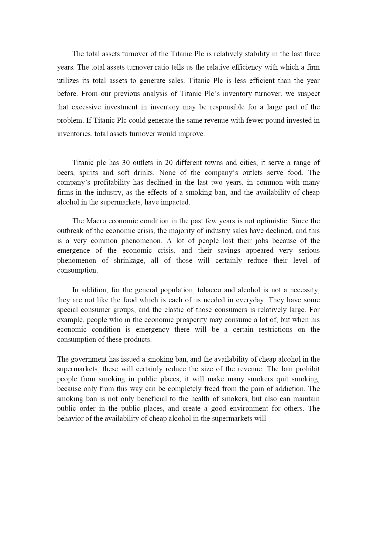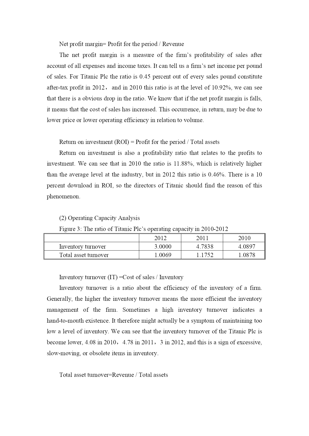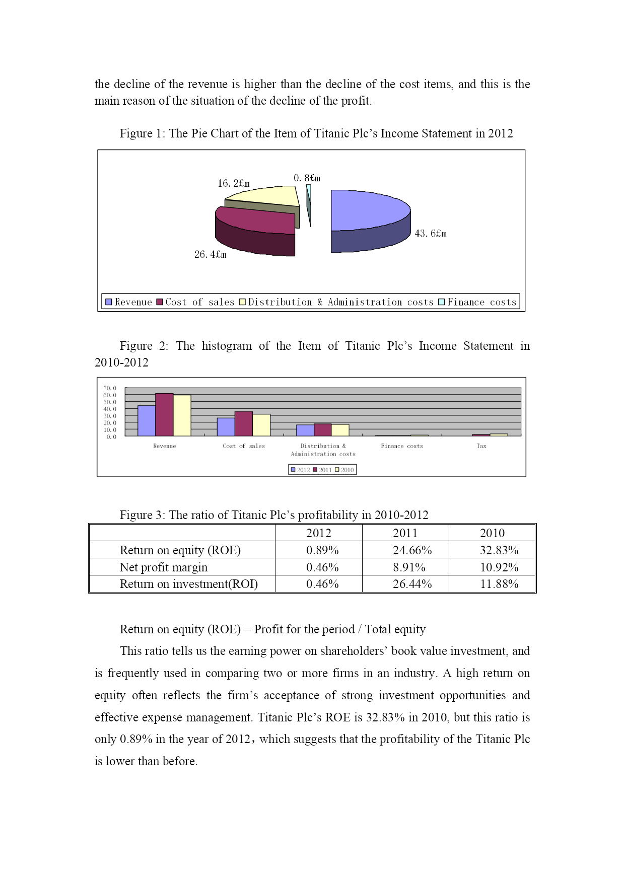 Q1Financialanalysiscanprovideexactinformationoftheenterprise'sfinancialpositionandoperatingresultstotheinformationusers,andalsoprovideinformationaboutthefuture.Theinformationusersareincludingthebusinessmanagers,owners,creditors,governmentagencies,etc.Managerscandeterminethemanagementstateofacompany,carryoutvariousbusinessdecisionsthroughtheenterprisefinancialanalysis.Thesummaryfinancialstatementsarethecomprehensivereportofthecompany'sfinancialsituation,operatingperformanceanddevelopmenttrend.Wecangetathoroughunderstandingaboutthepastandthefutureoftheoperatingconditionsofthebusiness.Wecanalsogetdifferentinformationinaccordancewiththedifferentanalysis.Thenwecanusetheseinformationinavarietyofdecision-making,themanagementofthecompanytakeadvantageoftheresultsoftheseanalyzesforavarietyofoperatingdecisions.ThefollowingImakeananalysisabouttheTitanicPlc,includingtheprofitability,capitaloperationabilityanddevelopmentcapacity.Intheprocessofanalysis,Itakethemacroeconomicenvironmentandgovernmentpoliciesintoconsideration.ImakeadetailanalysisabouttheproblemsoftheTitanicPlcbusiness.ThepurposeistosolvetheTitanicPlcbusinessgofrombadtoworsestate,toacertainextent,improvethecompany'soperatingefficiency,andpointoutthedirectionoffuturedevelopmentofthecompany.InthefollowinganalysistheDuPontfinancialanalysissystemwillbeused.Titanicplc,apubliclyquotedcompany,operatesachainofbarsandpublichousesthroughouttheMidlandsandNorthernEngland.Ithas30outletsin20differenttownsandcities,whichservearangeofbeers,spiritsandsoftdrinks.Noneofthecompany’soutletsservefood.(1)ProfitabilityAnalysisProfitabilityofthebusinessreferstotheabilityofenterprisestomakeprofit,thepurposeoftheprofitabilityanalysisisdifferentcompanybydifferentpeople.Enterprisemanagersuseprofitabilityindicatorstoevaluatethecompany‘sperformance,andfoundtheproblemthatexistsinmanagement.In2012,TitanicPlcachievedthebusinessincomeis43.6£m.Therehasbeena30percentdeclinecomparedwiththeyearof2011,thedownwardtrendisveryobvious.Thecompan