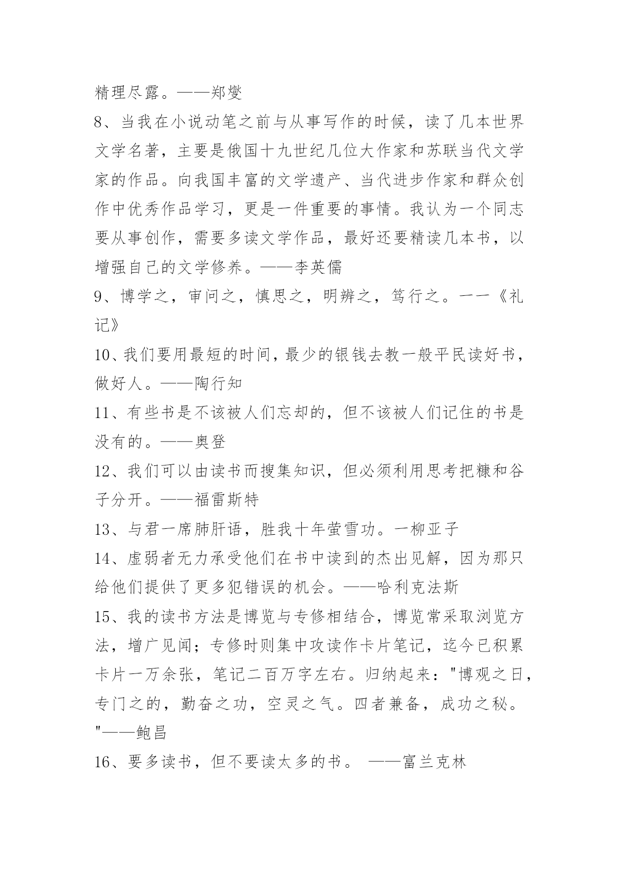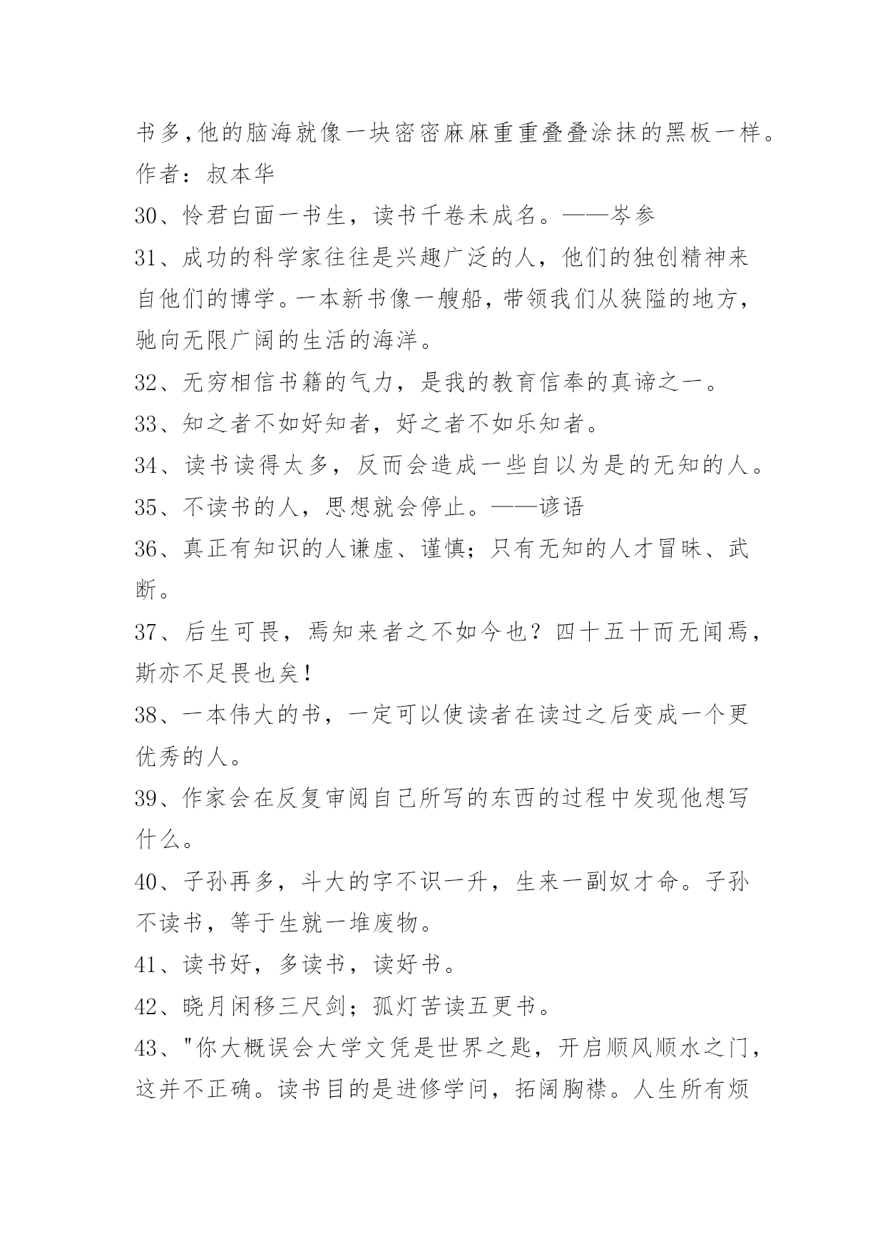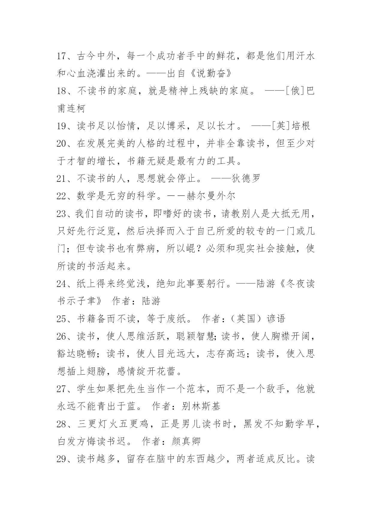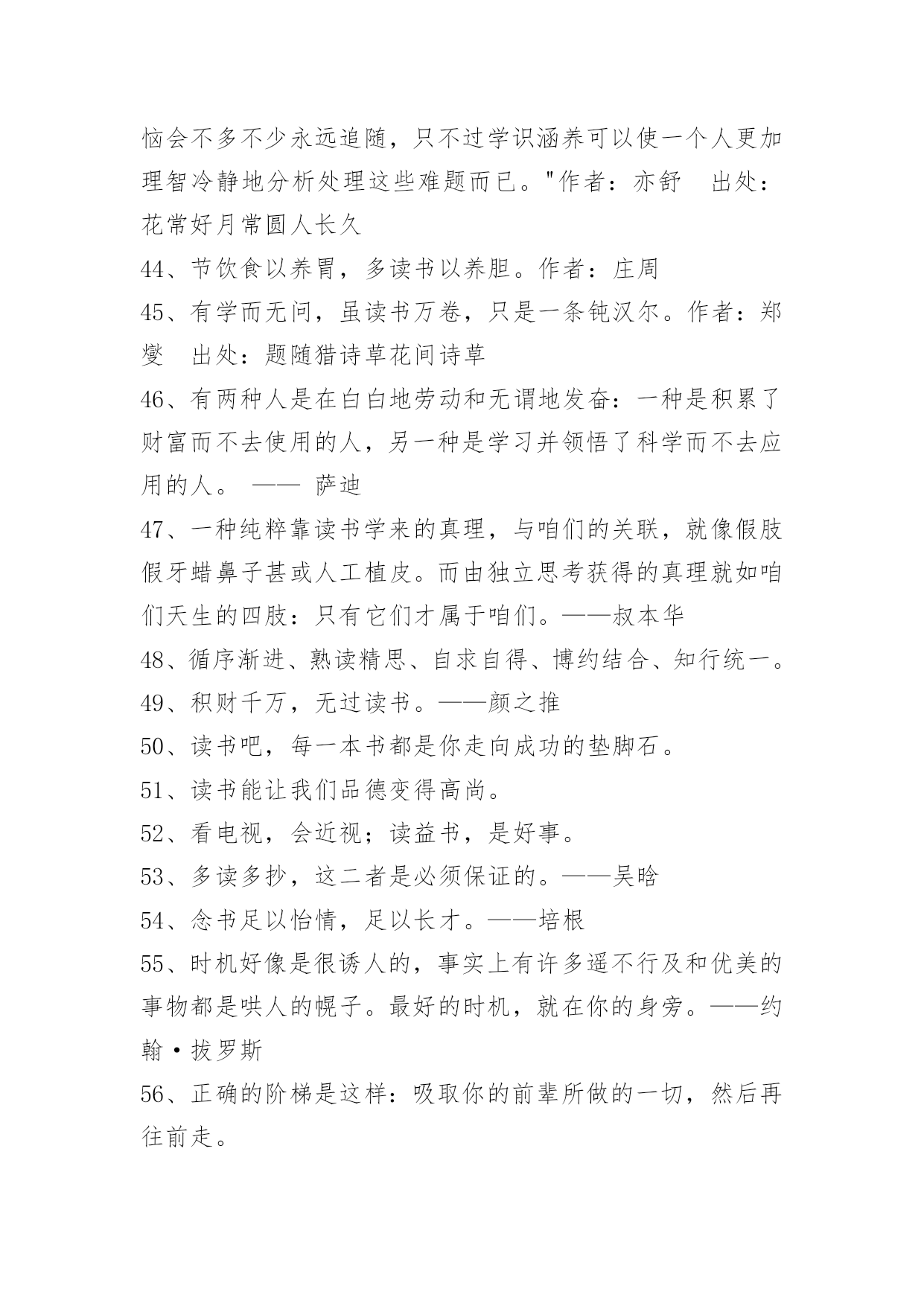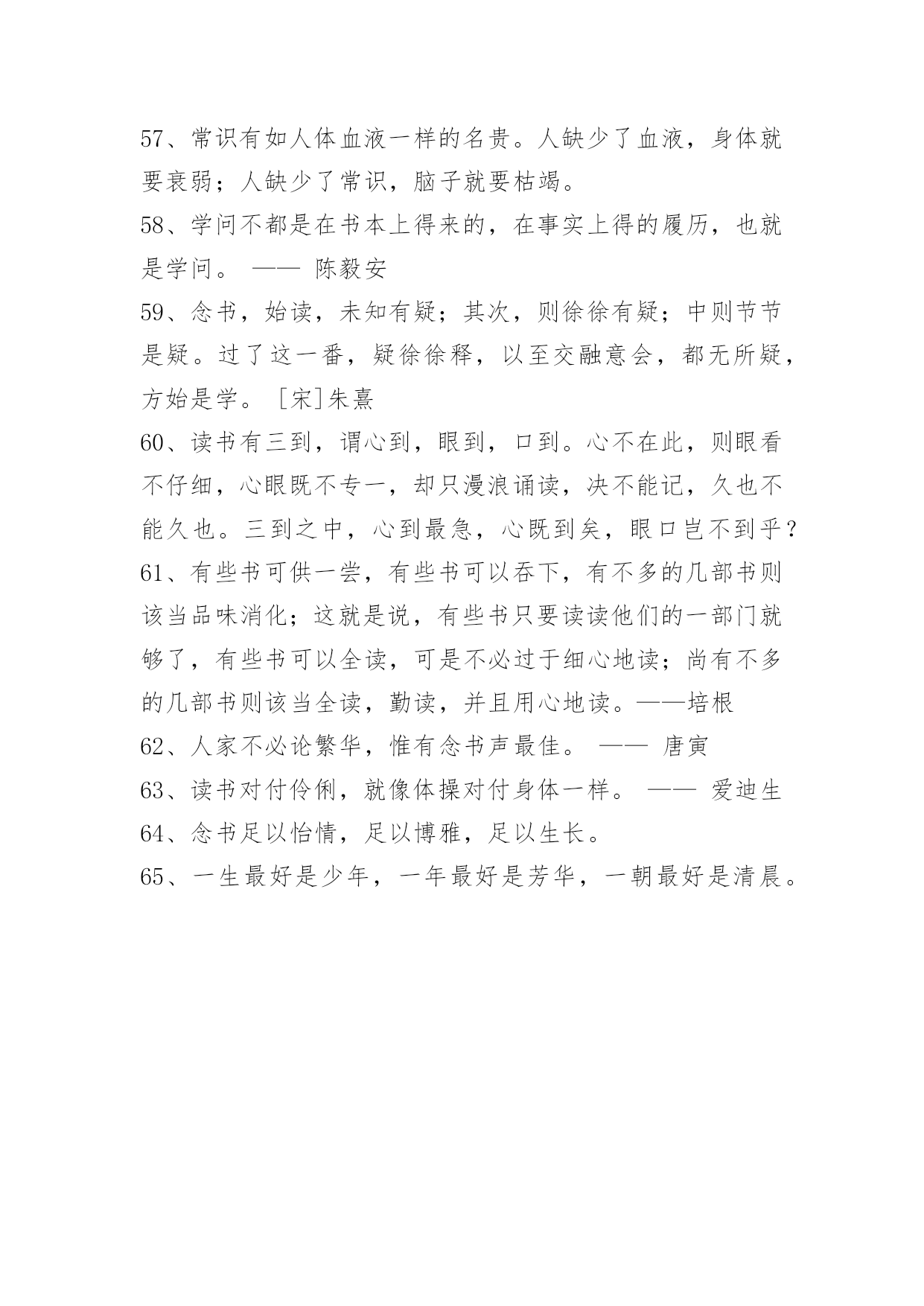读书的名言警句65条2024年有关读书的名言警句集锦65条就让我们在——读书中,感受一会书趣吧!下面是小编整理的读书的名言警句65条,一起来看一下吧。1、君子以仁存心,以礼存心。仁者爱人,有礼者敬人。爱人者人恒爱之,敬人者人恒敬之。2、读书造成充实的人,会议造成未能觉悟的人,写作造成正确的人。——培根3、读书贵在细心领悟,实践贵在大胆创新。4、学者要收拾精神并归一路;如修德而留意于事功名誉,必无实诣;读书而寄兴于吟咏风雅,定不深心。善读书者,要读到手舞足蹈处,方不落筌蹄;善观物者,要观到心融神洽时,方不泥迹象。——洪应明5、我读书越多,书籍就使我和世界越接近,生活对我变得越加光明和有意义。6、培养读书习惯,训练思考能力,掌握严谨的分析技术,熟悉社会准则的框框,打下哲学基础,这些都是未来的领导人从学习活动一开始,而且一辈子都必须继续不断地致力去做的事情。——理查德·尼克松7、学问二者,须要折开看。学是学,问是问。今人有学而无问,读书万卷,只是一条钝汉尔……读书好问,一问不得,不妨再三问,问一人不得,不妨问数十人。要使疑窦释然,精理尽露。——郑燮8、当我在小说动笔之前与从事写作的时候,读了几本世界文学名著,主要是俄国十九世纪几位大作家和苏联当代文学家的作品。向我国丰富的文学遗产、当代进步作家和群众创作中优秀作品学习,更是一件重要的事情。我认为一个同志要从事创作,需要多读文学作品,最好还要精读几本书,以增强自己的文学修养。——李英儒9、博学之,审问之,慎思之,明辨之,笃行之。一一《礼记》10、我们要用最短的时间,最少的银钱去教一般平民读好书,做好人。——陶行知11、有些书是不该被人们忘却的,但不该被人们记住的书是没有的。——奥登12、我们可以由读书而搜集知识,但必须利用思考把糠和谷子分开。——福雷斯特13、与君一席肺肝语,胜我十年萤雪功。一柳亚子14、虚弱者无力承受他们在书中读到的杰出见解,因为那只给他们提供了更多犯错误的机会。——哈利克法斯15、我的读书方法是博览与专修相结合,博览常采取浏览方法,增广见闻;专修时则集中攻读作卡片笔记,迄今已积累卡片一万余张,笔记二百万字左右。归纳起来:"博观之日,专门之的,勤奋之功,空灵之气。四者兼备,成功之秘。"——鲍昌16、要多读书,但不要读太多的书。——富兰克林17、古今中外,每一个成功者手中的鲜花,都是他们用汗水和心血浇灌出来的。——出自《说勤奋》18、不读书的家庭,就是精神上残缺的家庭。——[俄]巴甫连柯19、读书足以怡情,足以博采,足以长才。——[英]培根20、在发展完美的人格的过程中,并非全靠读书,但至少对于才智的增长,书籍无疑是最有力的工具。21、不读书的人,思想就会停止。——狄德罗22、数学是无穷的科学。――赫尔曼外尔23、我们自动的读书,即嗜好的读书,请教别人是大抵无用,只好先行泛览,然后决择而入于自己所爱的较专的一门或几门;但专读书也有弊病,所以崐?必须和现实社会接触,使所读的书活起来。24、纸上得来终觉浅,绝知此事要躬行。——陆游《冬夜读书示子聿》作者:陆游25、书籍备而不读,等于废纸。作者:(英国)谚语26、读书,使人思维活跃,聪颖智慧;读书,使人胸襟开阔,豁达晓畅;读书,使人目光远大,志存高远;读书,使入思想插上翅膀,感情绽开花蕾。27、学生如果把先生当作一个范本,而不是一个敌手,他就永远不能青出于蓝。作者:别林斯基28、三更灯火五更鸡,正是男儿读书时,黑发不知勤学早,白发方悔读书迟。作者:颜真卿29、读书越多,留存在脑中的东西越少,两者适成反比。读书多,他的脑海就像一块密密麻麻重重叠叠涂抹的黑板一样。作者:叔本华30、怜君白面一书生,读书千卷未成名。——岑参31、成功的科学家往往是兴趣广泛的人,他们的独创精神来自他们的博学。一本新书像一艘船,带领我们从狭隘的地方,驰向无限广阔的生活的海洋。32、无穷相信书籍的气力,是我的教育信奉的真谛之一。33、知之者不如好知者,好之者不如乐知者。34、读书读得太多,反而会造成一些自以为是的无知的人。35、不读书的人,思想就会停止。——谚语36、真正有知识的人谦虚、谨慎;只有无知的人才冒昧、武断。37、后生可畏,焉知来者之不如今也?四十五十而无闻焉,斯亦不足畏也矣!38、一本伟大的书,一定可以使读者在读过之后变成一个更优秀的人。39、作家会在反复审阅自己所写的东西的过程中发现他想写什么。40、子孙再多,斗大的字不识一升,生来一副奴才命。子孙不读书,等于生就一堆废物。41、读书好,多读书,读好书。42、晓月闲移三尺剑;孤灯苦读五更书。43、"你大概误会大学文凭是世界之匙,开启顺风顺水之门,这并不正确。读书目的是进修学问,拓阔胸襟。人生所有烦恼会不多不少永远追随,只不过学识涵养可以使一个人更加理智冷静地分析处理这些难题而已。"作者:亦