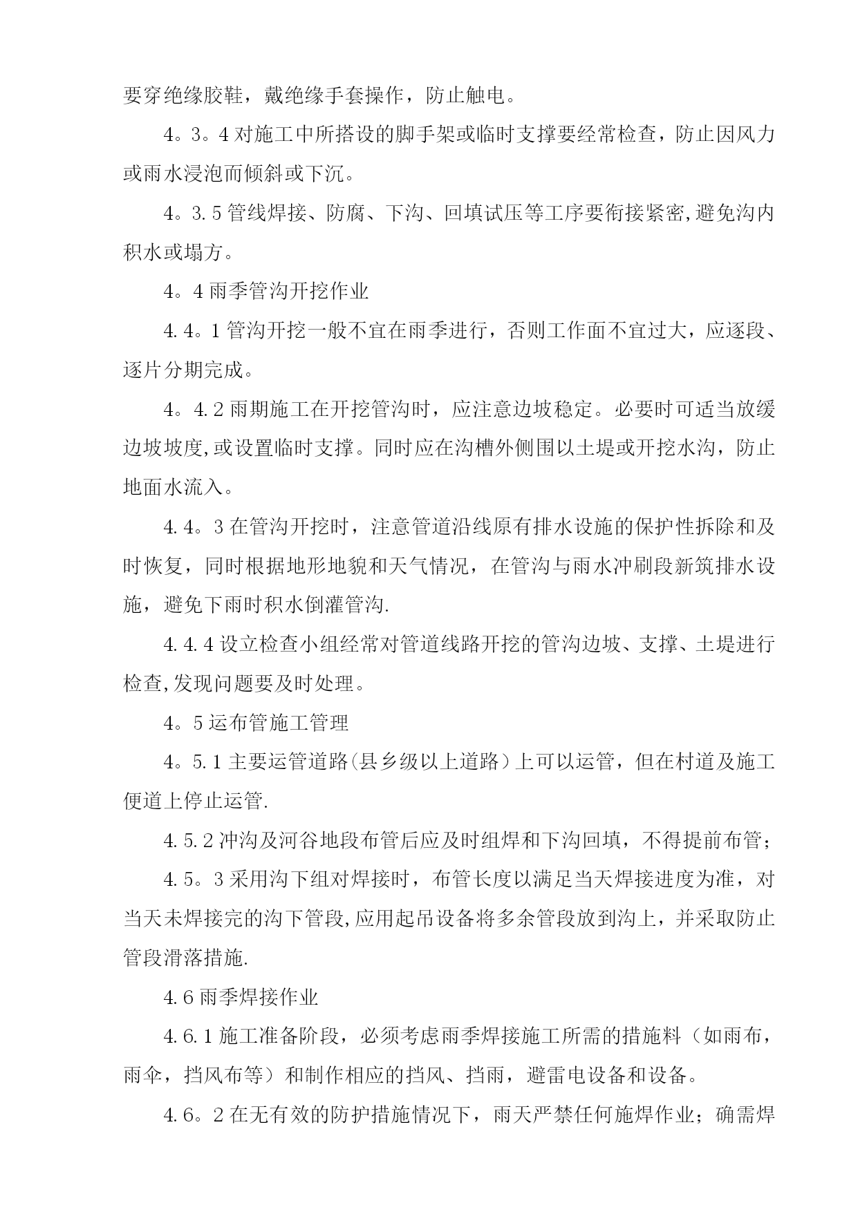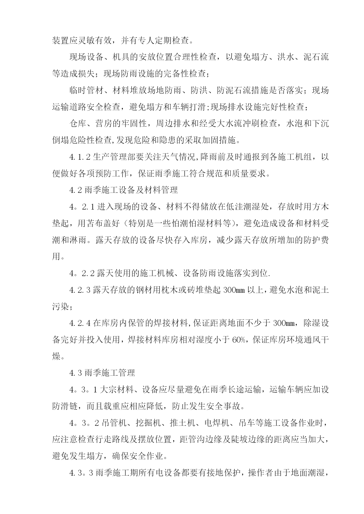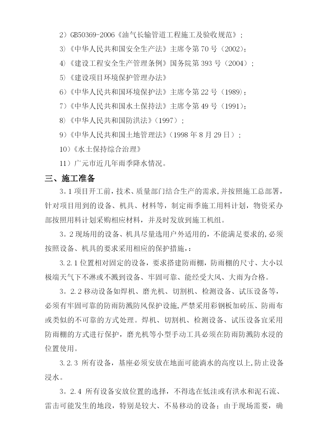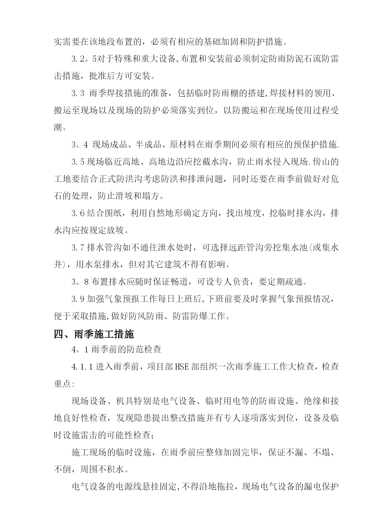 雨季施工方案42952实用文档(实用文档,可以直接使用,可编辑优秀版资料,欢迎下载)目录TOC\o”1-2"\h\z\uHYPERLINK\l”_Toc416469258"一、工程概况PAGEREF_Toc416469258\h1HYPERLINK\l”_Toc416469259"二、编制依据PAGEREF_Toc416469259\h1HYPERLINK\l"_Toc416469260”三、施工准备PAGEREF_Toc416469260\h2HYPERLINK\l”_Toc416469261”四、雨季施工措施PAGEREF_Toc416469261\h3HYPERLINK\l”_Toc416469262”五、雨季施工管理PAGEREF_Toc416469262\h9HYPERLINK\l”_Toc416469263”六、质量保证措施PAGEREF_Toc416469263\h9HYPERLINK\l"_Toc416469264"七、HSE管理方案PAGEREF_Toc416469264\h10HYPERLINK\l"_Toc416469265”八、雨季施工应急措施PAGEREF_Toc416469265\h13HYPERLINK\l"_Toc416469266”九、防雷击应急措施PAGEREF_Toc416469266\h15HYPERLINK\l”_Toc416469267”十、雨后管沟对自然环境的影响应采取的措施PAGEREF_Toc416469267\h17HYPERLINK\l"_Toc416469268”十一、后勤保障及措施用料PAGEREF_Toc416469268\h17雨季施工方案一、工程概况元坝气田17亿立方米∕年滚动建产地面集输工程第I标段包括气田集输管网工程、气田集输站场工程、自动控制工程、通信工程、供配电工程等.主要施工地点在四川省广元市苍溪县境内。其中集输管网工程酸气管线16。673km,燃料气管线16.673km,污水管线11.794km;单井站4座,集气站2座;光缆埋地铺设20.7km,架空铺设10。099km;10kv电力线共计10。099km。站场部分单井站四座,分别为YB204-2、YB205—2、YB28、YB273—1H;集气站两座,分别为YB273、YB27-1/2。I标段的管线分布可划分为四条线路,分别为:⑴YB204—2至YB204-1:从滚动建产新建施工站场YB204-2围墙外向西南方向敷设至酸气一期滚动建产已建设完成的YB204—1围墙外,管道位于苍溪县浙水乡境内。⑵YB205-2至YB205—1:从滚动建产新建施工站场YB205—2围墙外向西南方向敷设,大开挖穿越公用工程一期YB205进场道路,沿西北方向敷设至国道212线顶管穿越公路,继续向东北方向延伸至酸气一期滚动建产已建设完成的YB205—1围墙外,管道位于苍溪县茶店乡和白鹤乡境内。⑶YB273-1至YB273:从滚动建产新建施工站场YB273—1围墙外向东南方向敷设,经过大山梁隧道后顶管穿越苍旺公路,继续向东南方向延伸至YB273井场.⑷YB273至3#阀室和YB28至3#阀室:从滚动建产新建施工站场YB273围墙外向东北方向敷设,管道与目前施工完成的大通燃气管线有部分并行,经过陆相YB21井旁继续向东北方向延伸至YB28井场外的3#阀室汇入酸气一期预留口。二、编制依据1)元坝气田17亿方/年滚动建产工程地面集输工程第I标段图纸;2)GB50369-2006《油气长输管道工程施工及验收规范》;3)《中华人民共和国安全生产法》主席令第70号(2002);4)《建设工程安全生产管理条例》国务院第393号(2004);5)《建设项目环境保护管理办法》6)《中华人民共和国环境保护法》主席令第22号(1989);7)《中华人民共和国水土保持法》主席令第49号(1991);8)《中华人民共和国防洪法》(1997);9)《中华人民共和国土地管理法》(1998年8月29日);10)《水土保持综合治理》11)广元市近几年雨季降水情况。三、施工准备3。1项目开工前,技术、质量部门结合生产的需求,并按照施工总部署,针对项目用到的设备、机具、材料等,制定雨季施工用料计划,物资采办部按照用料计划采购相应材料,并及时发放到施工机组。3。2现场用的设备、机具尽量选用户外适用的,不能满足要求的,必须按照设备、机具的要求采用相应的保护措施,:3.2.1位置相对固定的设备,要求搭建防雨棚,防雨棚的尺寸、大小以极端天气下