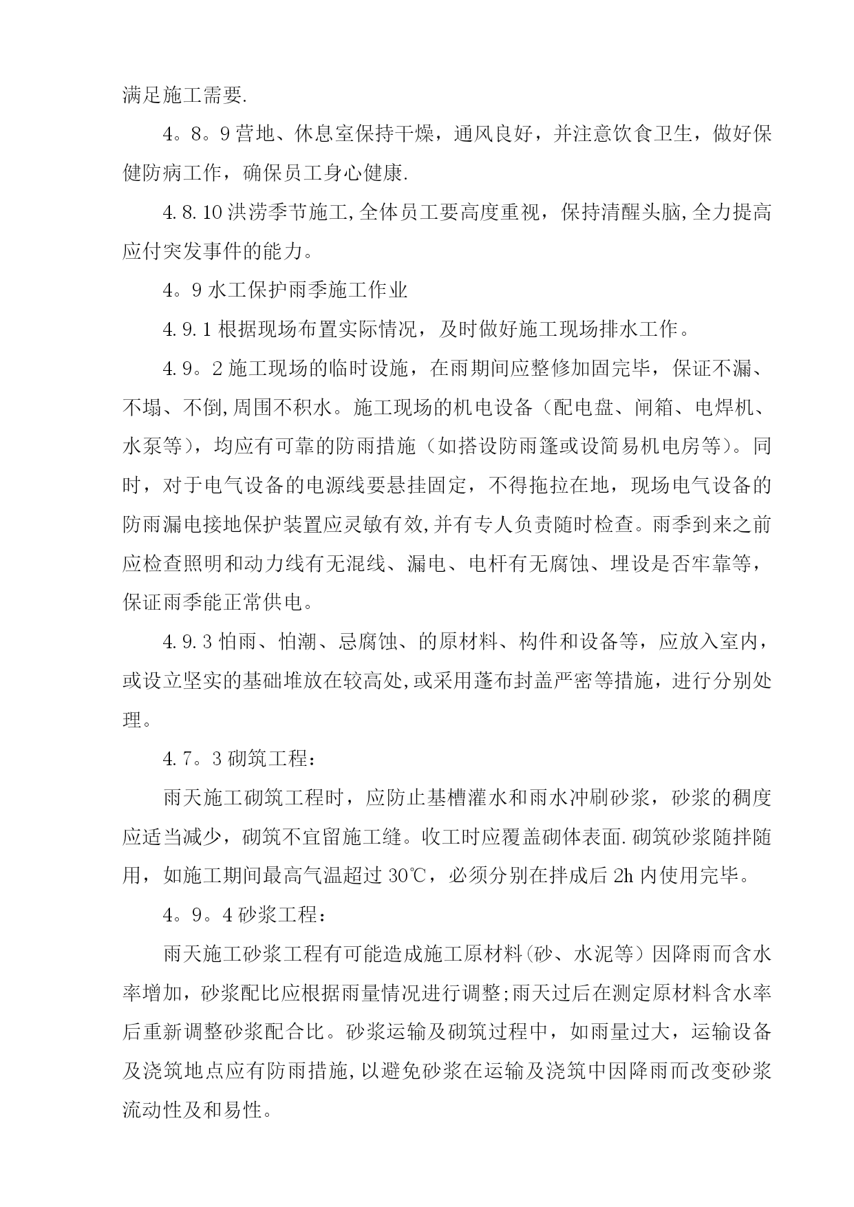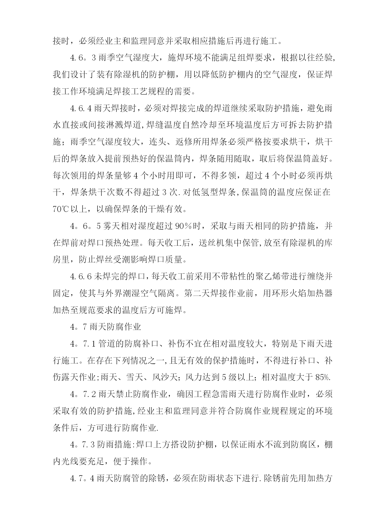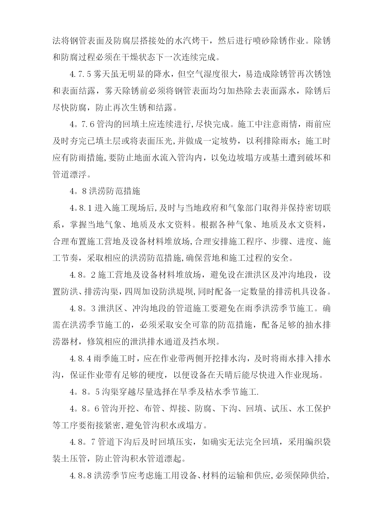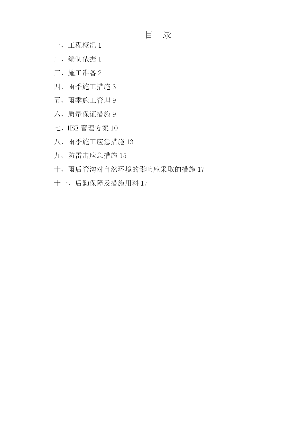 雨季施工方案42952实用文档(实用文档,可以直接使用,可编辑优秀版资料,欢迎下载)目录TOC\o”1-2"\h\z\uHYPERLINK\l”_Toc416469258"一、工程概况PAGEREF_Toc416469258\h1HYPERLINK\l”_Toc416469259"二、编制依据PAGEREF_Toc416469259\h1HYPERLINK\l"_Toc416469260”三、施工准备PAGEREF_Toc416469260\h2HYPERLINK\l”_Toc416469261”四、雨季施工措施PAGEREF_Toc416469261\h3HYPERLINK\l”_Toc416469262”五、雨季施工管理PAGEREF_Toc416469262\h9HYPERLINK\l”_Toc416469263”六、质量保证措施PAGEREF_Toc416469263\h9HYPERLINK\l"_Toc416469264"七、HSE管理方案PAGEREF_Toc416469264\h10HYPERLINK\l"_Toc416469265”八、雨季施工应急措施PAGEREF_Toc416469265\h13HYPERLINK\l"_Toc416469266”九、防雷击应急措施PAGEREF_Toc416469266\h15HYPERLINK\l”_Toc416469267”十、雨后管沟对自然环境的影响应采取的措施PAGEREF_Toc416469267\h17HYPERLINK\l"_Toc416469268”十一、后勤保障及措施用料PAGEREF_Toc416469268\h17雨季施工方案一、工程概况元坝气田17亿立方米∕年滚动建产地面集输工程第I标段包括气田集输管网工程、气田集输站场工程、自动控制工程、通信工程、供配电工程等.主要施工地点在四川省广元市苍溪县境内。其中集输管网工程酸气管线16。673km,燃料气管线16.673km,污水管线11.794km;单井站4座,集气站2座;光缆埋地铺设20.7km,架空铺设10。099km;10kv电力线共计10。099km。站场部分单井站四座,分别为YB204-2、YB205—2、YB28、YB273—1H;集气站两座,分别为YB273、YB27-1/2。I标段的管线分布可划分为四条线路,分别为:⑴YB204—2至YB204-1:从滚动建产新建施工站场YB204-2围墙外向西南方向敷设至酸气一期滚动建产已建设完成的YB204—1围墙外,管道位于苍溪县浙水乡境内。⑵YB205-2至YB205—1:从滚动建产新建施工站场YB205—2围墙外向西南方向敷设,大开挖穿越公用工程一期YB205进场道路,沿西北方向敷设至国道212线顶管穿越公路,继续向东北方向延伸至酸气一期滚动建产已建设完成的YB205—1围墙外,管道位于苍溪县茶店乡和白鹤乡境内。⑶YB273-1至YB273:从滚动建产新建施工站场YB273—1围墙外向东南方向敷设,经过大山梁隧道后顶管穿越苍旺公路,继续向东南方向延伸至YB273井场.⑷YB273至3#阀室和YB28至3#阀室:从滚动建产新建施工站场YB273围墙外向东北方向敷设,管道与目前施工完成的大通燃气管线有部分并行,经过陆相YB21井旁继续向东北方向延伸至YB28井场外的3#阀室汇入酸气一期预留口。二、编制依据1)元坝气田17亿方/年滚动建产工程地面集输工程第I标段图纸;2)GB50369-2006《油气长输管道工程施工及验收规范》;3)《中华人民共和国安全生产法》主席令第70号(2002);4)《建设工程安全生产管理条例》国务院第393号(2004);5)《建设项目环境保护管理办法》6)《中华人民共和国环境保护法》主席令第22号(1989);7)《中华人民共和国水土保持法》主席令第49号(1991);8)《中华人民共和国防洪法》(1997);9)《中华人民共和国土地管理法》(1998年8月29日);10)《水土保持综合治理》11)广元市近几年雨季降水情况。三、施工准备3。1项目开工前,技术、质量部门结合生产的需求,并按照施工总部署,针对项目用到的设备、机具、材料等,制定雨季施工用料计划,物资采办部按照用料计划采购相应材料,并及时发放到施工机组。3。2现场用的设备、机具尽量选用户外适用的,不能满足要求的,必须按照设备、机具的要求采用相应的保护措施,:3.2.1位置相对固定的设备,要求搭建防雨棚,防雨棚的尺寸、大小以极端天气下