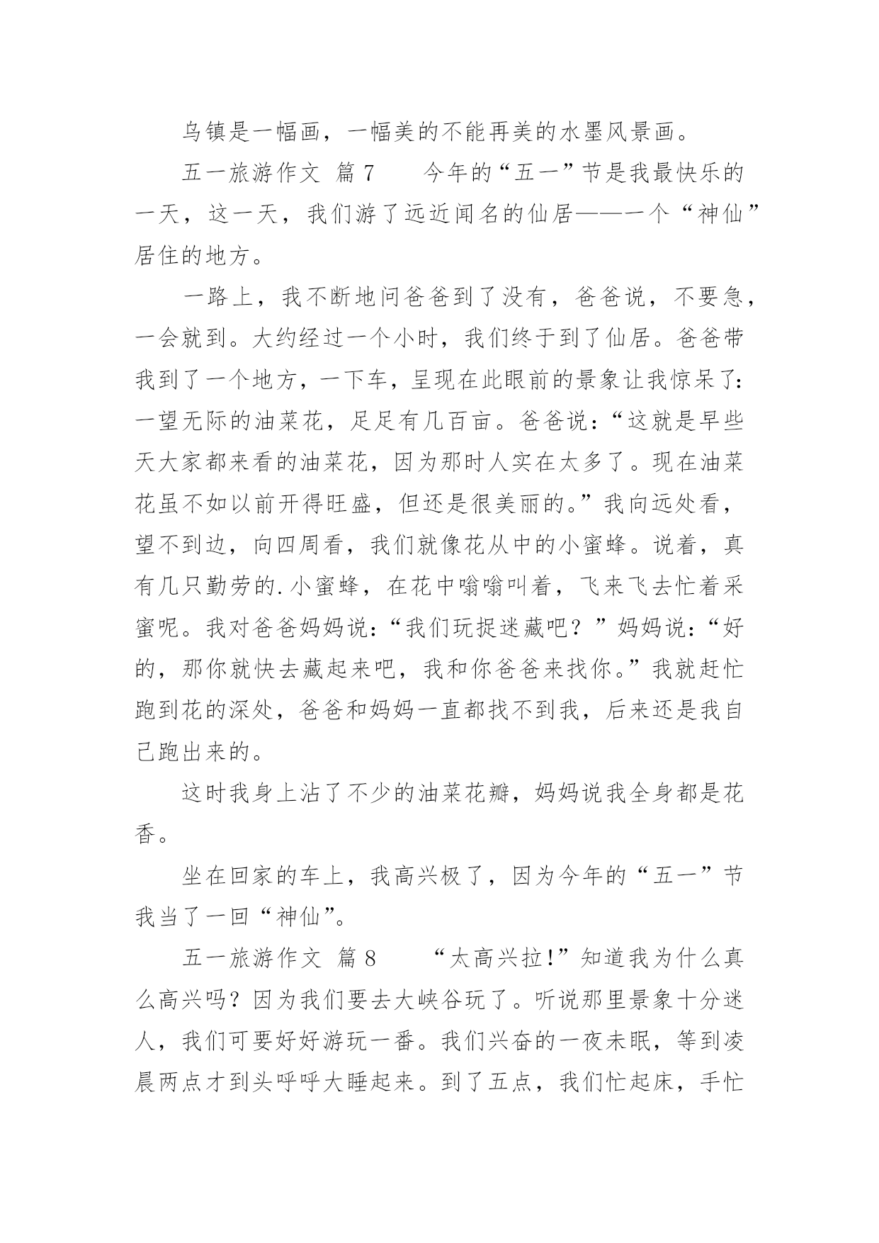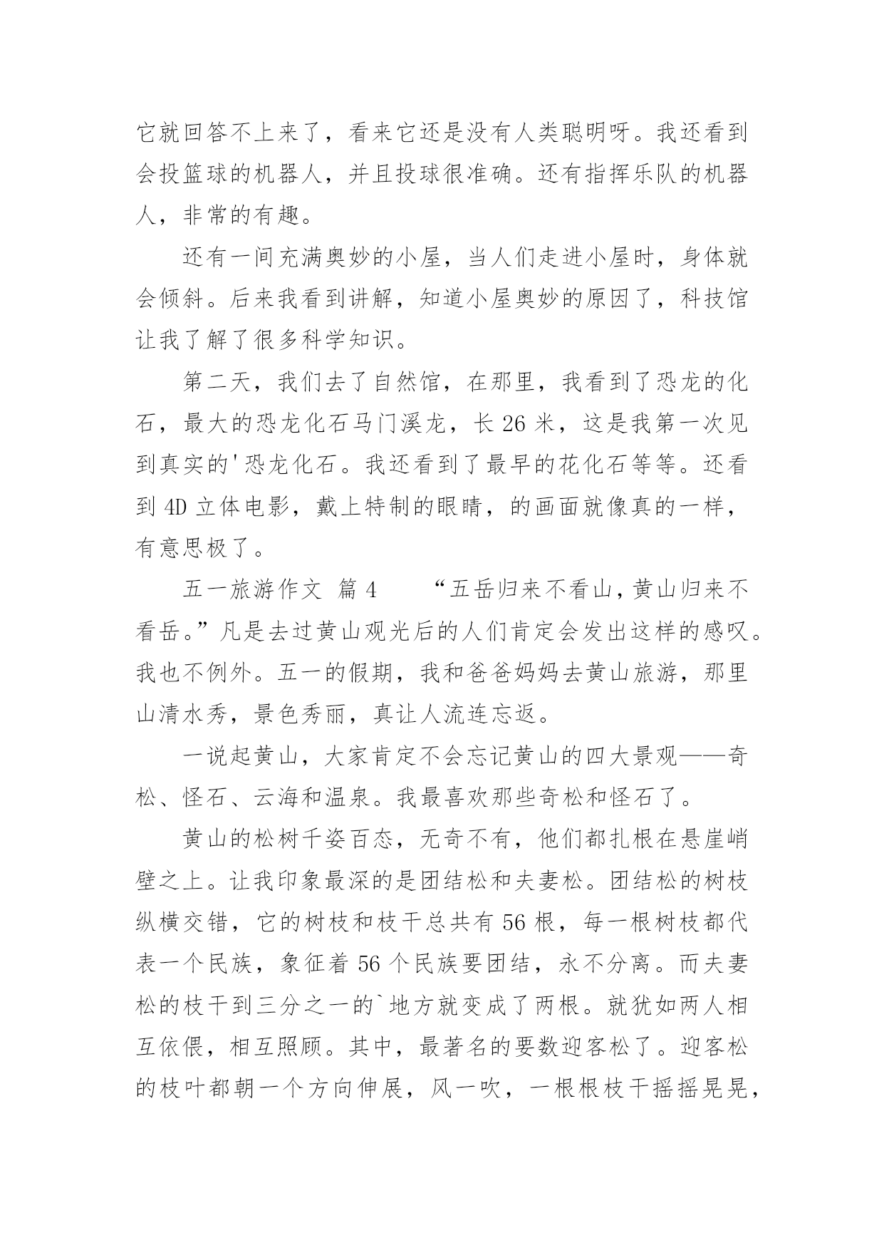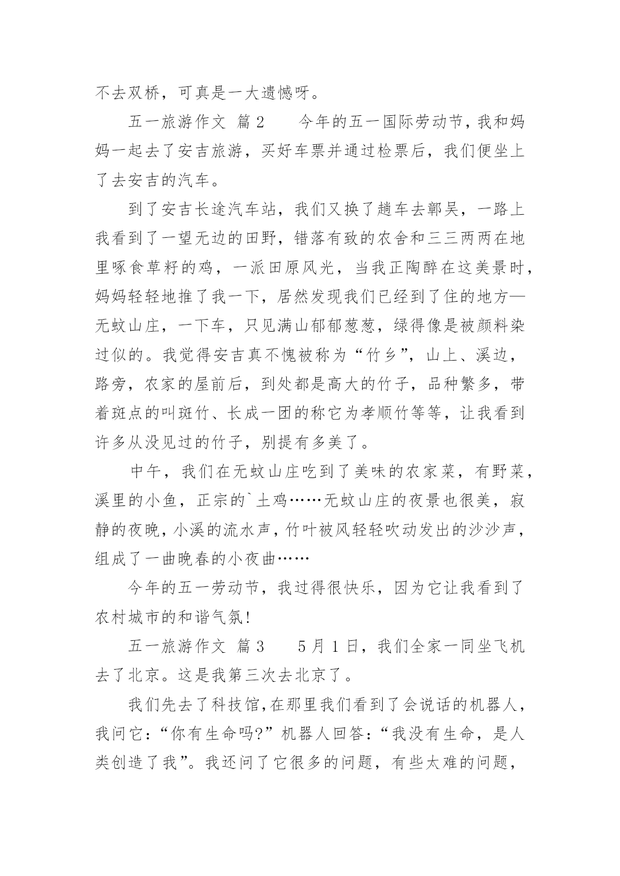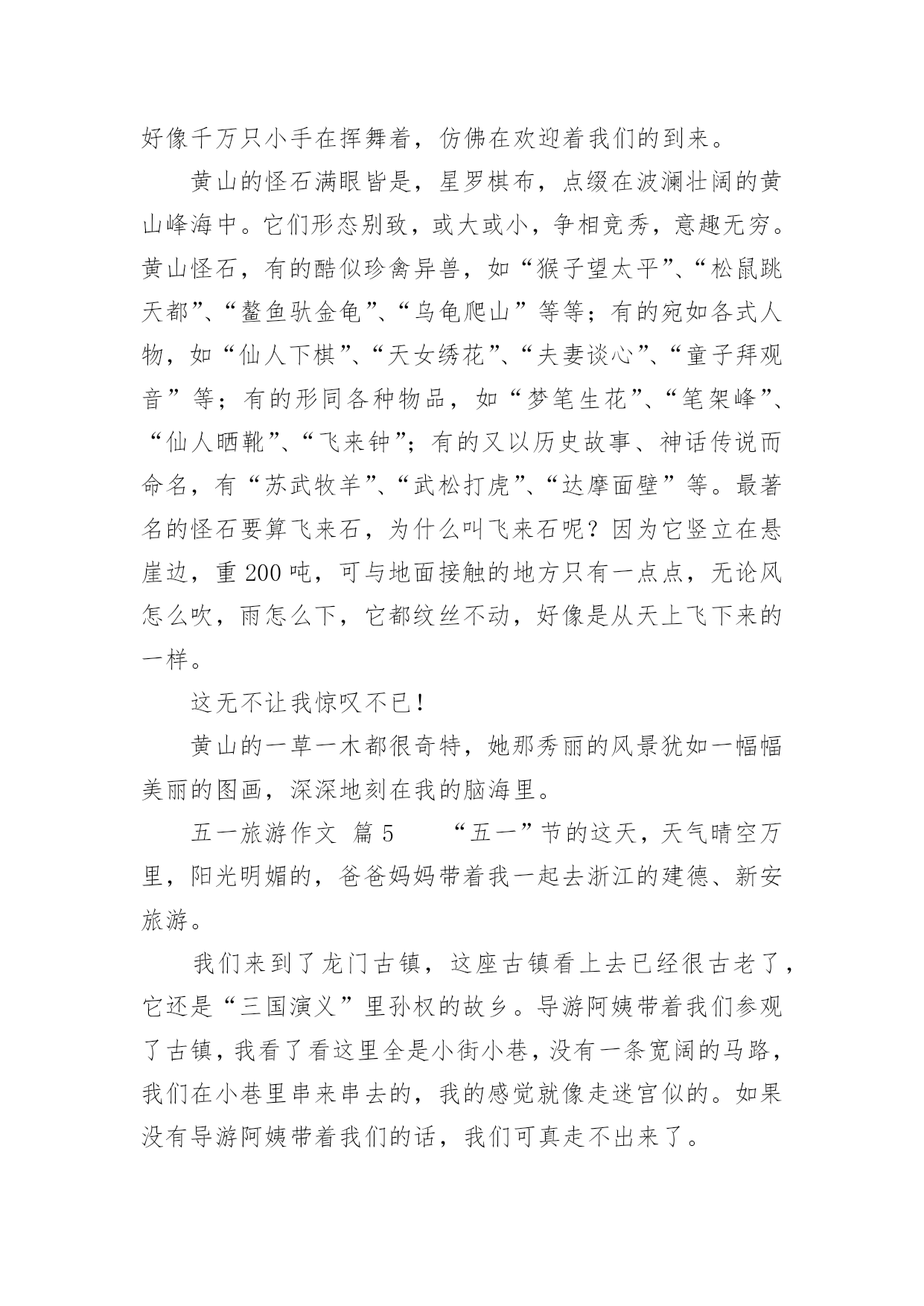 五一旅游作文精选五一旅游作文45篇在学习、工作或生活中,大家都不可避免地要接触到作文吧,作文根据体裁的不同可以分为记叙文、说明文、应用文、议论文。那么你有了解过作文吗?以下是小编收集整理的五一旅游作文,希望能够帮助到大家。五一旅游作文篇1“五一”放假时,我和家人游览了位于浙江省素有“江南第一水乡”之称的古镇周庄。周庄四面环水,只有一小片陆地。我们仿佛置身于水的世界,正如意大利的'著名旅行家马可·波罗所说:周庄真不愧是东方威尼斯。刚走进周庄,就可以看到纵横交错的小河上,有穿梭往来的船只,在一条条船上,艄公们摇着船桨,唱着古老的号子,优哉游哉地向前划去。河面上,一座座古色古香的石拱桥静静地横卧着,置身其中,使人仿佛回到了久远的过去,感受到了周庄的古朴与宁静我们去的那天,天上下着蒙蒙细雨,雨水打在河面上,泛起一圈圈波纹,就像开出了一朵朵美丽的荷花。雨打在脸上,痒酥酥的,让人感到江南的清丽。周庄第一多是水多。古镇四面环水,镇内河道呈井字形,居民依河筑屋,依水成街。无论从哪里看都能看到周庄的小河曲曲绕绕,穿插在古镇中。周庄第二多是桥多。河道上横跨着14座建于元、明、清代的古桥。其中以桥楼富安桥和双桥最为著名。到了周庄,不去双桥,可真是一大遗憾呀。五一旅游作文篇2今年的五一国际劳动节,我和妈妈一起去了安吉旅游,买好车票并通过检票后,我们便坐上了去安吉的汽车。到了安吉长途汽车站,我们又换了趟车去鄣吴,一路上我看到了一望无边的田野,错落有致的农舍和三三两两在地里啄食草籽的鸡,一派田原风光,当我正陶醉在这美景时,妈妈轻轻地推了我一下,居然发现我们已经到了住的地方—无蚊山庄,一下车,只见满山郁郁葱葱,绿得像是被颜料染过似的。我觉得安吉真不愧被称为“竹乡”,山上、溪边,路旁,农家的屋前后,到处都是高大的竹子,品种繁多,带着斑点的叫斑竹、长成一团的称它为孝顺竹等等,让我看到许多从没见过的竹子,别提有多美了。中午,我们在无蚊山庄吃到了美味的农家菜,有野菜,溪里的小鱼,正宗的`土鸡……无蚊山庄的夜景也很美,寂静的夜晚,小溪的流水声,竹叶被风轻轻吹动发出的沙沙声,组成了一曲晚春的小夜曲……今年的五一劳动节,我过得很快乐,因为它让我看到了农村城市的和谐气氛!五一旅游作文篇35月1日,我们全家一同坐飞机去了北京。这是我第三次去北京了。我们先去了科技馆,在那里我们看到了会说话的机器人,我问它:“你有生命吗?”机器人回答:“我没有生命,是人类创造了我”。我还问了它很多的问题,有些太难的问题,它就回答不上来了,看来它还是没有人类聪明呀。我还看到会投篮球的机器人,并且投球很准确。还有指挥乐队的机器人,非常的有趣。还有一间充满奥妙的小屋,当人们走进小屋时,身体就会倾斜。后来我看到讲解,知道小屋奥妙的原因了,科技馆让我了解了很多科学知识。第二天,我们去了自然馆,在那里,我看到了恐龙的化石,最大的恐龙化石马门溪龙,长26米,这是我第一次见到真实的'恐龙化石。我还看到了最早的花化石等等。还看到4D立体电影,戴上特制的眼睛,的画面就像真的一样,有意思极了。五一旅游作文篇4“五岳归来不看山,黄山归来不看岳。”凡是去过黄山观光后的人们肯定会发出这样的感叹。我也不例外。五一的假期,我和爸爸妈妈去黄山旅游,那里山清水秀,景色秀丽,真让人流连忘返。一说起黄山,大家肯定不会忘记黄山的四大景观——奇松、怪石、云海和温泉。我最喜欢那些奇松和怪石了。黄山的松树千姿百态,无奇不有,他们都扎根在悬崖峭壁之上。让我印象最深的是团结松和夫妻松。团结松的树枝纵横交错,它的树枝和枝干总共有56根,每一根树枝都代表一个民族,象征着56个民族要团结,永不分离。而夫妻松的枝干到三分之一的`地方就变成了两根。就犹如两人相互依偎,相互照顾。其中,最著名的要数迎客松了。迎客松的枝叶都朝一个方向伸展,风一吹,一根根枝干摇摇晃晃,好像千万只小手在挥舞着,仿佛在欢迎着我们的到来。黄山的怪石满眼皆是,星罗棋布,点缀在波澜壮阔的黄山峰海中。它们形态别致,或大或小,争相竞秀,意趣无穷。黄山怪石,有的酷似珍禽异兽,如“猴子望太平”、“松鼠跳天都”、“鳌鱼驮金龟”、“乌龟爬山”等等;有的宛如各式人物,如“仙人下棋”、“天女绣花”、“夫妻谈心”、“童子拜观音”等;有的形同各种物品,如“梦笔生花”、“笔架峰”、“仙人晒靴”、“飞来钟”;有的又以历史故事、神话传说而命名,有“苏武牧羊”、“武松打虎”、“达摩面壁”等。最著名的怪石要算飞来石,为什么叫飞来石呢?因为它竖立在悬崖边,重200吨,可与地面接触的地方只有一点点,无论风怎么吹,雨怎么下,它都纹丝不动,好像是从天上飞下来的一样。这无不让我惊叹不已!黄山的一草一木都很奇特,她那秀丽的风景犹如一幅幅美丽的图画,深深地刻在我的脑海里。五一旅游作文篇5“五一”节的这天,天气晴空万里,阳光明媚