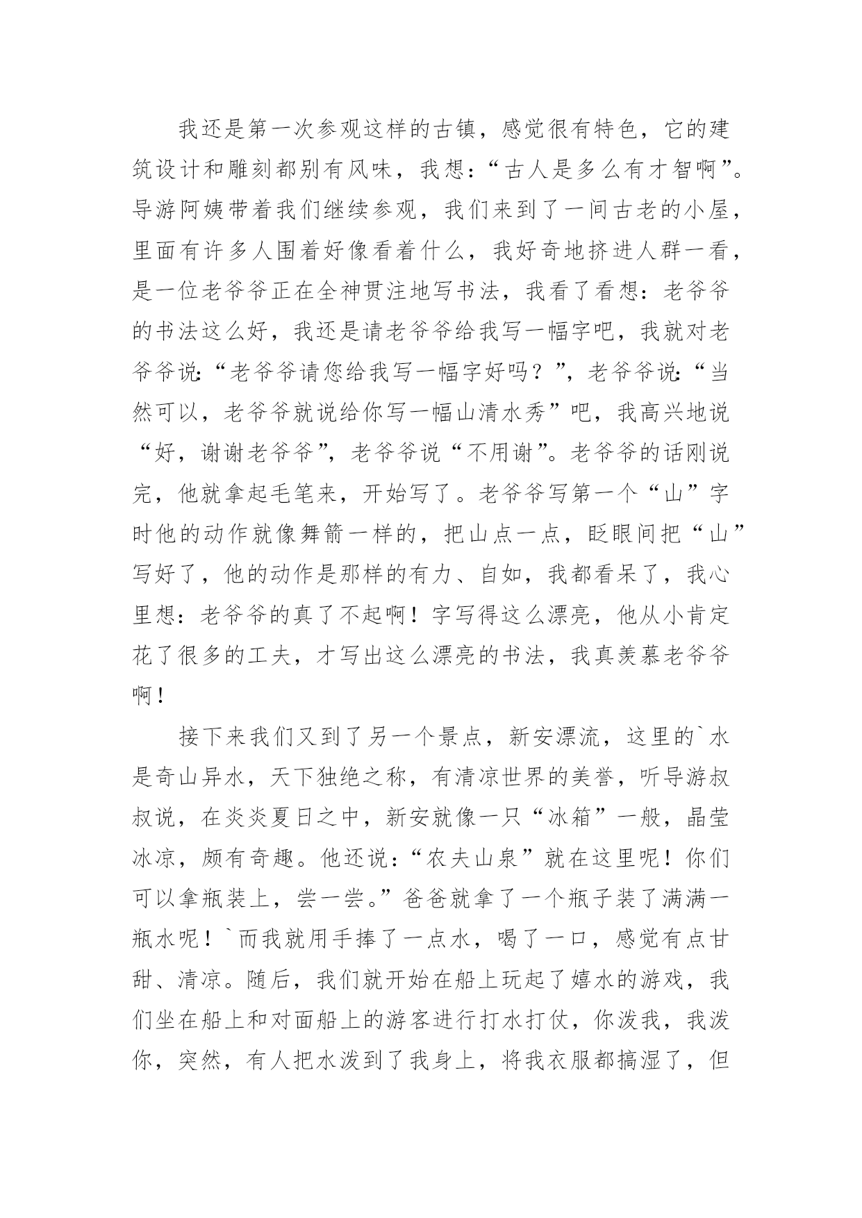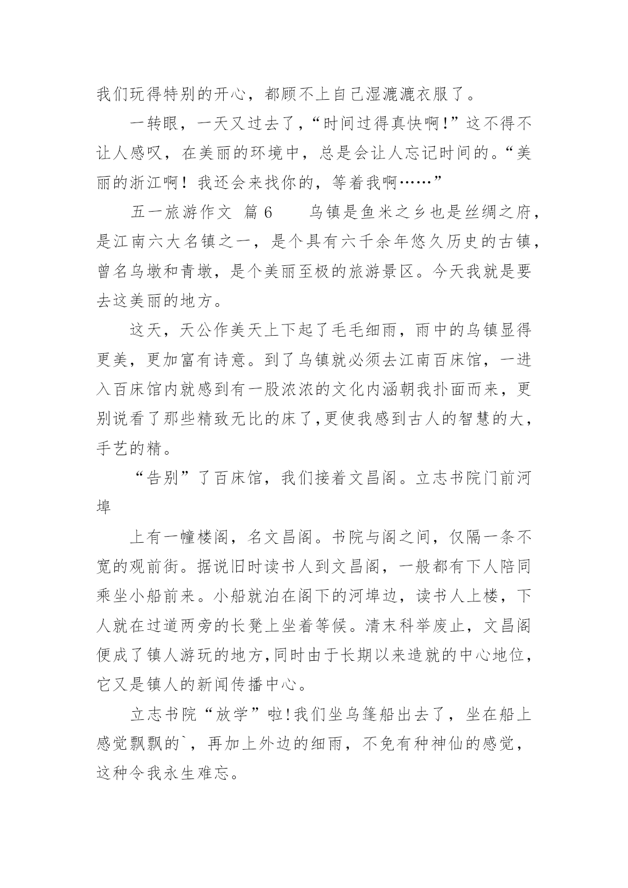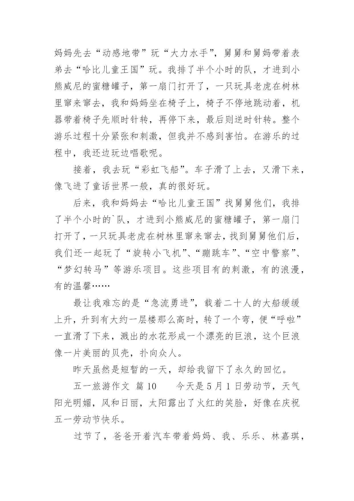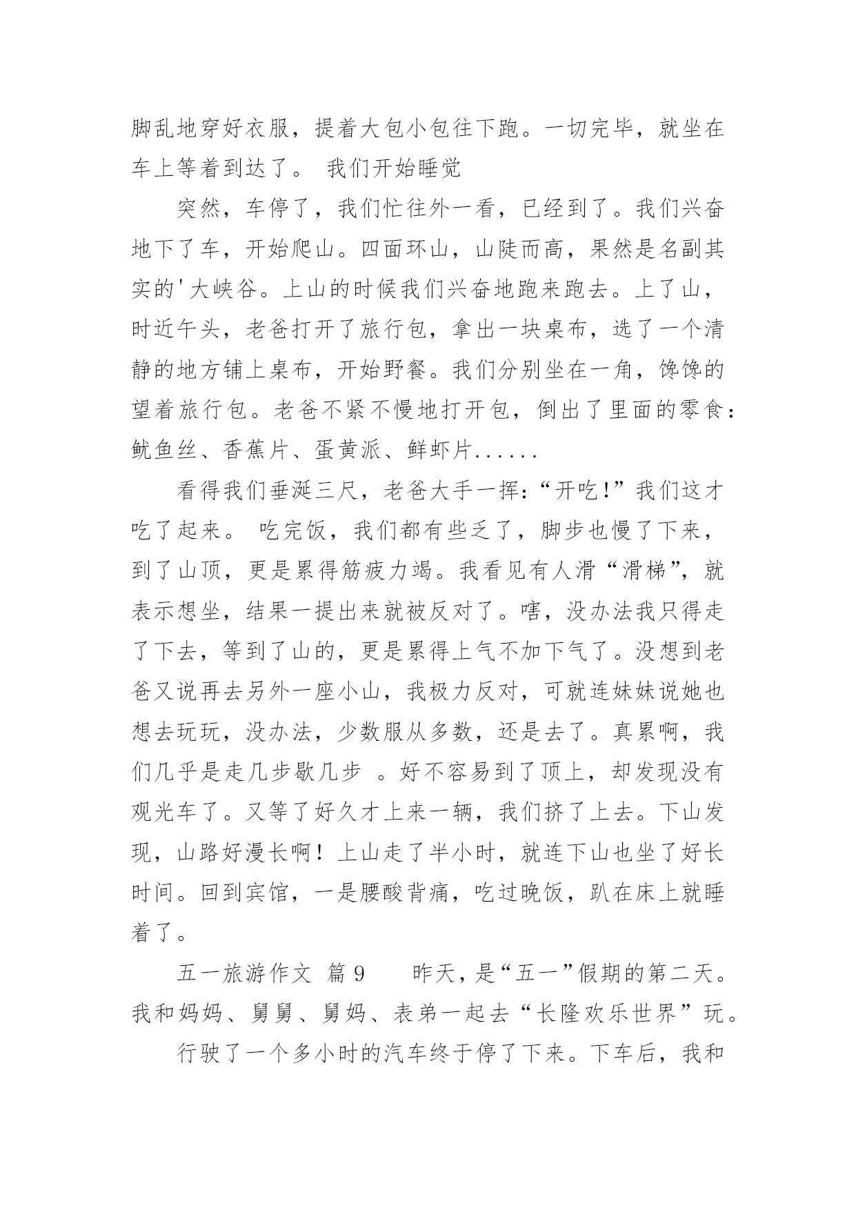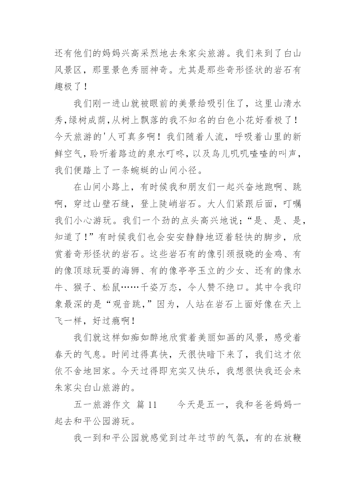 五一旅游作文精选五一旅游作文45篇在学习、工作或生活中,大家都不可避免地要接触到作文吧,作文根据体裁的不同可以分为记叙文、说明文、应用文、议论文。那么你有了解过作文吗?以下是小编收集整理的五一旅游作文,希望能够帮助到大家。五一旅游作文篇1“五一”放假时,我和家人游览了位于浙江省素有“江南第一水乡”之称的古镇周庄。周庄四面环水,只有一小片陆地。我们仿佛置身于水的世界,正如意大利的'著名旅行家马可·波罗所说:周庄真不愧是东方威尼斯。刚走进周庄,就可以看到纵横交错的小河上,有穿梭往来的船只,在一条条船上,艄公们摇着船桨,唱着古老的号子,优哉游哉地向前划去。河面上,一座座古色古香的石拱桥静静地横卧着,置身其中,使人仿佛回到了久远的过去,感受到了周庄的古朴与宁静我们去的那天,天上下着蒙蒙细雨,雨水打在河面上,泛起一圈圈波纹,就像开出了一朵朵美丽的荷花。雨打在脸上,痒酥酥的,让人感到江南的清丽。周庄第一多是水多。古镇四面环水,镇内河道呈井字形,居民依河筑屋,依水成街。无论从哪里看都能看到周庄的小河曲曲绕绕,穿插在古镇中。周庄第二多是桥多。河道上横跨着14座建于元、明、清代的古桥。其中以桥楼富安桥和双桥最为著名。到了周庄,不去双桥,可真是一大遗憾呀。五一旅游作文篇2今年的五一国际劳动节,我和妈妈一起去了安吉旅游,买好车票并通过检票后,我们便坐上了去安吉的汽车。到了安吉长途汽车站,我们又换了趟车去鄣吴,一路上我看到了一望无边的田野,错落有致的农舍和三三两两在地里啄食草籽的鸡,一派田原风光,当我正陶醉在这美景时,妈妈轻轻地推了我一下,居然发现我们已经到了住的地方—无蚊山庄,一下车,只见满山郁郁葱葱,绿得像是被颜料染过似的。我觉得安吉真不愧被称为“竹乡”,山上、溪边,路旁,农家的屋前后,到处都是高大的竹子,品种繁多,带着斑点的叫斑竹、长成一团的称它为孝顺竹等等,让我看到许多从没见过的竹子,别提有多美了。中午,我们在无蚊山庄吃到了美味的农家菜,有野菜,溪里的小鱼,正宗的`土鸡……无蚊山庄的夜景也很美,寂静的夜晚,小溪的流水声,竹叶被风轻轻吹动发出的沙沙声,组成了一曲晚春的小夜曲……今年的五一劳动节,我过得很快乐,因为它让我看到了农村城市的和谐气氛!五一旅游作文篇35月1日,我们全家一同坐飞机去了北京。这是我第三次去北京了。我们先去了科技馆,在那里我们看到了会说话的机器人,我问它:“你有生命吗?”机器人回答:“我没有生命,是人类创造了我”。我还问了它很多的问题,有些太难的问题,它就回答不上来了,看来它还是没有人类聪明呀。我还看到会投篮球的机器人,并且投球很准确。还有指挥乐队的机器人,非常的有趣。还有一间充满奥妙的小屋,当人们走进小屋时,身体就会倾斜。后来我看到讲解,知道小屋奥妙的原因了,科技馆让我了解了很多科学知识。第二天,我们去了自然馆,在那里,我看到了恐龙的化石,最大的恐龙化石马门溪龙,长26米,这是我第一次见到真实的'恐龙化石。我还看到了最早的花化石等等。还看到4D立体电影,戴上特制的眼睛,的画面就像真的一样,有意思极了。五一旅游作文篇4“五岳归来不看山,黄山归来不看岳。”凡是去过黄山观光后的人们肯定会发出这样的感叹。我也不例外。五一的假期,我和爸爸妈妈去黄山旅游,那里山清水秀,景色秀丽,真让人流连忘返。一说起黄山,大家肯定不会忘记黄山的四大景观——奇松、怪石、云海和温泉。我最喜欢那些奇松和怪石了。黄山的松树千姿百态,无奇不有,他们都扎根在悬崖峭壁之上。让我印象最深的是团结松和夫妻松。团结松的树枝纵横交错,它的树枝和枝干总共有56根,每一根树枝都代表一个民族,象征着56个民族要团结,永不分离。而夫妻松的枝干到三分之一的`地方就变成了两根。就犹如两人相互依偎,相互照顾。其中,最著名的要数迎客松了。迎客松的枝叶都朝一个方向伸展,风一吹,一根根枝干摇摇晃晃,好像千万只小手在挥舞着,仿佛在欢迎着我们的到来。黄山的怪石满眼皆是,星罗棋布,点缀在波澜壮阔的黄山峰海中。它们形态别致,或大或小,争相竞秀,意趣无穷。黄山怪石,有的酷似珍禽异兽,如“猴子望太平”、“松鼠跳天都”、“鳌鱼驮金龟”、“乌龟爬山”等等;有的宛如各式人物,如“仙人下棋”、“天女绣花”、“夫妻谈心”、“童子拜观音”等;有的形同各种物品,如“梦笔生花”、“笔架峰”、“仙人晒靴”、“飞来钟”;有的又以历史故事、神话传说而命名,有“苏武牧羊”、“武松打虎”、“达摩面壁”等。最著名的怪石要算飞来石,为什么叫飞来石呢?因为它竖立在悬崖边,重200吨,可与地面接触的地方只有一点点,无论风怎么吹,雨怎么下,它都纹丝不动,好像是从天上飞下来的一样。这无不让我惊叹不已!黄山的一草一木都很奇特,她那秀丽的风景犹如一幅幅美丽的图画,深深地刻在我的脑海里。五一旅游作文篇5“五一”节的这天,天气晴空万里,阳光明媚