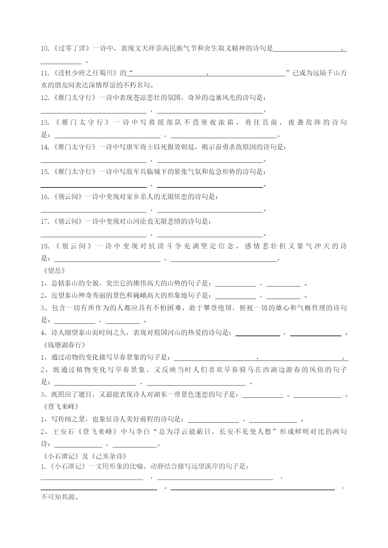 初二(上)默写复习讲义一、直接性默写:1.,乌蒙磅礴走泥丸。2.金沙水拍云崖暖,。3.,风烟望五津。4.,儿女共沾巾。5.浩荡离愁白日斜,。6.落红不是无情物,。7.?齐鲁青未了。8.,阴阳割昏晓。9.,决眦入归鸟。10.,一览众山小。11.几处早莺争暖树,。12.乱花渐欲迷人眼,。13.最爱湖东行不足,。16.,自缘身在最高层。17.,甲光向日金鳞开。18.角声满天秋色里,。19.,霜重鼓寒声不起。20.,提携玉龙为君死。21.,今日又南冠。22.,灵旗空际看。23.,恨别鸟惊心。24.,家书抵万金。25.,浑欲不胜簪。25.,夜泊秦淮近酒家。26.商女不知亡国恨,。27.,尚思为国戍轮台。28.铁马冰河入梦来。29.辛苦遭逢起一经,。30.,身世浮沉雨打萍。31.,零丁洋里叹零丁。32.人生自古谁无死,。33.青树翠蔓,,。34.日光下彻,,;,,似与游着相乐。35.坐潭上,四面,,,。二、理解性默写:1.《七律长征》一诗中运用夸张的修辞手法,反衬出红军战士敢于藐视并战胜一切困难的伟大气魄的句子是,。2.《七律长征》一诗中高度概括红军的英雄气概和百折不挠的勇毅精神的句子是,。3.《春望》一诗中以乐景衬哀情,表达诗人忧国思亲之情的句子是,。4.《春望》一诗表现战火中亲人音信十分珍贵的句子是,。5.《泊秦淮》一诗中运用曲笔,表达诗人对世道人心忧患意识的句子是,。6.杜牧在《泊秦淮》中讽喻晚唐统志者醉生梦死、荒淫误国的诗句是__________,____________。7.在《十一月四日风雨大作》中,作者将梦境和现实相结合,表现报效祖国忠心不衰之情的诗句是,。8.文天祥在《过零丁洋》中巧借地名,写出形势险恶和境况孤苦的句子是,。9.《过零丁洋》一诗中,运用比喻把个人遭遇和国家命运紧密结合在一起的诗句是,。10.《过零丁洋》一诗中,表现文天祥崇高民族气节和舍生取义精神的诗句是,。11.《送杜少府之任蜀川》的“,”已成为远隔千山万水的朋友间表达深情厚谊的不朽名句。12.《雁门太守行》一诗中表现苍凉悲壮的氛围,奇异的边塞风光的诗句是:,。13.《雁门太守行》一诗中写救援部队不畏寒夜浓霜,勇往直前,夜袭敌阵的诗句是:,。14.《雁门太守行》一诗中写唐军将士以死报效朝廷,揭示奋勇杀敌原因的诗句是:,。15.《雁门太守行》一诗中写敌军兵临城下的紧张气氛和危急形势的诗句是:,。16.《别云间》一诗中变现对家乡亲人的无限依恋的诗句是:,。17.《别云间》一诗中变现对山河沦丧无限悲愤的诗句是:,。18.《别云间》一诗中变现对抗清斗争充满坚定信念,感情悲壮但又豪气冲天的诗是:,。《望岳》1、总括泰山的全貌,突出它的雄伟高大的山势的句子是:,。2、近望泰山神奇秀丽的景色和巍峨高大的形象地句子是:,。3、包含一切有所作为的人都应具有不怕困难、敢于攀登绝顶,俯视一切的雄心和气概哲理的诗句是:,。4、诗人细望泰山而时间之久,表现对祖国河山的热爱的诗句是:,。《钱塘湖春行》1、通过动物的变化描写早春景象的句子是:,。2、既通过植物变化写早春景象,又反映当时人们喜欢早春骑马在西湖边游春的风俗的句子是:,。3、既照应了题目,又最能表现诗人对湖东一带景色迷恋的句子是:,。《登飞来峰》1、写传闻之景,也象征诗人美好前程的诗句是:,。2、王安石《登飞来峰》中与李白“总为浮云能蔽日,长安不见使人愁”形成鲜明对比的两句诗:,。《小石潭记》及《己亥杂诗》1.《小石潭记》一文用形象的比喻、动静结合描写远望溪岸的句子是:,,。,不可知其源。2.《小石潭记》一文描写小潭周围凄清的环境,抒发自己寂寞处境中悲凉心绪的句子是:,,,。3.《小石潭记》一文描写写出小石潭源头悠远、两岸弯曲的语句是,。4.《小石潭记》中表现溪水蜿蜒曲折的语句是:,。5.小石潭记》中描写潭水清洌的句子是,,,。6.德高望重的李老师退休后仍然关心青年教师的成长,正如龚自珍在《己亥杂诗》中所说的:“_____________________,____________________”。7.《己亥杂诗》中表达诗人对理想和信念的执着追求的诗句为:,.8.龚自珍在《己亥杂诗》中以落花为喻表明心志的名句是________________________________________。