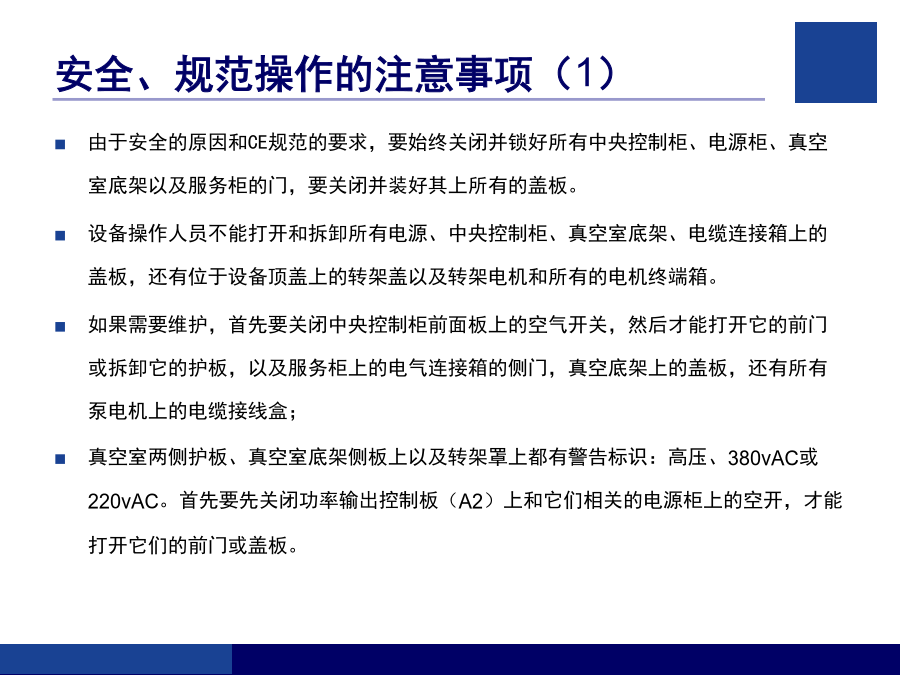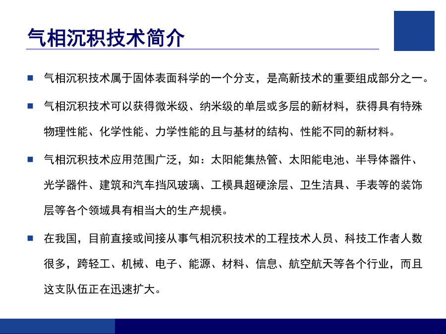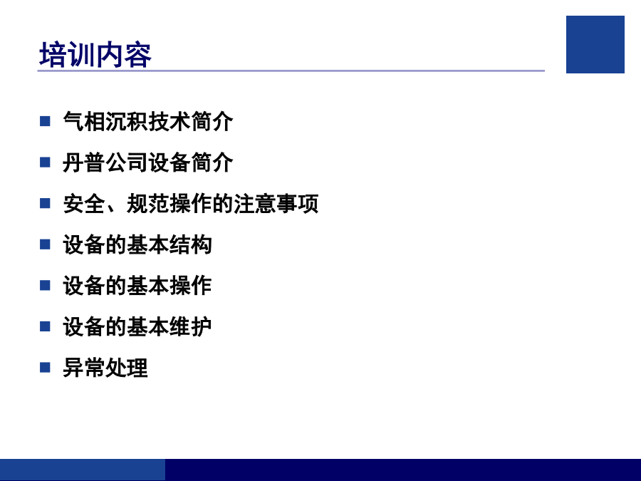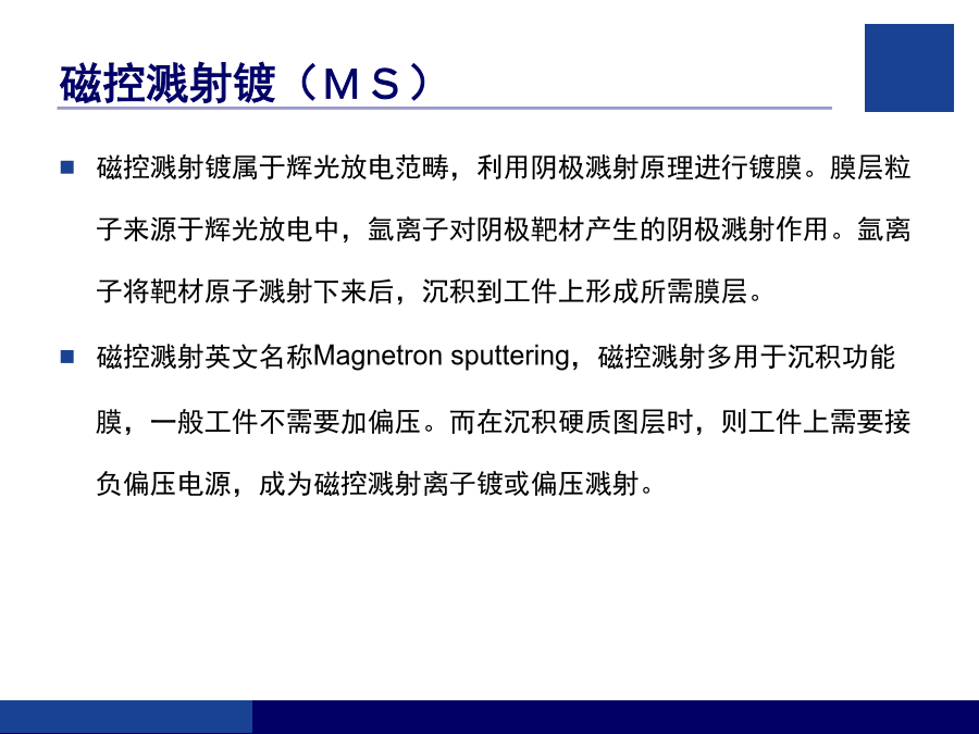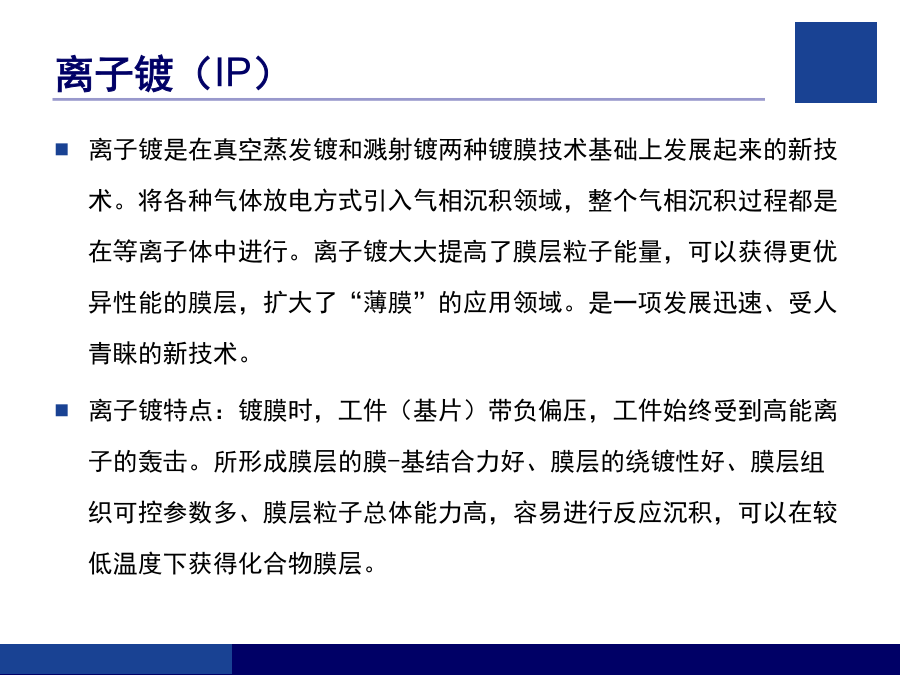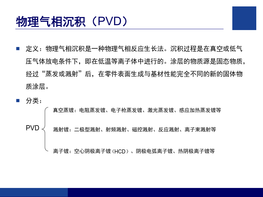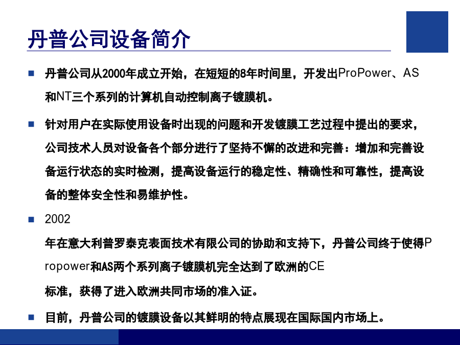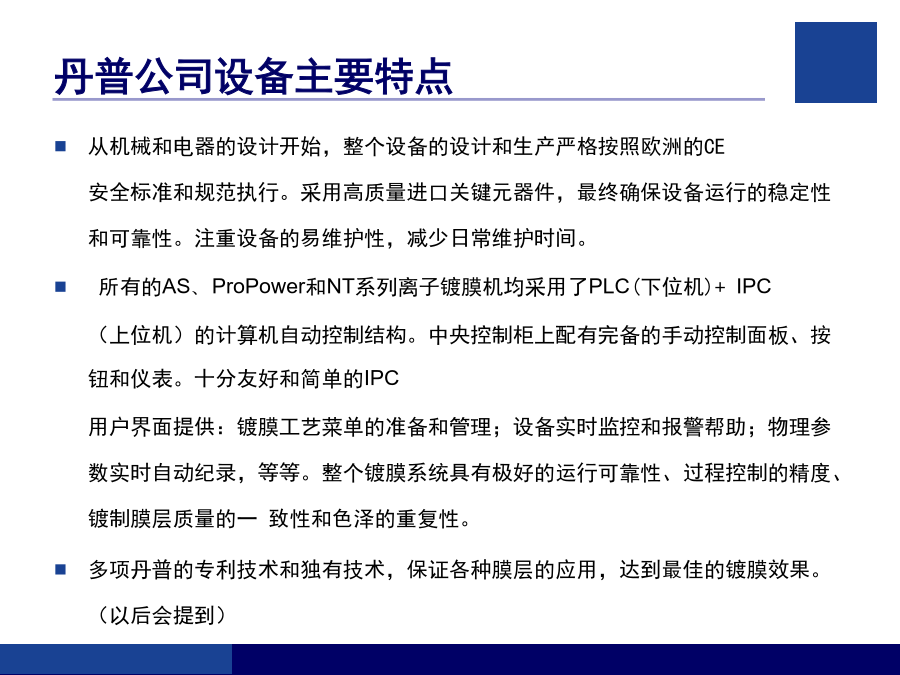 客户技术培训指南培训内容气相沉积技术简介气相沉积技术概述物理气相沉积(PVD)离子镀(IP)磁控溅射镀(MS)丹普公司设备简介丹普公司设备主要特点安全、规范操作的注意事项(1)安全、规范操作的注意事项(2)设备的基本结构丹普公司设备真空系统示意图真空获得(泵)系统粗抽泵(SV200、SV300)换油的步骤前级泵(D16C、TRP-24)罗茨泵(WAU501、1001、RTO.150S)罗茨泵(WAU501、1001、RTO.150S)罗茨泵(WAU501、1001、RTO.150S)分子泵及电源分子泵及电源真空泵油的选择和使用真空测量系统真空测量系统真空系统的检漏真空系统的检漏反应气体供气系统反应气体供气系统冷却水系统压缩空气系统基本手动操作步骤(一)基本手动操作步骤(二)基本手动操作步骤(三)基本手动操作步骤(四)基本手动操作步骤(五)基本自动操作步骤生产过程的异常处理完