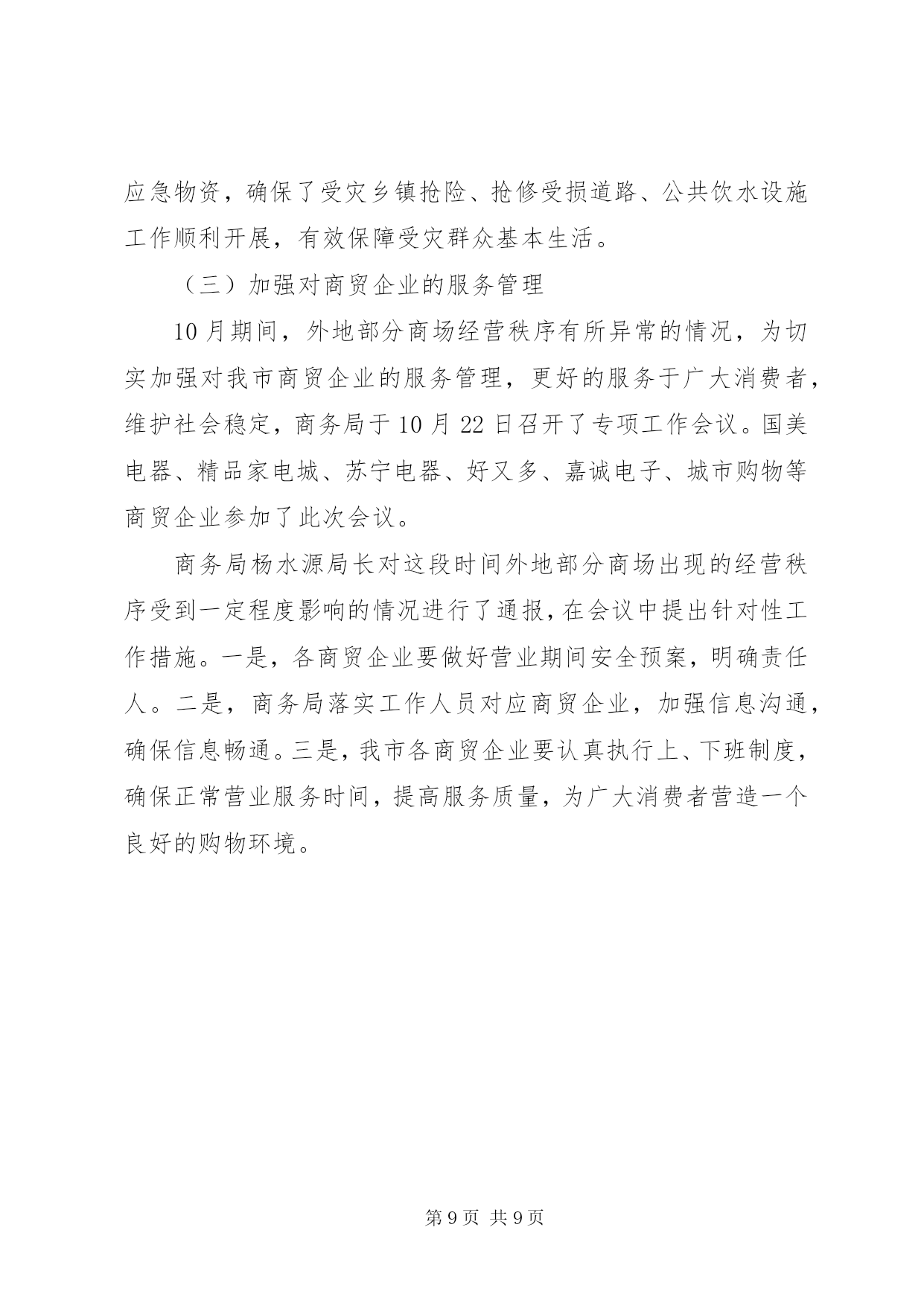 第PAGE\*Arabic\*MERGEFORMAT9页共NUMPAGES\*MERGEFORMAT9页突发公共事件应对总结评估报告市政府应急办、市公安局:今年以来,我局突发公共事件应对工作在市委、市政府的正确领导和市应急办的大力指导下,按照XX县区人民政府办公室《关于做好突发公共事件应对工作总结评估的通知》(都办发229号)文件精神和我局制定的“抓基层、打基础,抓落实、求发展”的工作思路,加强组织协调,认真贯彻省、XX市和XX县区应急管理工作的决策部署,各项应急管理工作取得了明显成效,现将我局突发公共事件应对工作总结评估情况报告如下:一、基本情况我局应对突发事件主要涉及到因突发严重自然灾害、事故灾害、突发公共卫生事件或其他事件造成全市粮食、食用油、肉类、蔬菜、食盐、食糖、饮用水和卫生清洁用品等生活必需品供求关系发生突变,要采取行政手段保障物资供应。通过努力,我局监管、防止突发公共事件收到了良好的效果,主要商贸流通企业没有发生突发公共事件及安全事故,圆满完成了市政府下达的年度安全生产与应急管理工作目标。二、应对工作及分析评估(一)建立健全组织机构我局高度重视突发公共事件应对工作,成立了“商务局突发公共事件应对工作领导小组”。我局局长杨水源任组长,分管领导吴枝建任副组长,相关科室为成员的工作领导小组,结合商务工作实际,突出工作重点,狠抓市场供应、家畜屠宰、酒类流通突发事件等应急管理,同时加大对各商贸流通、餐饮、再生资源、生猪屠宰、民爆、外资外贸企业突发公共事件应对工作指导力度,各企业分别成立了相应的组织机构,形成了分级负责、条块结合和属地管理为主的商务系统突发公共事件应对工作指挥体系。(二)完善应急管理预案体系我局把强化应急预案体系建设作为抓好应急工作的基础,认真研究各类商务领域突发公共事件的发生和发展规律,加强调研,广泛征求意见,及时编制了商务局《突发社会安全事件应急预案》、《安全生产事故灾难应急预案》、《物资储备应急预案》、《自然灾害救助应急预案》、《生活必需品市场供应突发事件应急预案》、《民用爆炸物品事故灾难应急预案》和《商务局应急管理制度》。这些应急预案从预警报告、应急启动、保障措施等方面做了详尽的规定,责任到人,程序清晰,为开展应急管理工作奠定了基础。(三)加强市场信息监测我局先后确定由予乐市场、荷花池市场、家美福超市、嘉诚购物、城市购物、郡守府等30余户重点企业为商务信息直报点,重点监测面粉、大米、食用油、肉类、蔬菜等重要生活必需品的库存数量、销售形势和价格走势等,定期上报市场商品供求监测统计数据,及时将重要商品销售流通分析材料上报政府及有关部门,为政府决策提供可靠的依据,这些措施为确保市场供应异常波动情况下保障市场供应创造了条件。(四)切实做好应急物资保障为切实保障突发事件应急物资供应,结合商务工作特点,依据相关应急预案,进一步完善相关配套措施,加强市场监测。编制了《XX县区物资储备应急预案》和《XX县区生活必需品市场供应突发事件应急预案》,确定由XX县区家美福超市、嘉诚购物中心、城市购物超市作为市级代储企业,由老邻居236家、红旗连锁15家、互惠超市11家、春熙商业6家、家美福超市4家,共计272家直营、加盟店作为乡镇级物资储备点。我市拟储备的救灾应急物资包括:速食食品(方便面、饼干、面包)、饮用水(纯净水、矿泉水)、日用品(卫生纸、毛巾、纸杯)、救灾用燃油(93汽油、0柴油)、其它物资(发电机、彩条布、应急照明灯、安全帽、电池、雨衣)等价值300余万元的救灾(应急)物资储备。积极协调生猪养殖规模企业、重点生猪屠宰企业建立市级猪肉应急储备基地,目前,已确定辉润屠宰、祥瑞肉类加工、新鑫生猪屠宰、兴旺家畜屠宰、真诚屠宰、忠祥屠宰、卉景公司7家规模屠宰加工企业为猪肉供应应急储备企业。(五)强化肉食品安全监管一是在定点屠宰场(点)全面建立和推行屠宰畜源及出场肉品台帐管理制度、检验人员持证上岗制度、肉品检验制度、举报投诉制度、统计监测制度、档案管理制度,实现肉品质量安全责任可追溯。三是健全举报投诉制度、屠宰信息统计制度,及时准确把家畜屠宰动态情况,上报政府及上级主管部门,为上级决策提供依据。四是加大市场监管力度,净化肉品市场。协同工商、动检、公安等部门,在全市开展了严厉打击私屠滥宰、制售注水肉、病害肉等不法行为的专项检查行动,通过多措并举,强化监管,保障了我市肉食品的安全。(六)规范酒类流通市场为保证人民群众喝上“放心酒”,我局认真执行国家、省、XX市酒类商品管理法规,加强酒类商品市场的监督管理。一是认真执行《酒类流通随附单》制度。对全市酒类生产企业和酒类批发企业执行流通随附单的情况进行了抽查和检查。检查结果显示,我市酒类生产企业和批发企业都能够按规定向下游企业、经营户开具规范的《酒类流通随附单》