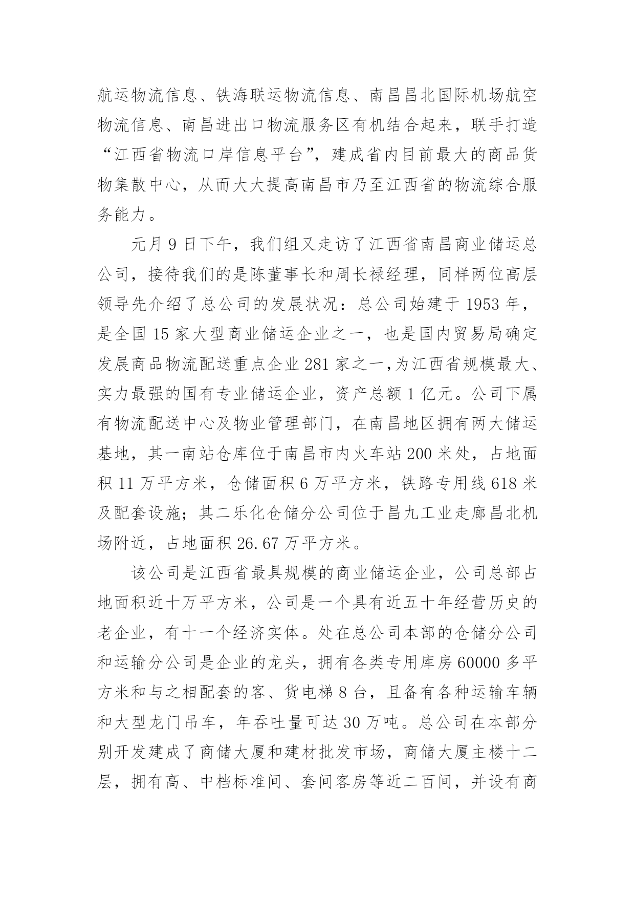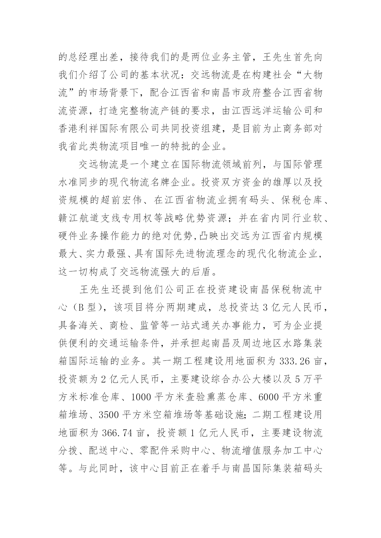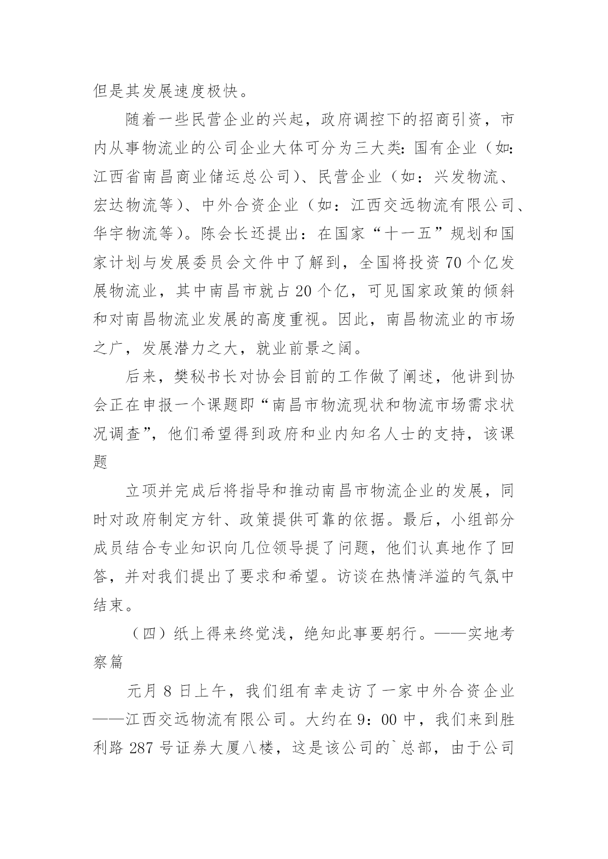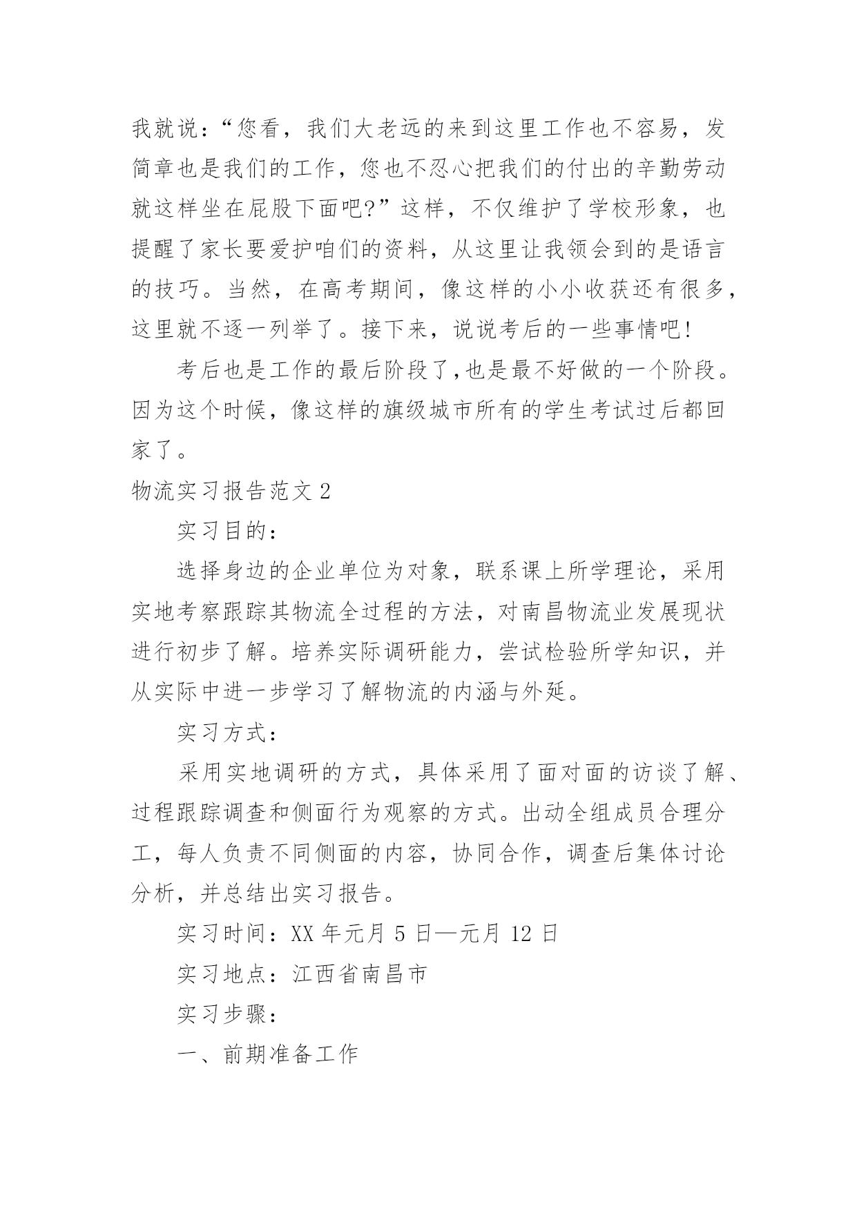 物流实习报告物流实习报告范文(15篇)随着个人素质的提升,接触并使用报告的人越来越多,不同的报告内容同样也是不同的。你所见过的报告是什么样的呢?以下是小编收集整理的物流实习报告范文,欢迎阅读,希望大家能够喜欢。物流实习报告范文1招生历来是被看做民营大学的血液来源,没有了生源,“血源”也就随之枯竭,从而必然走向死亡。我是民办大学的一名学生,今年有幸参加了学校的招生工作,为此让自己在招生领域中学到了许许多多书本上没有的实用知识,真可谓受益匪浅。内蒙古这个地方是我从未去过而又非常向往的的地方,当然,无论是谁一想到这个地方头脑里浮想起来的画面一定是草地、牛羊和蒙古包等等。所以工作之初也是带着一份向往来到这个地方。而我所工作的这地方乌兰察布四子王旗是我们学校之前从未做过的一个区域。所以,摆在我们面前的是一个全新的“市场”,起初,我们在这里随便找个地方落了脚,便开始组织进行前期的工作,我们要做的是招生,所以日常作息时间安排也都是根据当地学校作息时间而定的。高考的时间在六月份,所以提前来做这里也成了我们的一大优势。因为我们有充足的时间做前期的宣传工作,我们的目标群体是当地的两所高中(一所普高,一所职高)的1300余名学生,根据近几年的`升学率核算,这样就有了大概的目标人数。所以把宣传工作的定位在“学生考前离校之前,让每一个班级的学生都熟悉我们,熟悉我们的学校。”接下来的工作便是走进学校、走进班级宣传我们营销我们。效果非常的好,为此也不经意间锻炼了自己的演讲能力。当然,如果只把宣传工作局限于进入班级宣传并不够,在学生课余时间我们也会和学生们在一起玩,比如“踢足球、打篮球、打台球和上网等等”。因为毕竟我们也是学生,所以在一起也没有什么距离感,很容易就打成一片了。这样下去,自然就会有一大批学生帮助我们工作,所以无论是前期的拿名单、搞宣传还是发展代理,做起来都非常的得心应手。当听到学生们告诉我们说我们的宣传工作是所有招生学校中除与他们学校有关系的学校中做得最好的一个,也只有我们发下去的简章之类的宣传资料学生们没有扔,完整的保存了下来,听到这些特别的欣慰。良好的开头等于成功的一半,但并不等于成功。招生工作主要的三个阶段无非就是考前、考中和考后,所以接下来的工作也就随着高考的开始转入另一个阶段,也是从这个阶段开始,我们学到了一些实实在在处理事情的经验。例如在高考那两天,基本上在当地的所有的招生学校都在考点外面针对家长做宣传,近五十所学校在一起搞竞争,其中的宣传方式也是五花八门,有的只顾着大批量的发简章、有的一边发简章一边讲、有的摆出宣传海报做定点宣传、有的干脆看着别人发。但是其中有效的并不多,因为家长现在最关心的是学生在考场里面发挥的怎么样,心中充满了焦虑,根本不可能专心听一个招生学校介绍自己。所以,怎样进行有效的宣传就成了一个技巧性问题。针对于此,我们选择的办法是在求质量的前提再求数量,一边发一边讲做到发出的每一分简章都让人了解、接受。那么,怎样才能做到这些呢?我们的办法是不要急于下发手中的资料,在别人急着发放手中的资料时,你不妨找个家长相对集中的地方与他们闲谈,来缓解他们的紧张情绪,在他们注意到你时在渗入讲解有关本学校的事情。这样,不但家长容易接受,而且他们会对你的印象特别深刻。不要以为这样会很浪费时间,因为高考的时间有两天,如果你像我一样面对的目标学校只有两所,你会有充足的时间完成考中的宣传任务,而且效率也会比其他竞争对手高出很多。当然,这仅仅是一个新手在一个新环境临时想到的小方法而已,方法只有相对实用的没有绝对实用的。还有就是无论到什么时候都要维护自己集体的形象,例如在搞宣传的时候,有许多学校发下去的简章被扔在地上,被人坐在屁股底下等等。但是许多学校的做法竟然是不予理会,我们也遇到过类似的情况,其中就有一个家长把我们的简章坐在了屁股下面,看到之后我就走过去对那位家长说:“家长您好,刚才给您介绍学校的时候有个问题忘记给您介绍了,我再给您介绍下。”那位家长这时就开始找我们的简章,(因为高考那两天,几乎每一位家长手上都有数十份各个学校的简章),最后一起身,从屁股下面把简章拿了出来。这时,我就说:“您看,我们大老远的来到这里工作也不容易,发简章也是我们的工作,您也不忍心把我们的付出的辛勤劳动就这样坐在屁股下面吧?”这样,不仅维护了学校形象,也提醒了家长要爱护咱们的资料,从这里让我领会到的是语言的技巧。当然,在高考期间,像这样的小小收获还有很多,这里就不逐一列举了。接下来,说说考后的一些事情吧!考后也是工作的最后阶段了,也是最不好做的一个阶段。因为这个时候,像这样的旗级城市所有的学生考试过后都回家了。物流实习报告范文2实习目的:选择身边的企业单位为对象,联系课上所学理论,采用实地考察跟踪其物流全过程的方法,对南昌物流业发展现状进行初步了解。培养实际调