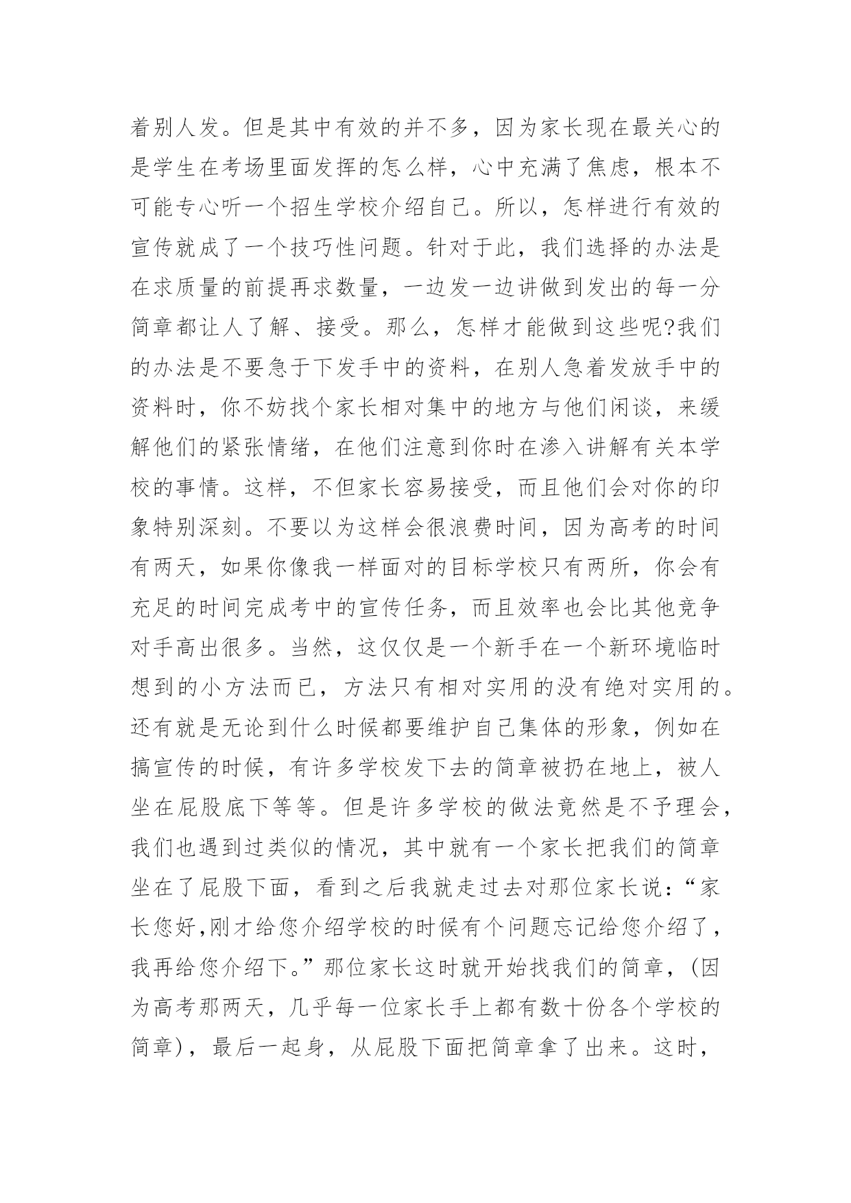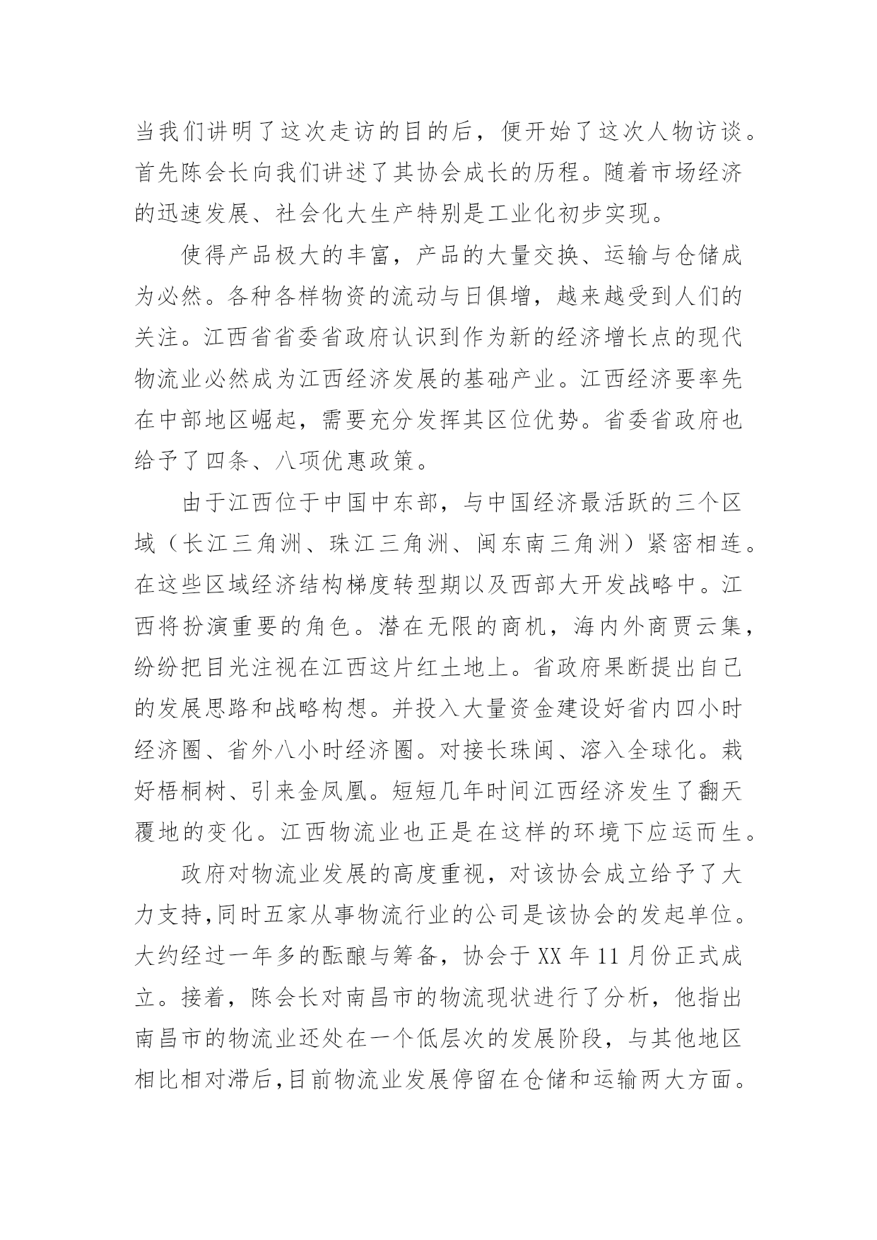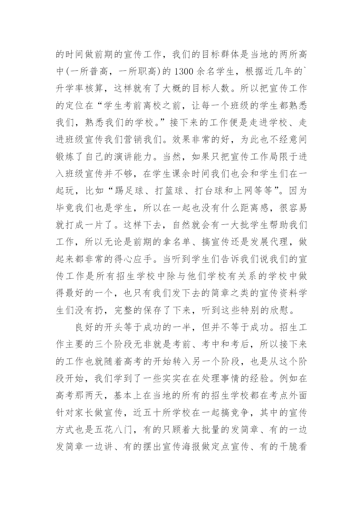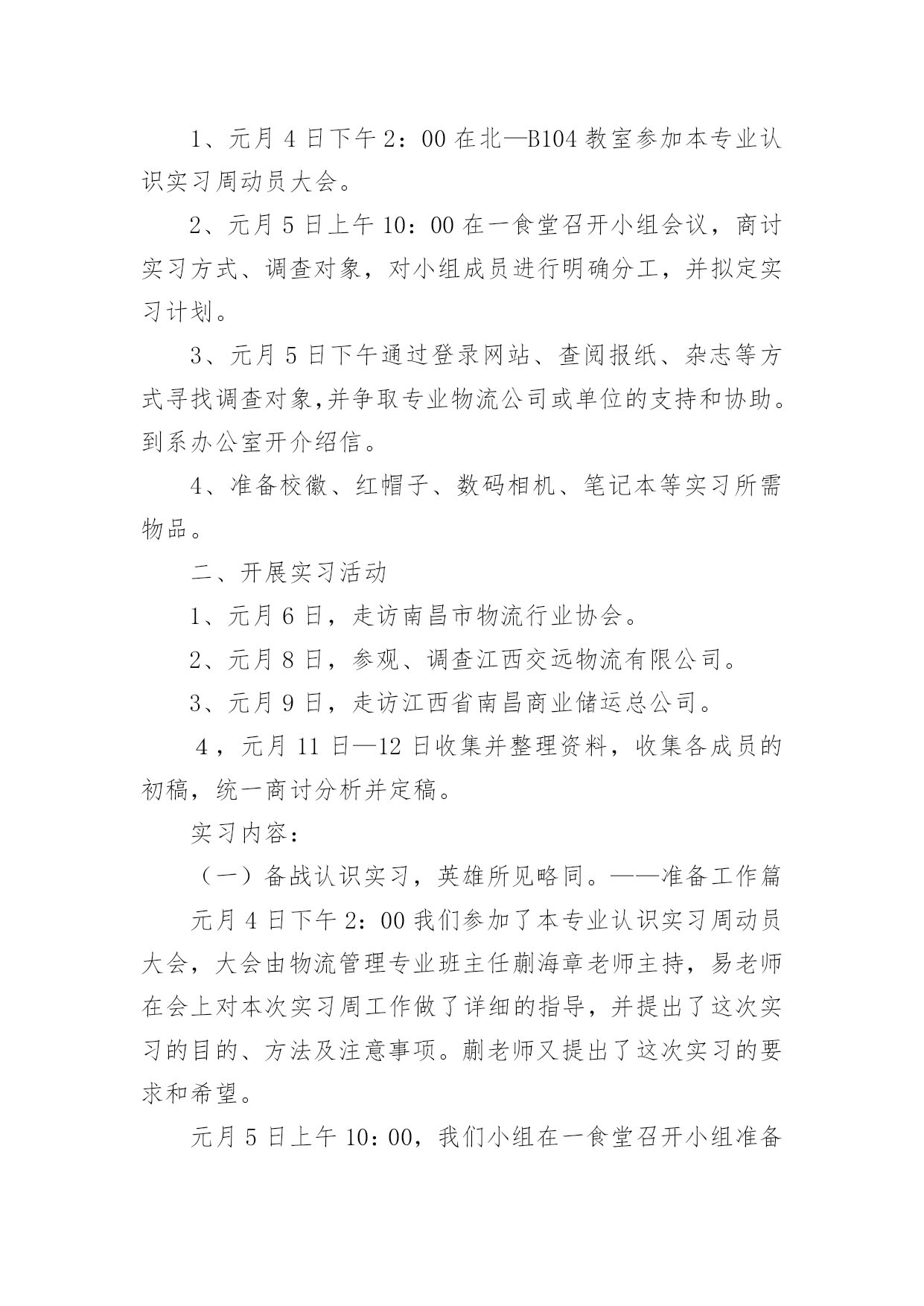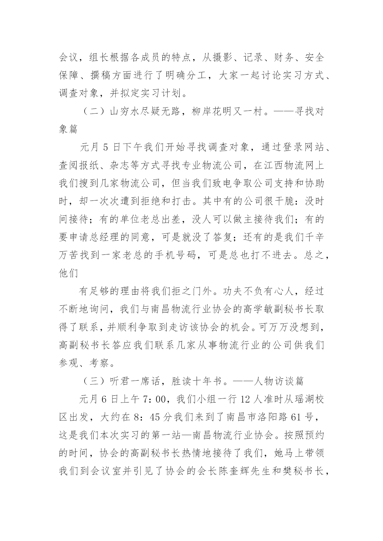 物流实习报告物流实习报告范文(15篇)随着个人素质的提升,接触并使用报告的人越来越多,不同的报告内容同样也是不同的。你所见过的报告是什么样的呢?以下是小编收集整理的物流实习报告范文,欢迎阅读,希望大家能够喜欢。物流实习报告范文1招生历来是被看做民营大学的血液来源,没有了生源,“血源”也就随之枯竭,从而必然走向死亡。我是民办大学的一名学生,今年有幸参加了学校的招生工作,为此让自己在招生领域中学到了许许多多书本上没有的实用知识,真可谓受益匪浅。内蒙古这个地方是我从未去过而又非常向往的的地方,当然,无论是谁一想到这个地方头脑里浮想起来的画面一定是草地、牛羊和蒙古包等等。所以工作之初也是带着一份向往来到这个地方。而我所工作的这地方乌兰察布四子王旗是我们学校之前从未做过的一个区域。所以,摆在我们面前的是一个全新的“市场”,起初,我们在这里随便找个地方落了脚,便开始组织进行前期的工作,我们要做的是招生,所以日常作息时间安排也都是根据当地学校作息时间而定的。高考的时间在六月份,所以提前来做这里也成了我们的一大优势。因为我们有充足的时间做前期的宣传工作,我们的目标群体是当地的两所高中(一所普高,一所职高)的1300余名学生,根据近几年的`升学率核算,这样就有了大概的目标人数。所以把宣传工作的定位在“学生考前离校之前,让每一个班级的学生都熟悉我们,熟悉我们的学校。”接下来的工作便是走进学校、走进班级宣传我们营销我们。效果非常的好,为此也不经意间锻炼了自己的演讲能力。当然,如果只把宣传工作局限于进入班级宣传并不够,在学生课余时间我们也会和学生们在一起玩,比如“踢足球、打篮球、打台球和上网等等”。因为毕竟我们也是学生,所以在一起也没有什么距离感,很容易就打成一片了。这样下去,自然就会有一大批学生帮助我们工作,所以无论是前期的拿名单、搞宣传还是发展代理,做起来都非常的得心应手。当听到学生们告诉我们说我们的宣传工作是所有招生学校中除与他们学校有关系的学校中做得最好的一个,也只有我们发下去的简章之类的宣传资料学生们没有扔,完整的保存了下来,听到这些特别的欣慰。良好的开头等于成功的一半,但并不等于成功。招生工作主要的三个阶段无非就是考前、考中和考后,所以接下来的工作也就随着高考的开始转入另一个阶段,也是从这个阶段开始,我们学到了一些实实在在处理事情的经验。例如在高考那两天,基本上在当地的所有的招生学校都在考点外面针对家长做宣传,近五十所学校在一起搞竞争,其中的宣传方式也是五花八门,有的只顾着大批量的发简章、有的一边发简章一边讲、有的摆出宣传海报做定点宣传、有的干脆看着别人发。但是其中有效的并不多,因为家长现在最关心的是学生在考场里面发挥的怎么样,心中充满了焦虑,根本不可能专心听一个招生学校介绍自己。所以,怎样进行有效的宣传就成了一个技巧性问题。针对于此,我们选择的办法是在求质量的前提再求数量,一边发一边讲做到发出的每一分简章都让人了解、接受。那么,怎样才能做到这些呢?我们的办法是不要急于下发手中的资料,在别人急着发放手中的资料时,你不妨找个家长相对集中的地方与他们闲谈,来缓解他们的紧张情绪,在他们注意到你时在渗入讲解有关本学校的事情。这样,不但家长容易接受,而且他们会对你的印象特别深刻。不要以为这样会很浪费时间,因为高考的时间有两天,如果你像我一样面对的目标学校只有两所,你会有充足的时间完成考中的宣传任务,而且效率也会比其他竞争对手高出很多。当然,这仅仅是一个新手在一个新环境临时想到的小方法而已,方法只有相对实用的没有绝对实用的。还有就是无论到什么时候都要维护自己集体的形象,例如在搞宣传的时候,有许多学校发下去的简章被扔在地上,被人坐在屁股底下等等。但是许多学校的做法竟然是不予理会,我们也遇到过类似的情况,其中就有一个家长把我们的简章坐在了屁股下面,看到之后我就走过去对那位家长说:“家长您好,刚才给您介绍学校的时候有个问题忘记给您介绍了,我再给您介绍下。”那位家长这时就开始找我们的简章,(因为高考那两天,几乎每一位家长手上都有数十份各个学校的简章),最后一起身,从屁股下面把简章拿了出来。这时,我就说:“您看,我们大老远的来到这里工作也不容易,发简章也是我们的工作,您也不忍心把我们的付出的辛勤劳动就这样坐在屁股下面吧?”这样,不仅维护了学校形象,也提醒了家长要爱护咱们的资料,从这里让我领会到的是语言的技巧。当然,在高考期间,像这样的小小收获还有很多,这里就不逐一列举了。接下来,说说考后的一些事情吧!考后也是工作的最后阶段了,也是最不好做的一个阶段。因为这个时候,像这样的旗级城市所有的学生考试过后都回家了。物流实习报告范文2实习目的:选择身边的企业单位为对象,联系课上所学理论,采用实地考察跟踪其物流全过程的方法,对南昌物流业发展现状进行初步了解。培养实际调