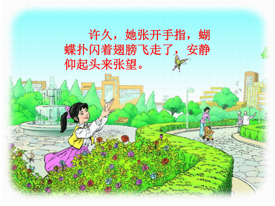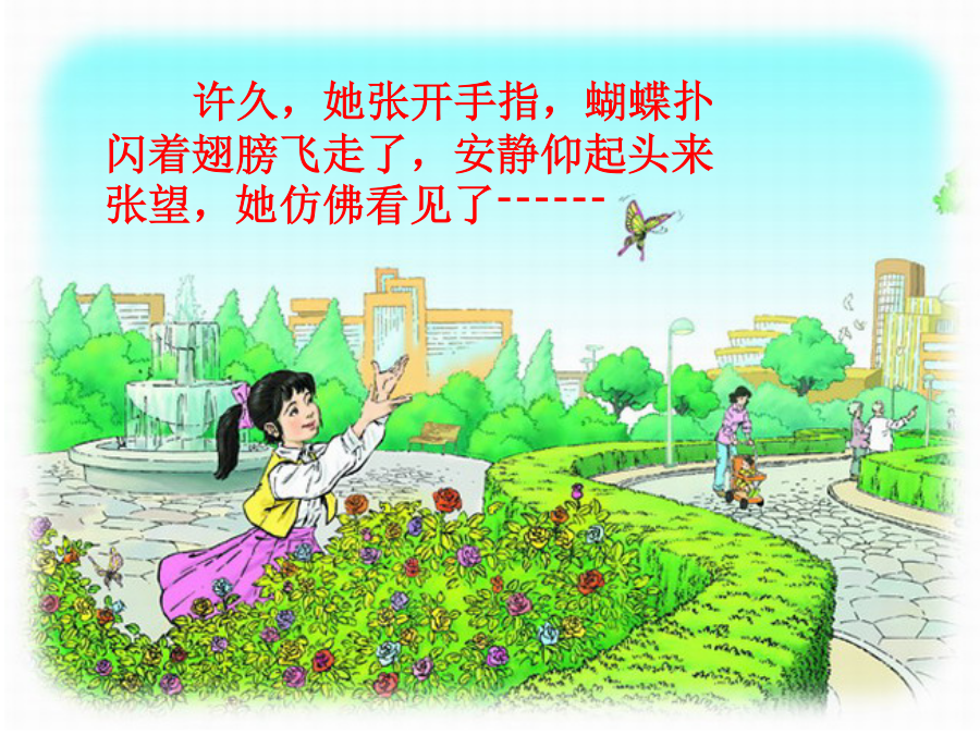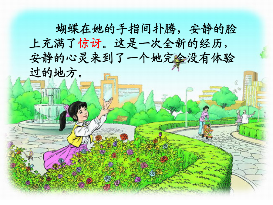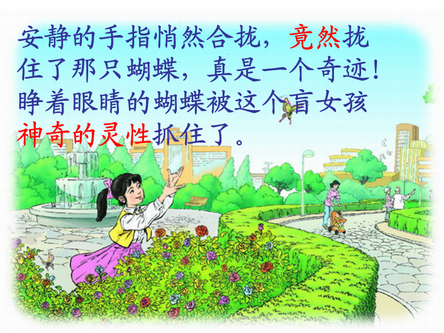 触摸春天郑文文学习要求:1.正确、流利、有感情地朗读课文2.理解含义深刻的句子,揣摩其中蕴含的道理。3.体会盲童对生活的热爱,感受作者对生命的关注,懂得热爱生活,珍爱生命。自学提示:1、自由读课文,思考:安静在触摸春天时都创造了哪些奇迹?并用横线画出有关句子。2、小组合作交流体会。安静的手指悄然合拢,竟然拢住了那只蝴蝶,真是一个奇迹!睁着眼睛的蝴蝶被这个盲女孩神奇的灵性抓住了。许久,她张开手指,蝴蝶扑闪着翅膀飞走了,安静仰起头来张望。许久,她张开手指,蝴蝶扑闪着翅膀飞走了,安静仰起头来张望,她仿佛看见了------谁都有生活的权利,谁都可以创造一个属于自己的缤纷世界。高位截肢,但她自学了好多门外语,创作和翻译的作品超过100万字。刘伟谁都有生活的权利,谁都可以创造一个属于自己的缤纷世界。
