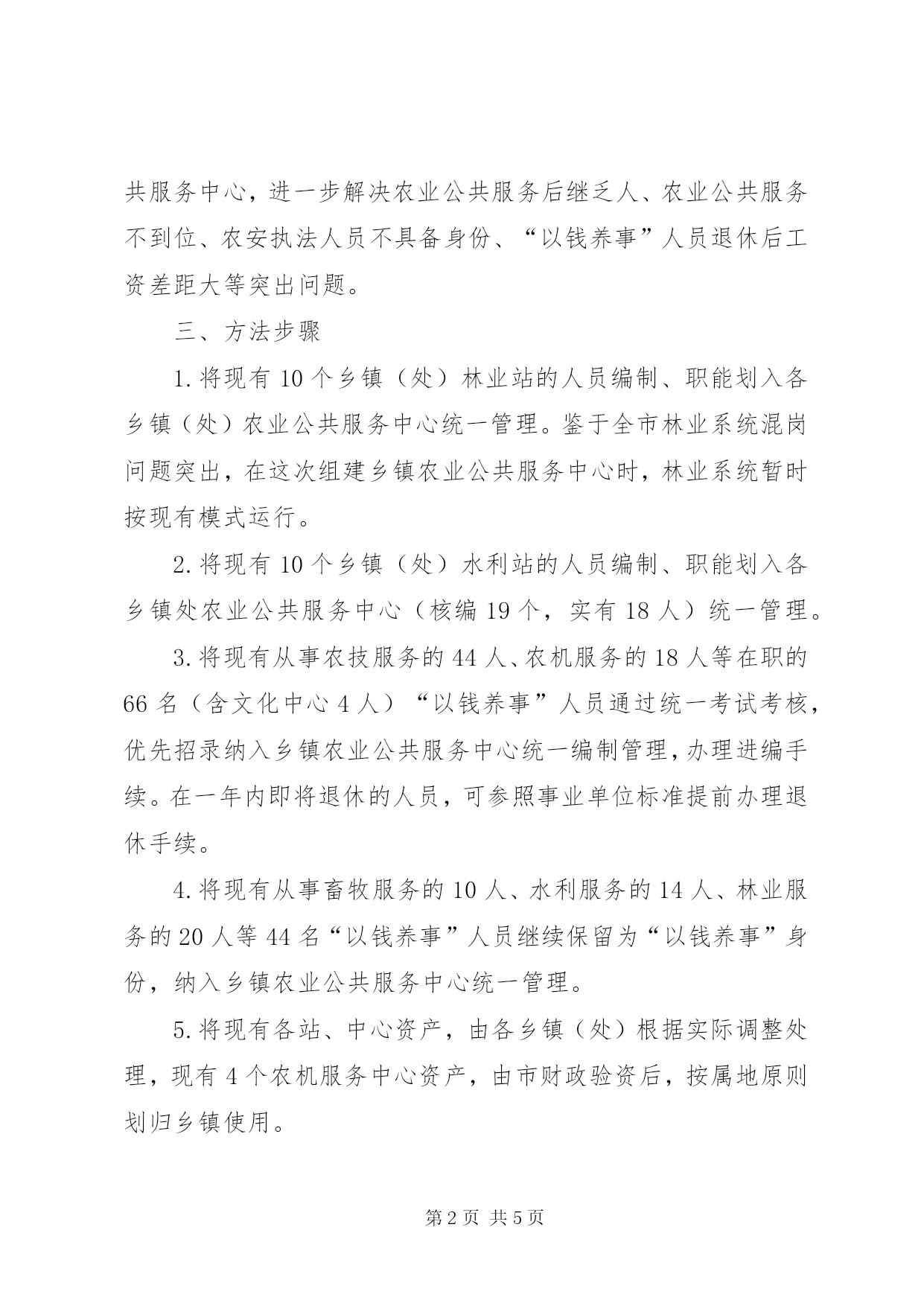 第PAGE\*Arabic\*MERGEFORMAT5页共NUMPAGES\*MERGEFORMAT5页乡镇农业公共服务实施方案一、指导思想以科学发展观为指导,深入贯彻落实党的十八大精神,抓住全省城乡一体化改革发展试点县(市)的机遇,向改革要动力,进一步加强全市乡镇农业公共服务体系建设,提高农业公共服务水平,整合现有农业公共服务资源,不断探索和推进我市农业公共服务体制机制创新。二、目标任务整合乡镇现有林业站、水利站、农技服务中心、农机服务中心、畜牧服务中心,组建乡镇农业公共服务中心,为乡镇管理为主、部门业务指导的财政全额拨款事业单位,所需人员经费及办公业务经费由市财政按核定的标准预算到乡镇,乡镇拨付到农业公共服务中心。全市核定乡镇农业公共服务中心编制110名,乡镇农业公共服务中心主任按副科级干部选配,编制内中心人员的职称由相关市直部门评定、乡镇聘用,工龄连续计算。同时根据工作需要,在全市范围内可适当交流。新成立的乡镇农业公共服务中心加挂原林业站、水利站、农技服务中心、农机服务中心、畜牧服务中心牌子,内设林业、水利、农技、农机、畜牧办公室,负责对上的业务对接、项目争取和对下的技术服务,形成设立一个中心、统一加强管理、人员相对固定、工作相对独立、开展综合服务的格局。通过组建农业公共服务中心,进一步解决农业公共服务后继乏人、农业公共服务不到位、农安执法人员不具备身份、“以钱养事”人员退休后工资差距大等突出问题。三、方法步骤1.将现有10个乡镇(处)林业站的人员编制、职能划入各乡镇(处)农业公共服务中心统一管理。鉴于全市林业系统混岗问题突出,在这次组建乡镇农业公共服务中心时,林业系统暂时按现有模式运行。2.将现有10个乡镇(处)水利站的人员编制、职能划入各乡镇处农业公共服务中心(核编19个,实有18人)统一管理。3.将现有从事农技服务的44人、农机服务的18人等在职的66名(含文化中心4人)“以钱养事”人员通过统一考试考核,优先招录纳入乡镇农业公共服务中心统一编制管理,办理进编手续。在一年内即将退休的人员,可参照事业单位标准提前办理退休手续。4.将现有从事畜牧服务的10人、水利服务的14人、林业服务的20人等44名“以钱养事”人员继续保留为“以钱养事”身份,纳入乡镇农业公共服务中心统一管理。5.将现有各站、中心资产,由各乡镇(处)根据实际调整处理,现有4个农机服务中心资产,由市财政验资后,按属地原则划归乡镇使用。乡镇农业公共服务中心的组建,要求2013年9月底完成,10月份确保正常运行,共分四个阶段进行。第一阶段:宣传政策,制定工作方案(2013年9月2日-10日)1.加强政策宣传。各乡镇(处)、市直相关部门要深刻认识深化乡镇综合配套改革、组建乡镇农业公共服务中心的重要意义,弄清有关政策,以个别走访、召开座谈会等形式,做好相关人员宣传解释工作,形成人人参与改革、个个支持改革的良好氛围。2.制定工作方案。市委编办要制定好编制工作方案,将人员编制确定到乡镇,将职能职责确定到中心;市人社局要制定好招录考试工作方案;市委组织部要做好人员招录考核工作方案;市综改办要制定好经费预算方案;其他相关部门要制定好服务中心人员合理搭配分配方案,确保定编前先定岗。第二阶段:核编核岗,明确中心职责(2013年9月11日-20日)1.核定乡镇编制。市委编办在广泛征求意见的基础上,按照科学合理的原则,将全市110名编制核定到各乡镇(处)。市综改办根据各乡镇(处)核定的事业编制数和核岗的“以钱养事”人数,将经费预算到乡镇,从2013年10月开始执行。2.明确中心职责。市委农办、市委编办根据市直相关部门提供的乡镇农业公共服务中心职能建议,综合各乡镇(处)的意见,由市委编办行文明确到各个中心。第三阶段:考试考核,确定中心人员(2013年9月21日-30日)由市人社局负责,对现有农技服务中心44人、农机服务中心18人包括文化服务中心4人做好招录考试工作;由市委组织部牵头,做好招录考核工作;各乡镇(处)和市直相关部门全力做好配合,确保9月底以前人员全部到岗到位。第四阶段:建章立制,确保正常运转(2013年10月上旬)按照“乡镇管理为主、部门业务指导”的原则,各乡镇(处)要安排农业公共服务中心建立各种规章制度,并将职责明确到人;市直相关部门要指导各个乡镇服务中心建立业务工作制度;市委农办要建立考核制度,形成中心考核到人、乡镇(处)考核到中心、市委农办组织农口部门业务考核到乡镇(处)的考核机制。四、组织领导1.加强组织领导。为保证这次改革顺利进行,乡镇农业公共服务中心顺利组建,市成立工作领导小组,由市委副书记任组长,副市长陈红林、市长助理任副组长,市委组织部分管负责人、市委农办、市委编办、市综改办、市文化局、市人社局、市农业局、市水利局、市林业局、市