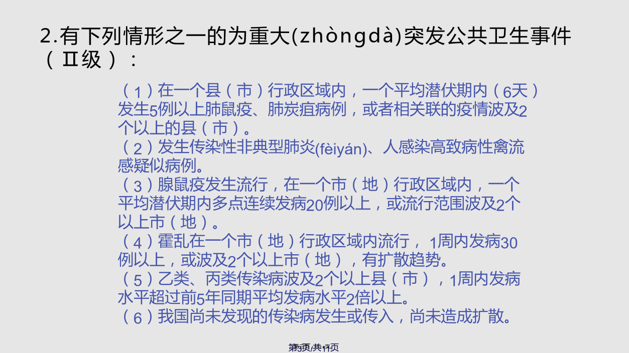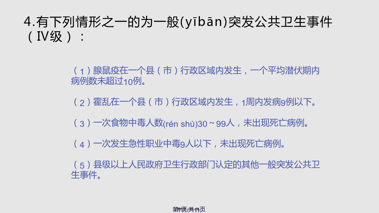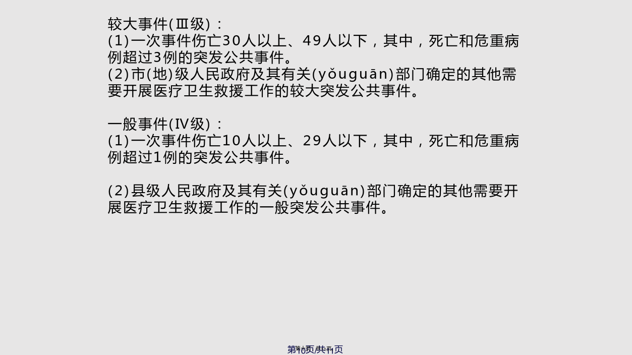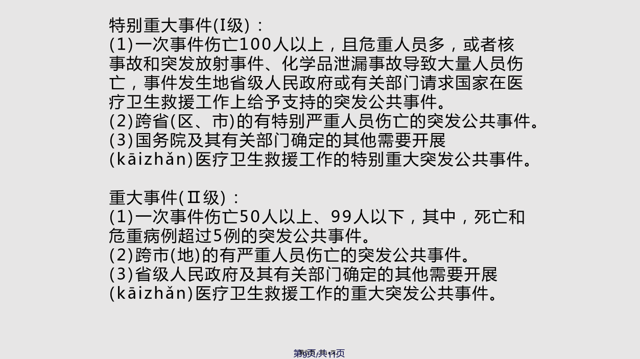 根据突发公共卫生事件性质、危害程度、涉及范围,突发公共卫生事件划分为特别(tèbié)重大(Ⅰ级)、重大(Ⅱ级)、较大(Ⅲ级)和一般(Ⅳ级)四级。1.有下列情形之一的为特别重大(zhòngdà)突发公共卫生事件(Ⅰ级):2.有下列情形之一的为重大(zhòngdà)突发公共卫生事件(Ⅱ级):2.有下列(xiàliè)情形之一的为重大突发公共卫生事件(Ⅱ级):3.有下列(xiàliè)情形之一的为较大突发公共卫生事件(Ⅲ级):3.有下列情形(qíngxing)之一的为较大突发公共卫生事件(Ⅲ级):4.有下列情形之一的为一般(yībān)突发公共卫生事件(Ⅳ级):根据突发公共事件导致人员伤亡和健康危害(wēihài)情况将医疗卫生救援事件分为特别重大(I级)、重大(Ⅱ级)、较大(Ⅲ级)和一般(Ⅳ级)四级。特别重大事件(I级):(1)一次事件伤亡100人以上,且危重人员多,或者核事故和突发放射事件、化学品泄漏事故导致大量人员伤亡,事件发生地省级人民政府或有关部门请求国家在医疗卫生救援工作上给予支持的突发公共事件。(2)跨省(区、市)的有特别严重人员伤亡的突发公共事件。(3)国务院及其有关部门确定的其他需要开展(kāizhǎn)医疗卫生救援工作的特别重大突发公共事件。重大事件(Ⅱ级):(1)一次事件伤亡50人以上、99人以下,其中,死亡和危重病例超过5例的突发公共事件。(2)跨市(地)的有严重人员伤亡的突发公共事件。(3)省级人民政府及其有关部门确定的其他需要开展(kāizhǎn)医疗卫生救援工作的重大突发公共事件。较大事件(Ⅲ级):(1)一次事件伤亡30人以上、49人以下,其中,死亡和危重病例超过3例的突发公共事件。(2)市(地)级人民政府及其有关(yǒuguān)部门确定的其他需要开展医疗卫生救援工作的较大突发公共事件。一般事件(Ⅳ级):(1)一次事件伤亡10人以上、29人以下,其中,死亡和危重病例超过1例的突发公共事件。(2)县级人民政府及其有关(yǒuguān)部门确定的其他需要开展医疗卫生救援工作的一般突发公共事件。感谢您的观看(guānkàn)!