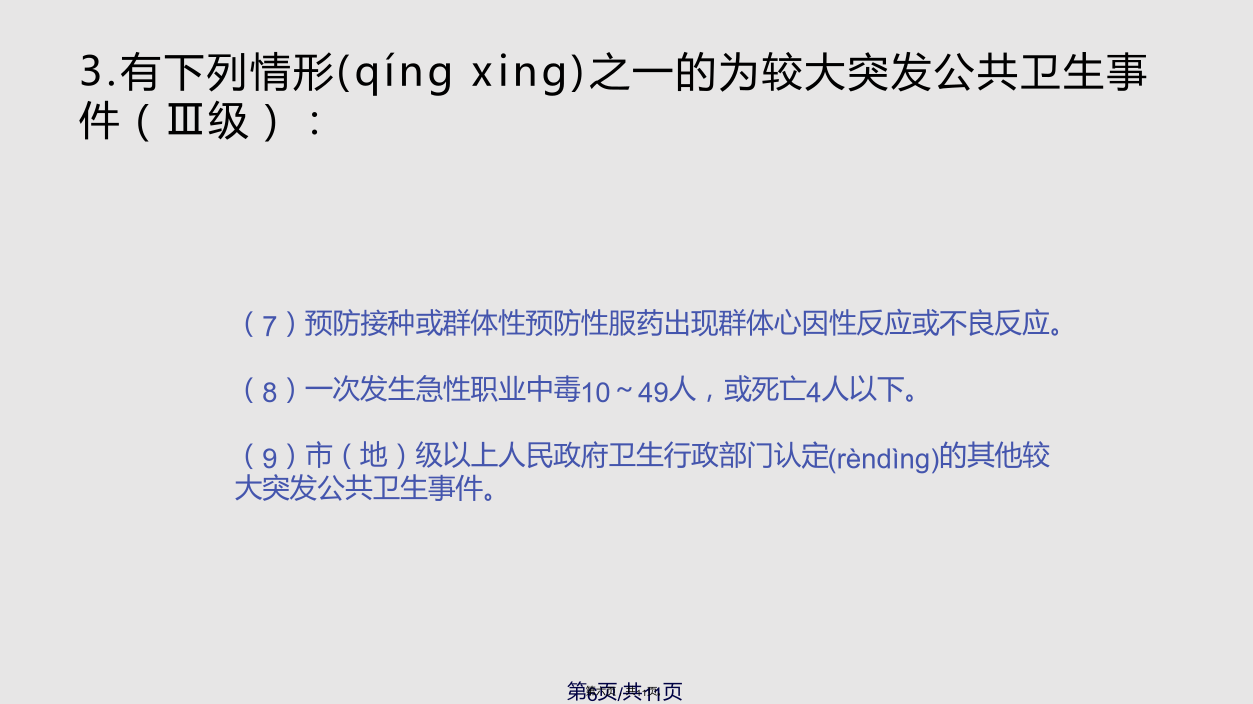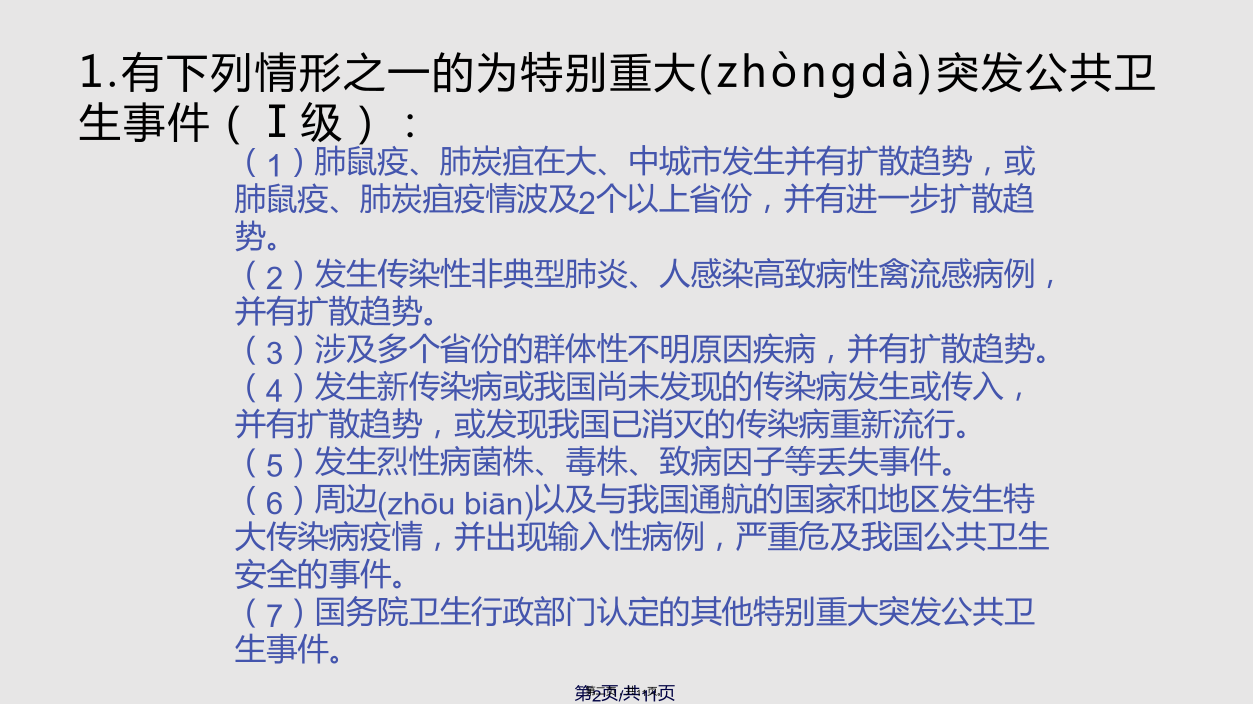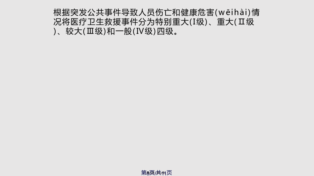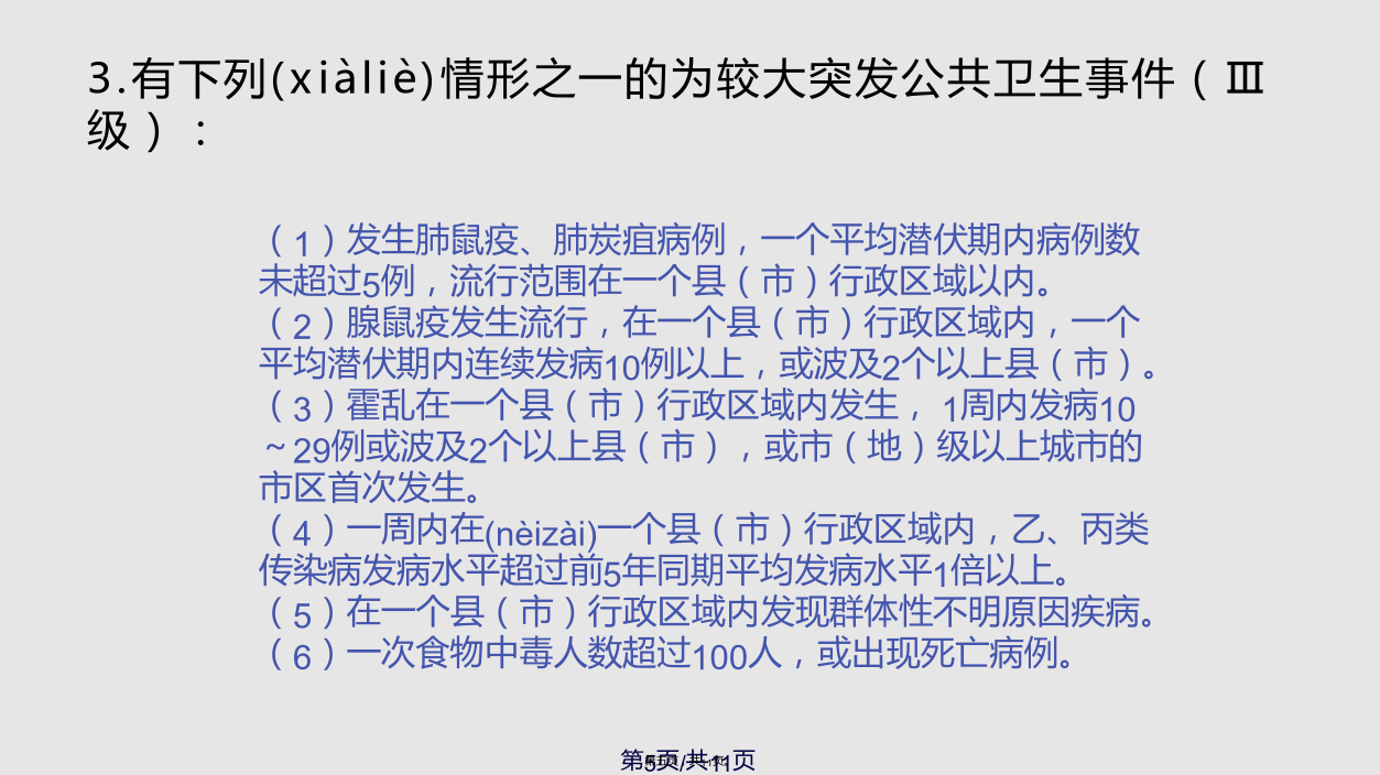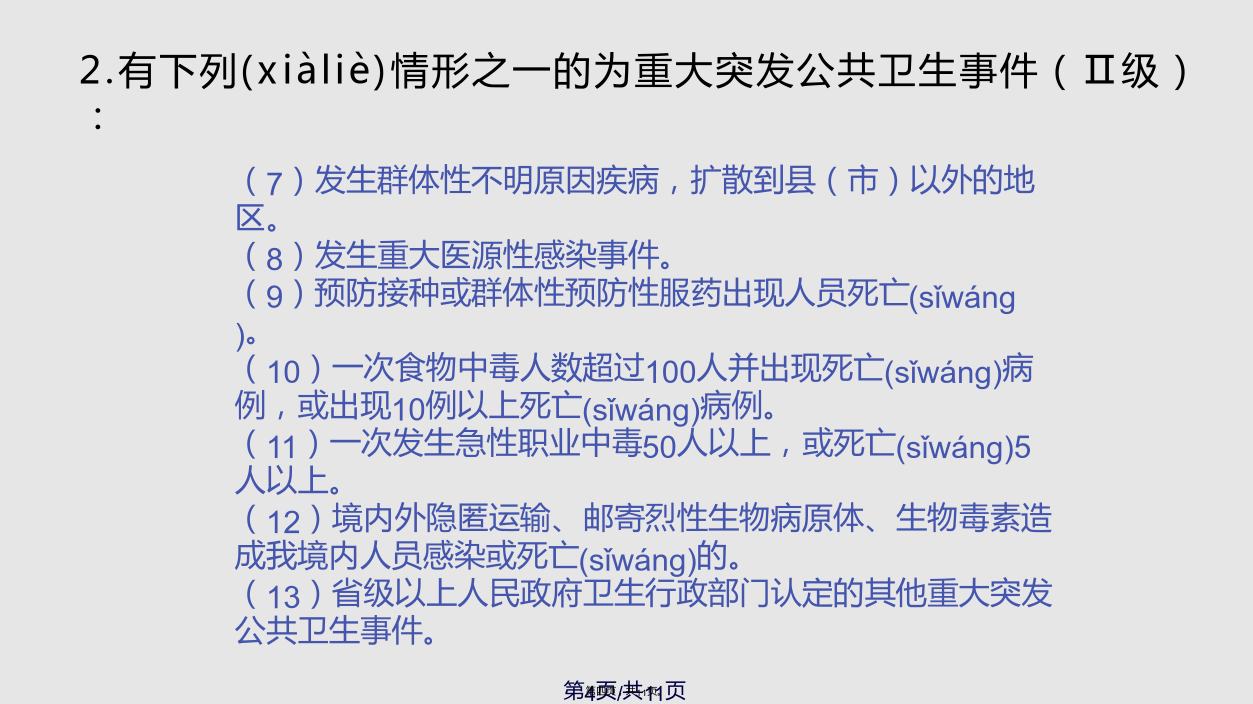 根据突发公共卫生事件性质、危害程度、涉及范围,突发公共卫生事件划分为特别(tèbié)重大(Ⅰ级)、重大(Ⅱ级)、较大(Ⅲ级)和一般(Ⅳ级)四级。1.有下列情形之一的为特别重大(zhòngdà)突发公共卫生事件(Ⅰ级):2.有下列情形之一的为重大(zhòngdà)突发公共卫生事件(Ⅱ级):2.有下列(xiàliè)情形之一的为重大突发公共卫生事件(Ⅱ级):3.有下列(xiàliè)情形之一的为较大突发公共卫生事件(Ⅲ级):3.有下列情形(qíngxing)之一的为较大突发公共卫生事件(Ⅲ级):4.有下列情形之一的为一般(yībān)突发公共卫生事件(Ⅳ级):根据突发公共事件导致人员伤亡和健康危害(wēihài)情况将医疗卫生救援事件分为特别重大(I级)、重大(Ⅱ级)、较大(Ⅲ级)和一般(Ⅳ级)四级。特别重大事件(I级):(1)一次事件伤亡100人以上,且危重人员多,或者核事故和突发放射事件、化学品泄漏事故导致大量人员伤亡,事件发生地省级人民政府或有关部门请求国家在医疗卫生救援工作上给予支持的突发公共事件。(2)跨省(区、市)的有特别严重人员伤亡的突发公共事件。(3)国务院及其有关部门确定的其他需要开展(kāizhǎn)医疗卫生救援工作的特别重大突发公共事件。重大事件(Ⅱ级):(1)一次事件伤亡50人以上、99人以下,其中,死亡和危重病例超过5例的突发公共事件。(2)跨市(地)的有严重人员伤亡的突发公共事件。(3)省级人民政府及其有关部门确定的其他需要开展(kāizhǎn)医疗卫生救援工作的重大突发公共事件。较大事件(Ⅲ级):(1)一次事件伤亡30人以上、49人以下,其中,死亡和危重病例超过3例的突发公共事件。(2)市(地)级人民政府及其有关(yǒuguān)部门确定的其他需要开展医疗卫生救援工作的较大突发公共事件。一般事件(Ⅳ级):(1)一次事件伤亡10人以上、29人以下,其中,死亡和危重病例超过1例的突发公共事件。(2)县级人民政府及其有关(yǒuguān)部门确定的其他需要开展医疗卫生救援工作的一般突发公共事件。感谢您的观看(guānkàn)!