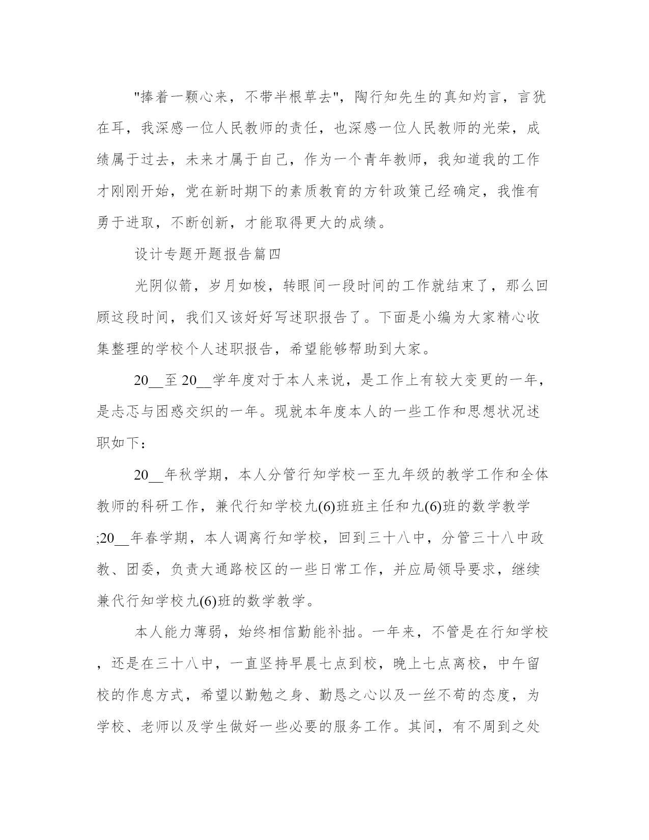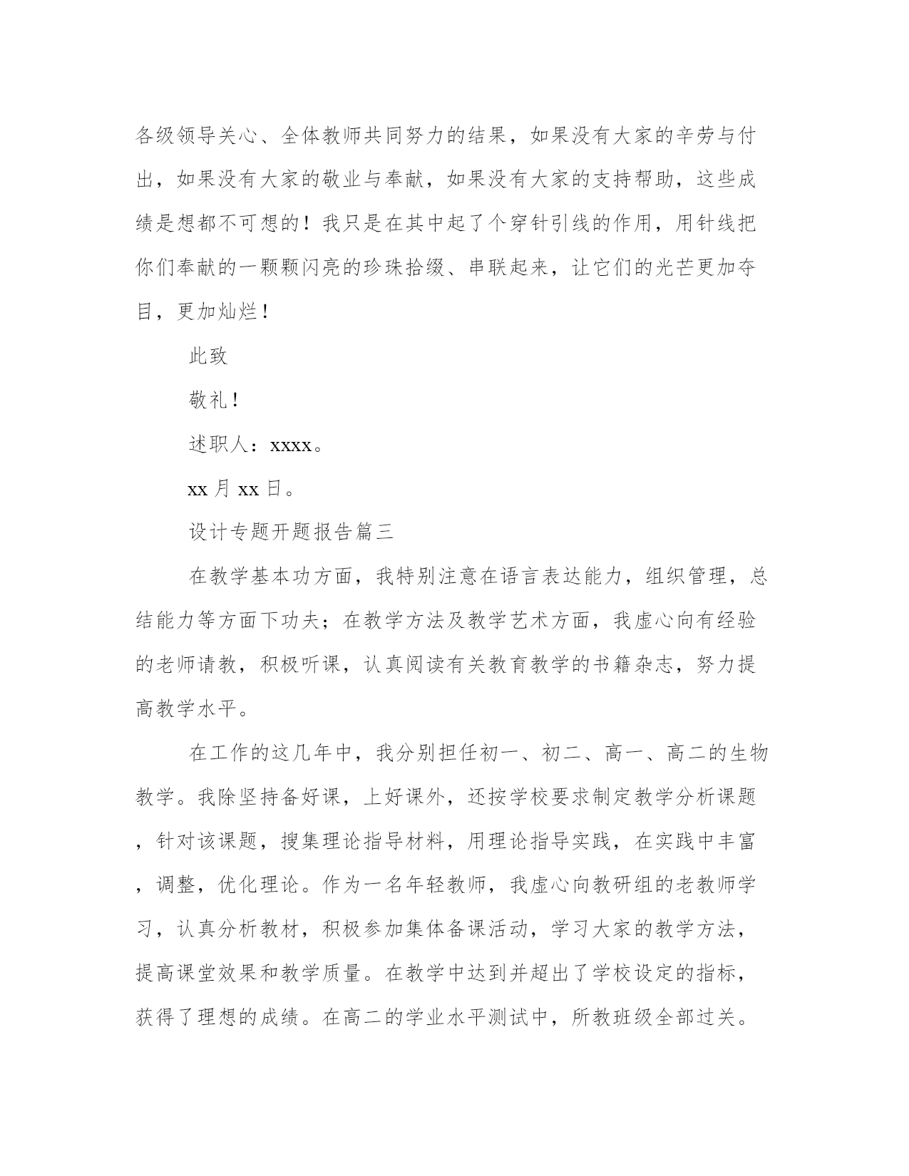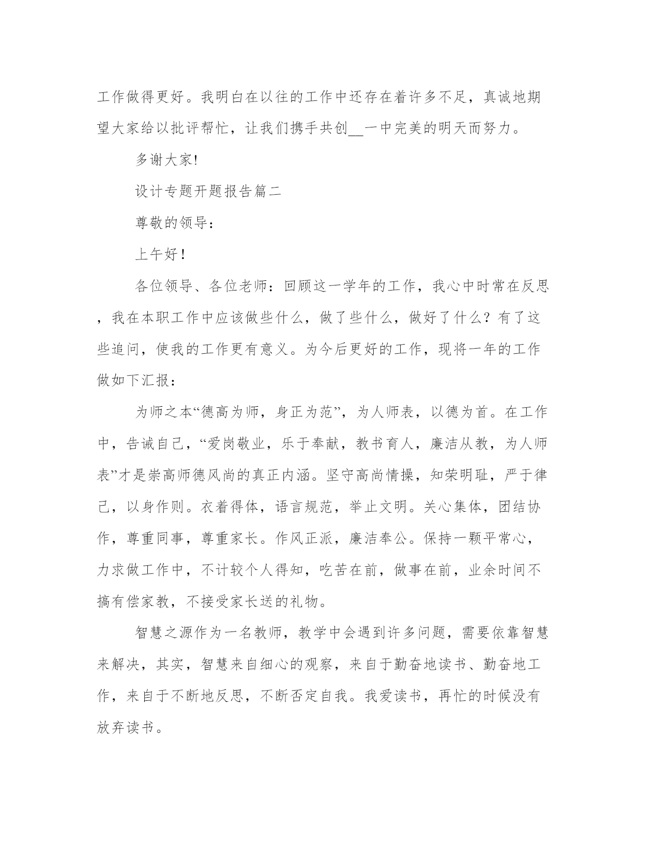 最新设计专题开题报告(优秀16篇)报告需要注意语言简练、准确,避免使用过多的专业术语,以便读者理解。在写报告之前,首先需要明确报告的目的和受众,以便根据实际需要选择合适的信息和呈现方式。如果你正在考虑撰写一份高质量的报告,请仔细阅读以下范文,以便更好地了解报告的写作规范和标准。设计专题开题报告篇一各位领导、全体教职工同志们:首先借此机会向学校领导和全体教职工对我工作的一贯支持和帮忙表示衷心的感激。20__学年度即将过去,作为学校总务副主任和学校安全管理代表。在学校党总支和校长室的领导下,工作中本人努力做到摸实情、说实话、干实事、求实效、工作到位不越位、恪尽职守、塌实做事,清正廉洁。能服从学校的统一安排并根据总务工作的特点,经常放弃休息到校工作。现就我本学年的工作向大家汇报如下:一、坚持学习,努力提高后勤管理水平。提高理论水平是做好工作的基础,平时注重把学习摆到重要位置,学习相关法律法规,关心时事政治,进取参加学校党总支组织的各类学习考察活动,努力提高自我的业务素养。二、认真履职,努力做好后勤保障工作。作为总务副主任能认真履行职责,身体力行,进取配合总务主任做好后勤各条线的管理工作。在学校党总支、校长室的领导下,紧紧围绕学校“规划”的实施和总务处工作计划以及教育教学工作的需要,带领全体后勤人员较好地完成了各项常规工作。同时,我们在队伍管理上以抓制度落实、抓岗位职责为原则。提倡团队协作精神,奉献精神,树立全心全意为教育教学服务和服务育人的思想。总务各部门在做好本职工作的同时进取配合完成了学校开展的各项大型活动如:各类教学展示活动、国家级考试试区、区教育局在我校召开的各类会议等活动的筹备和布置工作。强化国资管理是学校后勤管理工作中的一个重要方面,我们坚持每年一次财产清理,及时做好报损报废工作,做到帐物相符,学校资产管理工作被评为__区教育系统先进单位。在学校工程维修及设备配套工作中进取配合总务主任工作,根据财政预算项目和学校工作特点,努力抓住时间接点合理安排,到14年底相继完成了车辆更新、教师及学生宿舍(包括新疆班学生宿舍)空调器的更新、实验室装修工程、实验室仪器设备的采购、专用教室及心理咨询室的装修工程、专用教室设备采购、运动场维修工程、科技馆装修工程等的采购、验收和审计请款工作。15年财政预算项目目前已经在安计划实施,其中视频监控更新项目已经完成招投标工作,争取在暑期中完成。为学校教育教学工作的有序开展供给了后勤保障。三、学校安全工作。学校安全工作关系到社会的稳定,关系到学校教育教学工作能否正常开展,它的职责重于泰山,必须常抓不懈,警钟长鸣。我校作为__市寄宿制高级中学又是__区安全保卫重点单位,我深感职责重大。本学年度在区企保协会、区公安局内保科、菊园新区派出所、区教育局和学校领导的关心指导下主要做了以下工作。1、学校安全工作紧紧围绕学校安全这一主线,经过内保工作会议、互访等形式加强与上级主管部门和兄弟单位的联系交流,及时安排好节假日的行政值班和做好相关资料的整理,使得各项工作有序开展。2、配合学校安全职责制的实施,完成了学校内部安全工作三级职责签约。3、随着__地区汛期的到来,协助总务主任一齐提前布置并完成了对学校各建筑房顶下水道的清理疏通。4、作为区消防安全重点单位,结合新消防法的实施。在平时的工作中,认真贯彻有关文件精神,坚持以防为主、防消结合的原则,认真做好每月一次校内消防设备,疏散通道的安全检查,发现问题及时解决。及时做好台账记录和相关信息上传工作。四、德育工作。作为学校工作人员,不管处在那个工作岗位,人人都是德育工回顾过去,展望未来。新的工作任务在等待着我们。作为总务副主任只要在这个岗位一天,我都将尽自我所能,协助总务主任努力将工作做得更好。我明白在以往的工作中还存在着许多不足,真诚地期望大家给以批评帮忙,让我们携手共创__一中完美的明天而努力。多谢大家!设计专题开题报告篇二尊敬的领导:上午好!各位领导、各位老师:回顾这一学年的工作,我心中时常在反思,我在本职工作中应该做些什么,做了些什么,做好了什么?有了这些追问,使我的工作更有意义。为今后更好的工作,现将一年的工作做如下汇报:为师之本“德高为师,身正为范”,为人师表,以德为首。在工作中,告诫自己,“爱岗敬业,乐于奉献,教书育人,廉洁从教,为人师表”才是崇高师德风尚的真正内涵。坚守高尚情操,知荣明耻,严于律己,以身作则。衣着得体,语言规范,举止文明。关心集体,团结协作,尊重同事,尊重家长。作风正派,廉洁奉公。保持一颗平常心,力求做工作中,不计较个人得知,吃苦在前,做事在前,业余时间不搞有偿家教,不接受家长送的礼物。智慧之源作为一名教师,教学中会遇到许多问题,需要依靠智慧来解决,其实,智慧来自细心的观察,来自于