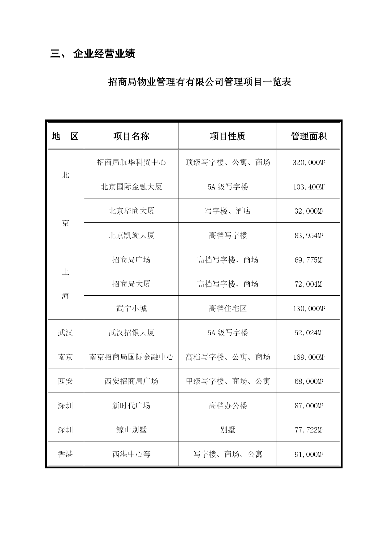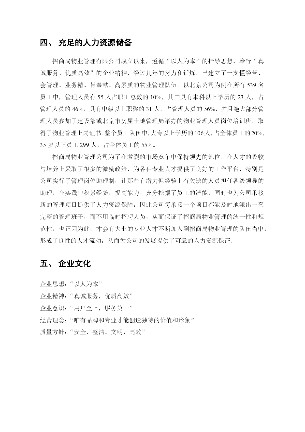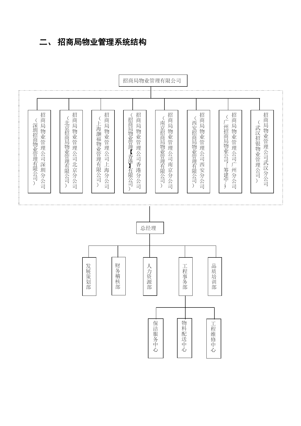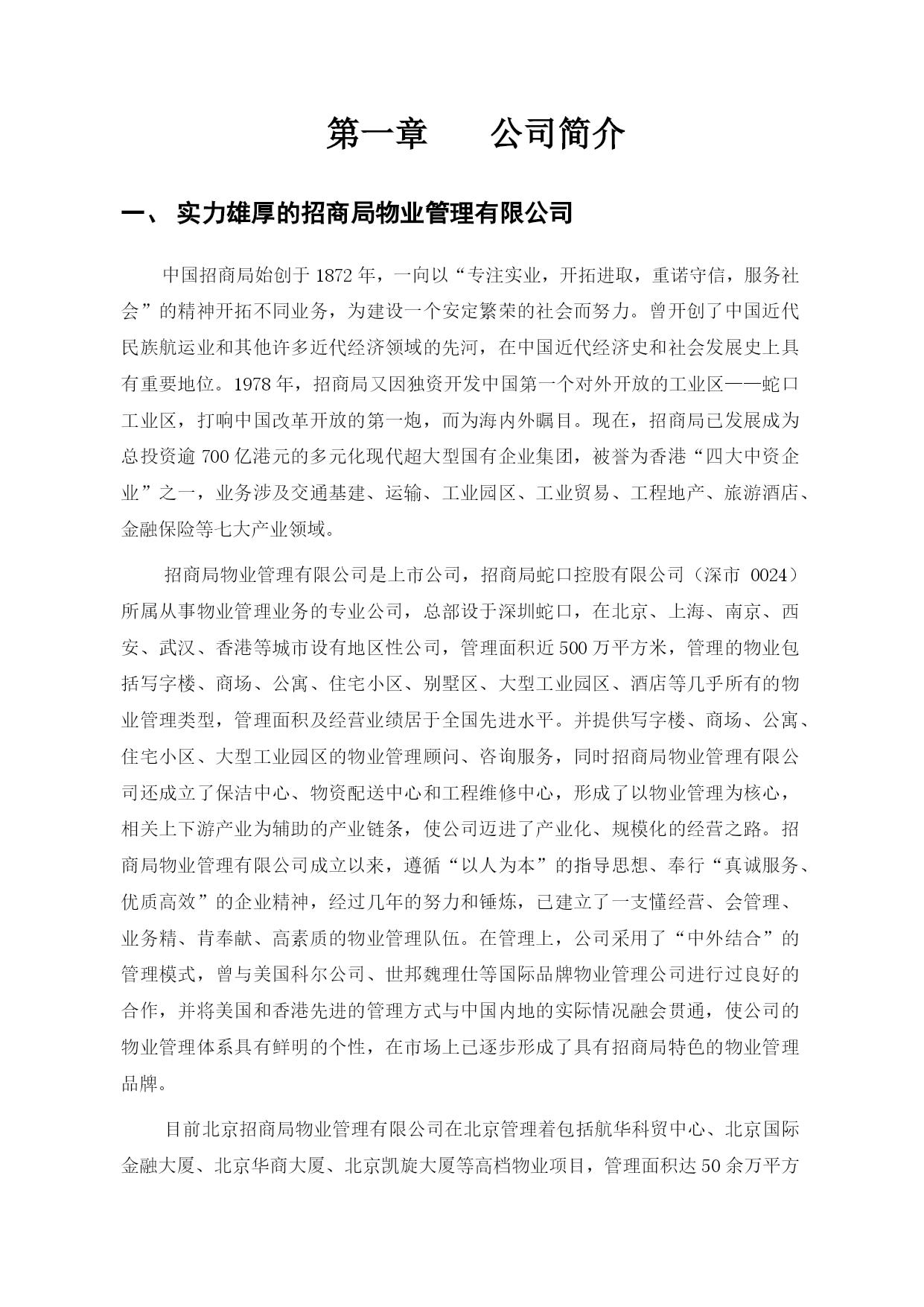 北京海关办公楼物业管理建议书(招商局)目录TOC\o"1-3"\h\zHYPERLINK\l"_Toc531342051"第一章公司简介PAGEREF_Toc531342051\h4HYPERLINK\l"_Toc531342052"一、实力雄厚的招商局物业管理有限公司PAGEREF_Toc531342052\h4HYPERLINK\l"_Toc531342053"二、招商局物业管理系统结构PAGEREF_Toc531342053\h6HYPERLINK\l"_Toc531342054"三、企业经营业绩PAGEREF_Toc531342054\h7HYPERLINK\l"_Toc531342055"四、充足的人力资源储备PAGEREF_Toc531342055\h8HYPERLINK\l"_Toc531342056"五、企业文化PAGEREF_Toc531342056\h8HYPERLINK\l"_Toc531342057"第二章北京海关办公楼物业管理服务的整体设想及策划PAGEREF_Toc531342057\h9HYPERLINK\l"_Toc531342058"一、北京海关办公楼基本情况PAGEREF_Toc531342058\h9HYPERLINK\l"_Toc531342059"二、物业管理服务的整体设想及策划PAGEREF_Toc531342059\h10HYPERLINK\l"_Toc531342060"(一)项目定位PAGEREF_Toc531342060\h10HYPERLINK\l"_Toc531342061"(二)管理思路PAGEREF_Toc531342061\h10HYPERLINK\l"_Toc531342062"(三)管理体制PAGEREF_Toc531342062\h11HYPERLINK\l"_Toc531342063"(四)管理机制PAGEREF_Toc531342063\h11HYPERLINK\l"_Toc531342064"(五)合理的收费,高标准服务PAGEREF_Toc531342064\h11HYPERLINK\l"_Toc531342065"(六)管理优势PAGEREF_Toc531342065\h11HYPERLINK\l"_Toc531342066"第三章管理服务承诺指标及采取措施PAGEREF_Toc531342066\h13HYPERLINK\l"_Toc531342067"一、管理服务承诺指标PAGEREF_Toc531342067\h13HYPERLINK\l"_Toc531342068"二、管理服务项目、承诺指标及采取措施一览表PAGEREF_Toc531342068\h14HYPERLINK\l"_Toc531342069"第四章物业管理的运行PAGEREF_Toc531342069\h30HYPERLINK\l"_Toc531342070"一、拟采取的管理方式PAGEREF_Toc531342070\h30HYPERLINK\l"_Toc531342071"(一)北京海关物业管理中心内部管理架构PAGEREF_Toc531342071\h30HYPERLINK\l"_Toc531342072"(二)北京海关物业管理中心运作机制PAGEREF_Toc531342072\h31HYPERLINK\l"_Toc531342073"二、管理人员的配备PAGEREF_Toc531342073\h33HYPERLINK\l"_Toc531342075"三、管理人员的培训与管理PAGEREF_Toc531342075\h34HYPERLINK\l"_Toc531342076"四、物资装备情况PAGEREF_Toc531342076\h42HYPERLINK\l"_Toc531342077"第五章管理费用预算PAGEREF_Toc531342077\h45HYPERLINK\l"_Toc531342078"一、管理费用预算表PAGEREF_Toc531342078\h45HYPERLINK\l"_Toc531342079"二、服务报价和物业管理费预算说明PAGEREF_Toc5313420