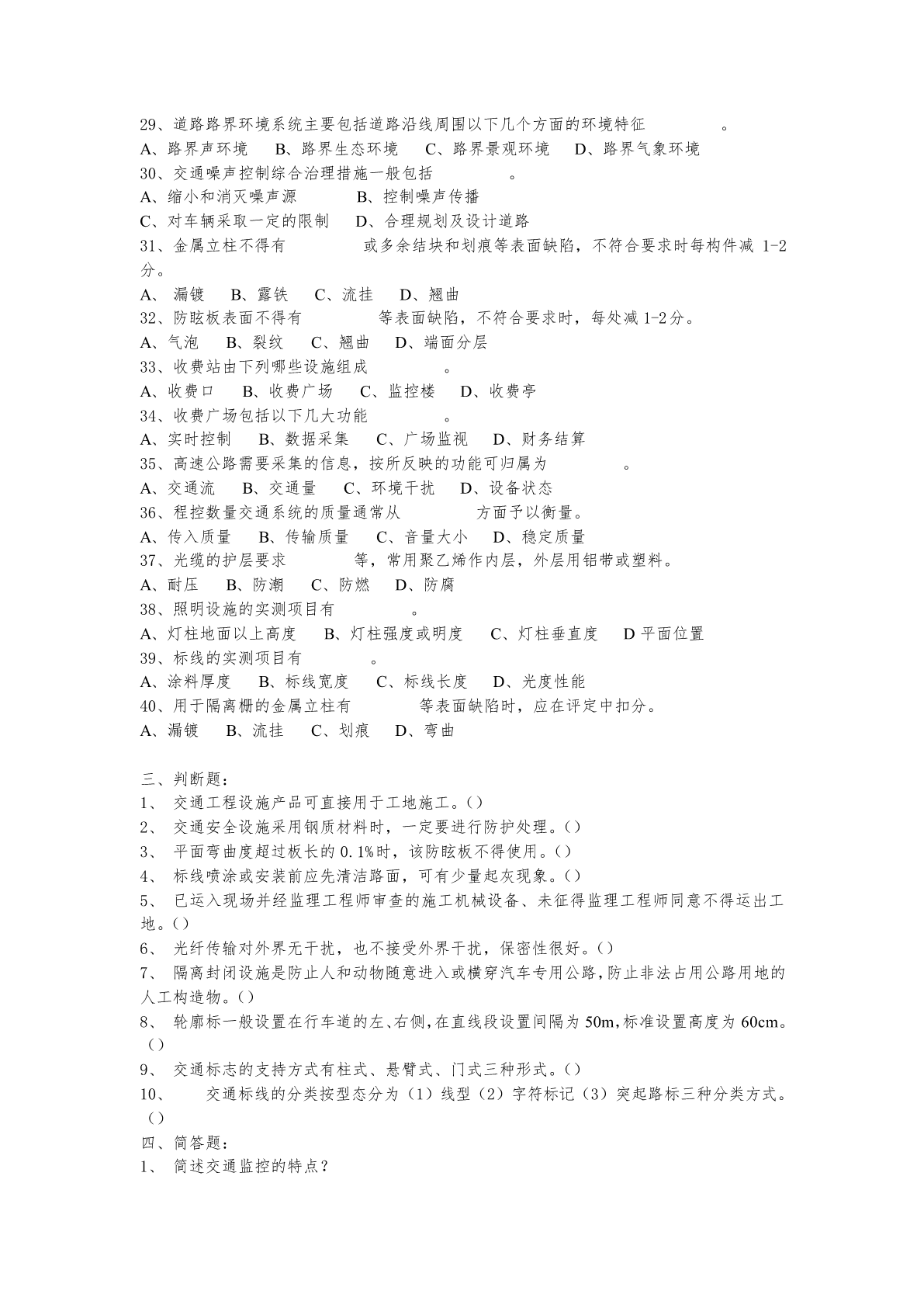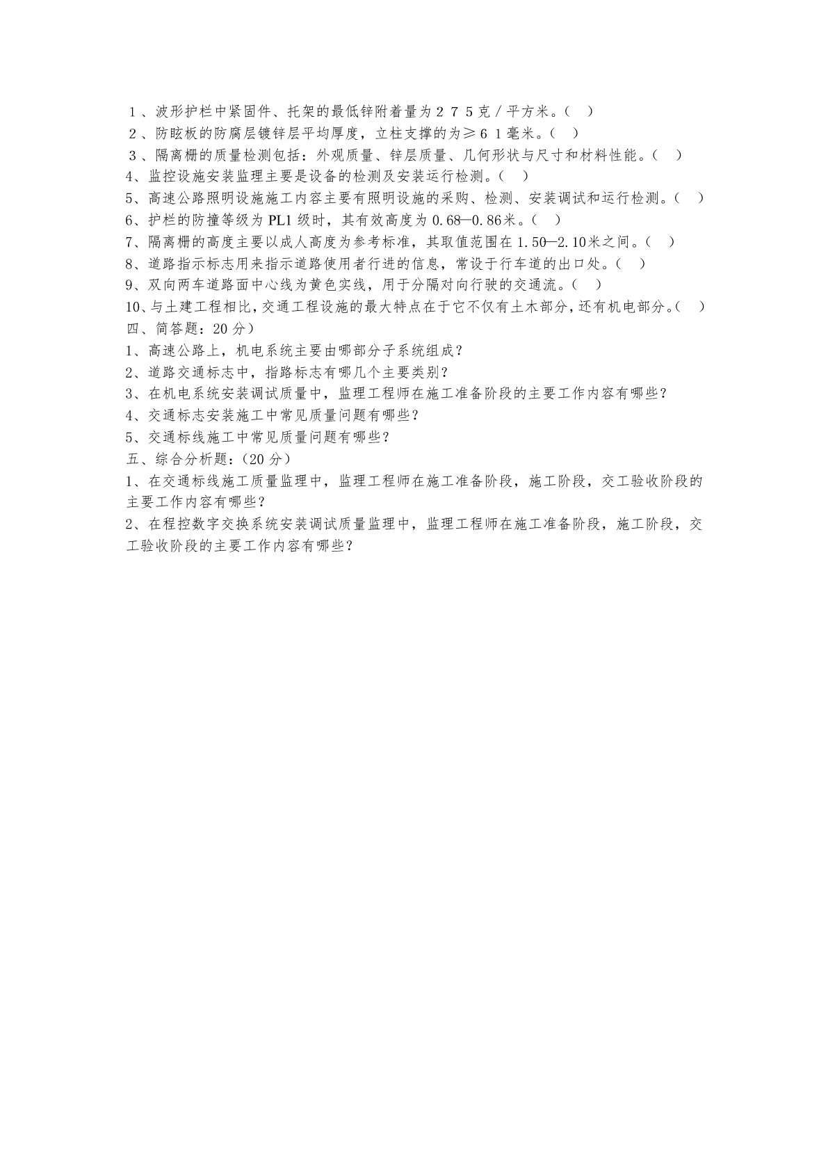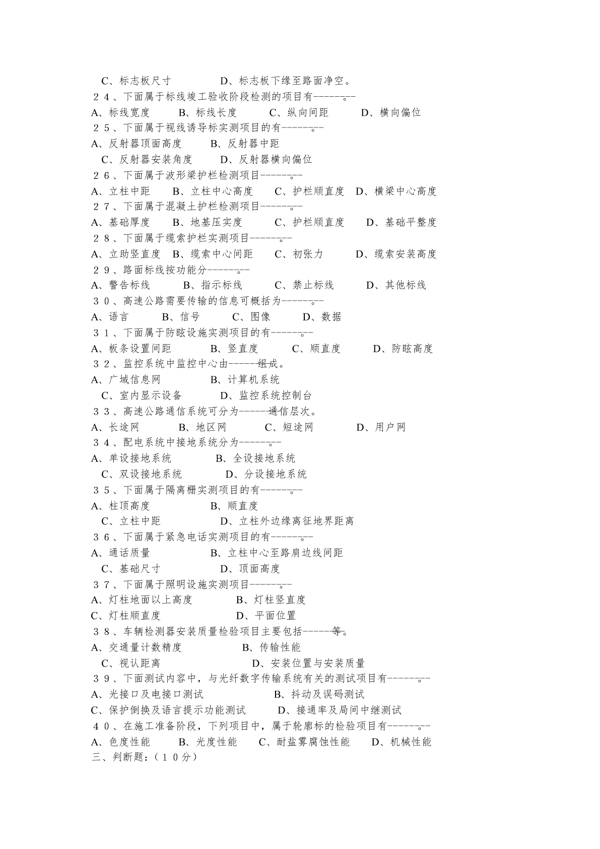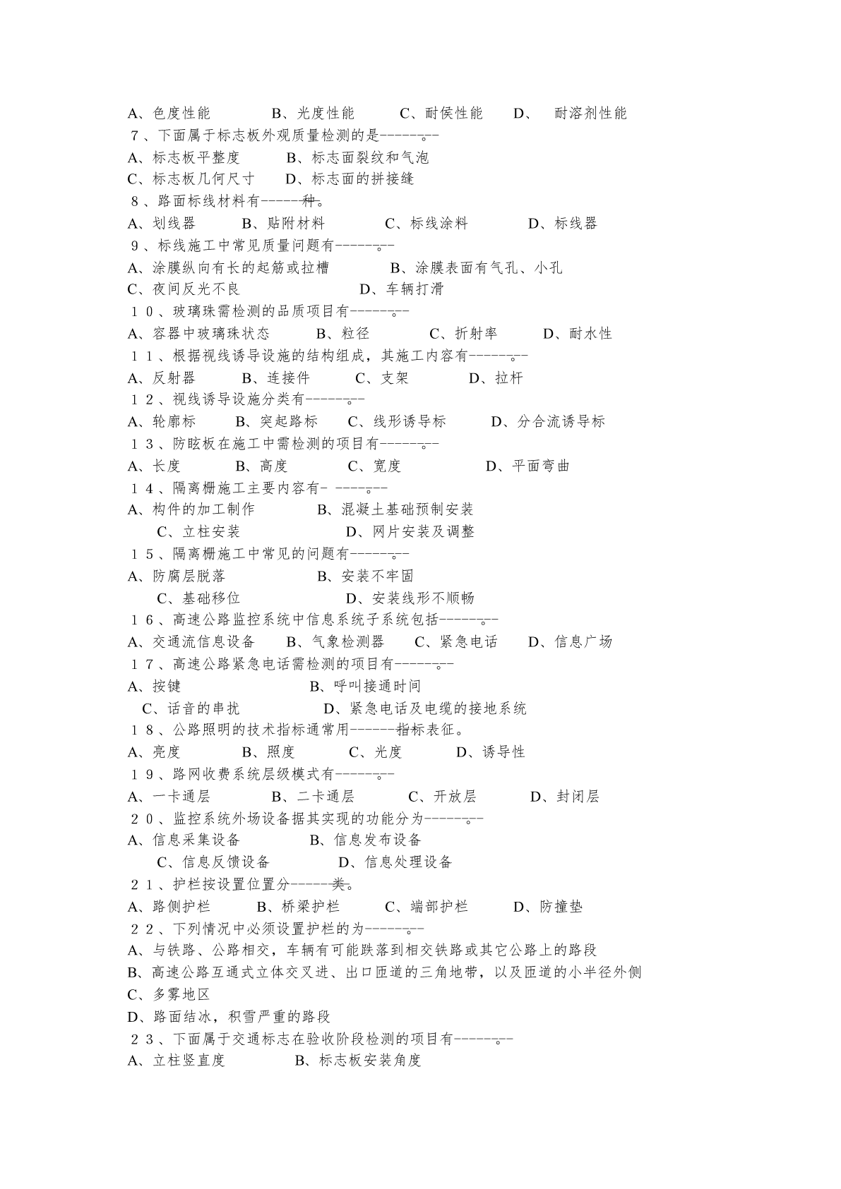 考试试题《交通工程》试题一、单选题:(10分)1、在同一地点设置两种以上标志时,可合装在一根立柱上,但最多不超过--------块。A、3B、4C、5D、62、为保证产品质量要求,应对护栏各部件进行抽样检查,不相同的部件各以--------件为一批进行取样。A、100B、200C、300D、4003、波形梁护栏板的镀锌量一般要求得大于--------克/平方米。A、425B、500C、600D、6504、反光膜按其最小逆反射系数值分为--------级,各种标志采用反光膜的级别应符合图纸的规定。A、二B、三C、四D、五5、除硅芯管外,管道工程铺设完成后,应按邮电部门的规定做--------检验,以保证管道的施工质量。A、试通B、拉棒C、牵引D、拉线6、护栏的最小设置长度,当设计行车速度为V=100公里/小时时,其长不小于--------米。A、28B、48C、60D、707、交通标志实测项目中标志板内侧距路肩边线距离允许偏差为--------。A、±80B、±60C、±100D、±1508、视线诱导标志实测项目中反射器安装角度允许偏差为--------。A、±3°B、±2°C、±1°D、±4°9、可变信息情报板按功能应属于--------。A、信息采集系统B、信息处理系统C、信息提供系统D、通信系统10、混凝土护栏实测项目中,基础厚度的允许偏差为--------。A、±10%HB、±5%HC、±8%HD、±15%H二、多选题:(至少有两个选择是正确的)(40分)1、标志面的逆反射材料分为--------。A、反光膜B、反光涂料C、反射器D、轮廓标2、路面标线涂料按施工温度可分为--------类。A、常温型B、加热型C、热熔型D、溶剂型3、高速公路监控系统由--------构成。A、信息采集系统B、信息提供系统C、通信系统D、监控中心4、波形梁护栏的所有部件一般采用热浸镀锌进行金属表面处理,其检测指标有--------。A、镀锌层附着量B、镀锌均匀性C、镀锌层耐腐性D、镀锌层附着性5、道路标线的颜色为--------。A、红色B、白色C、黄色D、绿色6、下面属于标志面应具有的性能的是--------。A、色度性能B、光度性能C、耐侯性能D、耐溶剂性能7、下面属于标志板外观质量检测的是--------。A、标志板平整度B、标志面裂纹和气泡C、标志板几何尺寸D、标志面的拼接缝8、路面标线材料有--------种。A、划线器B、贴附材料C、标线涂料D、标线器9、标线施工中常见质量问题有--------。A、涂膜纵向有长的起筋或拉槽B、涂膜表面有气孔、小孔C、夜间反光不良D、车辆打滑10、玻璃珠需检测的品质项目有--------。A、容器中玻璃珠状态B、粒径C、折射率D、耐水性11、根据视线诱导设施的结构组成,其施工内容有--------。A、反射器B、连接件C、支架D、拉杆12、视线诱导设施分类有--------。A、轮廓标B、突起路标C、线形诱导标D、分合流诱导标13、防眩板在施工中需检测的项目有--------。A、长度B、高度C、宽度D、平面弯曲14、隔离栅施工主要内容有--------。A、构件的加工制作B、混凝土基础预制安装C、立柱安装D、网片安装及调整15、隔离栅施工中常见的问题有--------。A、防腐层脱落B、安装不牢固C、基础移位D、安装线形不顺畅16、高速公路监控系统中信息系统子系统包括--------。A、交通流信息设备B、气象检测器C、紧急电话D、信息广场17、高速公路紧急电话需检测的项目有--------。A、按键B、呼叫接通时间C、话音的串扰D、紧急电话及电缆的接地系统18、公路照明的技术指标通常用---------指标表征。A、亮度B、照度C、光度D、诱导性19、路网收费系统层级模式有--------。A、一卡通层B、二卡通层C、开放层D、封闭层20、监控系统外场设备据其实现的功能分为--------。A、信息采集设备B、信息发布设备C、信息反馈设备D、信息处理设备21、护栏按设置位置分--------类。A、路侧护栏B、桥梁护栏C、端部护栏D、防撞垫22、下列情况中必须设置护栏的为--------。A、与铁路、公路相交,车辆有可能跌落到相交铁路或其它公路上的路段B、高速公路互通式立体交叉进、出口匝道的三角地带,以及匝道的小半径外侧C、多雾地区D、路面结冰,积雪严重的路段23、下面属于交通标志在验收阶段检测的项目有--------。A、立柱竖直度B、标志板安装角度C、标志板尺寸D、标志板下缘至路面净空。24、下面属于标线竣