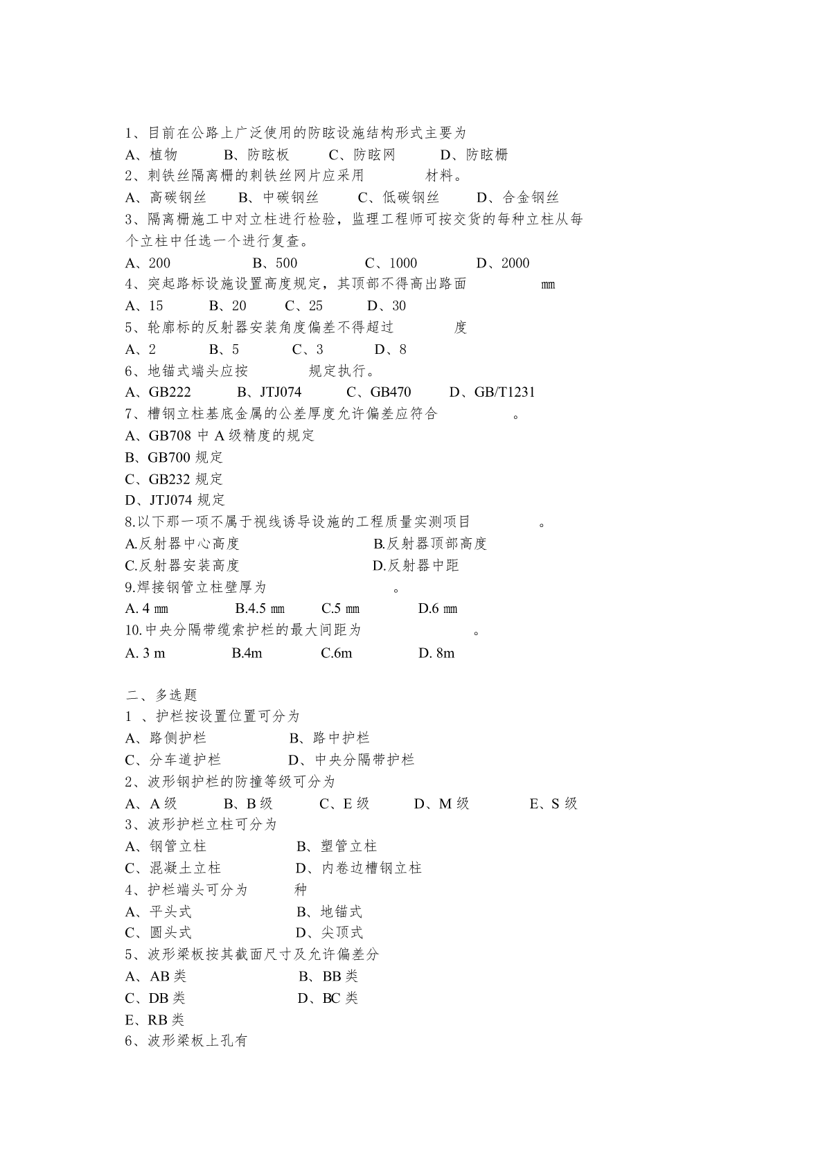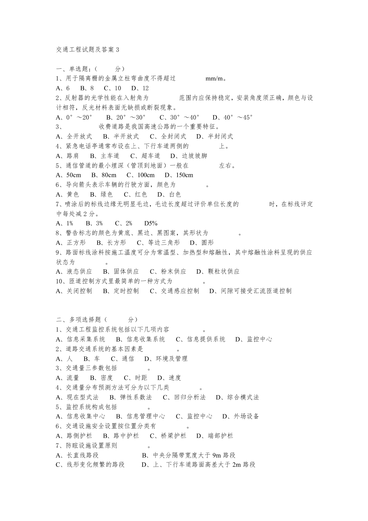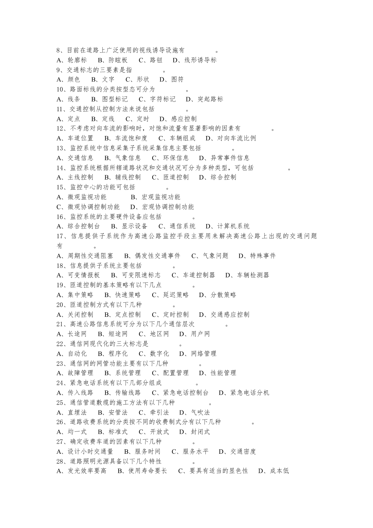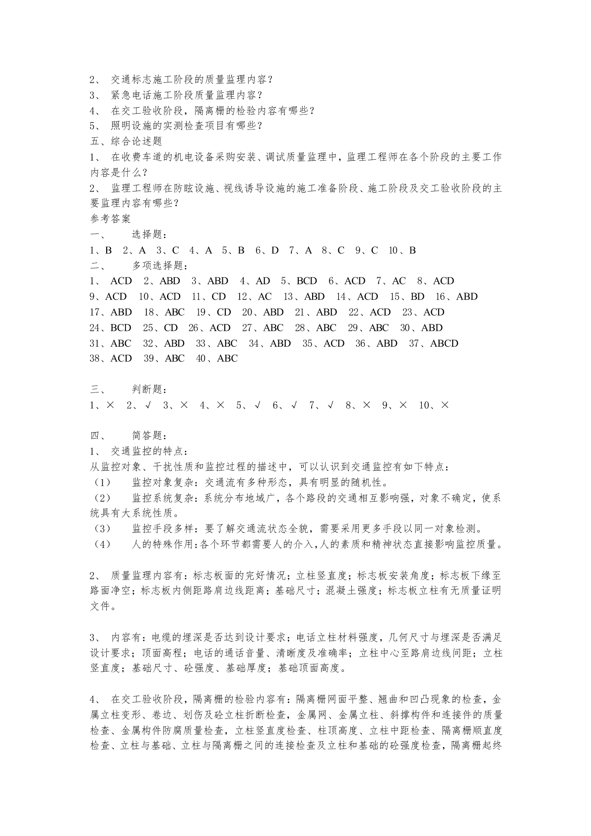 考试试题《交通工程》试题一、单选题:(10分)1、在同一地点设置两种以上标志时,可合装在一根立柱上,但最多不超过--------块。A、3B、4C、5D、62、为保证产品质量要求,应对护栏各部件进行抽样检查,不相同的部件各以--------件为一批进行取样。A、100B、200C、300D、4003、波形梁护栏板的镀锌量一般要求得大于--------克/平方米。A、425B、500C、600D、6504、反光膜按其最小逆反射系数值分为--------级,各种标志采用反光膜的级别应符合图纸的规定。A、二B、三C、四D、五5、除硅芯管外,管道工程铺设完成后,应按邮电部门的规定做--------检验,以保证管道的施工质量。A、试通B、拉棒C、牵引D、拉线6、护栏的最小设置长度,当设计行车速度为V=100公里/小时时,其长不小于--------米。A、28B、48C、60D、707、交通标志实测项目中标志板内侧距路肩边线距离允许偏差为--------。A、±80B、±60C、±100D、±1508、视线诱导标志实测项目中反射器安装角度允许偏差为--------。A、±3°B、±2°C、±1°D、±4°9、可变信息情报板按功能应属于--------。A、信息采集系统B、信息处理系统C、信息提供系统D、通信系统10、混凝土护栏实测项目中,基础厚度的允许偏差为--------。A、±10%HB、±5%HC、±8%HD、±15%H二、多选题:(至少有两个选择是正确的)(40分)1、标志面的逆反射材料分为--------。A、反光膜B、反光涂料C、反射器D、轮廓标2、路面标线涂料按施工温度可分为--------类。A、常温型B、加热型C、热熔型D、溶剂型3、高速公路监控系统由--------构成。A、信息采集系统B、信息提供系统C、通信系统D、监控中心4、波形梁护栏的所有部件一般采用热浸镀锌进行金属表面处理,其检测指标有--------。A、镀锌层附着量B、镀锌均匀性C、镀锌层耐腐性D、镀锌层附着性5、道路标线的颜色为--------。A、红色B、白色C、黄色D、绿色6、下面属于标志面应具有的性能的是--------。A、色度性能B、光度性能C、耐侯性能D、耐溶剂性能7、下面属于标志板外观质量检测的是--------。A、标志板平整度B、标志面裂纹和气泡C、标志板几何尺寸D、标志面的拼接缝8、路面标线材料有--------种。A、划线器B、贴附材料C、标线涂料D、标线器9、标线施工中常见质量问题有--------。A、涂膜纵向有长的起筋或拉槽B、涂膜表面有气孔、小孔C、夜间反光不良D、车辆打滑10、玻璃珠需检测的品质项目有--------。A、容器中玻璃珠状态B、粒径C、折射率D、耐水性11、根据视线诱导设施的结构组成,其施工内容有--------。A、反射器B、连接件C、支架D、拉杆12、视线诱导设施分类有--------。A、轮廓标B、突起路标C、线形诱导标D、分合流诱导标13、防眩板在施工中需检测的项目有--------。A、长度B、高度C、宽度D、平面弯曲14、隔离栅施工主要内容有--------。A、构件的加工制作B、混凝土基础预制安装C、立柱安装D、网片安装及调整15、隔离栅施工中常见的问题有--------。A、防腐层脱落B、安装不牢固C、基础移位D、安装线形不顺畅16、高速公路监控系统中信息系统子系统包括--------。A、交通流信息设备B、气象检测器C、紧急电话D、信息广场17、高速公路紧急电话需检测的项目有--------。A、按键B、呼叫接通时间C、话音的串扰D、紧急电话及电缆的接地系统18、公路照明的技术指标通常用---------指标表征。A、亮度B、照度C、光度D、诱导性19、路网收费系统层级模式有--------。A、一卡通层B、二卡通层C、开放层D、封闭层20、监控系统外场设备据其实现的功能分为--------。A、信息采集设备B、信息发布设备C、信息反馈设备D、信息处理设备21、护栏按设置位置分--------类。A、路侧护栏B、桥梁护栏C、端部护栏D、防撞垫22、下列情况中必须设置护栏的为--------。A、与铁路、公路相交,车辆有可能跌落到相交铁路或其它公路上的路段B、高速公路互通式立体交叉进、出口匝道的三角地带,以及匝道的小半径外侧C、多雾地区D、路面结冰,积雪严重的路段23、下面属于交通标志在验收阶段检测的项目有--------。A、立柱竖直度B、标志板安装角度C、标志板尺寸D、标志板下缘至路面净空。24、下面属于标线竣