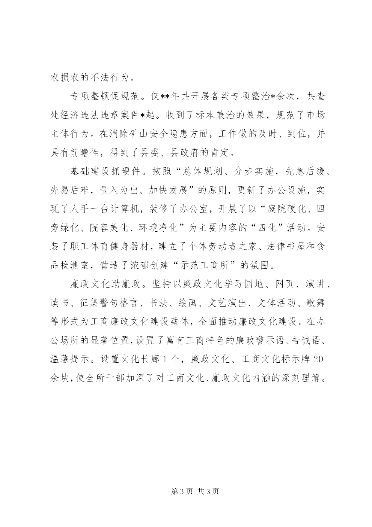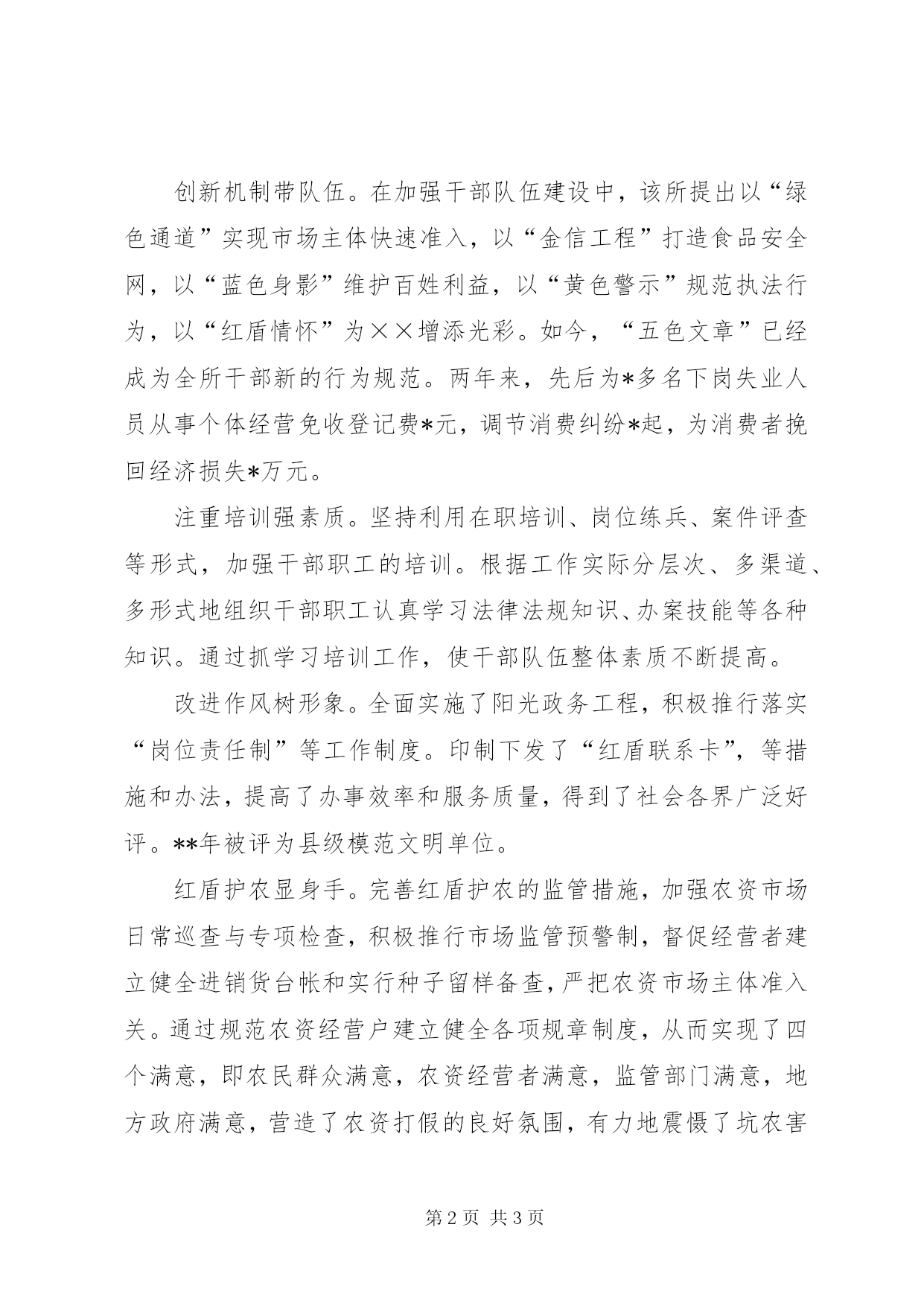 第PAGE\*Arabic\*MERGEFORMAT3页共NUMPAGES\*MERGEFORMAT3页创建示范工商所工作方案编者按:本文主要从创新机制带队伍;注重培训强素质;改进作风树形象;红盾护农显身手;专项整顿促规范;基础建设抓硬件;廉政文化助廉政进行讲述。其中,主要包括:提出以“绿色通道”实现市场主体快速准入,以“金信工程”打造食品安全网,以“蓝色身影”维护百姓利益,以“黄色警示”规范执法行为、坚持利用在职培训、岗位练兵、案件评查等形式,加强干部职工的培训、全面实施了阳光政务工程,积极推行落实“岗位责任制”等工作制度、完善红盾护农的监管措施,加强农资市场日常巡查与专项检查,积极推行市场监管预警制、在消除矿山安全隐患方面,工作做的及时、到位,并具有前瞻性,得到了县委、县政府的肯定、更新了办公设施,实现了人手一台计算机,装修了办公室,开展了以“庭院硬化、四旁绿化、院容美化、环境净化”为主要内容的“四化”活动、坚持以廉政文化学习园地、网页、演讲、读书、征集警句格言、书法、绘画、文艺演出、文体活动、歌舞等形式为工商廉政文化建设载体,全面推动廉政文化建设等,具体材料请详见:近年来,××县工商局××工商所不断加强自身队伍建设,加强基层基础建设,充分发挥工商行政管理职能作用,团结一致,开拓进取,各项工作取得了显著的成绩,为创建“示范工商所”奠定了良好基矗主要做法如下:创新机制带队伍。在加强干部队伍建设中,该所提出以“绿色通道”实现市场主体快速准入,以“金信工程”打造食品安全网,以“蓝色身影”维护百姓利益,以“黄色警示”规范执法行为,以“红盾情怀”为××增添光彩。如今,“五色文章”已经成为全所干部新的行为规范。两年来,先后为*多名下岗失业人员从事个体经营免收登记费*元,调节消费纠纷*起,为消费者挽回经济损失*万元。注重培训强素质。坚持利用在职培训、岗位练兵、案件评查等形式,加强干部职工的培训。根据工作实际分层次、多渠道、多形式地组织干部职工认真学习法律法规知识、办案技能等各种知识。通过抓学习培训工作,使干部队伍整体素质不断提高。改进作风树形象。全面实施了阳光政务工程,积极推行落实“岗位责任制”等工作制度。印制下发了“红盾联系卡”,等措施和办法,提高了办事效率和服务质量,得到了社会各界广泛好评。**年被评为县级模范文明单位。红盾护农显身手。完善红盾护农的监管措施,加强农资市场日常巡查与专项检查,积极推行市场监管预警制,督促经营者建立健全进销货台帐和实行种子留样备查,严把农资市场主体准入关。通过规范农资经营户建立健全各项规章制度,从而实现了四个满意,即农民群众满意,农资经营者满意,监管部门满意,地方政府满意,营造了农资打假的良好氛围,有力地震慑了坑农害农损农的不法行为。专项整顿促规范。仅**年共开展各类专项整治*余次,共查处经济违法违章案件*起。收到了标本兼治的效果,规范了市场主体行为。在消除矿山安全隐患方面,工作做的及时、到位,并具有前瞻性,得到了县委、县政府的肯定。基础建设抓硬件。按照“总体规划、分步实施,先急后缓、先易后难,量入为出、加快发展”的原则,更新了办公设施,实现了人手一台计算机,装修了办公室,开展了以“庭院硬化、四旁绿化、院容美化、环境净化”为主要内容的“四化”活动。安装了职工体育健身器材,建立了个体劳动者之家、法律书屋和食品检测室,营造了浓郁创建“示范工商所”的氛围。廉政文化助廉政。坚持以廉政文化学习园地、网页、演讲、读书、征集警句格言、书法、绘画、文艺演出、文体活动、歌舞等形式为工商廉政文化建设载体,全面推动廉政文化建设。在办公场所的显著位置,设置了富有工商特色的廉政警示语、告诫语、温馨提示。设置文化长廊1个,廉政文化、工商文化标示牌20余块,使全所干部加深了对工商文化、廉政文化内涵的深刻理解。