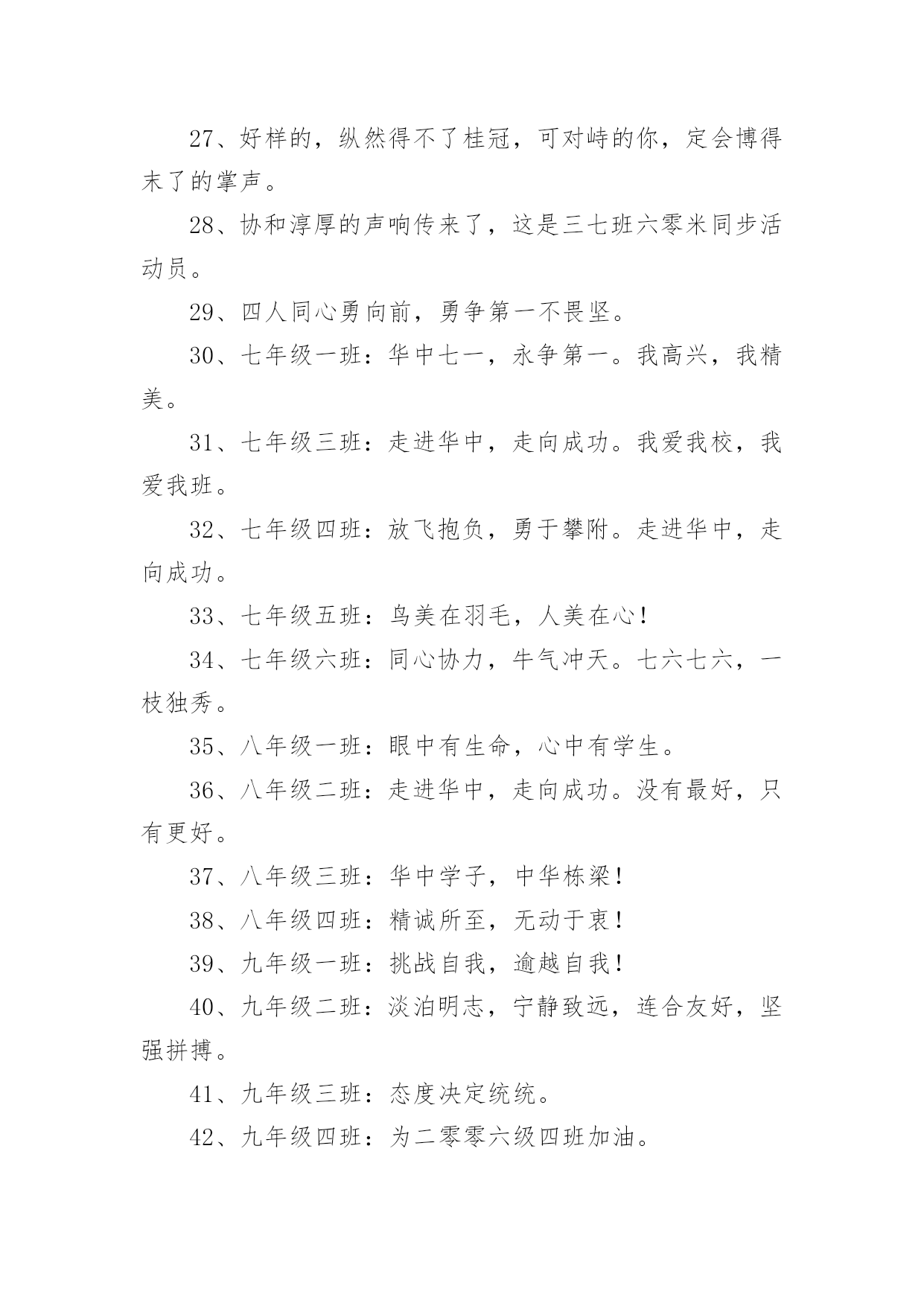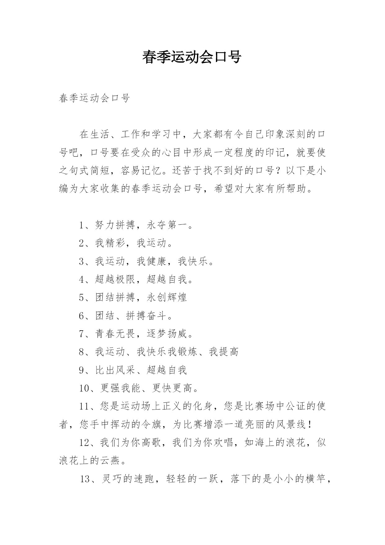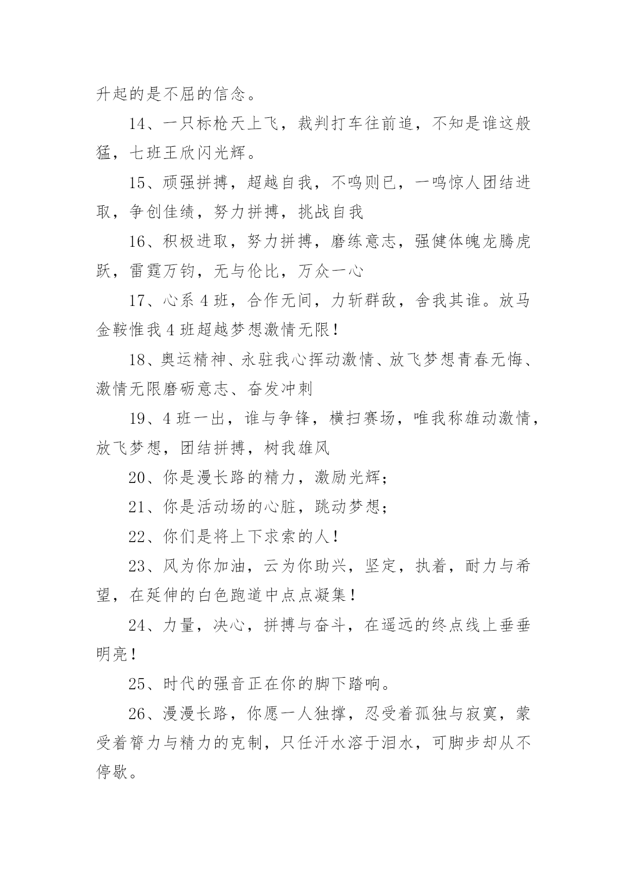 春季运动会口号春季运动会口号在生活、工作和学习中,大家都有令自己印象深刻的口号吧,口号要在受众的心目中形成一定程度的印记,就要使之句式简短,容易记忆。还苦于找不到好的口号?以下是小编为大家收集的春季运动会口号,希望对大家有所帮助。1、努力拼搏,永夺第一。2、我精彩,我运动。3、我运动,我健康,我快乐。4、超越极限,超越自我。5、团结拼搏,永创辉煌6、团结、拼搏奋斗。7、青春无畏,逐梦扬威。8、我运动、我快乐我锻炼、我提高9、比出风采、超越自我10、更强我能、更快更高。11、您是运动场上正义的化身,您是比赛场中公证的使者,您手中挥动的令旗,为比赛增添一道亮丽的风景线!12、我们为你高歌,我们为你欢唱,如海上的浪花,似浪花上的云燕。13、灵巧的速跑,轻轻的一跃,落下的是小小的横竿,升起的是不屈的信念。14、一只标枪天上飞,裁判打车往前追,不知是谁这般猛,七班王欣闪光辉。15、顽强拼搏,超越自我,不鸣则已,一鸣惊人团结进取,争创佳绩,努力拼搏,挑战自我16、积极进取,努力拼搏,磨练意志,强健体魄龙腾虎跃,雷霆万钧,无与伦比,万众一心17、心系4班,合作无间,力斩群敌,舍我其谁。放马金鞍惟我4班超越梦想激情无限!18、奥运精神、永驻我心挥动激情、放飞梦想青春无悔、激情无限磨砺意志、奋发冲刺19、4班一出,谁与争锋,横扫赛场,唯我称雄动激情,放飞梦想,团结拼搏,树我雄风20、你是漫长路的精力,激励光辉;21、你是活动场的心脏,跳动梦想;22、你们是将上下求索的人!23、风为你加油,云为你助兴,坚定,执着,耐力与希望,在延伸的白色跑道中点点凝集!24、力量,决心,拼搏与奋斗,在遥远的终点线上垂垂明亮!25、时代的强音正在你的脚下踏响。26、漫漫长路,你愿一人独撑,忍受着孤独与寂寞,蒙受着膂力与精力的克制,只任汗水溶于泪水,可脚步却从不停歇。27、好样的,纵然得不了桂冠,可对峙的你,定会博得末了的掌声。28、协和淳厚的声响传来了,这是三七班六零米同步活动员。29、四人同心勇向前,勇争第一不畏坚。30、七年级一班:华中七一,永争第一。我高兴,我精美。31、七年级三班:走进华中,走向成功。我爱我校,我爱我班。32、七年级四班:放飞抱负,勇于攀附。走进华中,走向成功。33、七年级五班:鸟美在羽毛,人美在心!34、七年级六班:同心协力,牛气冲天。七六七六,一枝独秀。35、八年级一班:眼中有生命,心中有学生。36、八年级二班:走进华中,走向成功。没有最好,只有更好。37、八年级三班:华中学子,中华栋梁!38、八年级四班:精诚所至,无动于衷!39、九年级一班:挑战自我,逾越自我!40、九年级二班:淡泊明志,宁静致远,连合友好,坚强拼搏。41、九年级三班:态度决定统统。42、九年级四班:为二零零六级四班加油。43、九年级五班:青春、生机、聪明、俏丽、帅气。