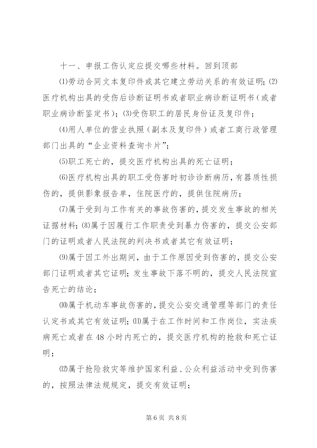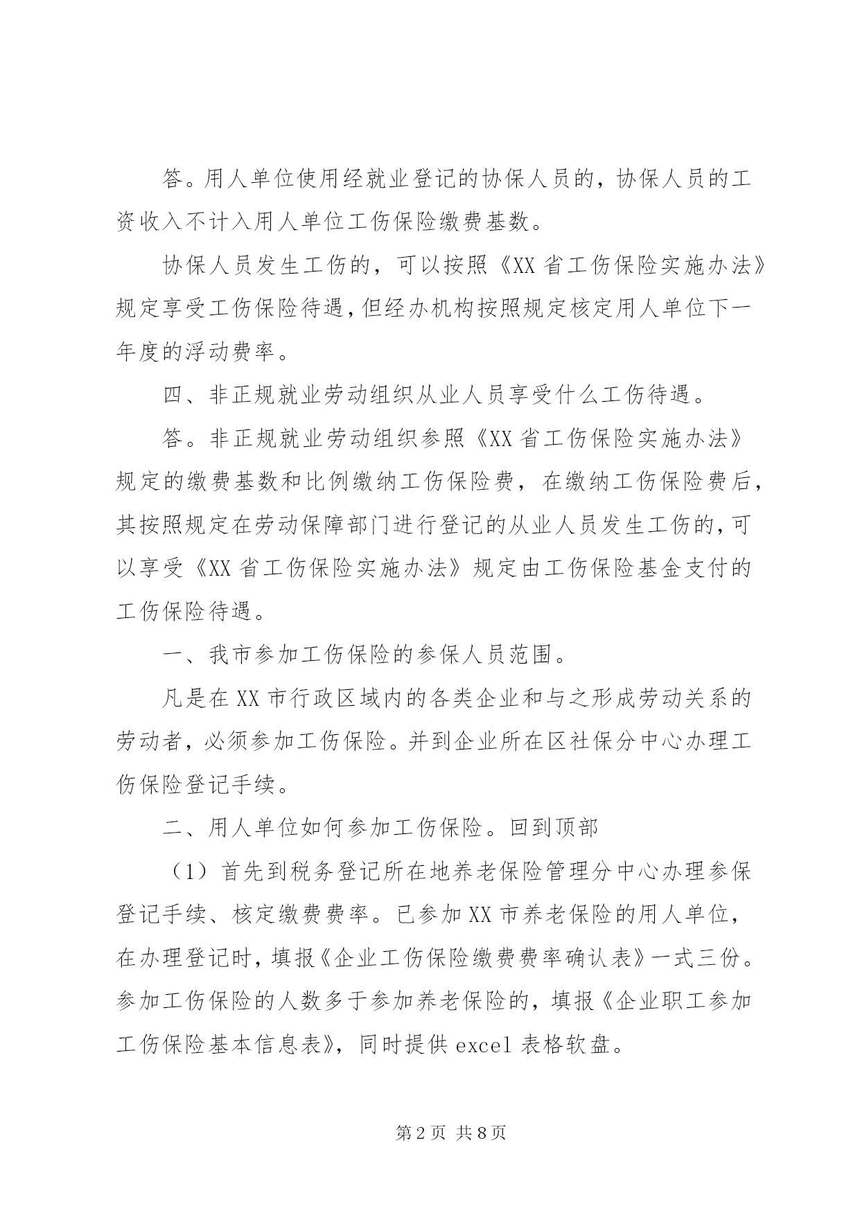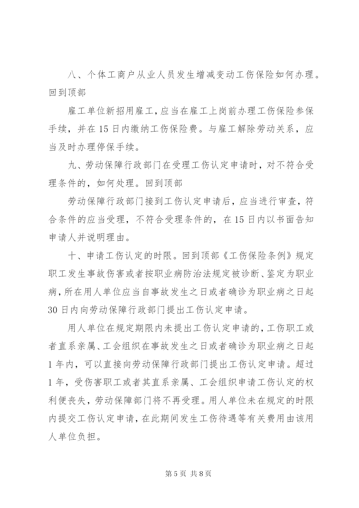 第PAGE\*Arabic\*MERGEFORMAT8页共NUMPAGES\*MERGEFORMAT8页工伤保险热点问答一、非全日制从业人员如何缴费。答。招用非全日制从业人员的用人单位应当将应缴纳的工伤保险费在劳动报酬中支付给个人,由其本人按照《XX省工伤保险实施办法》规定的工伤保险费缴费基数和费率自行缴费。二、非全日制从业人员享受哪些工伤待遇。答:非全日制从业人员因工作遭受事故伤害或者患职业病后,与用人单位的劳动关系按照《XX省劳动合同条例》的规定执行,享受下列工伤保险待遇:(一)按照《XX省工伤保险实施办法》规定由工伤保险基金支付的工伤保险待遇;(二)由承担工伤责任的用人单位参照《XX省工伤保险实施办法》规定支付停工留薪期待遇,并不得低于全市职工月最低工资标准;(三)致残一级至四级的,由承担工伤责任的用人单位和工伤人员以享受的伤残津贴为基数,一次性缴纳基本医疗保险费至工伤人员到达法定退休年龄,享受基本医疗保险待遇;(四)致残五级至十级的,由承担工伤责任的用人单位按照《XX省工伤保险实施办法》规定的标准支付一次性工伤医疗补助金和伤残就业补助金。三、协保人员享受什么工伤待遇。答。用人单位使用经就业登记的协保人员的,协保人员的工资收入不计入用人单位工伤保险缴费基数。协保人员发生工伤的,可以按照《XX省工伤保险实施办法》规定享受工伤保险待遇,但经办机构按照规定核定用人单位下一年度的浮动费率。四、非正规就业劳动组织从业人员享受什么工伤待遇。答。非正规就业劳动组织参照《XX省工伤保险实施办法》规定的缴费基数和比例缴纳工伤保险费,在缴纳工伤保险费后,其按照规定在劳动保障部门进行登记的从业人员发生工伤的,可以享受《XX省工伤保险实施办法》规定由工伤保险基金支付的工伤保险待遇。一、我市参加工伤保险的参保人员范围。凡是在XX市行政区域内的各类企业和与之形成劳动关系的劳动者,必须参加工伤保险。并到企业所在区社保分中心办理工伤保险登记手续。二、用人单位如何参加工伤保险。回到顶部(1)首先到税务登记所在地养老保险管理分中心办理参保登记手续、核定缴费费率。已参加XX市养老保险的用人单位,在办理登记时,填报《企业工伤保险缴费费率确认表》一式三份。参加工伤保险的人数多于参加养老保险的,填报《企业职工参加工伤保险基本信息表》,同时提供excel表格软盘。未参加XX市养老保险的用人单位,办理工伤保险登记时,填报《XX省社会保险登记表》、《企业职工参加工伤保险基本信息表》,同时提供excel表格软盘。还需提供以下证件:①营业执照、批准成立证件或其他核准执业证件;②组织机构统一代码证书;③税务登记证(行业企业还须提供医疗保险登记证、职工工资发放明细表和参加工伤保险职工基本信息)。(2)缴费费率核定按《关于工伤保险费率问题的通知》(劳动部发[2003]29号)行业分类所对应的费率执行。一类行业0.5%,二类行业1%,三类行业2%。(3)工伤保险登记后,用人单位持《工伤保险缴费费率确认表》到所在地税部门办理缴费手续。缴费数额为本单位职工工资总额乘以缴费费率之积。工伤保险费由用人单位缴纳,职工个人不缴费。(4)单位基本信息和职工基本信息发生变化,用人单位要在30日内到参保登记的工伤保险经办部门办理变更手续。受理时限。除节假日外每月1日至31日。三、个体工商户是否需要为员工参加工伤保险。回到顶部根据《关于有雇工个体工商户参加工伤保险问题的通知》(沈劳社发[2007]40号)规定:XX市行政区域内依法取得营业执照的有雇工的个体工商户(以下简称雇工单位),应按本办法为雇工缴纳工伤保险费。四、个体工商户为员工缴纳工伤保险费的基数和比例。回到顶部有雇工的个体工商户参加工伤保险,工伤保险费由雇工单位缴纳,雇工个人不缴费。缴纳工伤险费实行实名制,缴费基数为上月职工实发工资。个体工商户的缴费费率,由工伤保险经办机构按照《关于工伤保险费率问题的通知》(劳社部发[2003]29号),结合个体工商户的工商注册登记和主要生产经营业务确定。五、个体工商户是工如何办理参加工伤保险登记。回到顶部雇工单位参加工伤保险,要持营业执照、参保人员名册及参保人员身份证复印件到营业执照注册所在地的养老保险分中心办理参保登记及缴费费率核定。雇工单位的工伤保险费由养老保险分中心负责征收。六、个体工商户可以为哪些从业人员办理工伤保险。回到顶部根据(沈劳社发[2007]40号)规定。本办法所称雇工,是指在法定劳动年龄内,与雇工单位建立劳动关系或形成事实劳动关系的人员。七、哪些从业人员不能纳入个体工商户工伤保险范围。回到顶部个体工商户的雇工,已办理退休手续或已达到法定退休年龄、未满16周岁,不纳入工伤保险参保范围。八、个体工商户从业人员发生增减变动工伤保险如何办理。回到顶部雇工单位新招用雇工,
