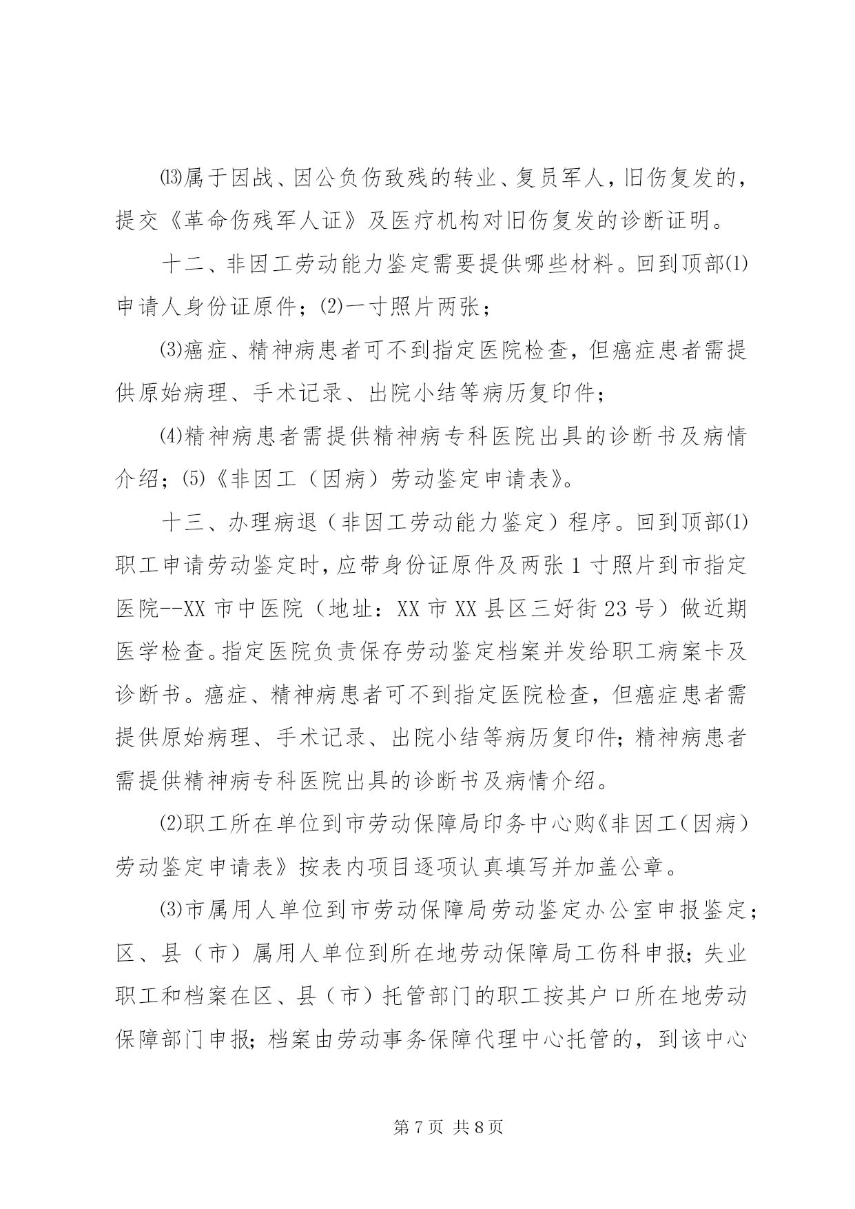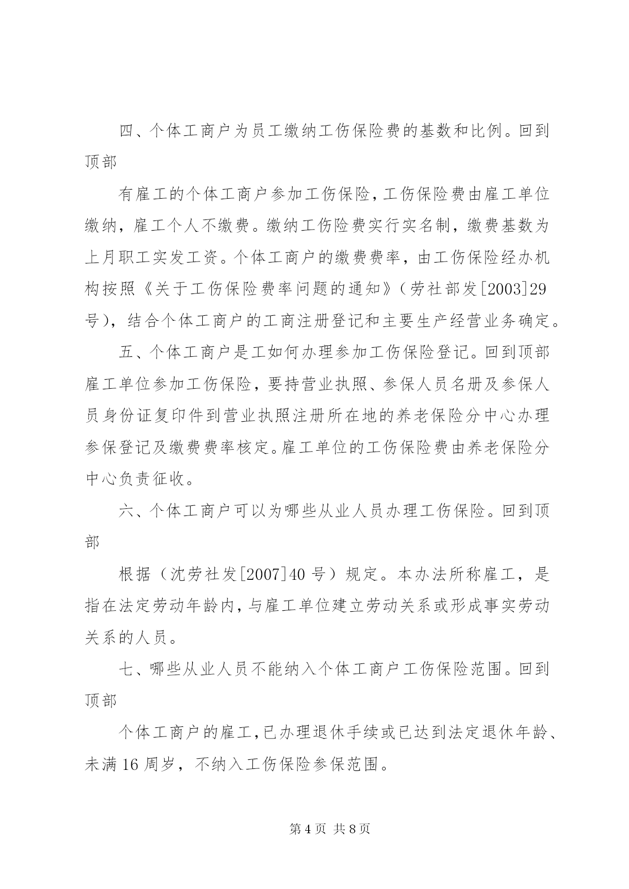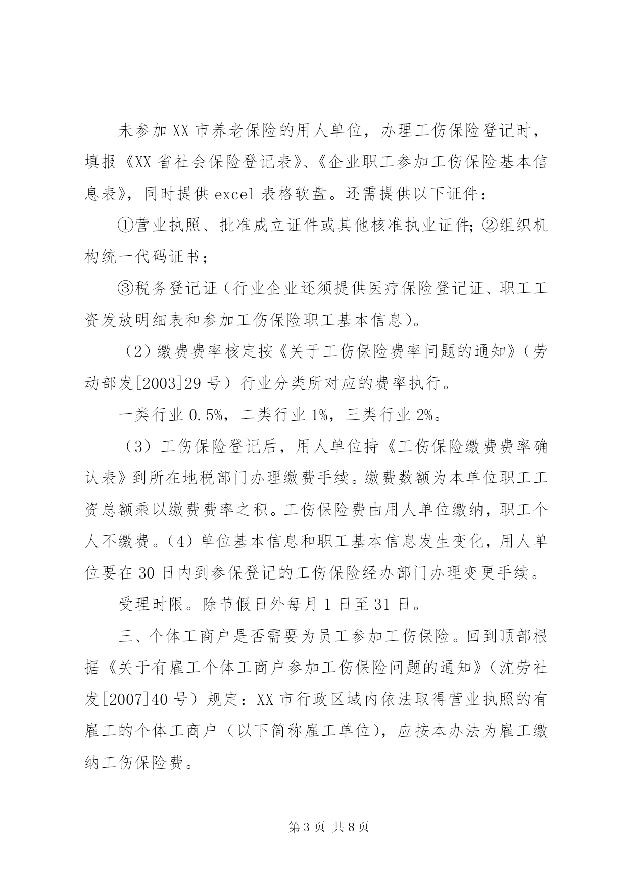 第PAGE\*Arabic\*MERGEFORMAT8页共NUMPAGES\*MERGEFORMAT8页工伤保险热点问答一、非全日制从业人员如何缴费。答。招用非全日制从业人员的用人单位应当将应缴纳的工伤保险费在劳动报酬中支付给个人,由其本人按照《XX省工伤保险实施办法》规定的工伤保险费缴费基数和费率自行缴费。二、非全日制从业人员享受哪些工伤待遇。答:非全日制从业人员因工作遭受事故伤害或者患职业病后,与用人单位的劳动关系按照《XX省劳动合同条例》的规定执行,享受下列工伤保险待遇:(一)按照《XX省工伤保险实施办法》规定由工伤保险基金支付的工伤保险待遇;(二)由承担工伤责任的用人单位参照《XX省工伤保险实施办法》规定支付停工留薪期待遇,并不得低于全市职工月最低工资标准;(三)致残一级至四级的,由承担工伤责任的用人单位和工伤人员以享受的伤残津贴为基数,一次性缴纳基本医疗保险费至工伤人员到达法定退休年龄,享受基本医疗保险待遇;(四)致残五级至十级的,由承担工伤责任的用人单位按照《XX省工伤保险实施办法》规定的标准支付一次性工伤医疗补助金和伤残就业补助金。三、协保人员享受什么工伤待遇。答。用人单位使用经就业登记的协保人员的,协保人员的工资收入不计入用人单位工伤保险缴费基数。协保人员发生工伤的,可以按照《XX省工伤保险实施办法》规定享受工伤保险待遇,但经办机构按照规定核定用人单位下一年度的浮动费率。四、非正规就业劳动组织从业人员享受什么工伤待遇。答。非正规就业劳动组织参照《XX省工伤保险实施办法》规定的缴费基数和比例缴纳工伤保险费,在缴纳工伤保险费后,其按照规定在劳动保障部门进行登记的从业人员发生工伤的,可以享受《XX省工伤保险实施办法》规定由工伤保险基金支付的工伤保险待遇。一、我市参加工伤保险的参保人员范围。凡是在XX市行政区域内的各类企业和与之形成劳动关系的劳动者,必须参加工伤保险。并到企业所在区社保分中心办理工伤保险登记手续。二、用人单位如何参加工伤保险。回到顶部(1)首先到税务登记所在地养老保险管理分中心办理参保登记手续、核定缴费费率。已参加XX市养老保险的用人单位,在办理登记时,填报《企业工伤保险缴费费率确认表》一式三份。参加工伤保险的人数多于参加养老保险的,填报《企业职工参加工伤保险基本信息表》,同时提供excel表格软盘。未参加XX市养老保险的用人单位,办理工伤保险登记时,填报《XX省社会保险登记表》、《企业职工参加工伤保险基本信息表》,同时提供excel表格软盘。还需提供以下证件:①营业执照、批准成立证件或其他核准执业证件;②组织机构统一代码证书;③税务登记证(行业企业还须提供医疗保险登记证、职工工资发放明细表和参加工伤保险职工基本信息)。(2)缴费费率核定按《关于工伤保险费率问题的通知》(劳动部发[2003]29号)行业分类所对应的费率执行。一类行业0.5%,二类行业1%,三类行业2%。(3)工伤保险登记后,用人单位持《工伤保险缴费费率确认表》到所在地税部门办理缴费手续。缴费数额为本单位职工工资总额乘以缴费费率之积。工伤保险费由用人单位缴纳,职工个人不缴费。(4)单位基本信息和职工基本信息发生变化,用人单位要在30日内到参保登记的工伤保险经办部门办理变更手续。受理时限。除节假日外每月1日至31日。三、个体工商户是否需要为员工参加工伤保险。回到顶部根据《关于有雇工个体工商户参加工伤保险问题的通知》(沈劳社发[2007]40号)规定:XX市行政区域内依法取得营业执照的有雇工的个体工商户(以下简称雇工单位),应按本办法为雇工缴纳工伤保险费。四、个体工商户为员工缴纳工伤保险费的基数和比例。回到顶部有雇工的个体工商户参加工伤保险,工伤保险费由雇工单位缴纳,雇工个人不缴费。缴纳工伤险费实行实名制,缴费基数为上月职工实发工资。个体工商户的缴费费率,由工伤保险经办机构按照《关于工伤保险费率问题的通知》(劳社部发[2003]29号),结合个体工商户的工商注册登记和主要生产经营业务确定。五、个体工商户是工如何办理参加工伤保险登记。回到顶部雇工单位参加工伤保险,要持营业执照、参保人员名册及参保人员身份证复印件到营业执照注册所在地的养老保险分中心办理参保登记及缴费费率核定。雇工单位的工伤保险费由养老保险分中心负责征收。六、个体工商户可以为哪些从业人员办理工伤保险。回到顶部根据(沈劳社发[2007]40号)规定。本办法所称雇工,是指在法定劳动年龄内,与雇工单位建立劳动关系或形成事实劳动关系的人员。七、哪些从业人员不能纳入个体工商户工伤保险范围。回到顶部个体工商户的雇工,已办理退休手续或已达到法定退休年龄、未满16周岁,不纳入工伤保险参保范围。八、个体工商户从业人员发生增减变动工伤保险如何办理。回到顶部雇工单位新招用雇工,