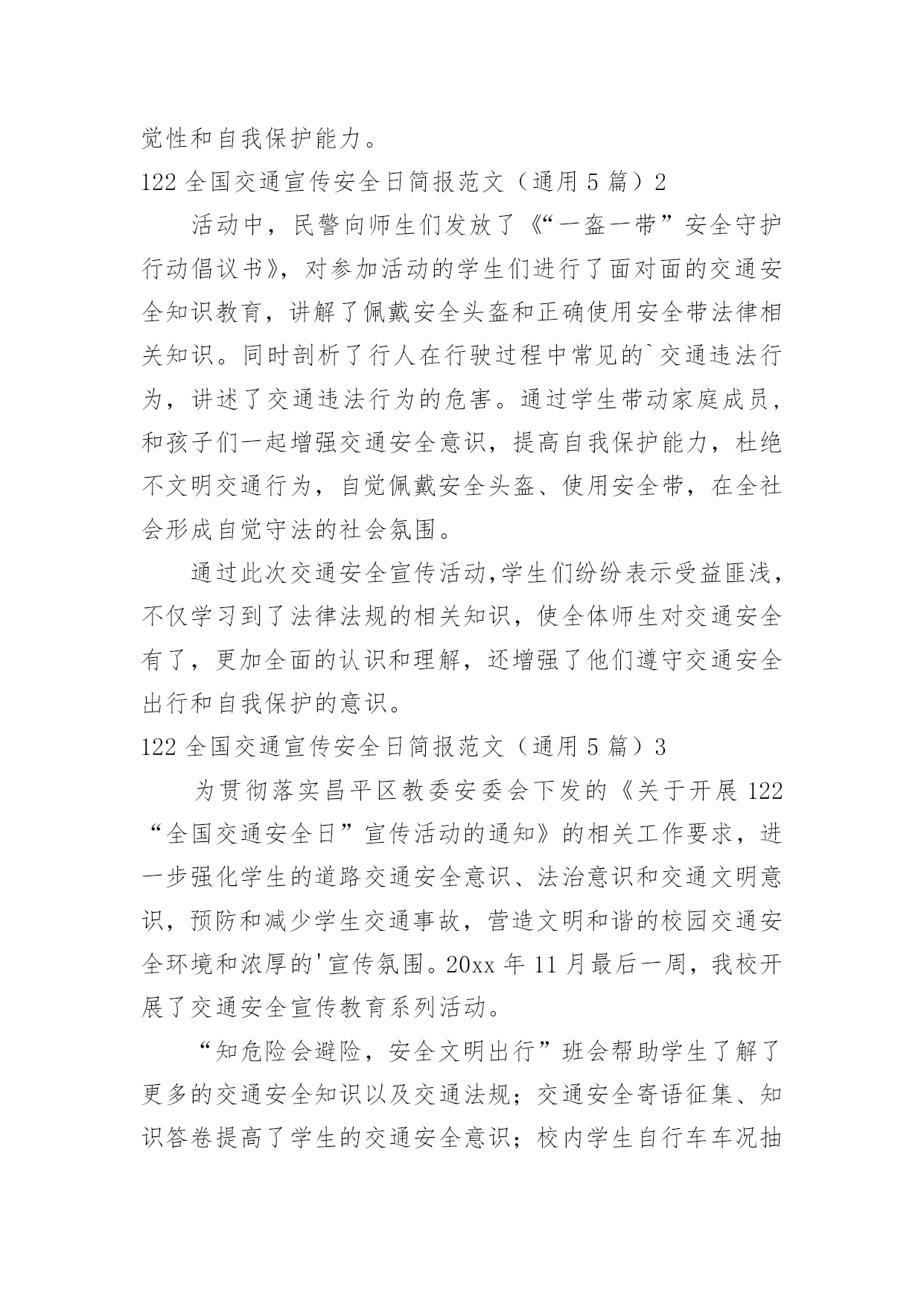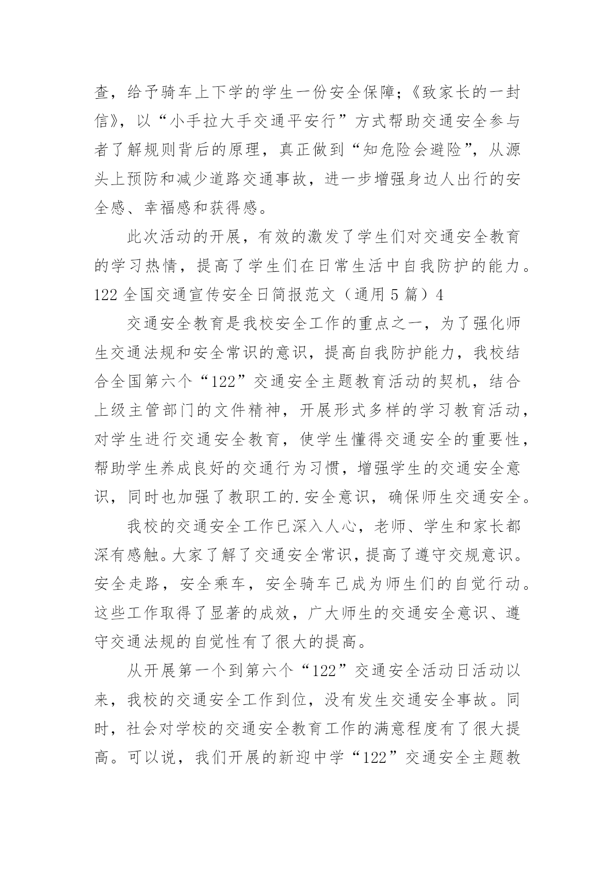 122全国交通宣传安全日简报122全国交通宣传安全日简报范文(通用5篇)在日常学习、工作抑或是生活中,大家一定没少看到过简报吧,简报是单位领导对一些问题做出决策的参考依据之一,也是单位推动工作的一个重要手段。你写简报时总是无从下手?以下是小编整理的122全国交通宣传安全日简报范文(通用5篇),仅供参考,希望能够帮助到大家。122全国交通宣传安全日简报范文(通用5篇)1为切实加强学生交通安全意识,提升自我保护能力,时刻绷紧交通安全弦,摒弃交通陋习,养成良好的交通行为习惯,珍爱生命,安全文明出行。旭村小学东圣宫分校各中队围绕“知危险会避险、安全文明出行”主题,开展了交通安全日教育活动。各班班主任开展以“知危险会避险、安全文明出行”为主题的班队会。班主任运用ppt课件向学生讲解什么是“全国交通安全日”和相关的交通安全知识,并给学生讲解上放学路上行走须知、乘车须知,不能乘坐三无车辆和超载车辆等交通安全知识;然后利用安全教育平台为学生播放交通安全相关视频录像,用生动的案例让学生们懂得交通安全的重要性,做到平安出行,珍爱生命!此次宣传教育活动,师生们认识到遵守交通规则的'重要性,提升了安全意识,切实提高了学生遵守交通法规的自觉性和自我保护能力。122全国交通宣传安全日简报范文(通用5篇)2活动中,民警向师生们发放了《“一盔一带”安全守护行动倡议书》,对参加活动的学生们进行了面对面的交通安全知识教育,讲解了佩戴安全头盔和正确使用安全带法律相关知识。同时剖析了行人在行驶过程中常见的`交通违法行为,讲述了交通违法行为的危害。通过学生带动家庭成员,和孩子们一起增强交通安全意识,提高自我保护能力,杜绝不文明交通行为,自觉佩戴安全头盔、使用安全带,在全社会形成自觉守法的社会氛围。通过此次交通安全宣传活动,学生们纷纷表示受益匪浅,不仅学习到了法律法规的相关知识,使全体师生对交通安全有了,更加全面的认识和理解,还增强了他们遵守交通安全出行和自我保护的意识。122全国交通宣传安全日简报范文(通用5篇)3为贯彻落实昌平区教委安委会下发的《关于开展122“全国交通安全日”宣传活动的通知》的相关工作要求,进一步强化学生的道路交通安全意识、法治意识和交通文明意识,预防和减少学生交通事故,营造文明和谐的校园交通安全环境和浓厚的'宣传氛围。20xx年11月最后一周,我校开展了交通安全宣传教育系列活动。“知危险会避险,安全文明出行”班会帮助学生了解了更多的交通安全知识以及交通法规;交通安全寄语征集、知识答卷提高了学生的交通安全意识;校内学生自行车车况抽查,给予骑车上下学的学生一份安全保障;《致家长的一封信》,以“小手拉大手交通平安行”方式帮助交通安全参与者了解规则背后的原理,真正做到“知危险会避险”,从源头上预防和减少道路交通事故,进一步增强身边人出行的安全感、幸福感和获得感。此次活动的开展,有效的激发了学生们对交通安全教育的学习热情,提高了学生们在日常生活中自我防护的能力。122全国交通宣传安全日简报范文(通用5篇)4交通安全教育是我校安全工作的重点之一,为了强化师生交通法规和安全常识的意识,提高自我防护能力,我校结合全国第六个“122”交通安全主题教育活动的契机,结合上级主管部门的文件精神,开展形式多样的学习教育活动,对学生进行交通安全教育,使学生懂得交通安全的重要性,帮助学生养成良好的交通行为习惯,增强学生的交通安全意识,同时也加强了教职工的.安全意识,确保师生交通安全。我校的交通安全工作已深入人心,老师、学生和家长都深有感触。大家了解了交通安全常识,提高了遵守交规意识。安全走路,安全乘车,安全骑车己成为师生们的自觉行动。这些工作取得了显著的成效,广大师生的交通安全意识、遵守交通法规的自觉性有了很大的提高。从开展第一个到第六个“122”交通安全活动日活动以来,我校的交通安全工作到位,没有发生交通安全事故。同时,社会对学校的交通安全教育工作的满意程度有了很大提高。可以说,我们开展的新迎中学“122”交通安全主题教育活动富有针对性和实效性,对学校交通安全工作起到了支撑和推动的`作用。122全国交通宣传安全日简报范文(通用5篇)512月2日至6日,百善学校开展了全国交通安全日系列教育宣传周活动。活动分为:周一的升旗仪式上,以安全倡议为题,启动了宣传周系列教育主题活动;每天早晨,中、小学两部分别针对学生小黄帽路队和自行车进行了安全大检查,做好每天的监督和管理工作;利用班会课,班主任带领学生对冬季交通安全注意事项以及交通安全常识进行学习,学生们认真学习交通安全知识读本,做好学习笔记,力争成为遵规守纪、安全文明的'尚善小卫士。