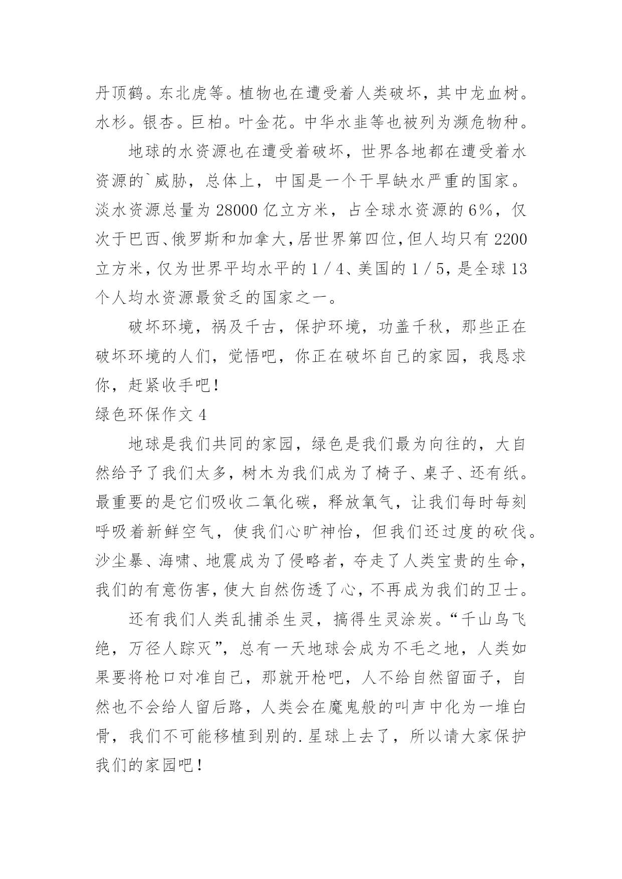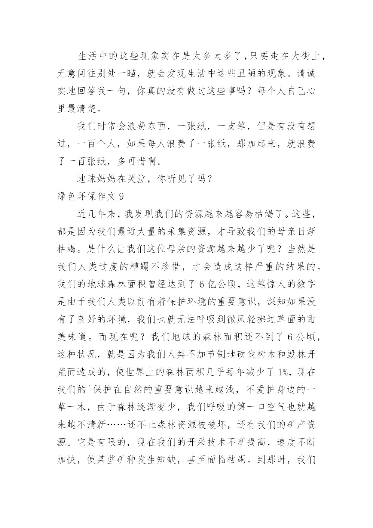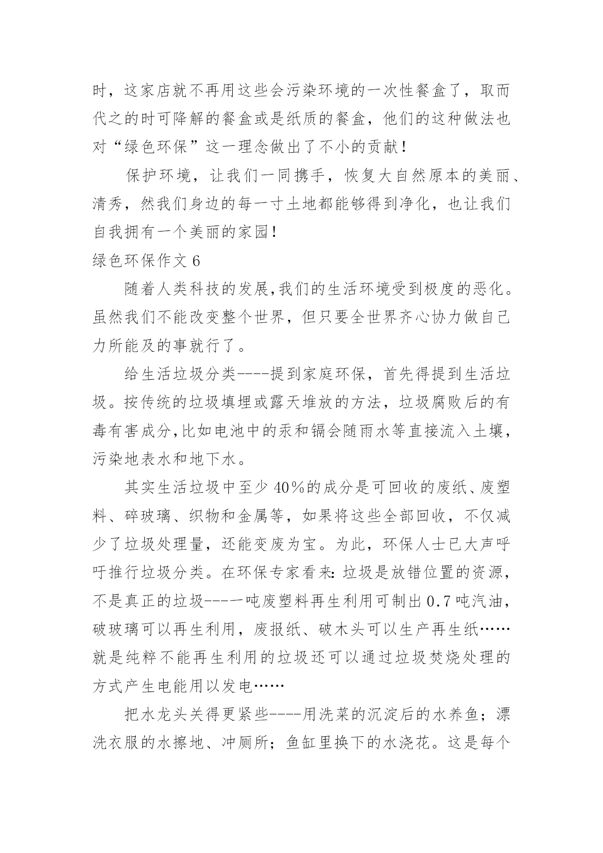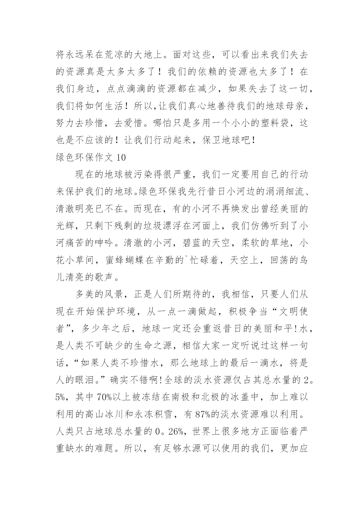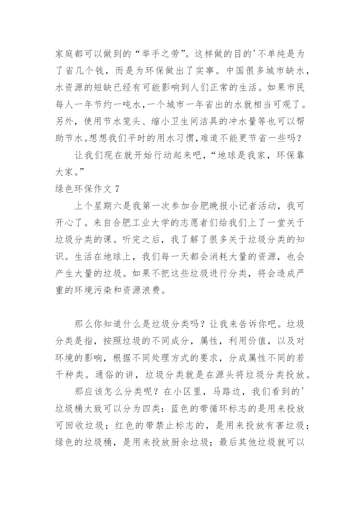 绿色环保作文绿色环保作文(精选15篇)在平平淡淡的学习、工作、生活中,大家都尝试过写作文吧,作文一定要做到主题集中,围绕同一主题作深入阐述,切忌东拉西扯,主题涣散甚至无主题。写起作文来就毫无头绪?以下是小编整理的绿色环保作文,仅供参考,欢迎大家阅读。绿色环保作文1现在的地球被污染得很严重,我们一定要用自己的行动来保护我们的地球。绿色环保我先行昔日小河边的涓涓细流、清澈明亮已不在。而现在,有的小河不再焕发出曾经美丽的光辉,只剩下残剩的垃圾漂浮在河面上,我们仿佛听到了小河痛苦的呻吟。清澈的小河,碧蓝的天空,柔软的草地,小花小草间,蜜蜂蝴蝶在辛勤的`忙碌着,天空上,回荡的鸟儿清亮的歌声。多美的风景,正是人们所期待的,我相信,只要人们从现在开始保护环境,从一点一滴做起,积极争当“文明使者”,多少年之后,地球一定还会重返昔日的美丽和平!水,是人类不可缺少的生命之源,相信大家一定听说过这样一句话,“如果人类不珍惜水,那么地球上的最后一滴水,将是人的眼泪。”确实不错啊!全球的淡水资源仅占其总水量的2。5%,其中70%以上被冻结在南极和北极的冰盖中,加上难以利用的高山冰川和永冻积雪,有87%的淡水资源难以利用。人类只占地球总水量的0。26%,世界上很多地方正面临着严重缺水的难题。所以,有足够水源可以使用的我们,更加应该节约水资源,比如:淘米水可以用来浇花,可以用洗菜的水冲厕所,煮面的水洗碗筷……走到哪里,我们都要制止一些人浪费水的不良行为。珍惜水资源,保护我们每一滴生命之水。这不仅仅是说一句口号,是鼓励我们要用实际行动保护我们的水资源!同学们,让我们行动起来吧,养成节能减排的好习惯并鼓励更多的人加入节能的队伍里。让我们的地球焕发光彩!绿色环保作文2展开绯红的记忆,加上浓浓的惆怅情绪,往日的快乐加上一丝苍白。中学3年级的生活程序就像落叶一样,一滴生命也看不见,一滴水也挤不出来。我疲惫地爬在枯燥的刻度线上,就像发条缠绕的手表一样。练习题包围着我,描绘着残酷的现实。度过忙碌的日子,智慧生长在思索中。生活不是象牙塔的,不能期待。人生不是诗般美丽的牧歌,只有快乐,没有悲伤。事实上,生活给我们太多的压力和无力感。既然要走自己的路,拥抱一边,拥抱自己的天空,那么伸到我们脚下就不是单纯的路了,高高挂在我们头上的除了悠悠白云之外,还有乌云滚滚。早晨,当第一缕阳光穿过稀疏的玉米带,懒洋洋地躺在人们的肩膀上时,我们已经在书中探讨了死者的心,或者说这两者,并在稿纸上探讨了Y和X的函数关系。初三给我带来的只有忙碌和觉悟。就像自己一夜之间长大一样,理解了很多以前不理解的事情。既然没有能力改变,就服从它吧。这是一句经典的`话。几个字就能知道生活的游戏规则。伏尔泰说:“人生是火焰,生命是原动力。”温暖的气息逐渐长大,一点一点地覆盖了我的世界。我知道我心里有炽热的火焰,任何枷锁都困不住。现在的我,像天边的云一样,再坚定一点,再轻浮一点。又少了一个成熟的,又少了一个稚嫩的。初中三年级生活再坎坷,我也会带着阳光继续走下去。在这条荆棘路上飞,舞着属于我的奇迹。绿色环保作文346亿年前。有一颗蔚蓝色的星球诞生在浩瀚的宇宙中,它是那样美丽。那就是我们的母亲——地球。绿色的地球是我们人类生生不息的载体。几千年的人类文明进程没有牺牲地球的绿色,但是三百年的现代文明却使我们绿色的地球日渐披黄蒙黑黯然失色。人类在毁灭地球绿色的同时,也就是在毁灭人类自己。地球的资源在一天天遭到破坏,许多动植物被列为珍稀品种,只是中国的一级濒危物种就有上百种,其中极为重要的有:中华鲟。扬子鳄。白鹤。金雕。麋鹿。紫貂。大熊猫。丹顶鹤。东北虎等。植物也在遭受着人类破坏,其中龙血树。水杉。银杏。巨柏。叶金花。中华水韭等也被列为濒危物种。地球的水资源也在遭受着破坏,世界各地都在遭受着水资源的`威胁,总体上,中国是一个干旱缺水严重的国家。淡水资源总量为28000亿立方米,占全球水资源的6%,仅次于巴西、俄罗斯和加拿大,居世界第四位,但人均只有2200立方米,仅为世界平均水平的1/4、美国的1/5,是全球13个人均水资源最贫乏的国家之一。破坏环境,祸及千古,保护环境,功盖千秋,那些正在破坏环境的人们,觉悟吧,你正在破坏自己的家园,我恳求你,赶紧收手吧!绿色环保作文4地球是我们共同的家园,绿色是我们最为向往的,大自然给予了我们太多,树木为我们成为了椅子、桌子、还有纸。最重要的是它们吸收二氧化碳,释放氧气,让我们每时每刻呼吸着新鲜空气,使我们心旷神怡,但我们还过度的砍伐。沙尘暴、海啸、地震成为了侵略者,夺走了人类宝贵的生命,我们的有意伤害,使大自然伤透了心,不再成为我们的卫士。还有我们人类乱捕杀生灵,搞得生灵涂炭。“千山鸟飞绝,万径人踪灭”,总有一天地球会成为不毛之地,人类如果要将枪口对准自己,那就开枪吧,人不给自然留面子,