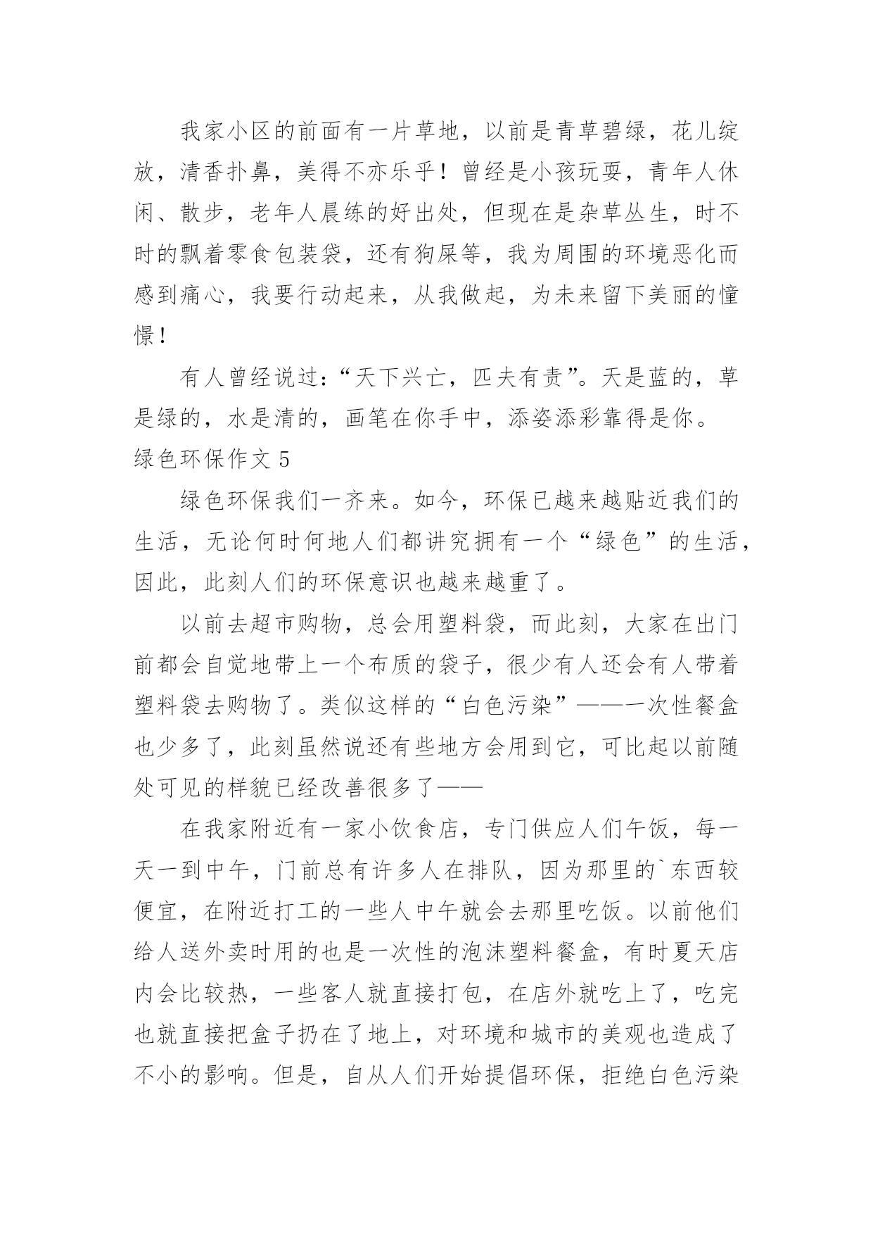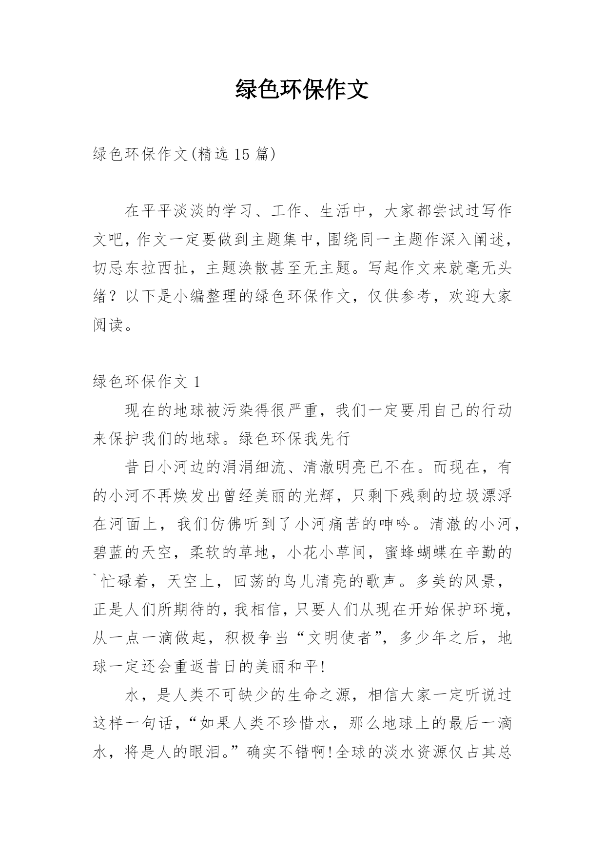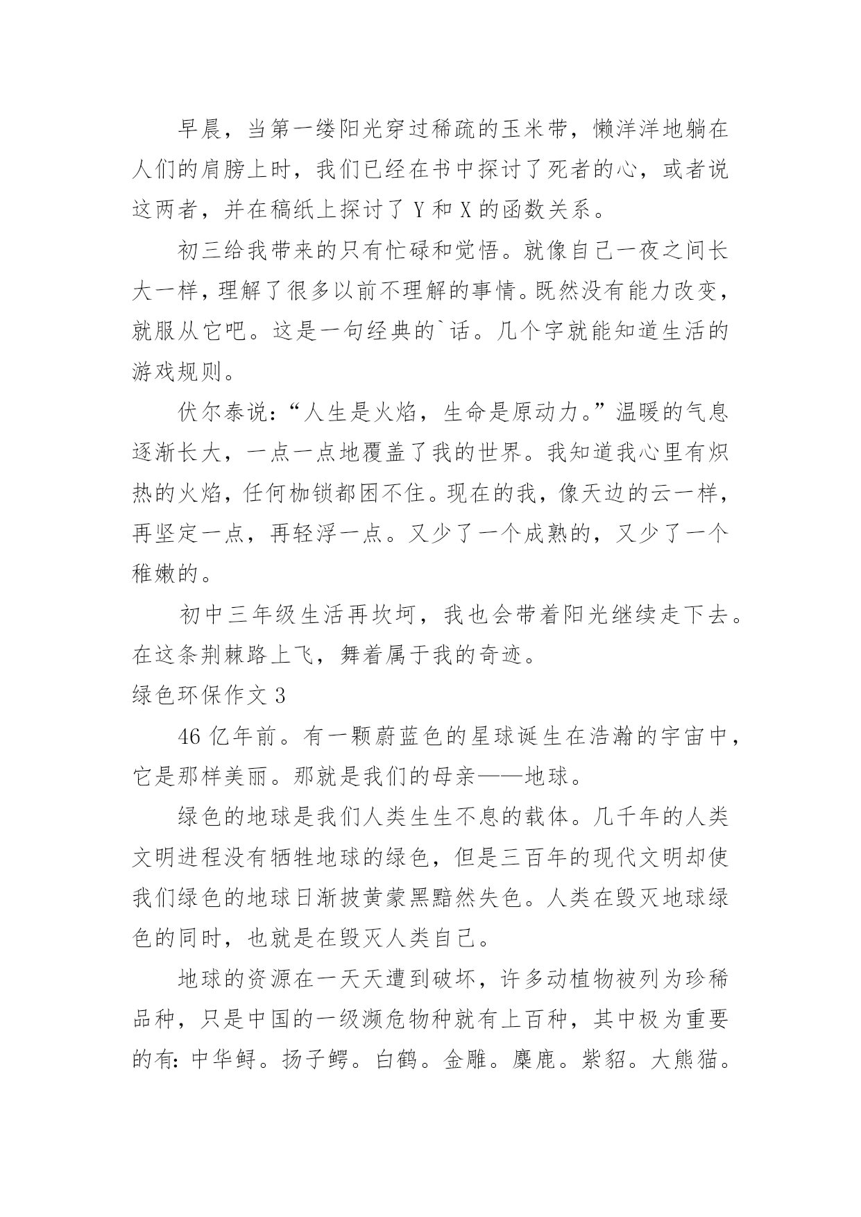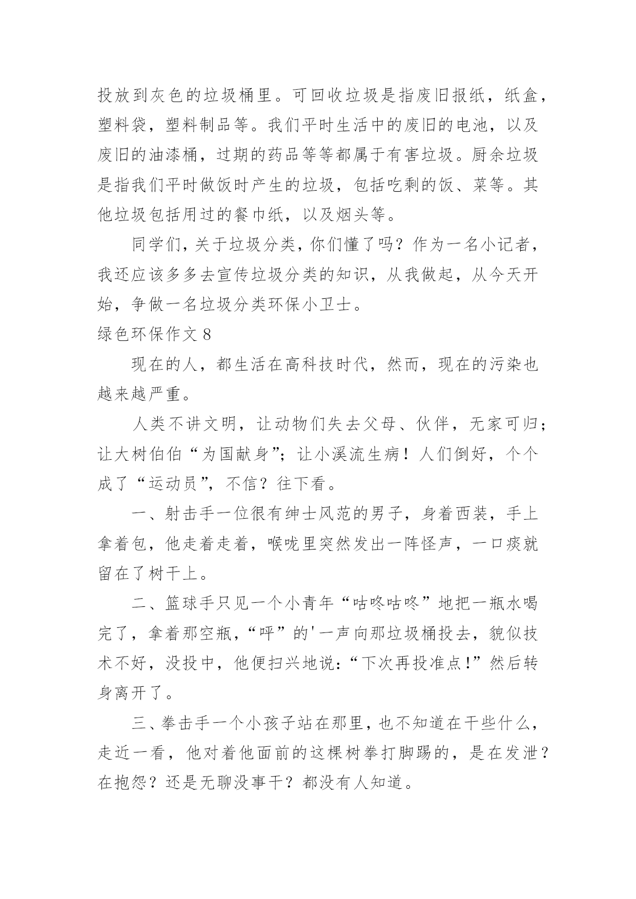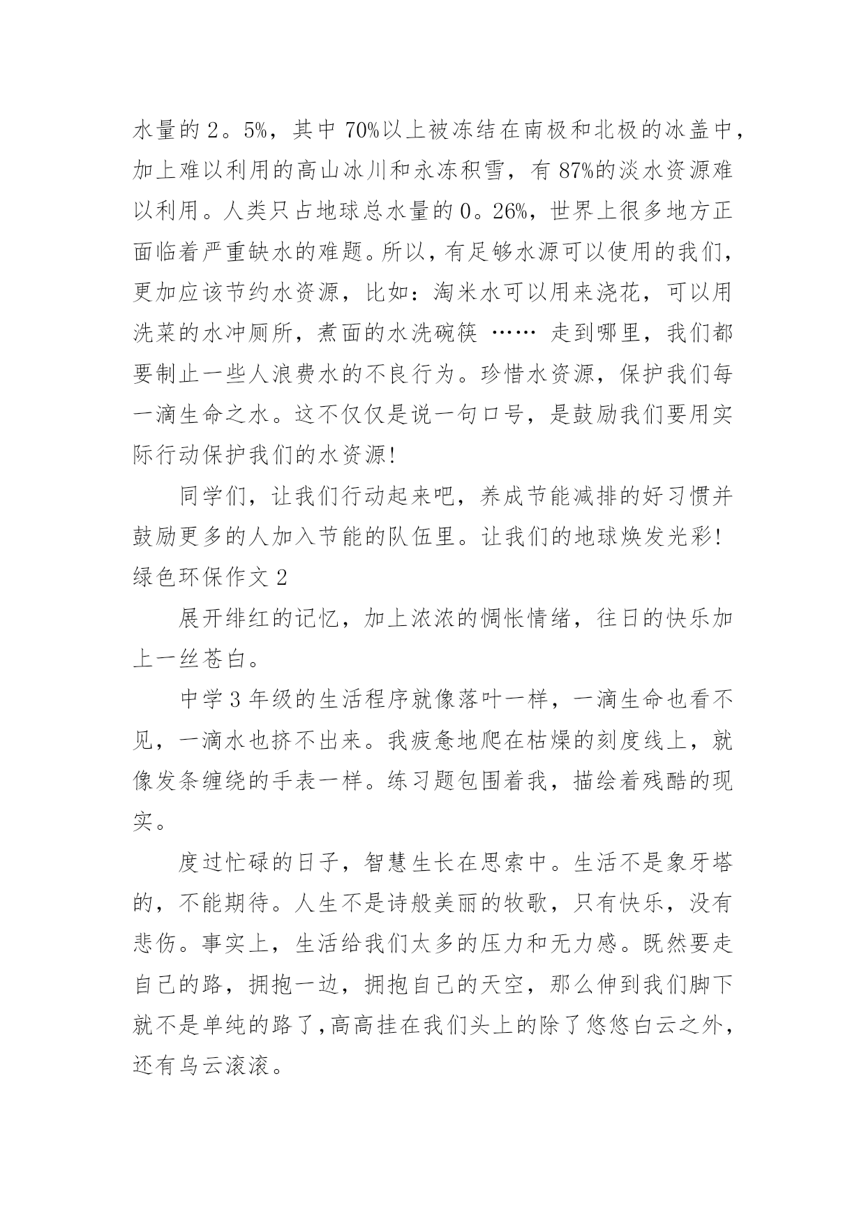 绿色环保作文绿色环保作文(精选15篇)在平平淡淡的学习、工作、生活中,大家都尝试过写作文吧,作文一定要做到主题集中,围绕同一主题作深入阐述,切忌东拉西扯,主题涣散甚至无主题。写起作文来就毫无头绪?以下是小编整理的绿色环保作文,仅供参考,欢迎大家阅读。绿色环保作文1现在的地球被污染得很严重,我们一定要用自己的行动来保护我们的地球。绿色环保我先行昔日小河边的涓涓细流、清澈明亮已不在。而现在,有的小河不再焕发出曾经美丽的光辉,只剩下残剩的垃圾漂浮在河面上,我们仿佛听到了小河痛苦的呻吟。清澈的小河,碧蓝的天空,柔软的草地,小花小草间,蜜蜂蝴蝶在辛勤的`忙碌着,天空上,回荡的鸟儿清亮的歌声。多美的风景,正是人们所期待的,我相信,只要人们从现在开始保护环境,从一点一滴做起,积极争当“文明使者”,多少年之后,地球一定还会重返昔日的美丽和平!水,是人类不可缺少的生命之源,相信大家一定听说过这样一句话,“如果人类不珍惜水,那么地球上的最后一滴水,将是人的眼泪。”确实不错啊!全球的淡水资源仅占其总水量的2。5%,其中70%以上被冻结在南极和北极的冰盖中,加上难以利用的高山冰川和永冻积雪,有87%的淡水资源难以利用。人类只占地球总水量的0。26%,世界上很多地方正面临着严重缺水的难题。所以,有足够水源可以使用的我们,更加应该节约水资源,比如:淘米水可以用来浇花,可以用洗菜的水冲厕所,煮面的水洗碗筷……走到哪里,我们都要制止一些人浪费水的不良行为。珍惜水资源,保护我们每一滴生命之水。这不仅仅是说一句口号,是鼓励我们要用实际行动保护我们的水资源!同学们,让我们行动起来吧,养成节能减排的好习惯并鼓励更多的人加入节能的队伍里。让我们的地球焕发光彩!绿色环保作文2展开绯红的记忆,加上浓浓的惆怅情绪,往日的快乐加上一丝苍白。中学3年级的生活程序就像落叶一样,一滴生命也看不见,一滴水也挤不出来。我疲惫地爬在枯燥的刻度线上,就像发条缠绕的手表一样。练习题包围着我,描绘着残酷的现实。度过忙碌的日子,智慧生长在思索中。生活不是象牙塔的,不能期待。人生不是诗般美丽的牧歌,只有快乐,没有悲伤。事实上,生活给我们太多的压力和无力感。既然要走自己的路,拥抱一边,拥抱自己的天空,那么伸到我们脚下就不是单纯的路了,高高挂在我们头上的除了悠悠白云之外,还有乌云滚滚。早晨,当第一缕阳光穿过稀疏的玉米带,懒洋洋地躺在人们的肩膀上时,我们已经在书中探讨了死者的心,或者说这两者,并在稿纸上探讨了Y和X的函数关系。初三给我带来的只有忙碌和觉悟。就像自己一夜之间长大一样,理解了很多以前不理解的事情。既然没有能力改变,就服从它吧。这是一句经典的`话。几个字就能知道生活的游戏规则。伏尔泰说:“人生是火焰,生命是原动力。”温暖的气息逐渐长大,一点一点地覆盖了我的世界。我知道我心里有炽热的火焰,任何枷锁都困不住。现在的我,像天边的云一样,再坚定一点,再轻浮一点。又少了一个成熟的,又少了一个稚嫩的。初中三年级生活再坎坷,我也会带着阳光继续走下去。在这条荆棘路上飞,舞着属于我的奇迹。绿色环保作文346亿年前。有一颗蔚蓝色的星球诞生在浩瀚的宇宙中,它是那样美丽。那就是我们的母亲——地球。绿色的地球是我们人类生生不息的载体。几千年的人类文明进程没有牺牲地球的绿色,但是三百年的现代文明却使我们绿色的地球日渐披黄蒙黑黯然失色。人类在毁灭地球绿色的同时,也就是在毁灭人类自己。地球的资源在一天天遭到破坏,许多动植物被列为珍稀品种,只是中国的一级濒危物种就有上百种,其中极为重要的有:中华鲟。扬子鳄。白鹤。金雕。麋鹿。紫貂。大熊猫。丹顶鹤。东北虎等。植物也在遭受着人类破坏,其中龙血树。水杉。银杏。巨柏。叶金花。中华水韭等也被列为濒危物种。地球的水资源也在遭受着破坏,世界各地都在遭受着水资源的`威胁,总体上,中国是一个干旱缺水严重的国家。淡水资源总量为28000亿立方米,占全球水资源的6%,仅次于巴西、俄罗斯和加拿大,居世界第四位,但人均只有2200立方米,仅为世界平均水平的1/4、美国的1/5,是全球13个人均水资源最贫乏的国家之一。破坏环境,祸及千古,保护环境,功盖千秋,那些正在破坏环境的人们,觉悟吧,你正在破坏自己的家园,我恳求你,赶紧收手吧!绿色环保作文4地球是我们共同的家园,绿色是我们最为向往的,大自然给予了我们太多,树木为我们成为了椅子、桌子、还有纸。最重要的是它们吸收二氧化碳,释放氧气,让我们每时每刻呼吸着新鲜空气,使我们心旷神怡,但我们还过度的砍伐。沙尘暴、海啸、地震成为了侵略者,夺走了人类宝贵的生命,我们的有意伤害,使大自然伤透了心,不再成为我们的卫士。还有我们人类乱捕杀生灵,搞得生灵涂炭。“千山鸟飞绝,万径人踪灭”,总有一天地球会成为不毛之地,人类如果要将枪口对准自己,那就开枪吧,人不给自然留面子,