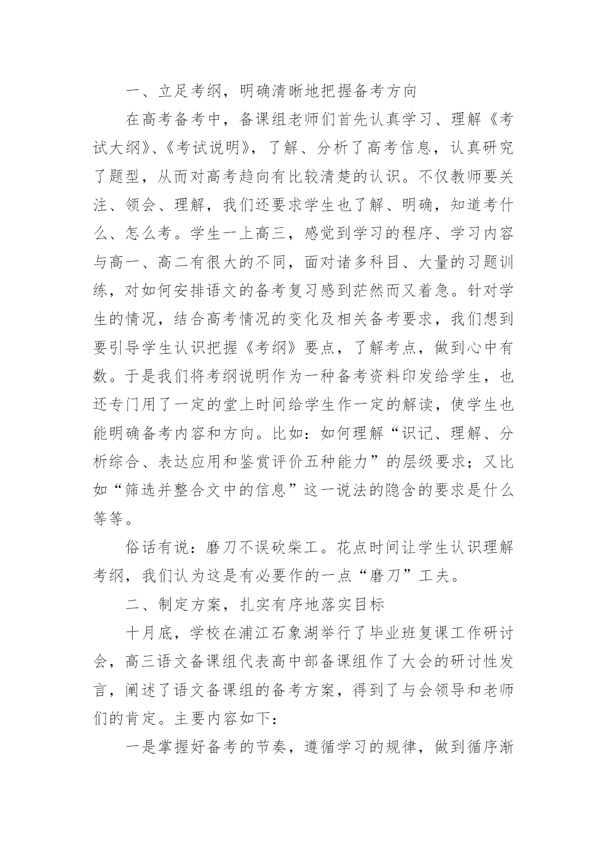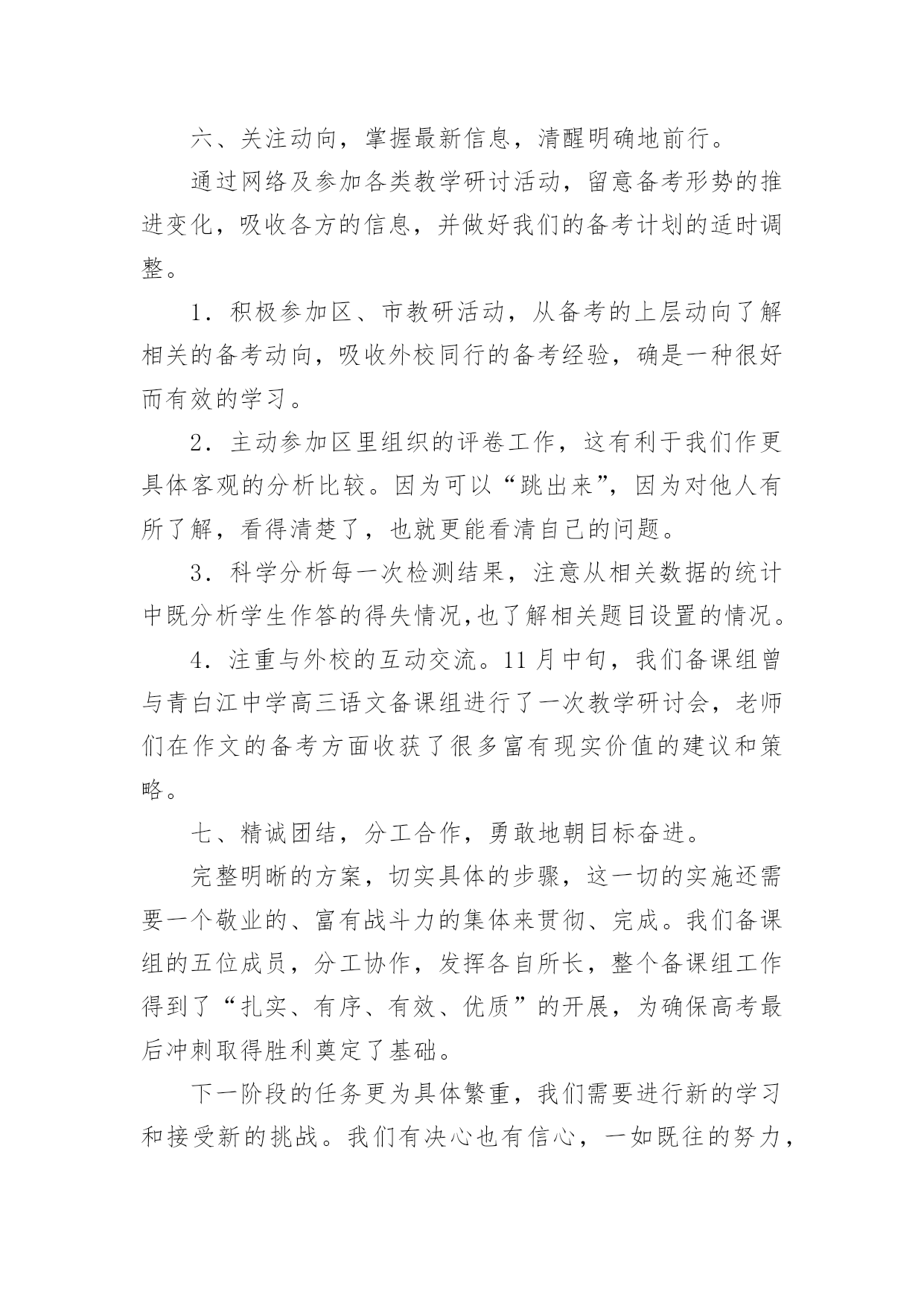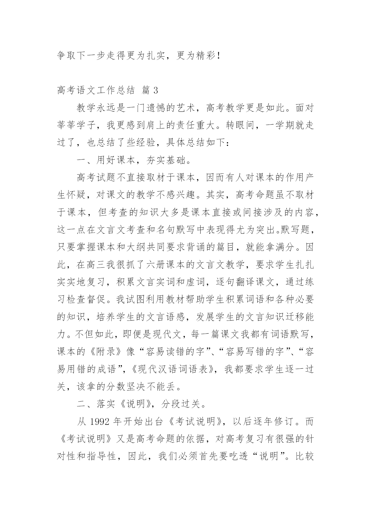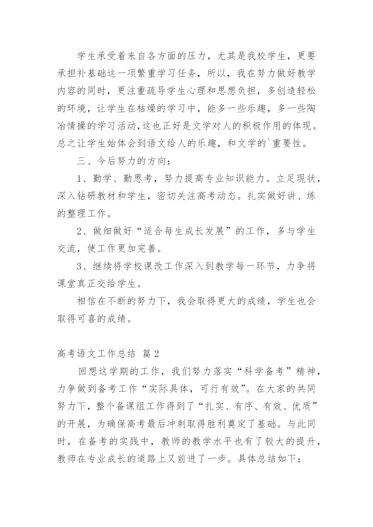 高考语文工作总结高考语文工作总结(优秀8篇)总结是对取得的成绩、存在的问题及得到的经验和教训等方面情况进行评价与描述的一种书面材料,它可以促使我们思考,是时候写一份总结了。但是总结有什么要求呢?下面是小编为大家整理的高考语文工作总结,欢迎大家分享。高考语文工作总结篇1本学期我担任高三(2、4)班的语文教学工作,因为这是我初次接触高三复课教学工作,所以对一切都很陌生,刚才是教学毫无头绪,处处显得手忙脚乱、捉襟见肘。幸好有语文组另外三位老师的指导帮助,不久,我的复课教学逐渐有了章程。现已到学期末,回顾几个月来的工作,虽然有着紧张、忙碌和疲惫,但也有着收获和喜悦。现在将本学期教学工作总结如下。一、面临的问题:1、个人专业业务素养欠缺,担当复课工作压力很大。2、两个班皆为理科班,学生的基础很薄弱,我们既要面对补充基础知识这一重点,又要切实按照高考方向进行教学这一难点。3、学生对语文学科不重视,缺乏学习兴趣和积极性,我的教学工作较难推进。4、刚开始对“课堂教学四点基本要求”认识不足,领会不够深,认为它与复课有冲突,所以,有一定的抵触情绪。二、探索出的相关方法措施:1、认真研究考纲和考试说明,并分析研究近三年高考语文试题,确保教学方向。在此基础上,做好第一轮复习工作,针对八大专题,我们计划于20xx年3月底完成第一轮复习。每个专题复习又进行考点分析、知识梳理、精题演练、同步练习、练后总结等工作。2、在上一条的'基础框架下,我在课堂上具体运用以下方法,并充分做好课后工作。(1)运用学校推行的“课堂教学四点基本要求”。首先研究学情,做出“适合学生”的教学计划,在课内外开辟一定时间“补充基础”。其次运用“兵教兵”结对提高方式,在节省时间的基础上提高教学效率。此外,在课内适时做好评价,增加学生学习兴趣。当然教学主线自始至终围绕考纲。经反复实践,效果显著。(2)切实做好“考后练”工作。高三复课,重在练题,通过反复练习,让学生查漏补缺,巩固所学,步步推进。(3)充分运用好“竞速两测”,这不仅能激励学生,更能提高做题速度,培养学习兴趣,最终提高学习效率。因为速度就是激情。(4)讲清解题规律和方法。(5)努力做好学生的弱科帮扶工作。3、注重做好学生的心理调适工作。学生承受着来自各方面的压力,尤其是我校学生,更要承担补基础这一项繁重学习任务,所以,我在努力做好教学内容的同时,更注重疏导学生心理和思想负担,多创造轻松的环境,让学生在枯燥的学习中,能多一些乐趣,多一些陶冶情操的学习活动,这也正好是文学对人的积极作用的体现。总之让学生始体会到语文给人的乐趣,和文学的`重要性。三、今后努力的方向:1、勤学、勤思考,努力提高专业知识能力。立足现状,深入钻研教材和学生,密切关注高考动态。扎实做好讲、练的整理工作。2、做细做好“适合每生成长发展”的工作,多与学生交流,使工作更加完善。3、继续将学校课改工作深入到教学每一环节,力争将课堂真正交给学生。相信在不断的努力下,我会取得更大的成绩,学生也会取得可喜的成绩。高考语文工作总结篇2回想这学期的工作,我们努力落实“科学备考”精神,力争做到备考工作“实际具体,可行有效”。在大家的共同努力下,整个备课组工作得到了“扎实、有序、有效、优质”的开展,为确保高考最后冲刺取得胜利奠定了基础。与此同时,在备考的实践中,教师的教学水平也有了较大的提升,教师在专业成长的道路上又前进了一步。具体总结如下:一、立足考纲,明确清晰地把握备考方向在高考备考中,备课组老师们首先认真学习、理解《考试大纲》、《考试说明》,了解、分析了高考信息,认真研究了题型,从而对高考趋向有比较清楚的认识。不仅教师要关注、领会、理解,我们还要求学生也了解、明确,知道考什么、怎么考。学生一上高三,感觉到学习的程序、学习内容与高一、高二有很大的不同,面对诸多科目、大量的习题训练,对如何安排语文的备考复习感到茫然而又着急。针对学生的情况,结合高考情况的变化及相关备考要求,我们想到要引导学生认识把握《考纲》要点,了解考点,做到心中有数。于是我们将考纲说明作为一种备考资料印发给学生,也还专门用了一定的堂上时间给学生作一定的解读,使学生也能明确备考内容和方向。比如:如何理解“识记、理解、分析综合、表达应用和鉴赏评价五种能力”的层级要求;又比如“筛选并整合文中的信息”这一说法的隐含的要求是什么等等。俗话有说:磨刀不误砍柴工。花点时间让学生认识理解考纲,我们认为这是有必要作的一点“磨刀”工夫。二、制定方案,扎实有序地落实目标十月底,学校在浦江石象湖举行了毕业班复课工作研讨会,高三语文备课组代表高中部备课组作了大会的研讨性发言,阐述了语文备课组的备考方案,得到了与会领导和老师们的肯定。主要内容如下:一是掌握好备考的节奏,遵循学习的规律,做到循序渐进,有的放矢。高三语文备课组小结5篇高