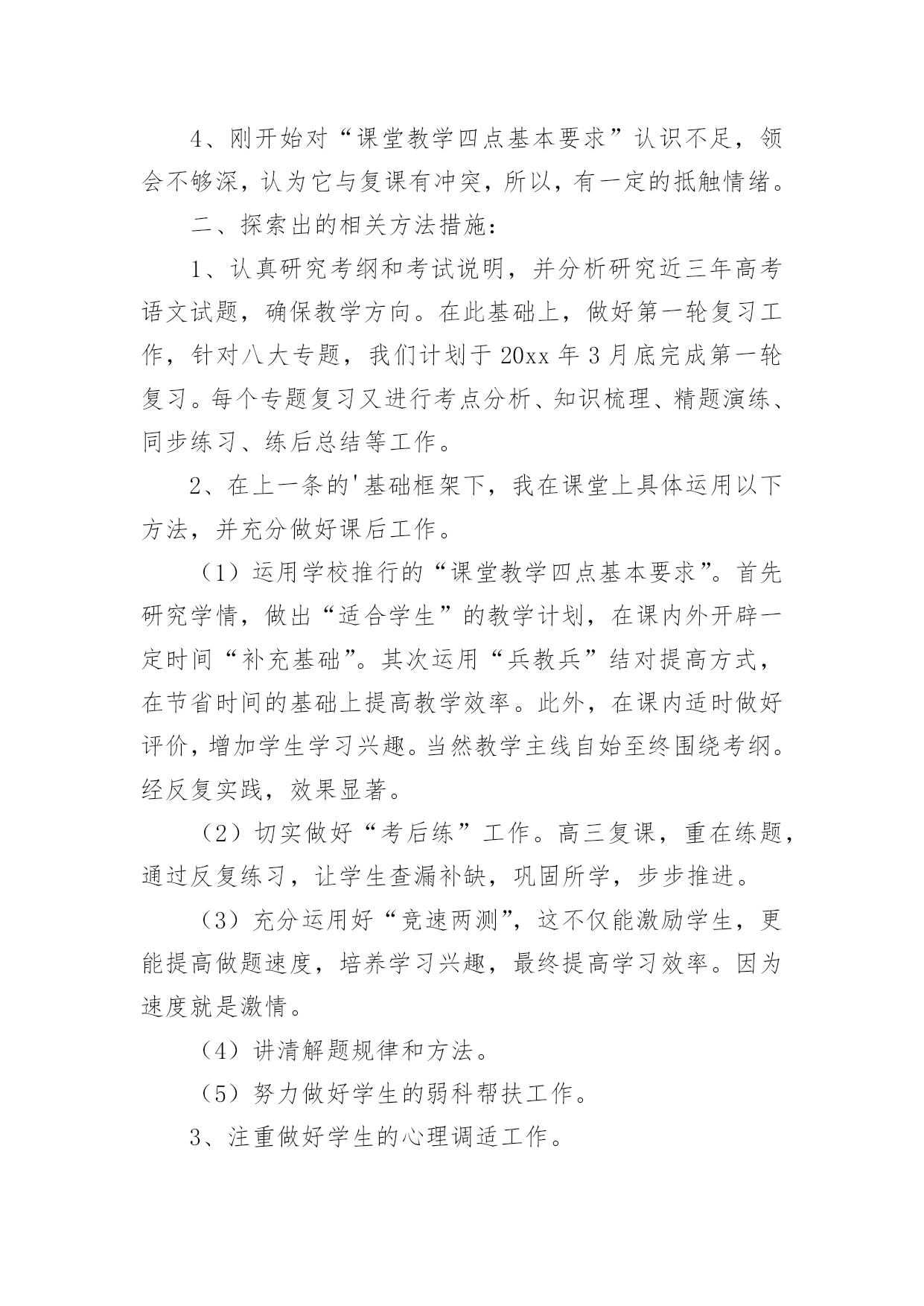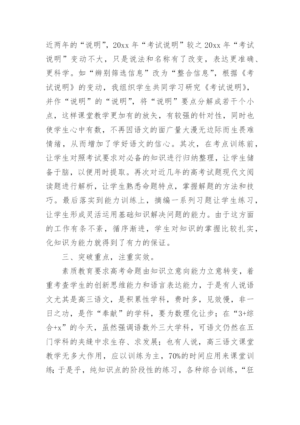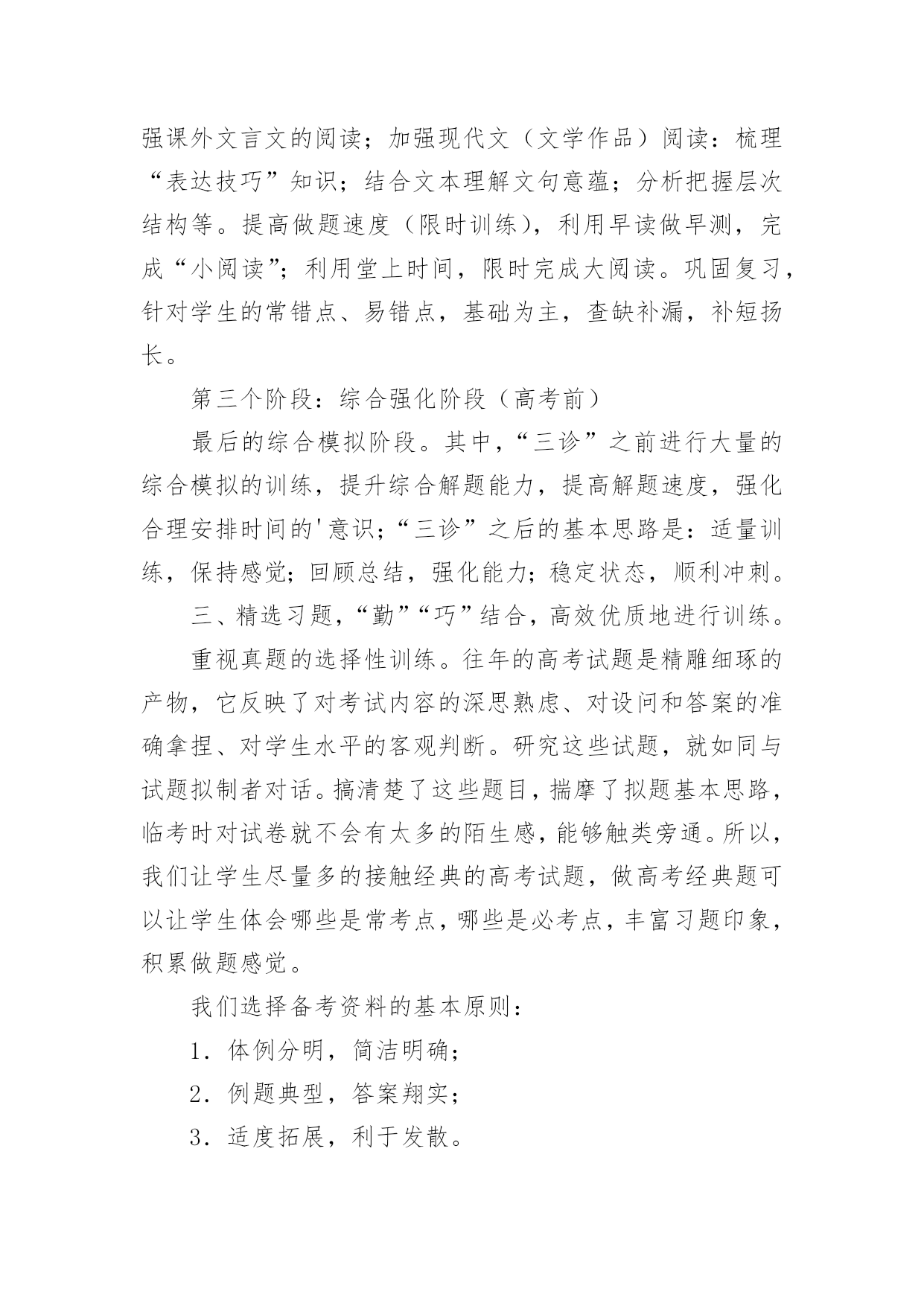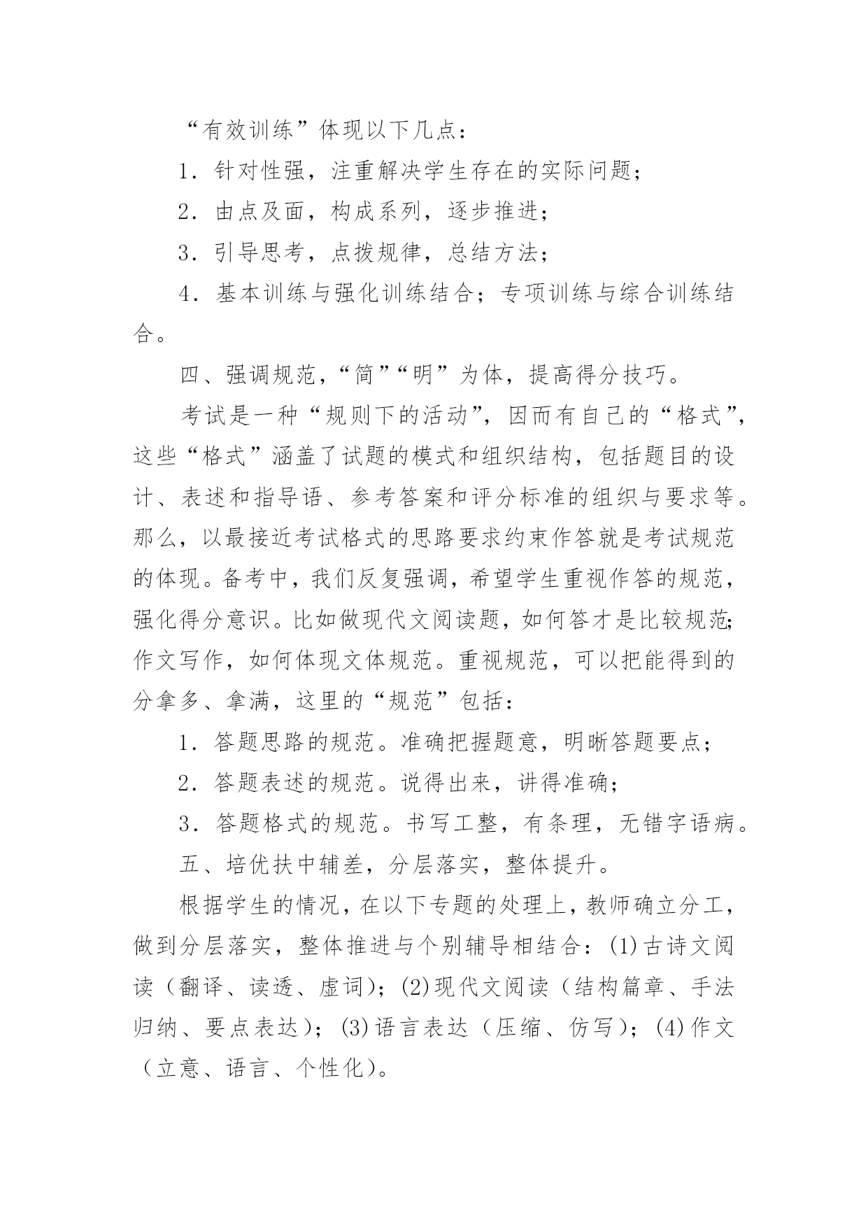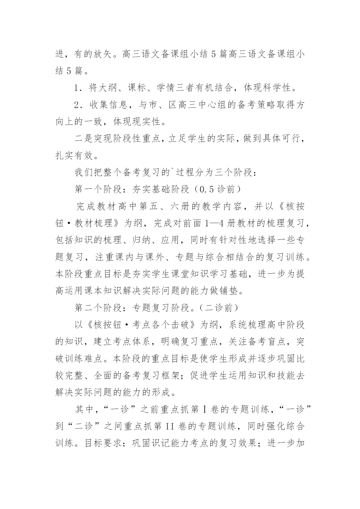高考语文工作总结高考语文工作总结(优秀8篇)总结是对取得的成绩、存在的问题及得到的经验和教训等方面情况进行评价与描述的一种书面材料,它可以促使我们思考,是时候写一份总结了。但是总结有什么要求呢?下面是小编为大家整理的高考语文工作总结,欢迎大家分享。高考语文工作总结篇1本学期我担任高三(2、4)班的语文教学工作,因为这是我初次接触高三复课教学工作,所以对一切都很陌生,刚才是教学毫无头绪,处处显得手忙脚乱、捉襟见肘。幸好有语文组另外三位老师的指导帮助,不久,我的复课教学逐渐有了章程。现已到学期末,回顾几个月来的工作,虽然有着紧张、忙碌和疲惫,但也有着收获和喜悦。现在将本学期教学工作总结如下。一、面临的问题:1、个人专业业务素养欠缺,担当复课工作压力很大。2、两个班皆为理科班,学生的基础很薄弱,我们既要面对补充基础知识这一重点,又要切实按照高考方向进行教学这一难点。3、学生对语文学科不重视,缺乏学习兴趣和积极性,我的教学工作较难推进。4、刚开始对“课堂教学四点基本要求”认识不足,领会不够深,认为它与复课有冲突,所以,有一定的抵触情绪。二、探索出的相关方法措施:1、认真研究考纲和考试说明,并分析研究近三年高考语文试题,确保教学方向。在此基础上,做好第一轮复习工作,针对八大专题,我们计划于20xx年3月底完成第一轮复习。每个专题复习又进行考点分析、知识梳理、精题演练、同步练习、练后总结等工作。2、在上一条的'基础框架下,我在课堂上具体运用以下方法,并充分做好课后工作。(1)运用学校推行的“课堂教学四点基本要求”。首先研究学情,做出“适合学生”的教学计划,在课内外开辟一定时间“补充基础”。其次运用“兵教兵”结对提高方式,在节省时间的基础上提高教学效率。此外,在课内适时做好评价,增加学生学习兴趣。当然教学主线自始至终围绕考纲。经反复实践,效果显著。(2)切实做好“考后练”工作。高三复课,重在练题,通过反复练习,让学生查漏补缺,巩固所学,步步推进。(3)充分运用好“竞速两测”,这不仅能激励学生,更能提高做题速度,培养学习兴趣,最终提高学习效率。因为速度就是激情。(4)讲清解题规律和方法。(5)努力做好学生的弱科帮扶工作。3、注重做好学生的心理调适工作。学生承受着来自各方面的压力,尤其是我校学生,更要承担补基础这一项繁重学习任务,所以,我在努力做好教学内容的同时,更注重疏导学生心理和思想负担,多创造轻松的环境,让学生在枯燥的学习中,能多一些乐趣,多一些陶冶情操的学习活动,这也正好是文学对人的积极作用的体现。总之让学生始体会到语文给人的乐趣,和文学的`重要性。三、今后努力的方向:1、勤学、勤思考,努力提高专业知识能力。立足现状,深入钻研教材和学生,密切关注高考动态。扎实做好讲、练的整理工作。2、做细做好“适合每生成长发展”的工作,多与学生交流,使工作更加完善。3、继续将学校课改工作深入到教学每一环节,力争将课堂真正交给学生。相信在不断的努力下,我会取得更大的成绩,学生也会取得可喜的成绩。高考语文工作总结篇2回想这学期的工作,我们努力落实“科学备考”精神,力争做到备考工作“实际具体,可行有效”。在大家的共同努力下,整个备课组工作得到了“扎实、有序、有效、优质”的开展,为确保高考最后冲刺取得胜利奠定了基础。与此同时,在备考的实践中,教师的教学水平也有了较大的提升,教师在专业成长的道路上又前进了一步。具体总结如下:一、立足考纲,明确清晰地把握备考方向在高考备考中,备课组老师们首先认真学习、理解《考试大纲》、《考试说明》,了解、分析了高考信息,认真研究了题型,从而对高考趋向有比较清楚的认识。不仅教师要关注、领会、理解,我们还要求学生也了解、明确,知道考什么、怎么考。学生一上高三,感觉到学习的程序、学习内容与高一、高二有很大的不同,面对诸多科目、大量的习题训练,对如何安排语文的备考复习感到茫然而又着急。针对学生的情况,结合高考情况的变化及相关备考要求,我们想到要引导学生认识把握《考纲》要点,了解考点,做到心中有数。于是我们将考纲说明作为一种备考资料印发给学生,也还专门用了一定的堂上时间给学生作一定的解读,使学生也能明确备考内容和方向。比如:如何理解“识记、理解、分析综合、表达应用和鉴赏评价五种能力”的层级要求;又比如“筛选并整合文中的信息”这一说法的隐含的要求是什么等等。俗话有说:磨刀不误砍柴工。花点时间让学生认识理解考纲,我们认为这是有必要作的一点“磨刀”工夫。二、制定方案,扎实有序地落实目标十月底,学校在浦江石象湖举行了毕业班复课工作研讨会,高三语文备课组代表高中部备课组作了大会的研讨性发言,阐述了语文备课组的备考方案,得到了与会领导和老师们的肯定。主要内容如下:一是掌握好备考的节奏,遵循学习的规律,做到循序渐进,有的放矢。高三语文备课组小结5篇高