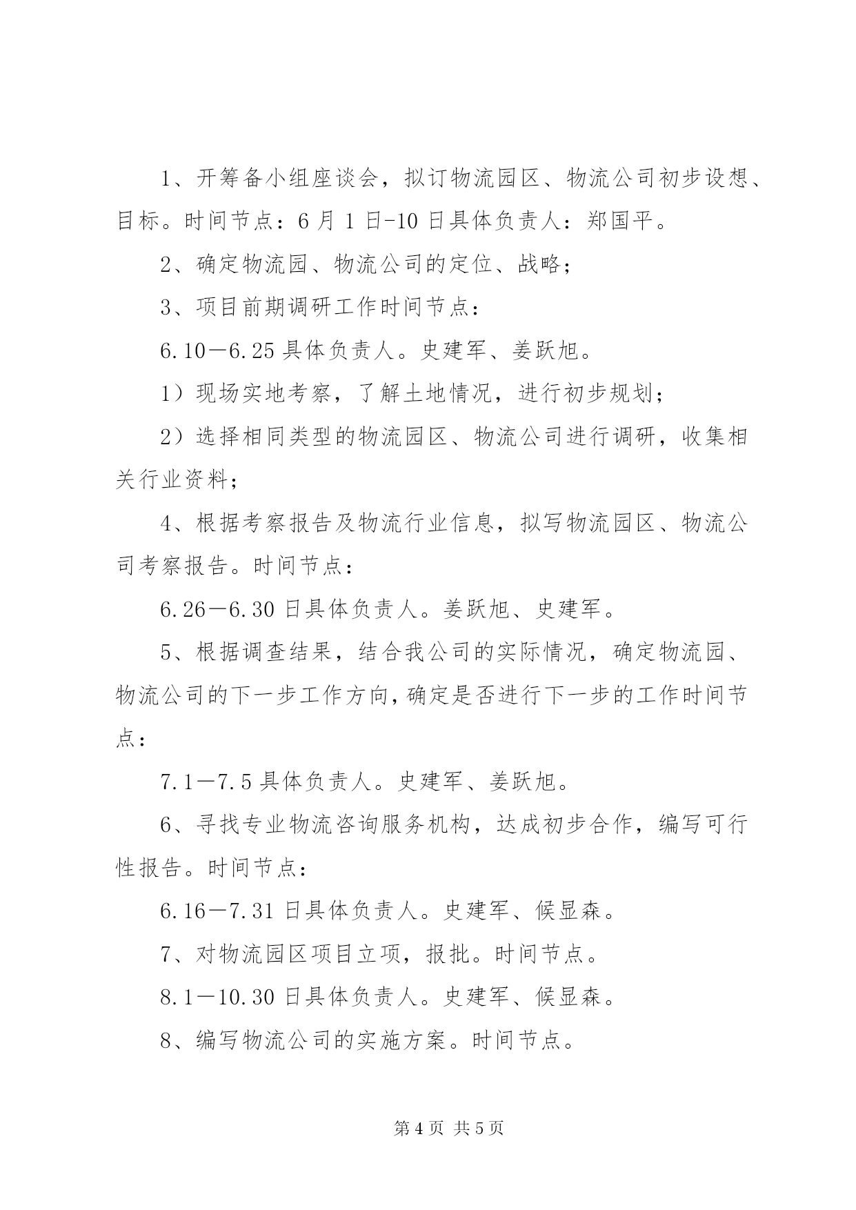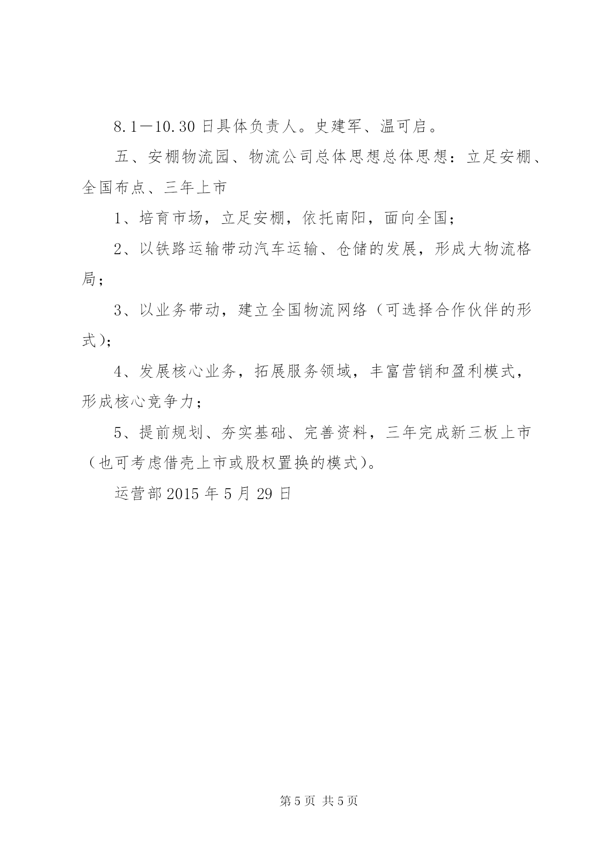 第PAGE\*Arabic\*MERGEFORMAT5页共NUMPAGES\*MERGEFORMAT5页物流园工作计划河南安棚铁路货运有限公司(以下简称。安棚公司)位于XX省XX县区安棚镇境内,与宁西铁路线安棚站紧邻,该铁路货运场及专用线于2004年开始进行项目论证,并开始办理前期手续,2007年5月动工兴建。2012年底建成投入经营。安棚公司铁路货运业务作为安棚化工城的配套项目,以临近各厂矿企业为主要服务对象,主要经营煤炭、碱及其他化工产品运输,兼顾其他货品的收发和储运。一、基础情况货运场及专用线占地300多亩,该项目是新建铁路货运场及专用线,新建到发线1条、尽端式发货线2条、牵出线1条,总共全长4.954千米。装卸车货位200多个、货物站台2座、下沉式卸储煤坑2座、货场站台仓库2座共4248平方米,可同时容纳两个整列货物列车在场装卸。建设信号楼、生产房、铁路宿舍等房建工程近20万平方米。具有配套齐全的煤炭检验实验室、两台轨道衡、一台150t汽车衡及其他办公生活配套设施。为了更好地为安棚化工城安棚碱矿等企业服务,铁路货运场到发线兼卸车线专门设计成了下沉式站台,卸煤时间短,煤炭储量大,可同时储煤30万吨以上。我站目前拥有专用设备及后期设备购置规划如下:1、自有集装箱专用运输半挂汽车11辆,后期根据业务扩展,规划自有集装箱专用运输半挂汽车扩展到50辆,挂靠车辆达到100辆,形成以铁路物流为主,汽运物流为辅的业务格局。2、自有专用集装箱正面吊一台,后期根据业务扩展,计划安装宽25米、长350米龙门吊一部。再增加专用集装箱正面吊一台。以上设备的增加可使我站具备每日100车/组的装卸车能力。3、自有装载机、履带式卸煤机5部。后期根据业务扩展,适量增加。4、自有叉车7台,后期根据业务扩展,适量增加。5、自有辅助车辆(自卸车、洒水车等)3台。二、地理位置安棚公司(安棚货运站台)位于XX省XX市XX县区安棚乡万岗村。距g312国道4公里,距g40高速公路唐河东25公里,距南阳姜营机场90公里。所处的XX县区安棚乡是远近闻名的资源宝库乡,为铁路货运提供了丰富资源。三、周边情况安棚物流园区位于XX省XX县区境内,以宁西铁路线安棚站为中心,实现铁路、公路、海运、航空交叉互通式物流无缝对接,力争成为全国能源、碱矿、石材资源的集散地。XX县区安棚化工专业园区是安棚物流园区内的重要组成部分,地处唐河、桐柏、泌阳三县交界处。该区域在天然碱、芒硝、石油等化工资源储量丰富,其中天然碱储量2.1亿吨,占全国天然碱储量在80%,位居亚洲第一、世界前列,被称为“中国天然碱之都”。近年以来,XX县区(距安棚16公里)已经形成全国石材的集散地,本地的石材石料、陶瓷等原料运输及外来石材石料的输入已经处于迸发期,对铁路运输的需求不断增加.唐河大中原石业发展有限公司是矿山资源开发与石材加工为主在现代化企业,目前开采的矿口有13个,年产石材方料39万立方,预计2015年开采的矿口达35个,年产石材方料达105万立方。XX县区陶瓷产业园规划10平方公里,用于陶瓷生产的钾长石、钠长石、石英、粘土等矿产资源丰富,总储量达4500多万吨,每年有百万吨的陶瓷生产量。唐河镍矿、南阳油田、天然气管道等大型企业的供应销售物资每年发运量都以递增速度不断增加,相信在2年内,安棚物流园区将越来越发挥更大的作用,地理交通优势将会突显,以一颗物流明星闪耀于中原大地。四、工作计划(一)、成立项目筹备组组长:李春生成员:王路明、李建强、邹爱萍、郑国平、候显森、郑雁、李文杰、姜跃旭、史建军、温可启(二)前期工作安排1、开筹备小组座谈会,拟订物流园区、物流公司初步设想、目标。时间节点:6月1日-10日具体负责人:郑国平。2、确定物流园、物流公司的定位、战略;3、项目前期调研工作时间节点:6.10-6.25具体负责人。史建军、姜跃旭。1)现场实地考察,了解土地情况,进行初步规划;2)选择相同类型的物流园区、物流公司进行调研,收集相关行业资料;4、根据考察报告及物流行业信息,拟写物流园区、物流公司考察报告。时间节点:6.26-6.30日具体负责人。姜跃旭、史建军。5、根据调查结果,结合我公司的实际情况,确定物流园、物流公司的下一步工作方向,确定是否进行下一步的工作时间节点:7.1-7.5具体负责人。史建军、姜跃旭。6、寻找专业物流咨询服务机构,达成初步合作,编写可行性报告。时间节点:6.16-7.31日具体负责人。史建军、候显森。7、对物流园区项目立项,报批。时间节点。8.1-10.30日具体负责人。史建军、候显森。8、编写物流公司的实施方案。时间节点。8.1-10.30日具体负责人。史建军、温可启。五、安棚物流园、物流公司总体思想总体思想:立足安棚、全国布点、三年上市1、培育市场,立足