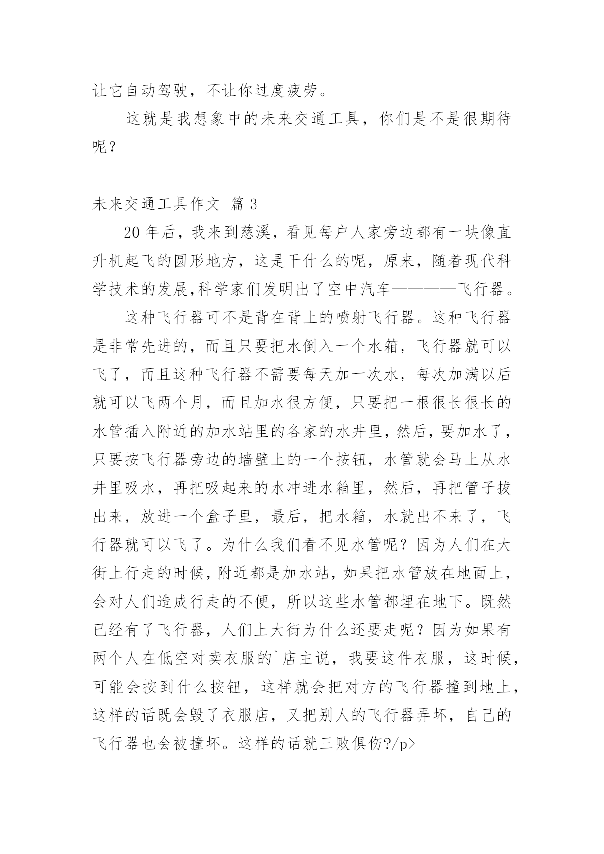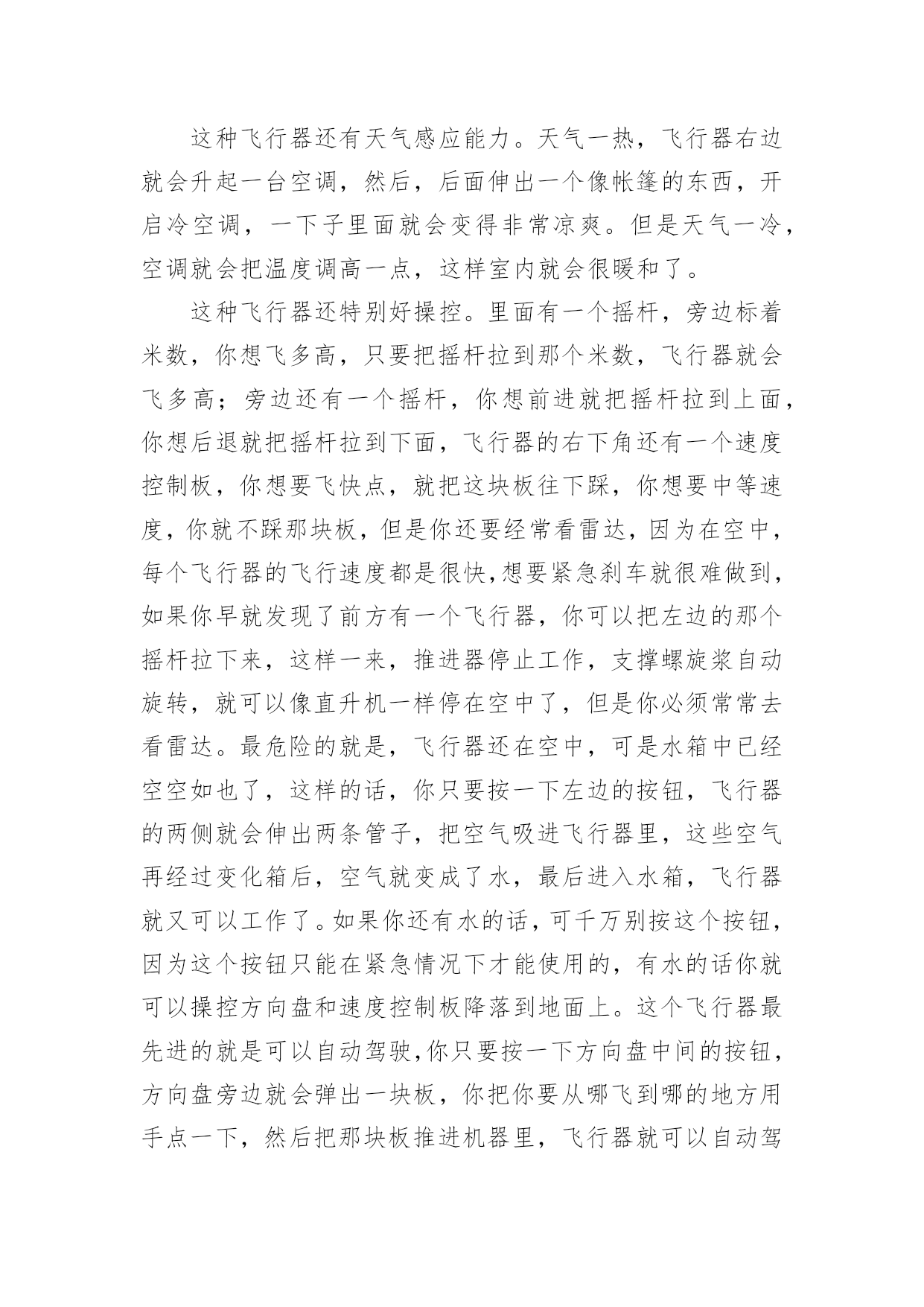未来交通工具作文(优选)未来交通工具作文3篇在平日的学习、工作和生活里,大家都尝试过写作文吧,作文是人们把记忆中所存储的有关知识、经验和思想用书面形式表达出来的记叙方式。作文的注意事项有许多,你确定会写吗?以下是小编整理的未来交通工具作文3篇,仅供参考,欢迎大家阅读。未来交通工具作文篇1随着科技的不断发展,未来的交通工具也有所改变。在20xx年,我国自主研发出一个不同寻常的交通工具。这种交通工具方便携带,用起来非常简单,很受人们喜爱。他只有一个背包大小,有红、黄、蓝、绿四种颜色的'按钮,每个按钮都有不同的作用。如果你想像鸟儿一样飞翔蓝天按一下蓝色的按钮,它就会变成一个螺旋桨,带你飞向蓝天。如果你想像鱼儿一样潜入深海,你就按一下绿色按钮,它就变成一个小型潜水艇,带你潜入海底。不用担心没有氧气,潜艇里放上植物、花草,既释放氧气又美化环境,何乐而不为呢!如果你想像汽车一样在马路上飞驰,按一下黄色按钮,它就会变成一辆小型的太阳能汽车,带着你奔驰在马路上。如果你还担心它晚上被偷走。就按一下红色按钮,它会变得非常沉重,如果小偷来了,他会黏住小偷得手,让他没办法逃脱,同时还可以自动给主人报警。这就是未来的交通工具。未来交通工具作文篇2随着人口的增长,马路上经常出现交通堵塞的情况。今天,我为大家介绍一种未来的交通工具“五角飞碟”。它的外形像一颗五角星,五颜六色,漂亮极了!它结合了汽车、飞机、轮船和潜水艇的全部功能,海、陆、空各种情况都可以随心所欲地行驶,非常方便、快捷。这个新型的交通工具绿色环保,没有尾气排放,也没有噪音,不需要汽油,只需要二氧化碳作为能源就能行驶。它还有一个天窗可以随时打开观赏美景。五个角都安装了摄像头,发现附近有危险时,可以及时躲避其它五角飞碟的撞击事故。如果发生意外事故,可以坐着玻璃软胶囊离开五角飞碟,安全逃生。五角飞碟的.五个角有驾驶室,有电脑室,有休息室,还有储藏室。它可以自动行驶,也可以手动行驶。五角飞碟有最先进的声控系统,只要你说出想去的地方,它就会及时把你送达目的地。它可以带着你去深海,发现各种稀奇古怪的鱼类;带着你去深山野林里呼吸新鲜空气;带着你去天空翱翔。五角飞碟在路上行驶能比高铁速度更快地到达目的地,不浪费你的时间。它有折叠的机翼,如果遇到马路堵塞的情况,可以在天空中自由灵活地飞行,随时随地降落。五角飞碟可以在海面上行驶,带着你去海边欣赏美景,而且它比轮船的速度更快。如果你太累了,你可以直接躺在床上睡觉,让它自动驾驶,不让你过度疲劳。这就是我想象中的未来交通工具,你们是不是很期待呢?未来交通工具作文篇320年后,我来到慈溪,看见每户人家旁边都有一块像直升机起飞的圆形地方,这是干什么的呢,原来,随着现代科学技术的发展,科学家们发明出了空中汽车————飞行器。这种飞行器可不是背在背上的喷射飞行器。这种飞行器是非常先进的,而且只要把水倒入一个水箱,飞行器就可以飞了,而且这种飞行器不需要每天加一次水,每次加满以后就可以飞两个月,而且加水很方便,只要把一根很长很长的水管插入附近的加水站里的各家的水井里,然后,要加水了,只要按飞行器旁边的墙壁上的一个按钮,水管就会马上从水井里吸水,再把吸起来的水冲进水箱里,然后,再把管子拔出来,放进一个盒子里,最后,把水箱,水就出不来了,飞行器就可以飞了。为什么我们看不见水管呢?因为人们在大街上行走的时候,附近都是加水站,如果把水管放在地面上,会对人们造成行走的不便,所以这些水管都埋在地下。既然已经有了飞行器,人们上大街为什么还要走呢?因为如果有两个人在低空对卖衣服的`店主说,我要这件衣服,这时候,可能会按到什么按钮,这样就会把对方的飞行器撞到地上,这样的话既会毁了衣服店,又把别人的飞行器弄坏,自己的飞行器也会被撞坏。这样的话就三败俱伤?/p>这种飞行器还有天气感应能力。天气一热,飞行器右边就会升起一台空调,然后,后面伸出一个像帐篷的东西,开启冷空调,一下子里面就会变得非常凉爽。但是天气一冷,空调就会把温度调高一点,这样室内就会很暖和了。这种飞行器还特别好操控。里面有一个摇杆,旁边标着米数,你想飞多高,只要把摇杆拉到那个米数,飞行器就会飞多高;旁边还有一个摇杆,你想前进就把摇杆拉到上面,你想后退就把摇杆拉到下面,飞行器的右下角还有一个速度控制板,你想要飞快点,就把这块板往下踩,你想要中等速度,你就不踩那块板,但是你还要经常看雷达,因为在空中,每个飞行器的飞行速度都是很快,想要紧急刹车就很难做到,如果你早就发现了前方有一个飞行器,你可以把左边的那个摇杆拉下来,这样一来,推进器停止工作,支撑螺旋浆自动旋转,就可以像直升机一样停在空中了,但是你必须常常去看雷达。最危险的就是,飞行器还在空中,可是水箱中已经空空如也了,这样的话,你只要按一下左边的按钮,飞行器的两侧就会伸出两条管子,把空气