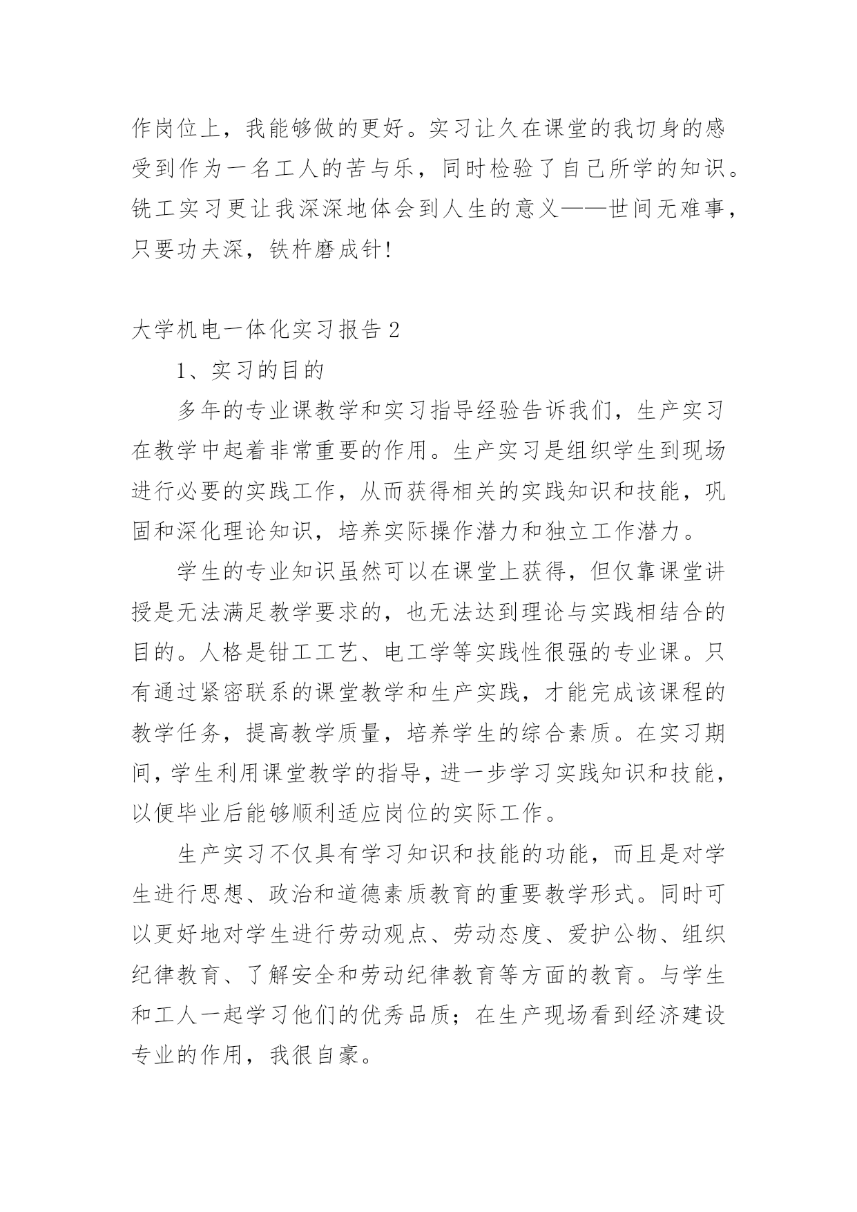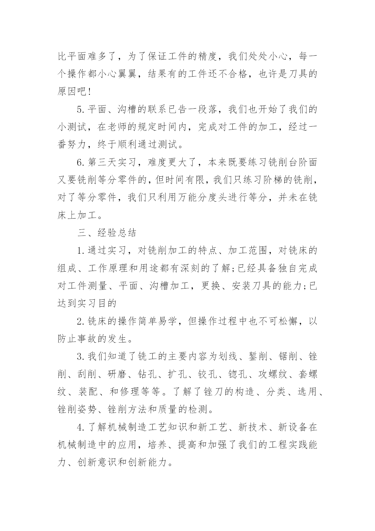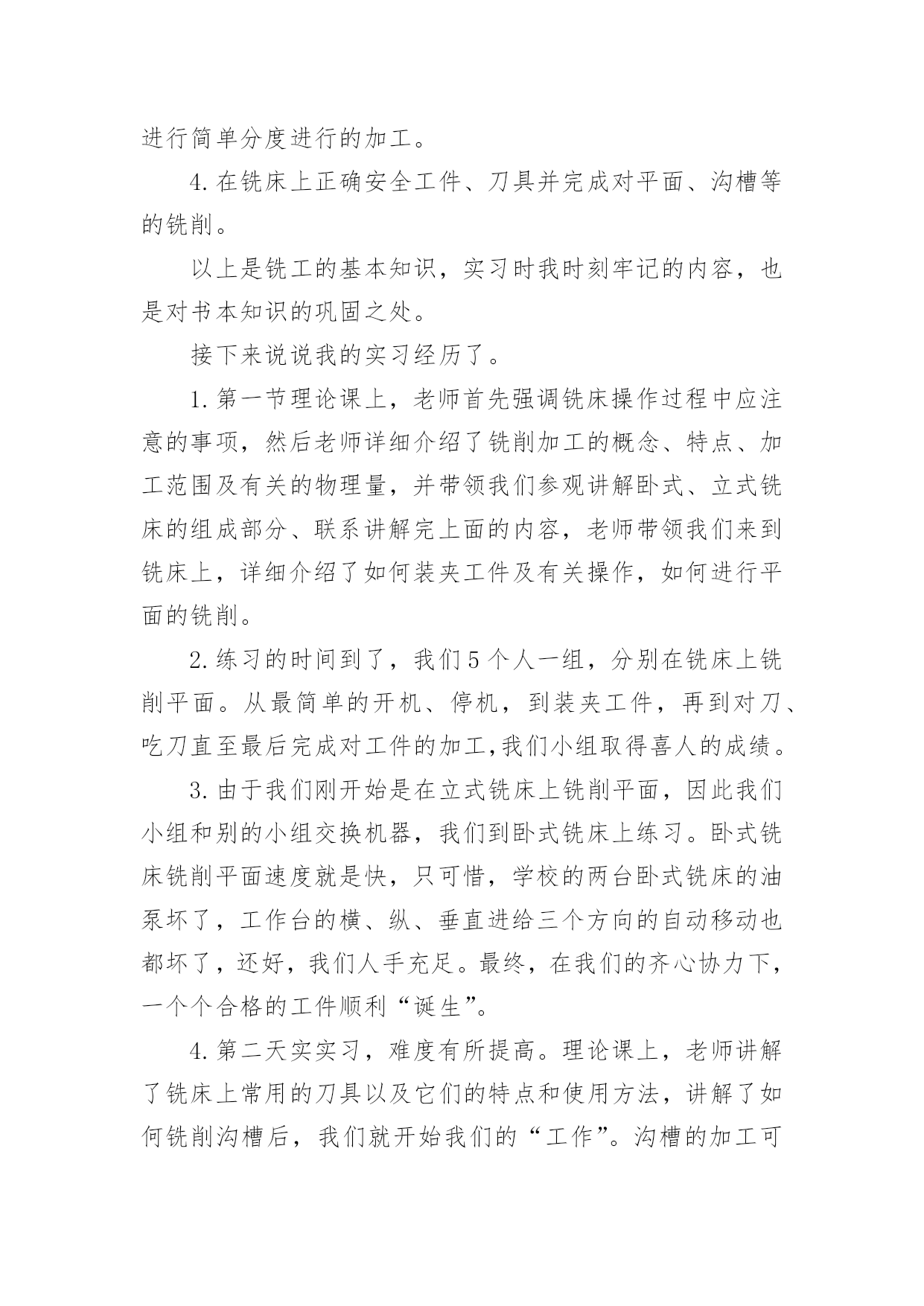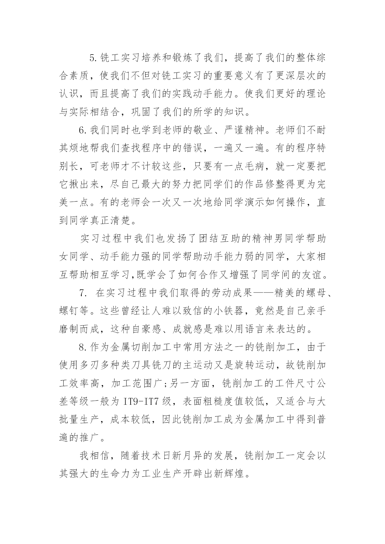 大学机电一体化实习报告在我们平凡的日常里,越来越多人会去使用报告,报告根据用途的不同也有着不同的类型。相信很多朋友都对写报告感到非常苦恼吧,下面是小编精心整理的大学机电一体化实习报告,仅供参考,希望能够帮助到大家。大学机电一体化实习报告1一、实习目的终于等到了实习的时候了,很早以前就从师兄那里打听到了有实习,那时候可以说是急切地期盼着这一天的到来,因为大家再也无法满足于课堂教学,尽管从同学朋友那里了解到实习并非像想象中的那样是一件快乐的事情。蓦然回首,转眼为期一周的铣工实习结束了。在实习期间虽然很累、很苦,但我却感到很快乐!因为我们在学到了作为一名铣工所必备的知识的同时还锻炼了自己的动手能力。而且也让我更深刻地体会到伟大的诗人李白那一名言:只要功夫深,铁杵磨成针的真正内涵!我们实习的第一天看了关于铣工实习的有关的知识与我铣工实习过程中的注意事项的碟片。看到那飞转的机器、飞溅的铁花,令我既担心又激动。担心的是,如果那飞转的机器隆隆声让人心惊肉跳和那鲜红的铁花四处飞溅的发出耀眼的的光芒令人眼花缭乱;激动的是,等待了将近一年的铣工实习就要开始了。这是作为学生的我们第一次进入工厂当令人尊敬的工人,也是第一次到每一个工科学子一试身手的实习基地。其实,对我们这些工科的学生来说这是一次理论与实践相结合的绝好机会,又将全面地检验我们知识水平。铣工实习是机械类各专业学生必修的实践性很强的技术基础课。学生在铣工实习过程中通过独立地实践操作,将有关机械制造的基本工艺知识、基本工艺方法和基本工艺实践等有机结合起来的,进行工程实践综合能力的训练及进行思想品德和素质的培养与锻练。(实习报告)铣工实习是培养学生实践能力的有效途径。又是我们大学生、工科类的大学生,院的学生的必修课,非常重要的也特别有铣工实习又是我们的一次实际掌握知识的机会,离开了课堂严谨的环境,我们会感受到车间的气氛。同时也更加感受到了当一名工人的心情,使我们更加清醒地认识到肩负的责任。通过老师的讲解。我终于明白了什么是铣工。同时也懂得了为什么有人说“当铣工是最累的!”铣工是以手工操作为主,使用各种工具来完成零件的加工、装配和修理等工作。与机械加工相比,劳动强度大、生产效率低,但是可以完成机械加工不便加工或难以完成的工作,同时设备简单,故在机械制造和修配工作中,仍是不可缺少的重要工种。铣工的常用设备有铣工工作台、台虎铣、砂轮等。二、具体内容本次实习,我主要是做铣工,所谓铣工就是根据设计零件图纸用铣床(加工零件的设备)进行零件加工的技术工人,分为初级工、高级工。零件加工精度要求高。铣工的操作要求如下:1、铣台要放在便于工作和光线适宜的地方;钻床和砂轮一般应放在场地的边缘,以保证安全。2、使用机床、工具(如钻床、砂轮、手电钻等),要经常检查,发现损坏不得使用,需要修好再用。3、台虎铣夹持工具时,不得用锤子锤击台虎手柄或钢管施加夹紧力。4、使用电动工具时,要有绝缘保护和安全接地措施。使用砂轮时,要戴好防护眼镜。在铣台上进行操作加工时要有防护网。5、毛坯和加工零件应放置在规定的位置,排列整齐、安放平稳,要保证安全,便于取放,并避免碰伤已加工的表面。6、钻孔、扩孔、铰孔、锪孔、攻螺纹、套螺纹时,工件一定要夹牢,加工通孔时要把工件垫起或让刀具对准工作台槽。7、使用钻床时,不得戴手套,不得拿棉纱操作。更换钻头等刀具时,要用专用工具。不得用锤子击打钻夹头。铣工的实习目的:1.了解铣削加工的工艺特点及加工范围。2.了解常用铣床的组成、运动和用途,了解铣床常用刀具和附件的大致结构与用途。3.熟悉铣削加工的加工方法和测量方法,了解用分度头进行简单分度进行的加工。4.在铣床上正确安全工件、刀具并完成对平面、沟槽等的铣削。以上是铣工的基本知识,实习时我时刻牢记的内容,也是对书本知识的巩固之处。接下来说说我的实习经历了。1.第一节理论课上,老师首先强调铣床操作过程中应注意的事项,然后老师详细介绍了铣削加工的概念、特点、加工范围及有关的物理量,并带领我们参观讲解卧式、立式铣床的组成部分、联系讲解完上面的内容,老师带领我们来到铣床上,详细介绍了如何装夹工件及有关操作,如何进行平面的铣削。2.练习的时间到了,我们5个人一组,分别在铣床上铣削平面。从最简单的开机、停机,到装夹工件,再到对刀、吃刀直至最后完成对工件的加工,我们小组取得喜人的成绩。3.由于我们刚开始是在立式铣床上铣削平面,因此我们小组和别的小组交换机器,我们到卧式铣床上练习。卧式铣床铣削平面速度就是快,只可惜,学校的两台卧式铣床的油泵坏了,工作台的横、纵、垂直进给三个方向的自动移动也都坏了,还好,我们人手充足。最终,在我们的齐心协力下,一个个合格的工件顺利“诞生”。4.第二天实实习,难度有所提高。理论课上,老师讲解了铣床上常用的刀具以及它们的特点和使用方法,讲