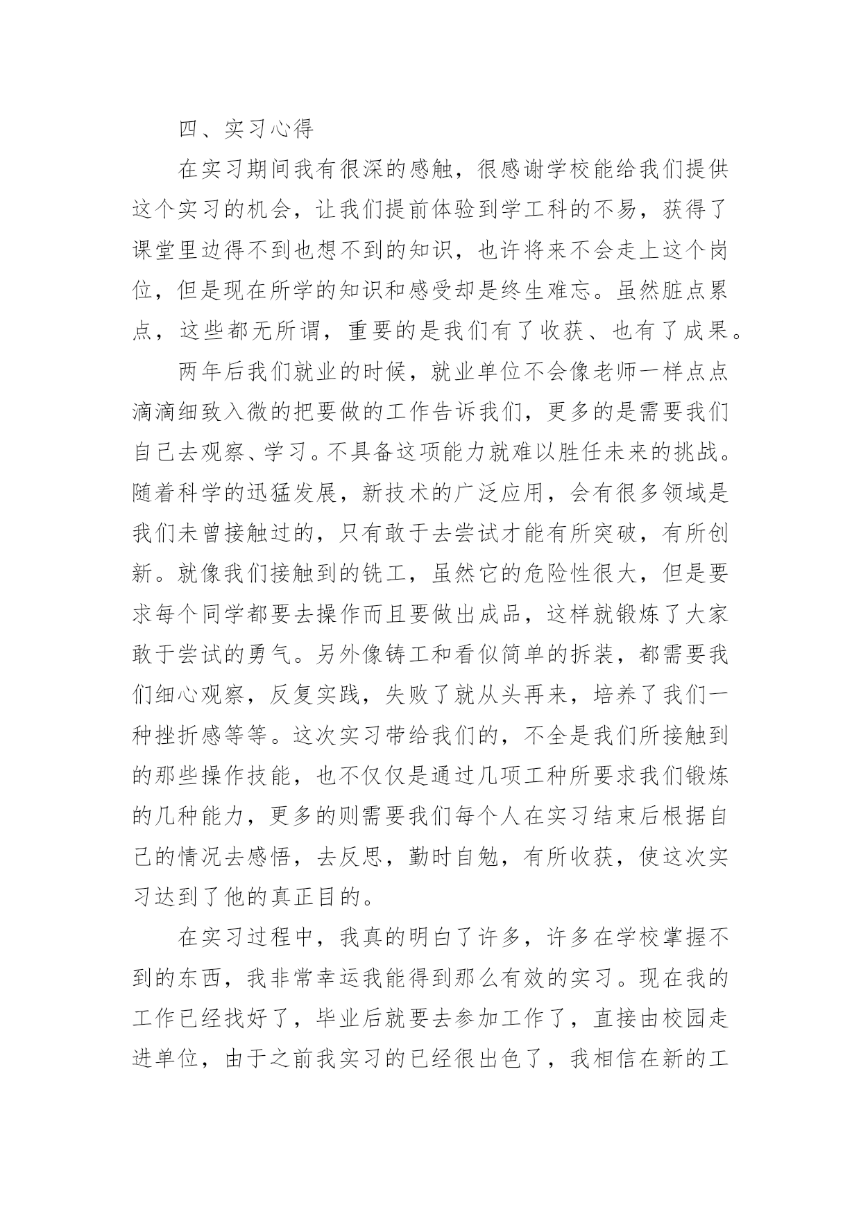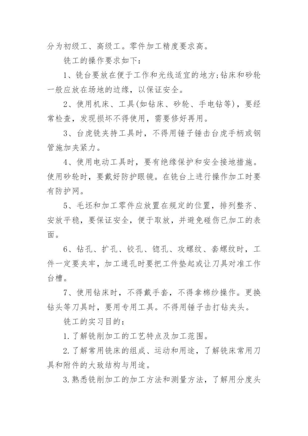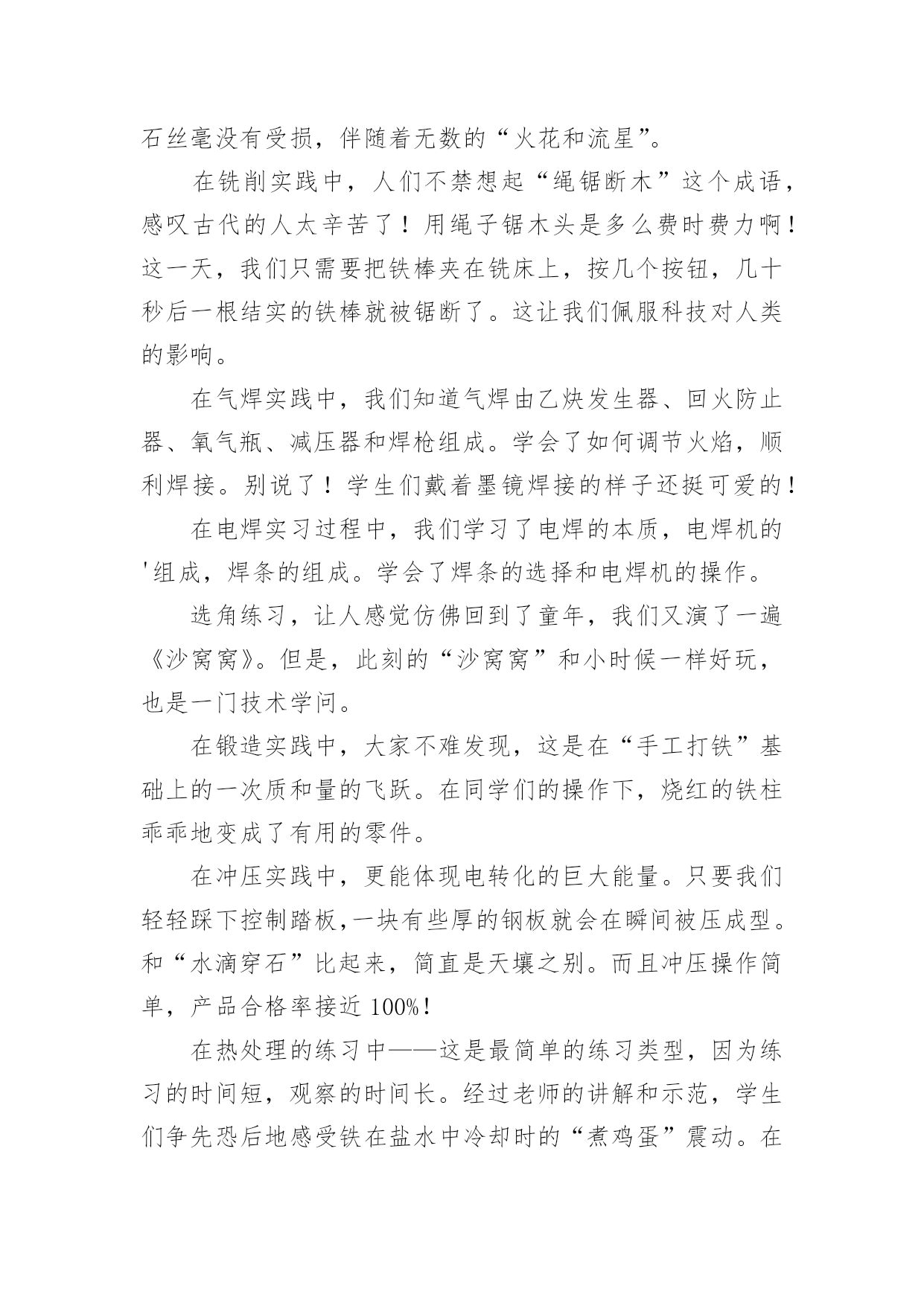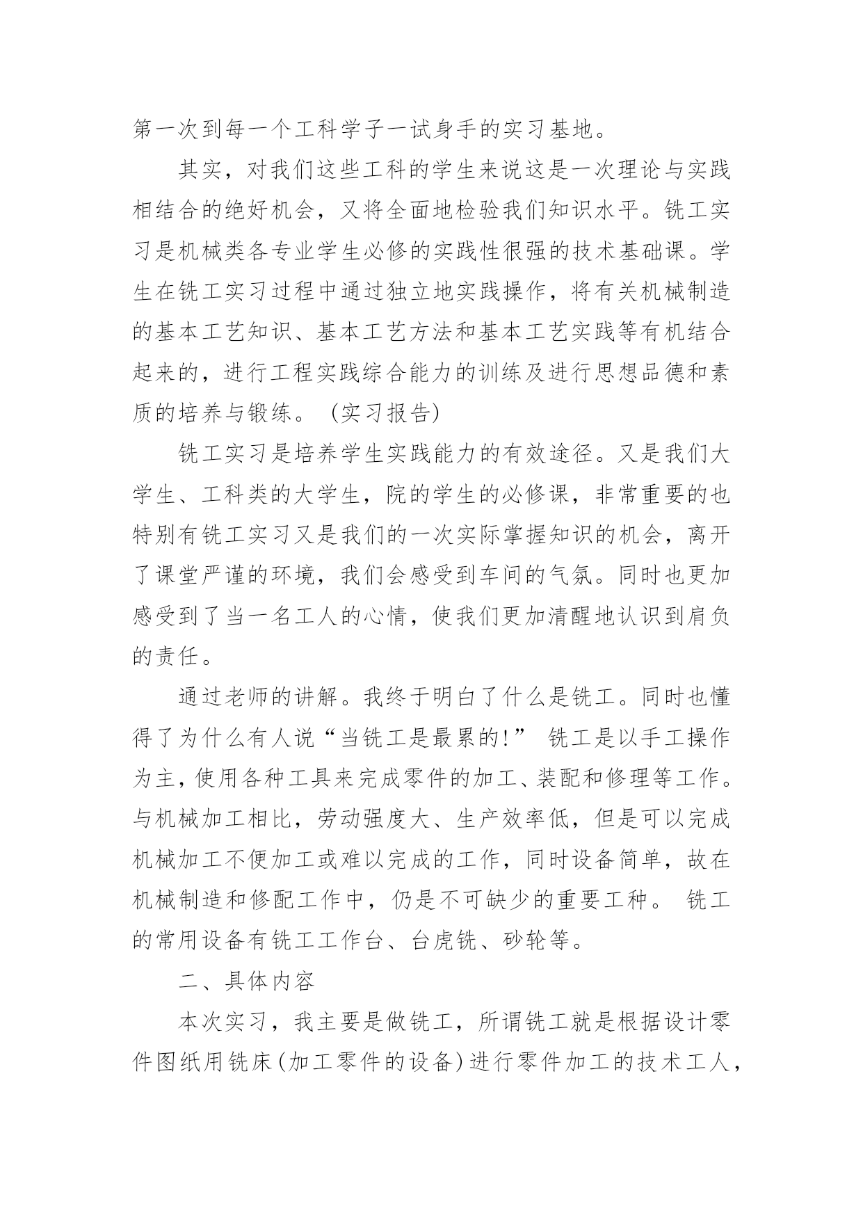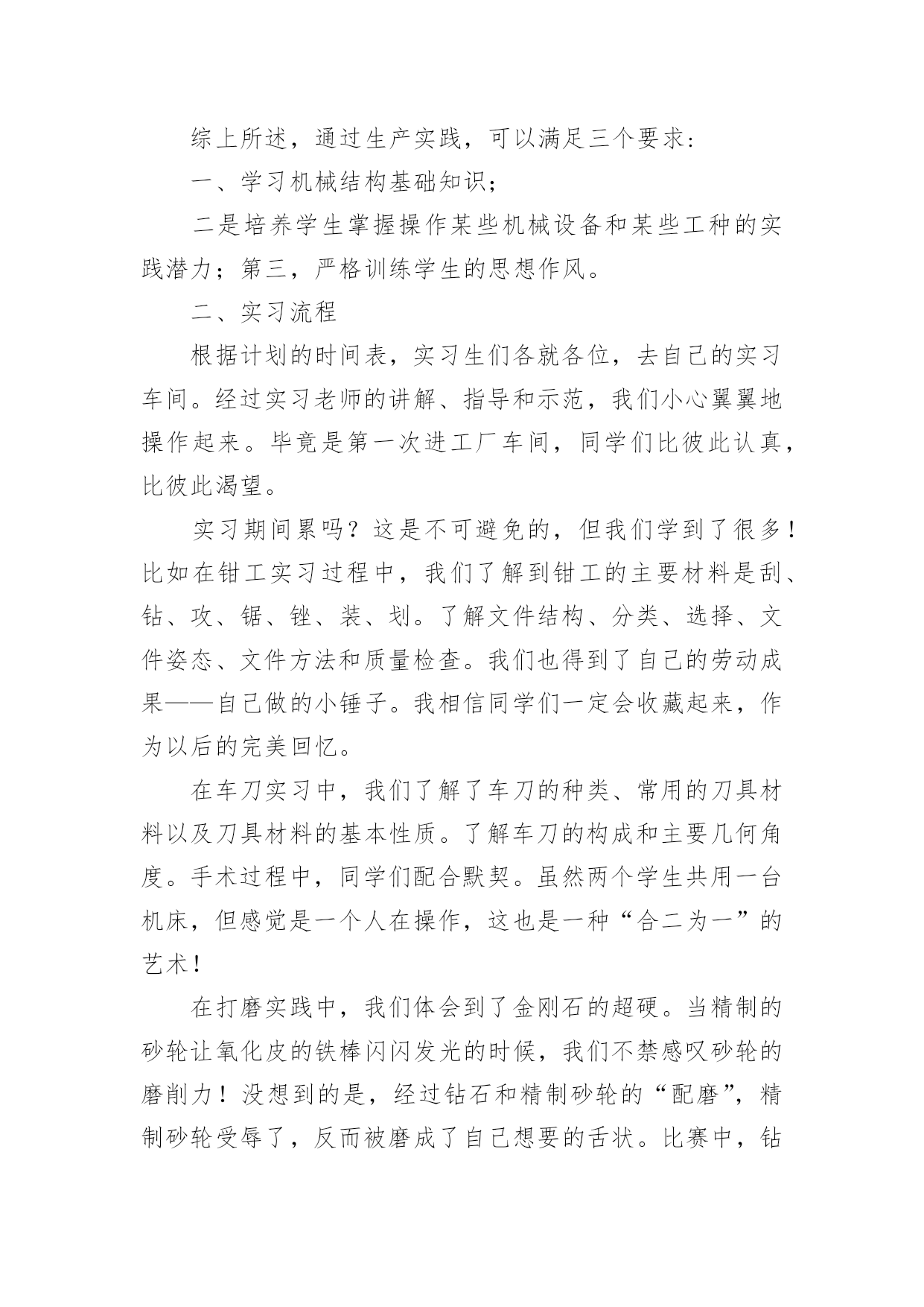 大学机电一体化实习报告在我们平凡的日常里,越来越多人会去使用报告,报告根据用途的不同也有着不同的类型。相信很多朋友都对写报告感到非常苦恼吧,下面是小编精心整理的大学机电一体化实习报告,仅供参考,希望能够帮助到大家。大学机电一体化实习报告1一、实习目的终于等到了实习的时候了,很早以前就从师兄那里打听到了有实习,那时候可以说是急切地期盼着这一天的到来,因为大家再也无法满足于课堂教学,尽管从同学朋友那里了解到实习并非像想象中的那样是一件快乐的事情。蓦然回首,转眼为期一周的铣工实习结束了。在实习期间虽然很累、很苦,但我却感到很快乐!因为我们在学到了作为一名铣工所必备的知识的同时还锻炼了自己的动手能力。而且也让我更深刻地体会到伟大的诗人李白那一名言:只要功夫深,铁杵磨成针的真正内涵!我们实习的第一天看了关于铣工实习的有关的知识与我铣工实习过程中的注意事项的碟片。看到那飞转的机器、飞溅的铁花,令我既担心又激动。担心的是,如果那飞转的机器隆隆声让人心惊肉跳和那鲜红的铁花四处飞溅的发出耀眼的的光芒令人眼花缭乱;激动的是,等待了将近一年的铣工实习就要开始了。这是作为学生的我们第一次进入工厂当令人尊敬的工人,也是第一次到每一个工科学子一试身手的实习基地。其实,对我们这些工科的学生来说这是一次理论与实践相结合的绝好机会,又将全面地检验我们知识水平。铣工实习是机械类各专业学生必修的实践性很强的技术基础课。学生在铣工实习过程中通过独立地实践操作,将有关机械制造的基本工艺知识、基本工艺方法和基本工艺实践等有机结合起来的,进行工程实践综合能力的训练及进行思想品德和素质的培养与锻练。(实习报告)铣工实习是培养学生实践能力的有效途径。又是我们大学生、工科类的大学生,院的学生的必修课,非常重要的也特别有铣工实习又是我们的一次实际掌握知识的机会,离开了课堂严谨的环境,我们会感受到车间的气氛。同时也更加感受到了当一名工人的心情,使我们更加清醒地认识到肩负的责任。通过老师的讲解。我终于明白了什么是铣工。同时也懂得了为什么有人说“当铣工是最累的!”铣工是以手工操作为主,使用各种工具来完成零件的加工、装配和修理等工作。与机械加工相比,劳动强度大、生产效率低,但是可以完成机械加工不便加工或难以完成的工作,同时设备简单,故在机械制造和修配工作中,仍是不可缺少的重要工种。铣工的常用设备有铣工工作台、台虎铣、砂轮等。二、具体内容本次实习,我主要是做铣工,所谓铣工就是根据设计零件图纸用铣床(加工零件的设备)进行零件加工的技术工人,分为初级工、高级工。零件加工精度要求高。铣工的操作要求如下:1、铣台要放在便于工作和光线适宜的地方;钻床和砂轮一般应放在场地的边缘,以保证安全。2、使用机床、工具(如钻床、砂轮、手电钻等),要经常检查,发现损坏不得使用,需要修好再用。3、台虎铣夹持工具时,不得用锤子锤击台虎手柄或钢管施加夹紧力。4、使用电动工具时,要有绝缘保护和安全接地措施。使用砂轮时,要戴好防护眼镜。在铣台上进行操作加工时要有防护网。5、毛坯和加工零件应放置在规定的位置,排列整齐、安放平稳,要保证安全,便于取放,并避免碰伤已加工的表面。6、钻孔、扩孔、铰孔、锪孔、攻螺纹、套螺纹时,工件一定要夹牢,加工通孔时要把工件垫起或让刀具对准工作台槽。7、使用钻床时,不得戴手套,不得拿棉纱操作。更换钻头等刀具时,要用专用工具。不得用锤子击打钻夹头。铣工的实习目的:1.了解铣削加工的工艺特点及加工范围。2.了解常用铣床的组成、运动和用途,了解铣床常用刀具和附件的大致结构与用途。3.熟悉铣削加工的加工方法和测量方法,了解用分度头进行简单分度进行的加工。4.在铣床上正确安全工件、刀具并完成对平面、沟槽等的铣削。以上是铣工的基本知识,实习时我时刻牢记的内容,也是对书本知识的巩固之处。接下来说说我的实习经历了。1.第一节理论课上,老师首先强调铣床操作过程中应注意的事项,然后老师详细介绍了铣削加工的概念、特点、加工范围及有关的物理量,并带领我们参观讲解卧式、立式铣床的组成部分、联系讲解完上面的内容,老师带领我们来到铣床上,详细介绍了如何装夹工件及有关操作,如何进行平面的铣削。2.练习的时间到了,我们5个人一组,分别在铣床上铣削平面。从最简单的开机、停机,到装夹工件,再到对刀、吃刀直至最后完成对工件的加工,我们小组取得喜人的成绩。3.由于我们刚开始是在立式铣床上铣削平面,因此我们小组和别的小组交换机器,我们到卧式铣床上练习。卧式铣床铣削平面速度就是快,只可惜,学校的两台卧式铣床的油泵坏了,工作台的横、纵、垂直进给三个方向的自动移动也都坏了,还好,我们人手充足。最终,在我们的齐心协力下,一个个合格的工件顺利“诞生”。4.第二天实实习,难度有所提高。理论课上,老师讲解了铣床上常用的刀具以及它们的特点和使用方法,讲