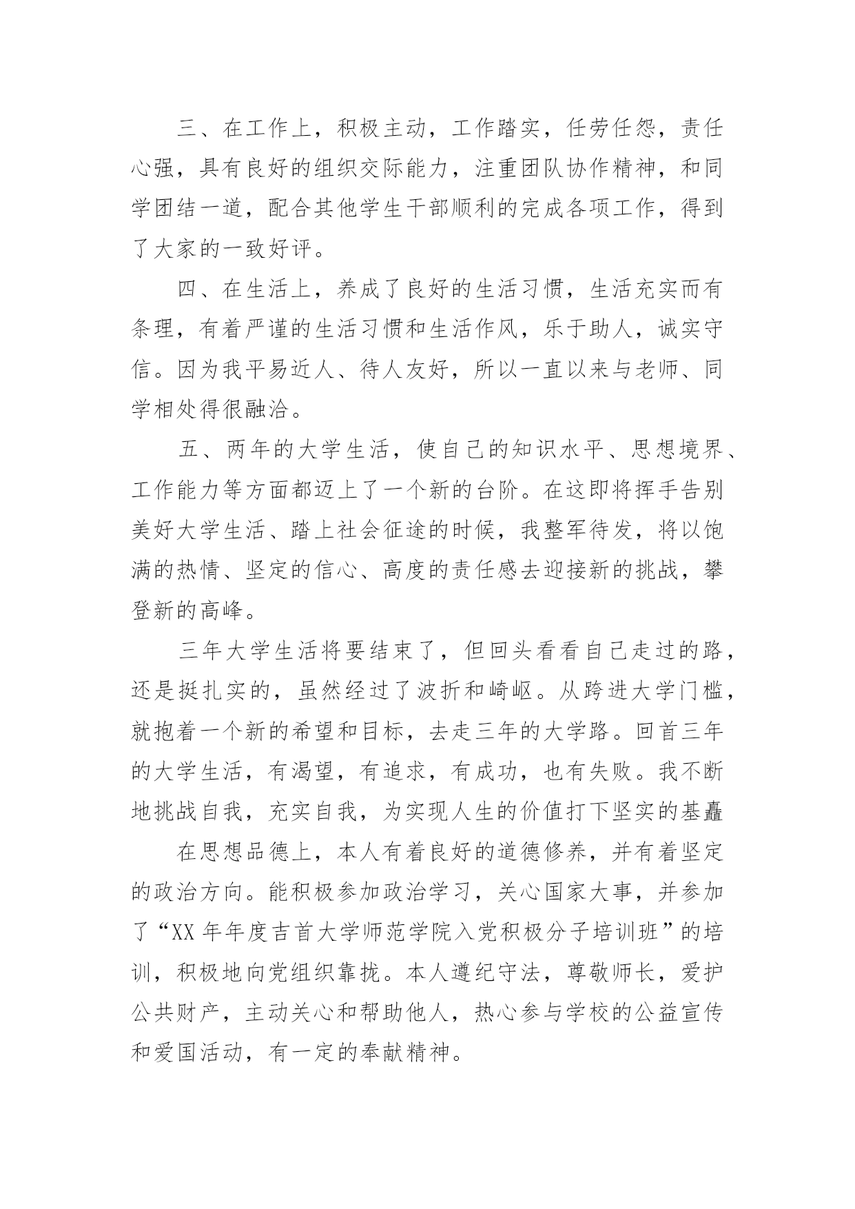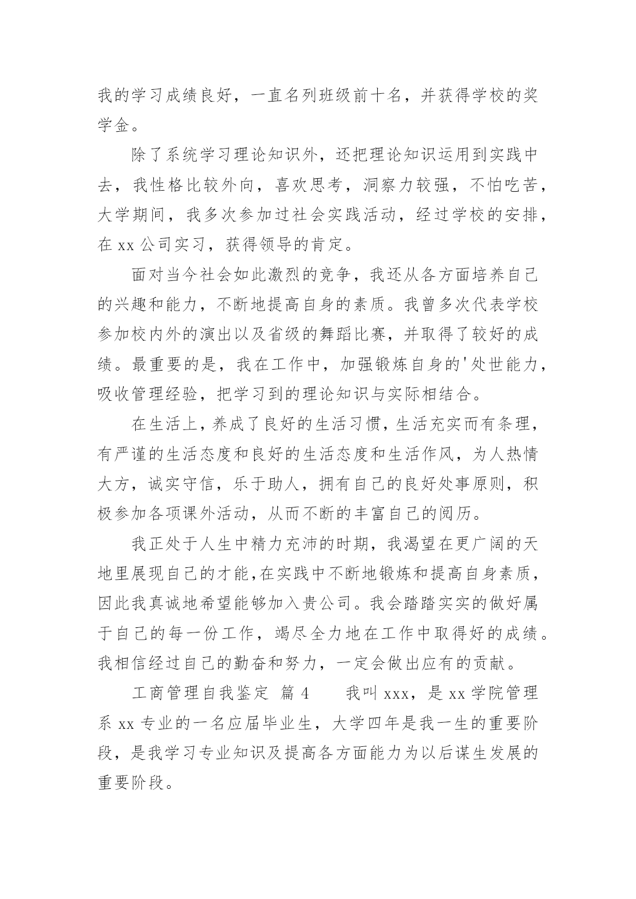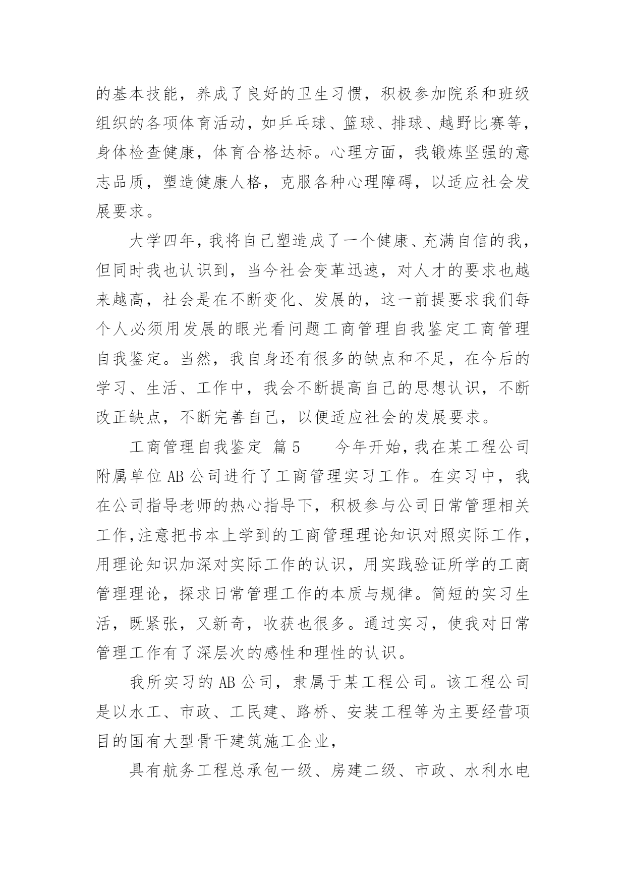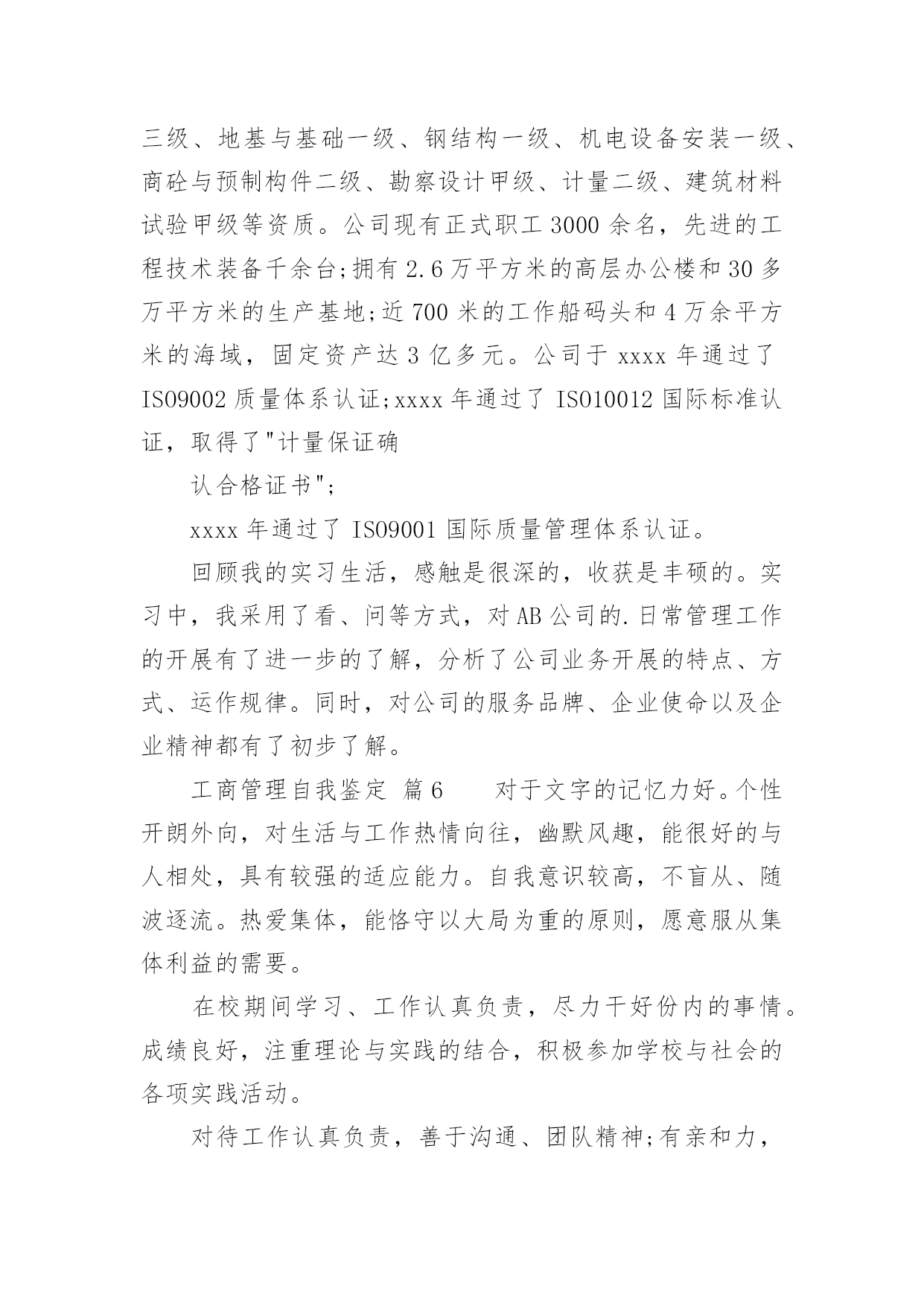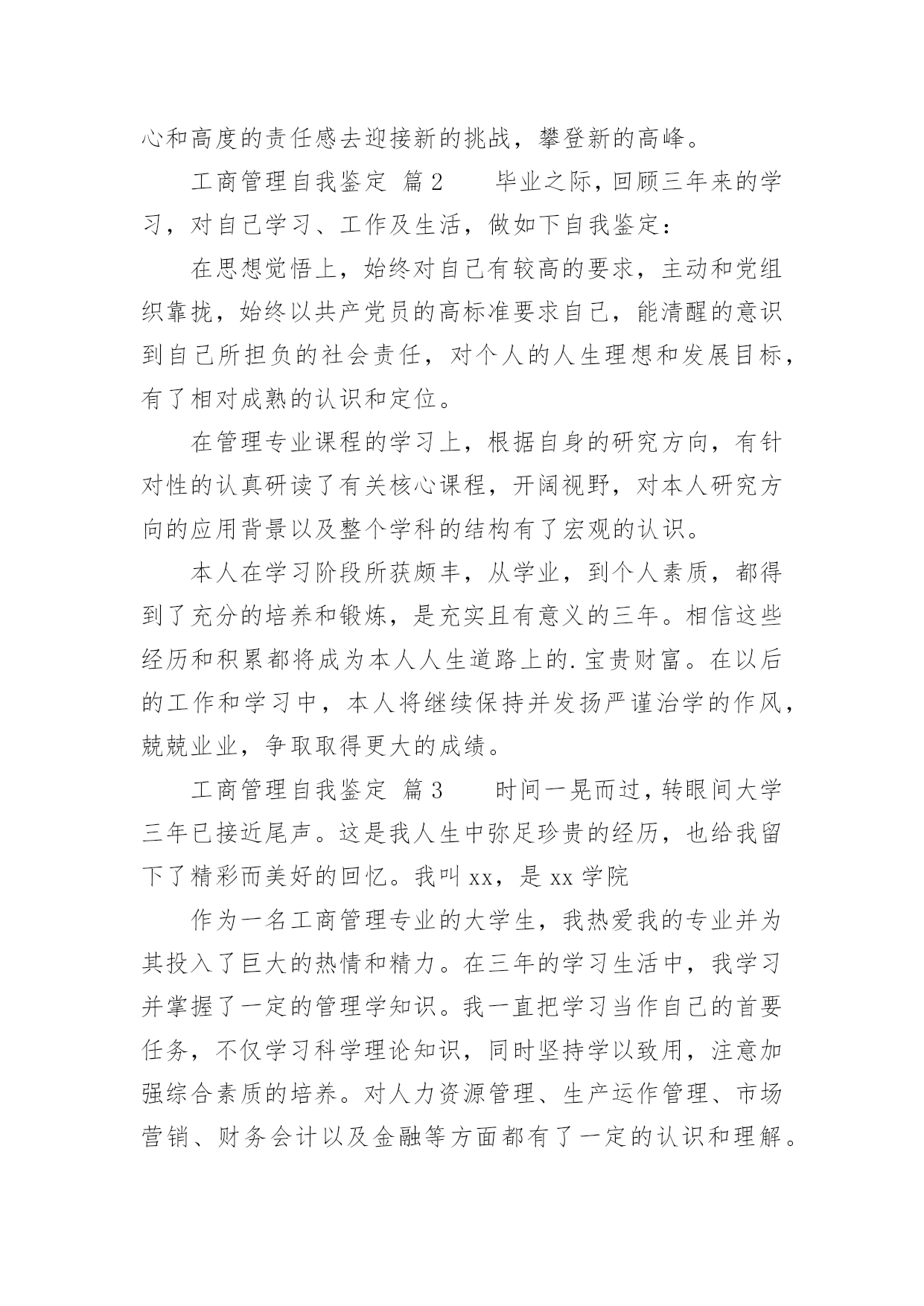 工商管理自我鉴定工商管理自我鉴定14篇自我鉴定是对一个阶段的学习或工作进行回顾检查并分析评价,它能够头脑更加清醒,目标更加明确,让我们抽出时间写写自我鉴定吧。自我鉴定一般是怎么写的呢?以下是小编精心整理的工商管理自我鉴定,欢迎大家分享。工商管理自我鉴定篇1时光流逝,三年的大专学习生活就要结束了,毕业之即,对自已三年来的学习和生活作一个总结和鉴定。一、在思想品德上,我有着良好道德修养,坚定的政治方向。在平日的学习、生活中,我积极地向党组织靠拢,使我对党有了可更为深刻的认识。并参加了学院组织的“入党积极分子”的培训。在学校遵纪守法、爱护公共设施、乐于关心和帮助他人,勇于批评与自我批评,树立了正确的人生观和价值观。并以务实求真的精神热心参与学校的公益宣传和爱国活动。二、在学习上,严格要求自己,刻苦钻研,勤奋好学,态度端正,目标明确,掌握了专业相关的知识和技能,做到理论联系实际。曾多次获得过学院荣誉。电脑、普通话等方面的等级考试已达标。除了在专业知识方面精益求精外,还利用课余时间专修计算机专业知识,使我能够熟练的操作各种办公软件,从而提高了自身的思想文化素质。身为学生的我,在修好学业的同时也注重于社会实践的积累。三、在工作上,积极主动,工作踏实,任劳任怨,责任心强,具有良好的组织交际能力,注重团队协作精神,和同学团结一道,配合其他学生干部顺利的完成各项工作,得到了大家的一致好评。四、在生活上,养成了良好的生活习惯,生活充实而有条理,有着严谨的生活习惯和生活作风,乐于助人,诚实守信。因为我平易近人、待人友好,所以一直以来与老师、同学相处得很融洽。五、两年的大学生活,使自己的知识水平、思想境界、工作能力等方面都迈上了一个新的台阶。在这即将挥手告别美好大学生活、踏上社会征途的时候,我整军待发,将以饱满的热情、坚定的信心、高度的责任感去迎接新的挑战,攀登新的高峰。三年大学生活将要结束了,但回头看看自己走过的路,还是挺扎实的,虽然经过了波折和崎岖。从跨进大学门槛,就抱着一个新的希望和目标,去走三年的大学路。回首三年的大学生活,有渴望,有追求,有成功,也有失败。我不断地挑战自我,充实自我,为实现人生的价值打下坚实的基矗在思想品德上,本人有着良好的道德修养,并有着坚定的政治方向。能积极参加政治学习,关心国家大事,并参加了“XX年年度吉首大学师范学院入党积极分子培训班”的培训,积极地向党组织靠拢。本人遵纪守法,尊敬师长,爱护公共财产,主动关心和帮助他人,热心参与学校的公益宣传和爱国活动,有一定的奉献精神。在学习上,我热爱自己的专业,学习目的明确,态度端正,钻研业务,勤奋刻苦,成绩优良;本人已初步掌握了如:篮球、足球、排球、田径、羽毛球、乒乓球、武术、游泳、健美操、体操等等的基本技术。因成绩优异多次获得学院奖学金,并荣获“07—10年度国家励志奖学金”。在生活上,我最大的特点是诚实守信,热心待人,勇于挑战自我,时间观念强,有着良好的生活习惯。由于平易近人待人友好,所以一直以来与人相处甚是融洽,连续几年担任班里的干部,同时担任系卫生部部长一职。三年的校园生活,使我自身的.综合素质、修养、为人处事能力以及交际能力等都有了质的飞跃;让我懂得了除学习以外的个人处事能力的重要性和交际能力的必要性。大学生活与社会生活是相互映射,所以大学阶段的个人综合素质与能力的培养、提高,才是我们作为当代大学生的主题,也是我以后的人生道路的主力。在工作上,本人有着高度的责任心和良好的人际关系。在出色地完成上级交予的任务外,还积极参加院内组织的活动,并配合和协助组织系里举办的活动,从中也锻炼和提高了自己的组织和领导能力。表现出较强的与人密切合作的能力和良好的环境适应能力,并且深受同学们和老师以及领导的认可。三年的大学生活,使我的知识水平、思想境界、工作能力等方面都迈上了一个新的台阶。在这即将挥手告别美好大学生活、踏上社会征途的时候,我以饱满的热情、坚定的信心和高度的责任感去迎接新的挑战,攀登新的高峰。工商管理自我鉴定篇2毕业之际,回顾三年来的学习,对自己学习、工作及生活,做如下自我鉴定:在思想觉悟上,始终对自己有较高的要求,主动和党组织靠拢,始终以共产党员的高标准要求自己,能清醒的意识到自己所担负的社会责任,对个人的人生理想和发展目标,有了相对成熟的认识和定位。在管理专业课程的学习上,根据自身的研究方向,有针对性的认真研读了有关核心课程,开阔视野,对本人研究方向的应用背景以及整个学科的结构有了宏观的认识。本人在学习阶段所获颇丰,从学业,到个人素质,都得到了充分的培养和锻炼,是充实且有意义的三年。相信这些经历和积累都将成为本人人生道路上的.宝贵财富。在以后的工作和学习中,本人将继续保持并发扬严谨治学的作风,兢兢业业,争取取得更大的成绩。工商管理自我鉴定篇3时间一晃而过,转眼间大学