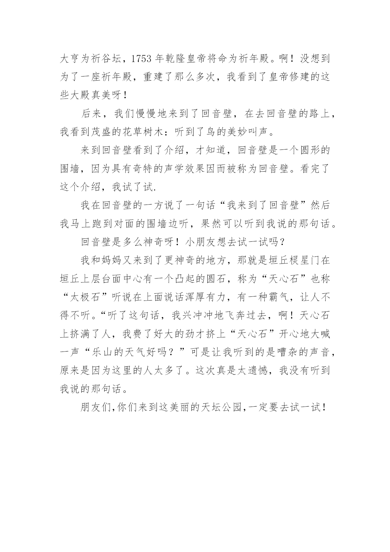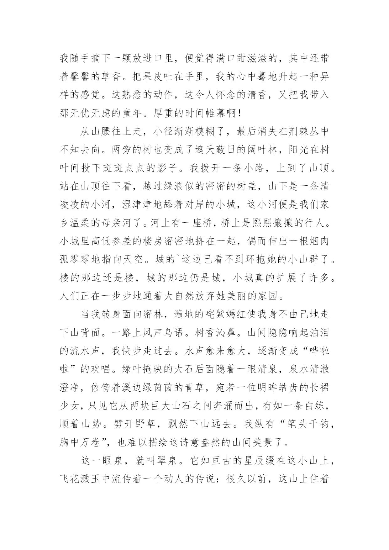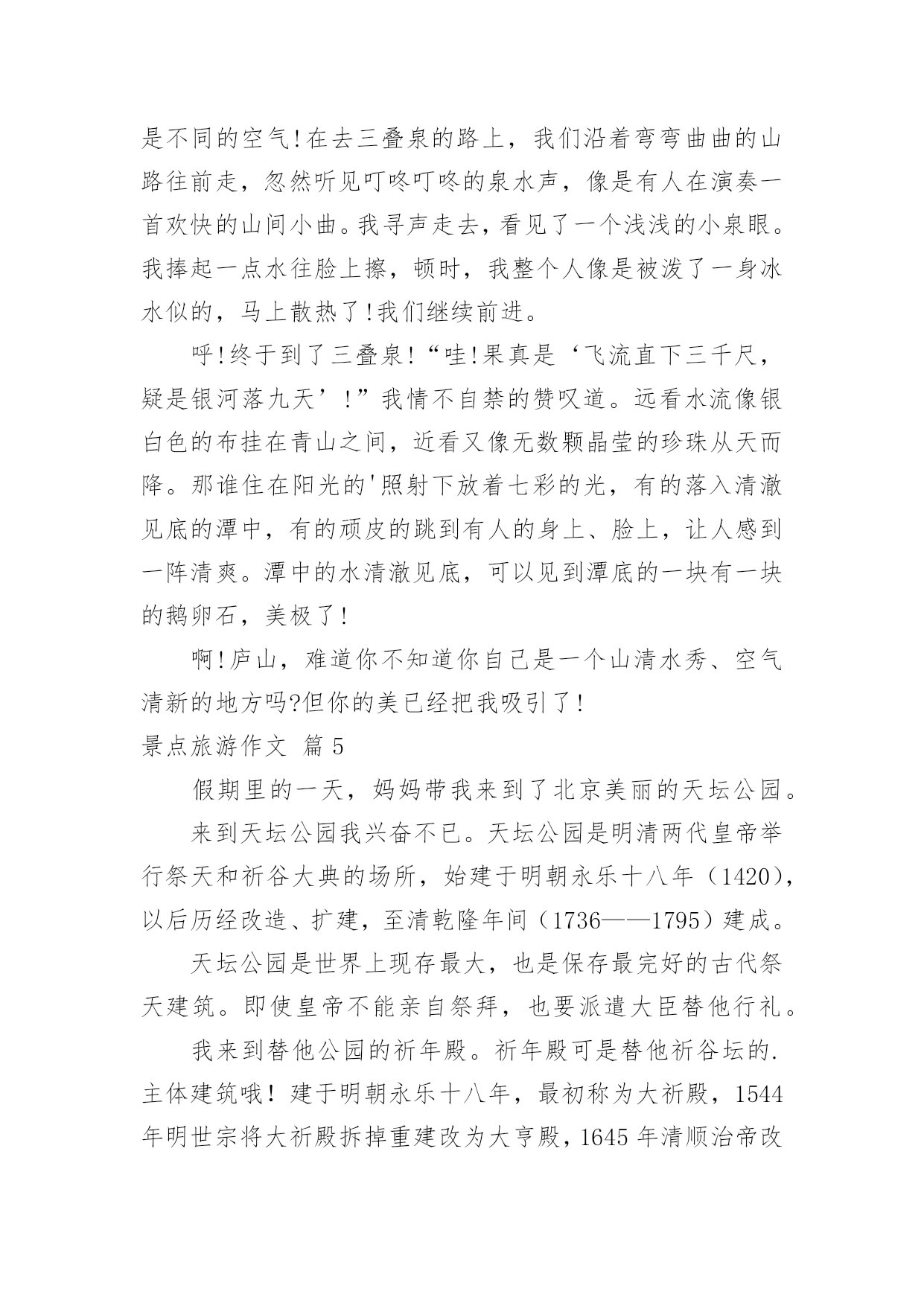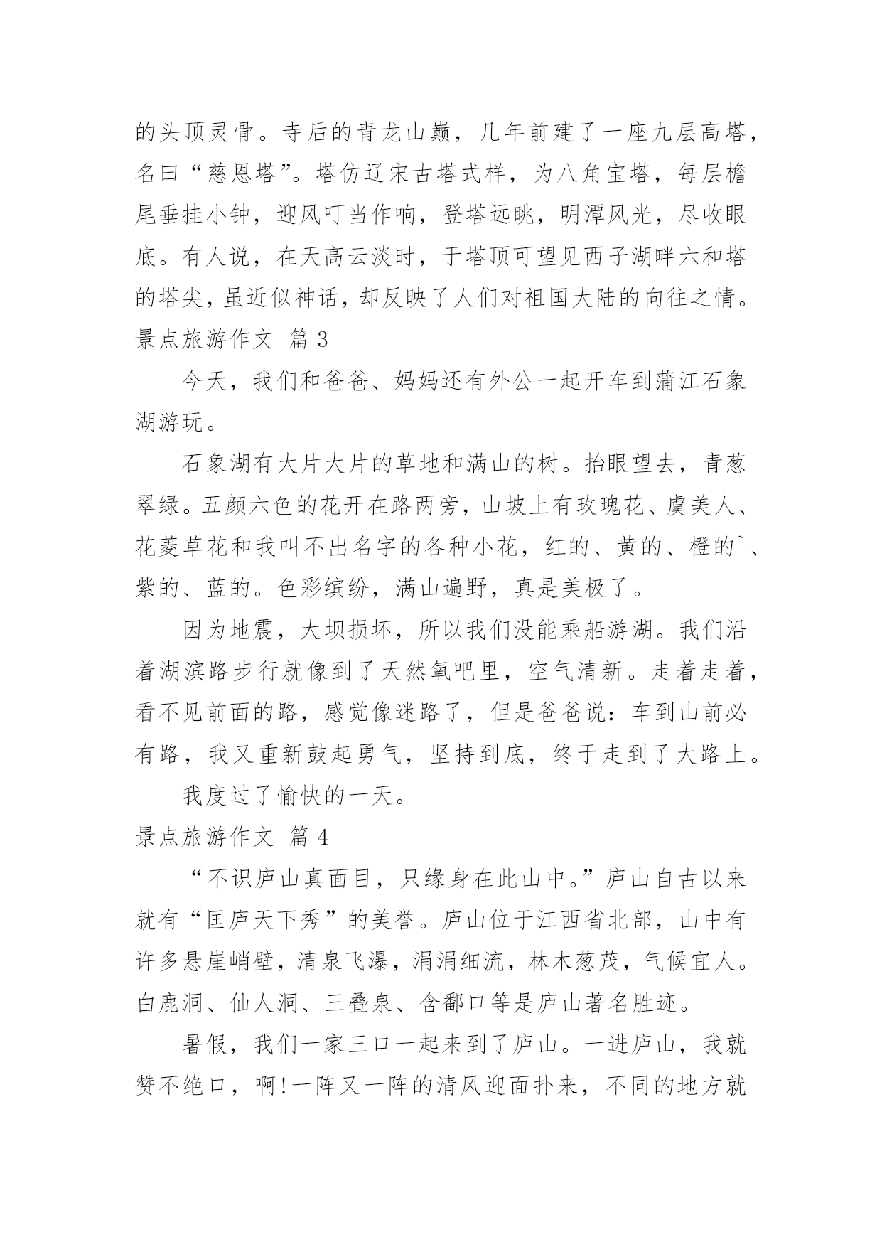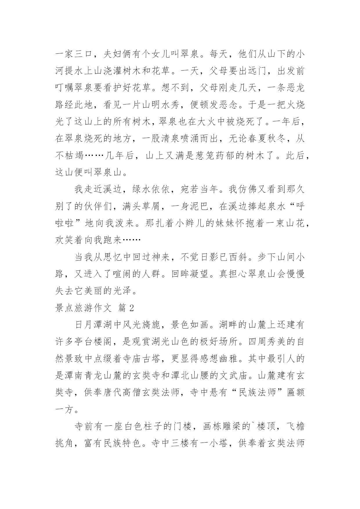 景点旅游作文实用的景点旅游作文合集五篇在平日的学习、工作和生活里,大家总少不了接触作文吧,借助作文人们可以实现文化交流的目的。相信写作文是一个让许多人都头痛的问题,下面是小编收集整理的景点旅游作文5篇,欢迎阅读,希望大家能够喜欢。景点旅游作文篇1在我美丽的故乡西郊有一座小山名为翠泉山。近年来,由于经济的发展,城郊的小山几乎全被开发了,翠泉山却奇迹般地幸存下来。从小城隔水望去,山上满是郁郁葱葱的树木,在阳光的照报下,闪着翠绿剔透的光。是的。故乡是我童年的摇篮,而翠泉山是这摇篮里的一颗明珠。踏着金色的阳光,我又来到翠泉山下。小山悠悠,回忆悠悠……记得山脚下有一块草地,上面长着蒲公英、石韭菜、野菊花和许多不知名的花花草草。在春天里它是五彩缤纷的,我和小伙伴们常常踩碎晶莹的露珠,把毛茸茸的蒲公英吹离花托,看它乘风飘向远处。夏天里草地是软绵绵的,我们在上面打滚、奔跑,那时觉得这草地真是一个无比宽阔的天地。长大后,重踏这昔日的草地。却发现它只不过有半个篮球场大罢了。在草地的那边,有一条清幽的小径蜿蜒而上。我举步拾级,两旁是苍劲的松树和缀满了珊瑚株般山捻子的灌木丛。我随手摘下一颗放进口里,便觉得满口甜滋滋的,其中还带着馨馨的草香。把果皮吐在手里,我的心中蓦地升起一种异样的感觉。这熟悉的动作,这令人怀念的清香,又把我带入那无优无虑的童年。厚重的时间帷幕啊!从山腰往上走,小径渐渐模糊了,最后消失在荆棘丛中不知去向。两旁的树也变成了遮夭蔽日的阔叶林,阳光在树叶间投下斑斑点点的影子。我拨开一条小路,上到了山顶。站在山顶往下看,越过绿浪似的密密的树盖,山下是一条清凌凌的小河,湿津津地舔着对岸的小城,这小河便是我们家乡温柔的母亲河了。河上有一座桥,桥上是熙熙攘攘的行人。小城里高低参差的楼房密密地挤在一起,偶而伸出一根烟肉孤零零地指向天空。城的`这边已看不到环抱她的小山群了。楼的那边还是楼,城的那边仍是城,小城真的扩展了许多。人们正在一步步地通着大自然放弃她美丽的家园。当我转身面向密林,遍地的咤紫嫣红使我身不由己地走下山背面。一路上风声鸟语。树香沁鼻。山间隐隐响起泊泪的流水声,我快步走过去。水声愈来愈大,逐渐变成“哗啦啦”的欢唱。绿叶掩映的大石后面隐着一眼清泉,泉水清澈澄净,依傍着溪边绿茵茵的青草,宛若一位明眸皓齿的长裙少女,只见它从两块巨大山石之间奔涌而出,有如一条白练,顺着山势。劈开野草,飘然下山远去。我纵有“笔头千钧,胸中万卷”,也难以描绘这诗意盎然的山间美景了。这一眼泉,就叫翠泉。它如亘古的星辰缀在这小山上,飞花溅玉中流传着一个动人的传说:很久以前,这山上住着一家三口,夫妇俩有个女儿叫翠泉。每天,他们从山下的小河提水上山浇灌树木和花草。一天,父母要出远门,出发前叮嘱翠泉要看护好花草。想不到,父母刚走几天,一条恶龙路经此地,看见一片山明水秀,便顿发恶念。于是一把火烧光了这山上的所有树木,翠泉也在大火中被烧死了。一年后,在翠泉烧死的地方,一股清泉喷涌而出,无论春夏秋冬,从不枯竭……几年后,山上又满是葱笼药郁的树木了。此后,这山便叫翠泉山。我走近溪边,绿水依依,宛若当年。我仿佛又看到那久别了的伙伴们,满头草屑,一身泥巴,在溪边捧起泉水“呼啦啦”地向我泼来。那扎着小辫儿的妹妹怀抱着一束山花,欢笑着向我跑来……当我从思忆中回过神来,不觉日影已西斜。步下山间小路,又进入了喧闹的人群。回眸凝望。真担心翠泉山会慢慢失去它美丽的光泽。景点旅游作文篇2日月潭湖中风光旖旎,景色如画。湖畔的山麓上还建有许多亭台楼阁,是观赏湖光山色的极好场所。四周秀美的自然景致中点缀着寺庙古塔,更显得感想幽雅。其中最引人的是潭南青龙山麓的玄奘寺和潭北山腰的文武庙。山麓建有玄奘寺,供奉唐代高僧玄奘法师,寺中悬有“民族法师”匾额一方。寺前有一座白色柱子的门楼,画栋雕梁的`楼顶,飞檐挑角,富有民族特色。寺中三楼有一小塔,供奉着玄奘法师的头顶灵骨。寺后的青龙山巅,几年前建了一座九层高塔,名曰“慈恩塔”。塔仿辽宋古塔式样,为八角宝塔,每层檐尾垂挂小钟,迎风叮当作响,登塔远眺,明潭风光,尽收眼底。有人说,在天高云淡时,于塔顶可望见西子湖畔六和塔的塔尖,虽近似神话,却反映了人们对祖国大陆的向往之情。景点旅游作文篇3今天,我们和爸爸、妈妈还有外公一起开车到蒲江石象湖游玩。石象湖有大片大片的草地和满山的树。抬眼望去,青葱翠绿。五颜六色的花开在路两旁,山坡上有玫瑰花、虞美人、花菱草花和我叫不出名字的各种小花,红的、黄的、橙的`、紫的、蓝的。色彩缤纷,满山遍野,真是美极了。因为地震,大坝损坏,所以我们没能乘船游湖。我们沿着湖滨路步行就像到了天然氧吧里,空气清新。走着走着,看不见前面的路,感觉像迷路了,但是爸爸说:车到山前必有路,我又重新鼓起勇气,坚持到底,终于走到了大路上。我度过了愉快的一天。景点旅游作文
