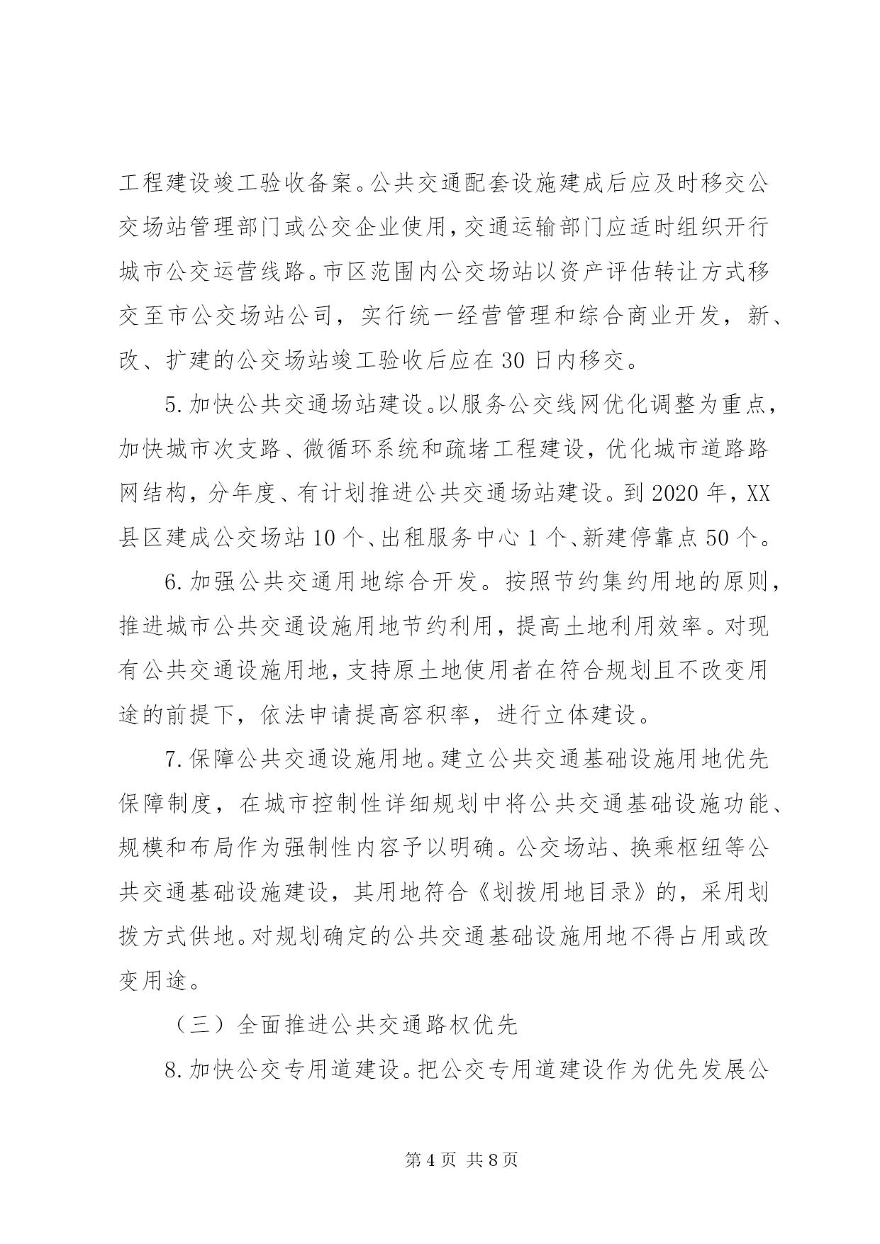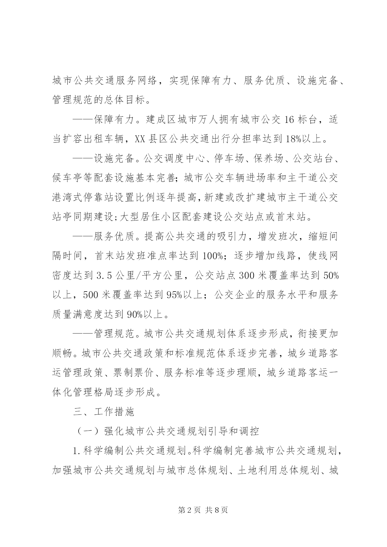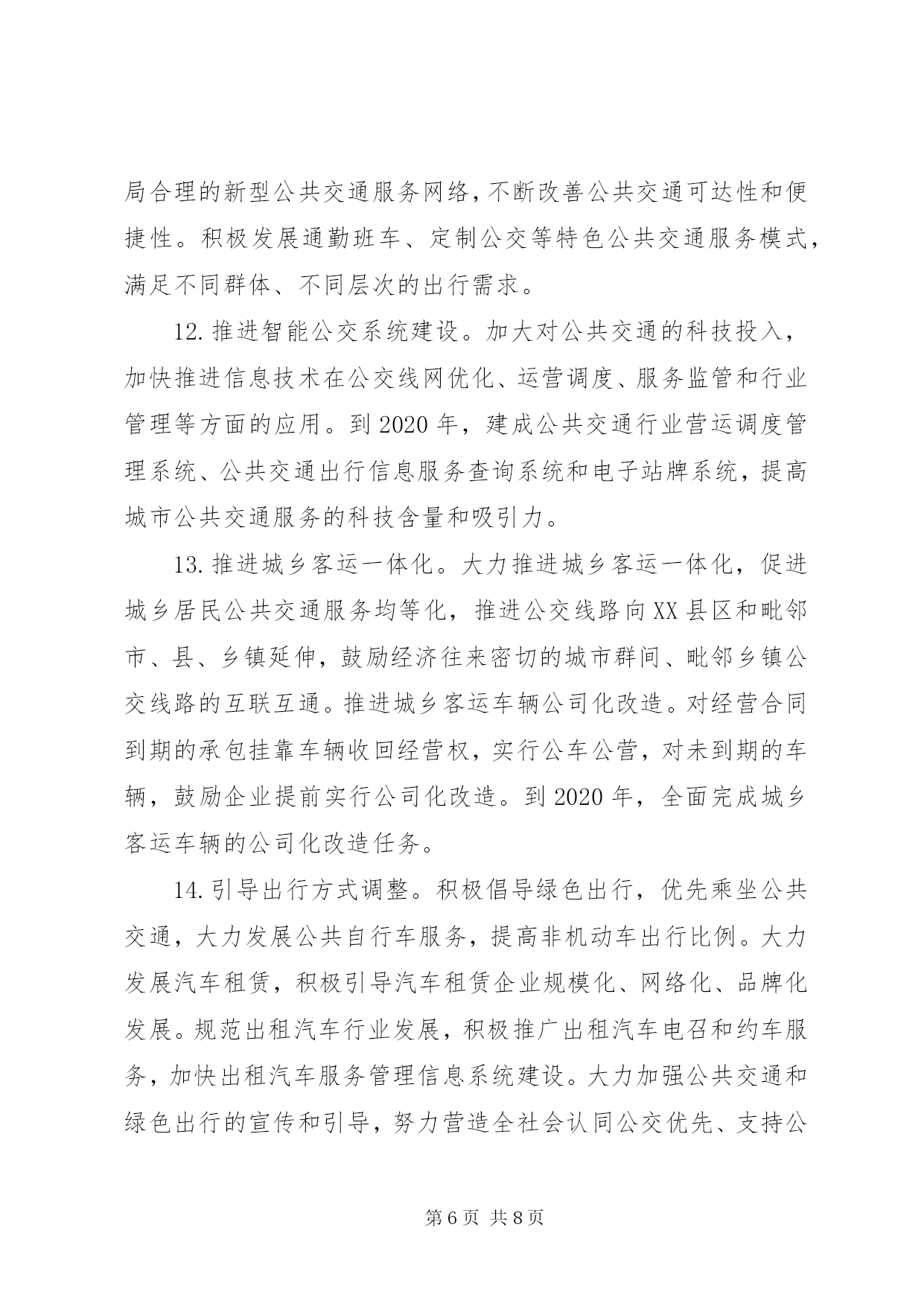 第PAGE\*Arabic\*MERGEFORMAT8页共NUMPAGES\*MERGEFORMAT8页发展城市公共交通方案范文下面是我们文秘114的小编为大家整理的发展城市公共交通方案范文,请大家参阅。为认真贯彻落实《国务院关于城市优先发展公共交通的指导意见》(国发〔2012〕64号)和《省政府关于进一步落实城市公共交通优先发展战略的实施意见》(xx政发〔xx〕xx号)等文件精神,进一步确立公共交通在城市交通中的优先地位,提高城市公共交通服务水平,结合我县实际,现提出如下实施意见。一、指导思想以党的十八届精神为指导,加快转变城市交通发展方式,将公共交通发展放在城市交通发展的首要位置,坚持“方便群众、优先发展、统筹规划、分步实施、政府主导、政策扶持”的发展原则,在财政投入、规划布局、设施用地、路权分配等方面对城市公共交通发展给予优先保障。通过体制、机制创新,科学编制城市公交规划,统筹发展,做好各种出行方式有机衔接,逐步实现城乡道路客运一体化,为市民提供方便周到、便捷高效、经济舒适、绿色环保、安全可靠的公交服务,形成城市公共交通优先发展的新格局。二、工作目标到2020年,基本确立公共交通在城市交通系统中的主体地位,建立以XX县区为中心,十字、章集、七雄和扎下为节点的城市公共交通服务网络,实现保障有力、服务优质、设施完备、管理规范的总体目标。——保障有力。建成区城市万人拥有城市公交16标台,适当扩容出租车辆,XX县区公共交通出行分担率达到18%以上。——设施完备。公交调度中心、停车场、保养场、公交站台、候车亭等配套设施基本完善;城市公交车辆进场率和主干道公交港湾式停靠站设置比例逐年提高,新建或改扩建城市主干道公交站亭同期建设;大型居住小区配套建设公交站点或首末站。——服务优质。提高公共交通的吸引力,增发班次,缩短间隔时间,首末站发班准点率达到100%;逐步增加线路,使线网密度达到3.5公里/平方公里,公交站点300米覆盖率达到50%以上,500米覆盖率达到95%以上;公交企业的服务水平和服务质量满意度达到90%以上。——管理规范。城市公共交通规划体系逐步形成,衔接更加顺畅。城市公共交通政策和标准规范体系逐步完善,城乡道路客运管理政策、票制票价、服务标准等逐步理顺,城乡道路客运一体化管理格局逐步形成。三、工作措施(一)强化城市公共交通规划引导和调控1.科学编制公共交通规划。科学编制完善城市公共交通规划,加强城市公共交通规划与城市总体规划、土地利用总体规划、城市综合交通规划等其它相关规划的衔接。科学合理布局公交线网和公共交通场站,优化重要交通节点设置。明确各种公共交通方式的功能定位,加强公共交通与个体机动化交通之间的换乘衔接,促进城市内外交通便利衔接和城乡公共交通一体化发展。2.严格执行规划管理制度。按照《xx省城市公共交通规划导则》的要求,加快城市公共交通规划编制和修订完善工作。严格规划修编程序,禁止随意修改和变更城市公共交通规划,原则上每5年进行一次修编,并在修编前开展居民出行调查。规划编制、修编和居民出行调查所需经费纳入地方财政预算。交通运输、规划部门要定期对规划编制和执行情况进行监督检查,确保规划得到有效落实。(二)加快完善城市公共交通基础设施建设3.积极发展快速公共交通。根据道路状况和客流情况制订快速公共交通发展规划,结合XX县区道路改造,要针对性地快速路可行性研究,不断加快快速公交发展。4.强化公共交通配套设施建设管理。加快制订城市建设项目公共交通场站配建管理政策,新、改、扩建大型居住区、商务区、开发区、教学区、风景区、XX县区等主体建设项目上要严格落实公共交通配套设施建设标准,实行同步设计、建设、验收、投入使用。对未按照规划条件和规划许可落实公共交通配套设施的建设项目,规划部门不予办理核实手续,住房城乡建设部门不予工程建设竣工验收备案。公共交通配套设施建成后应及时移交公交场站管理部门或公交企业使用,交通运输部门应适时组织开行城市公交运营线路。市区范围内公交场站以资产评估转让方式移交至市公交场站公司,实行统一经营管理和综合商业开发,新、改、扩建的公交场站竣工验收后应在30日内移交。5.加快公共交通场站建设。以服务公交线网优化调整为重点,加快城市次支路、微循环系统和疏堵工程建设,优化城市道路路网结构,分年度、有计划推进公共交通场站建设。到2020年,XX县区建成公交场站10个、出租服务中心1个、新建停靠点50个。6.加强公共交通用地综合开发。按照节约集约用地的原则,推进城市公共交通设施用地节约利用,提高土地利用效率。对现有公共交通设施用地,支持原土地使用者在符合规划且不改变用途的前提下,依法申请提高容积率,进行立体建设。7.保障公共交通设施用地。建立公共交通基础设施用地优先保障制度,在城市控制性详细