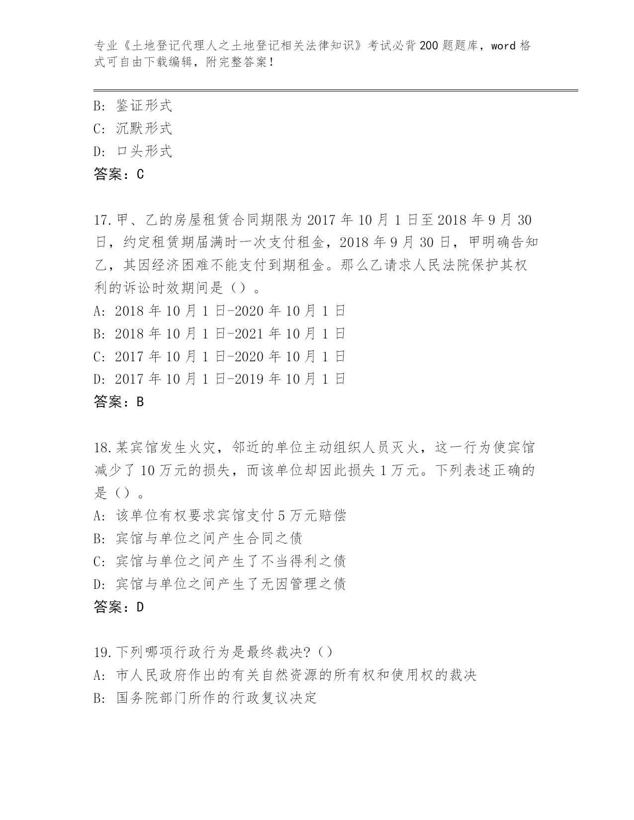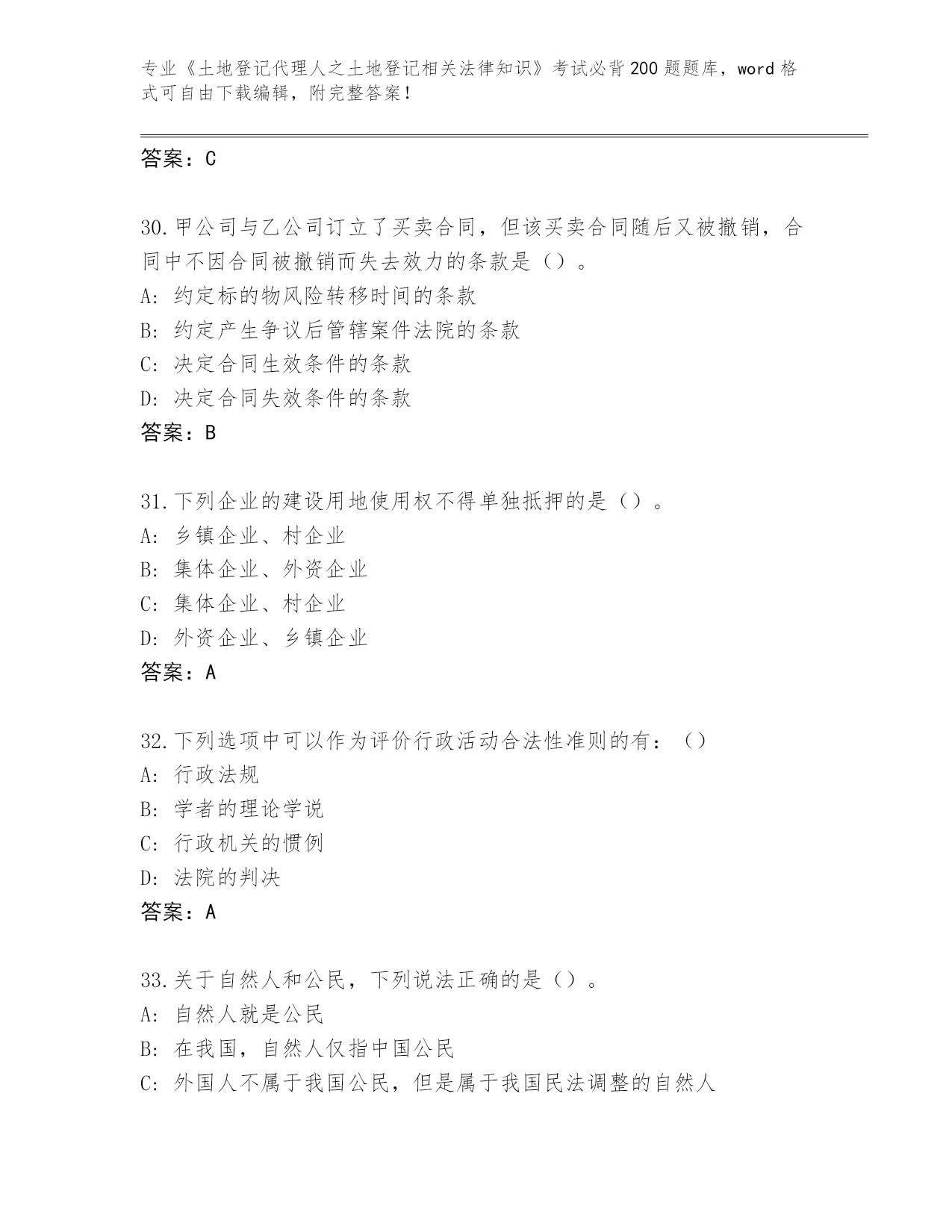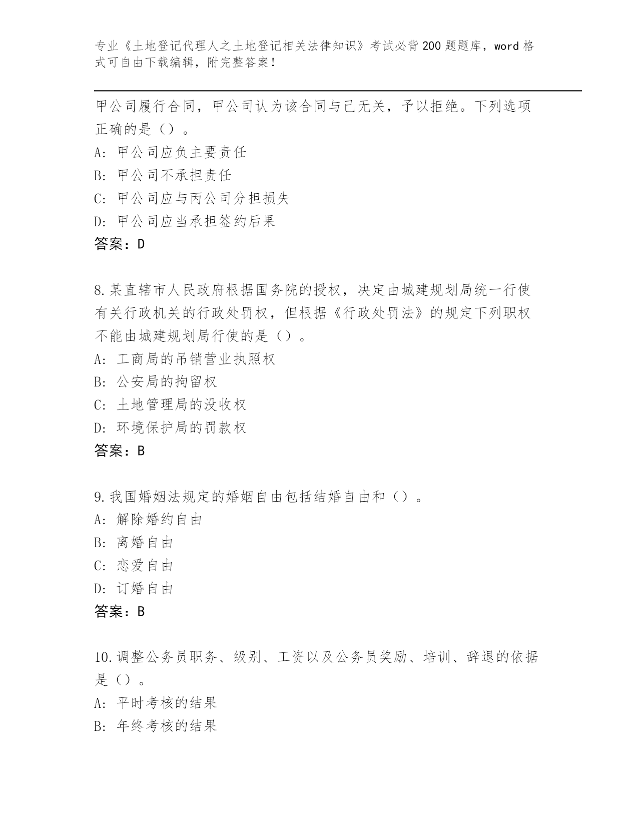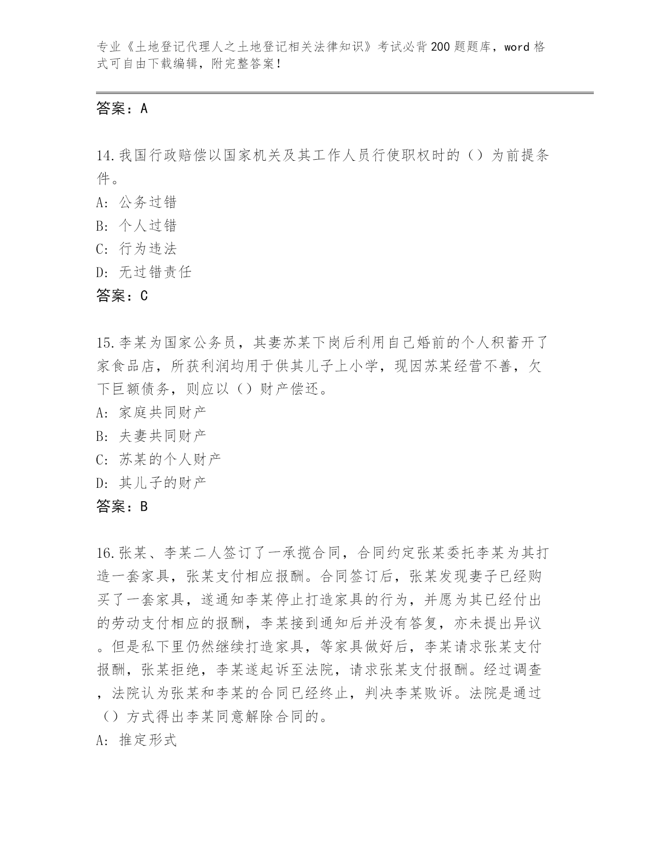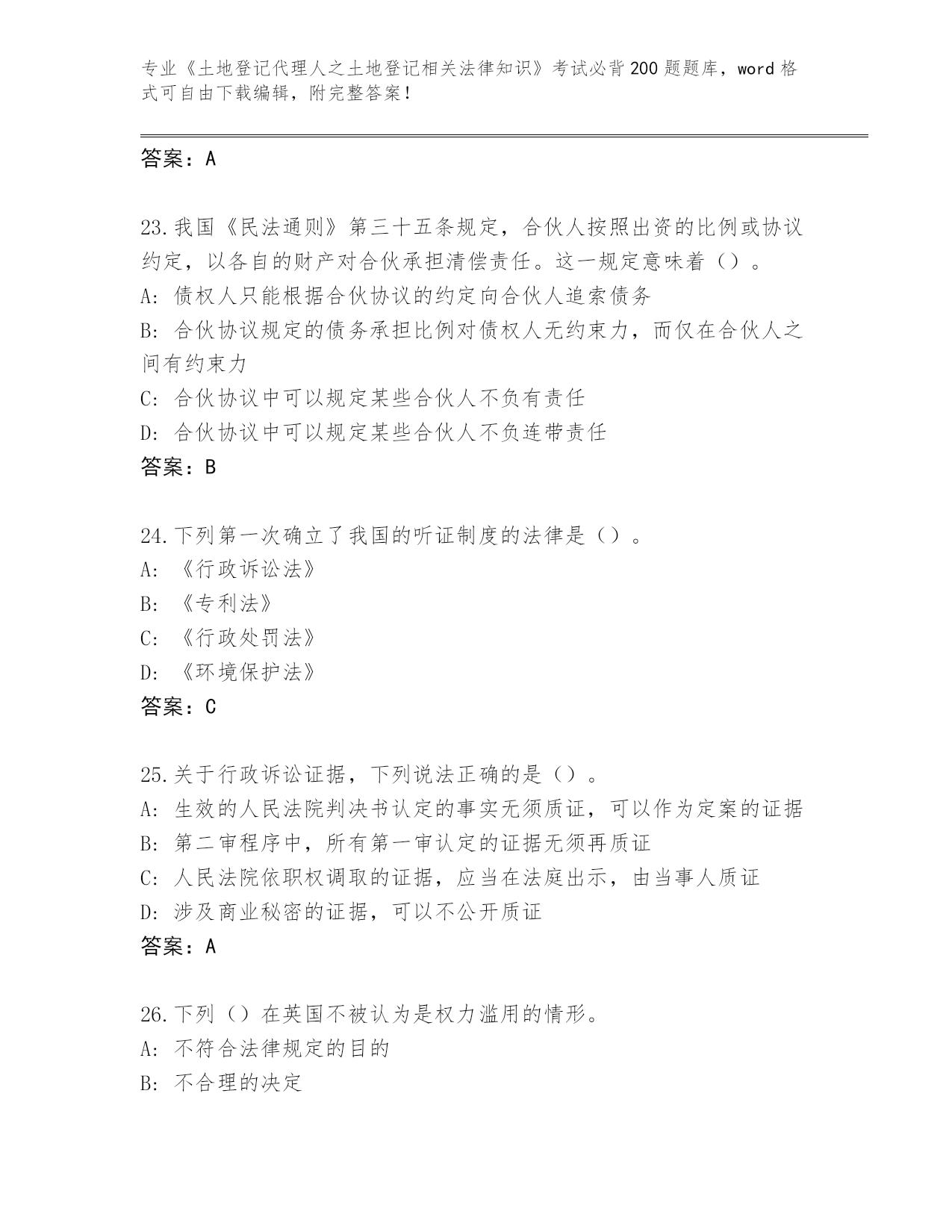 湖南省双牌县2023-2024年《土地登记代理人之土地登记相关法律知识》考试必背200题大全(考点提分)
